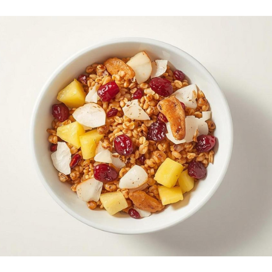 Unser Müsli Knusper Früchte kombiniert fruchtige Ananas-, Apfel- und Cranberrystückchen mit Kokosflocken und bringt tropisches Flair direkt auf den Frühstückstisch. Ideal für alle, die einen fruchtigen Start in den Tag lieben, selbst wenn gerade kein frisches Obst zur Hand ist.