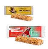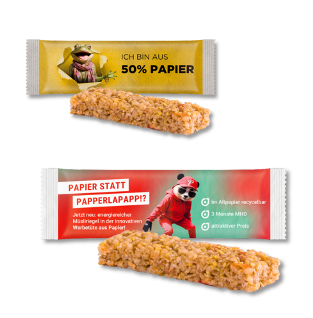 2. Kann ich die Verpackung des Müsliriegels individuell gestalten?Ja, Du hast die Wahl zwischen verschiedenen Verpackungsoptionen: weisse Folienverpackung, Papierfolie mit rund 50 Prozent Papieranteil oder eine recyclingfähige Papiertüte. Dein Logo und Design werden kreativ und hochwertig umgesetzt – ganz nach Deinen Wünschen.