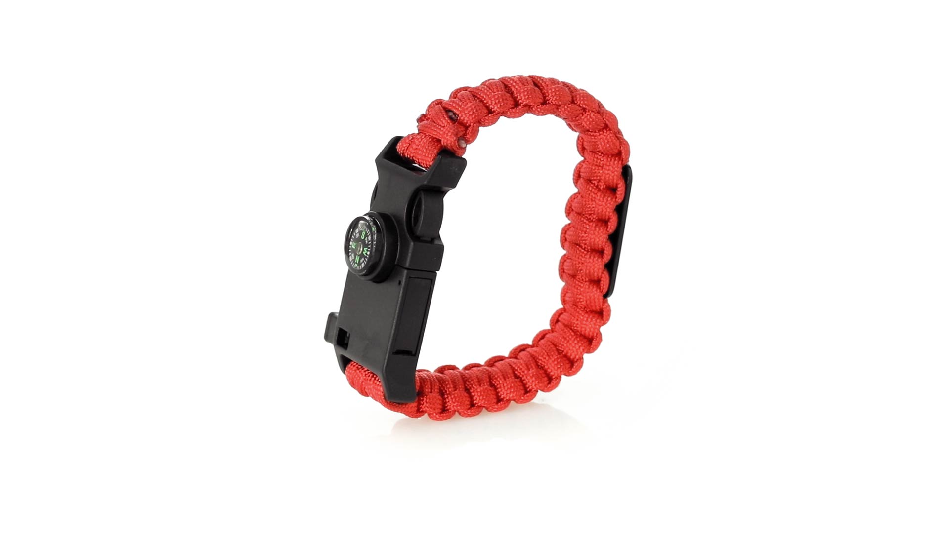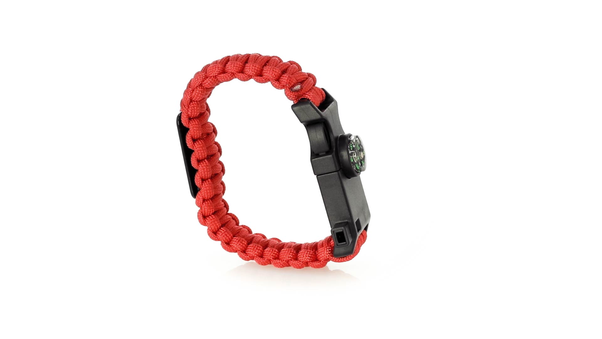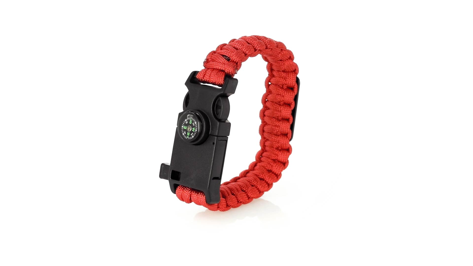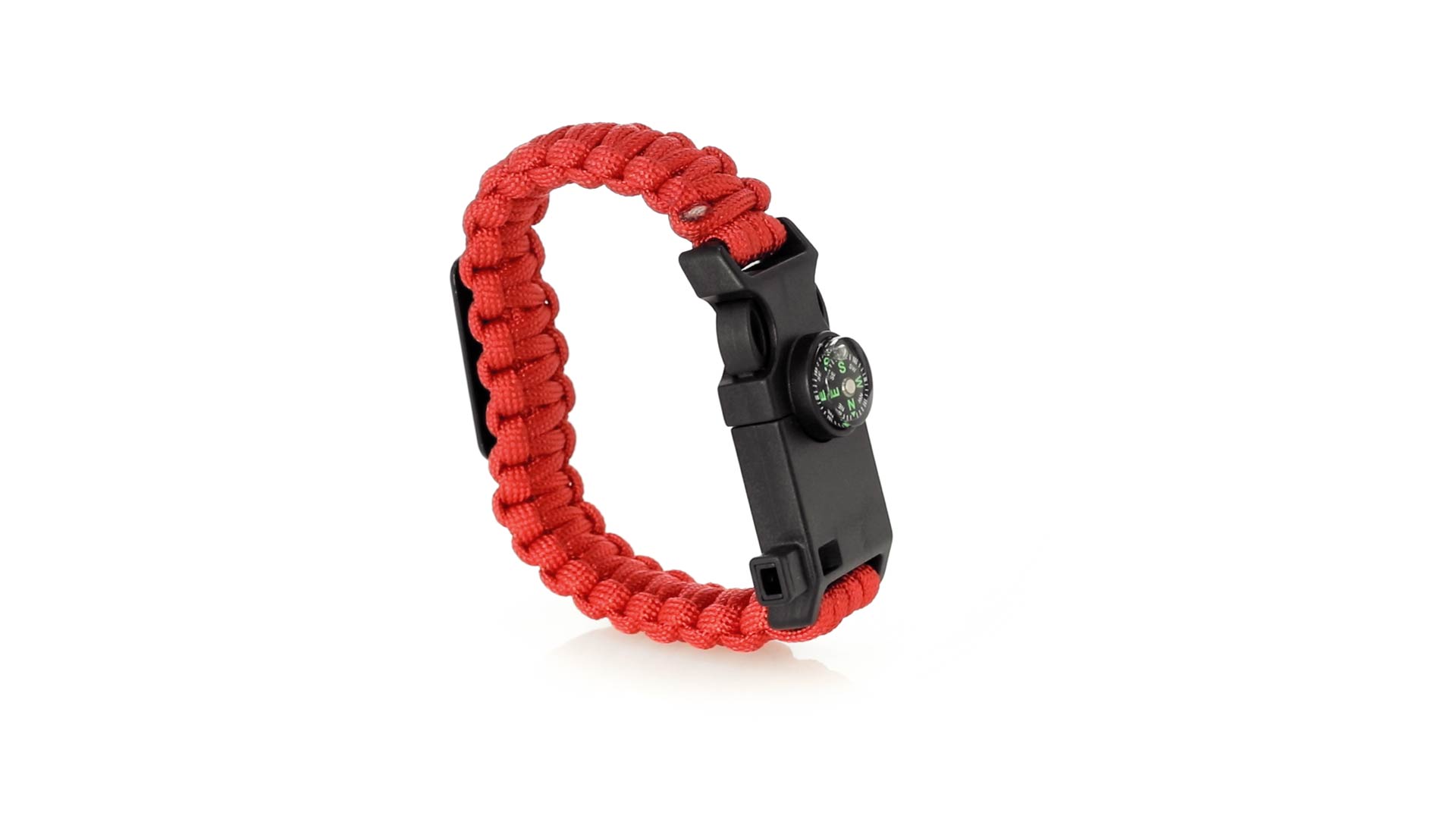 Multifunktionsarmband für Abenteuerlustige. Aus widerstandsfähigem Nylonmaterial, mit 5 Funktionen: Armband, Kompass, Pfeife, Feuersteinschaber und Öffner. Erhältlich in einer breiten Palette von Farben, mit Sicherheitsschnalle.