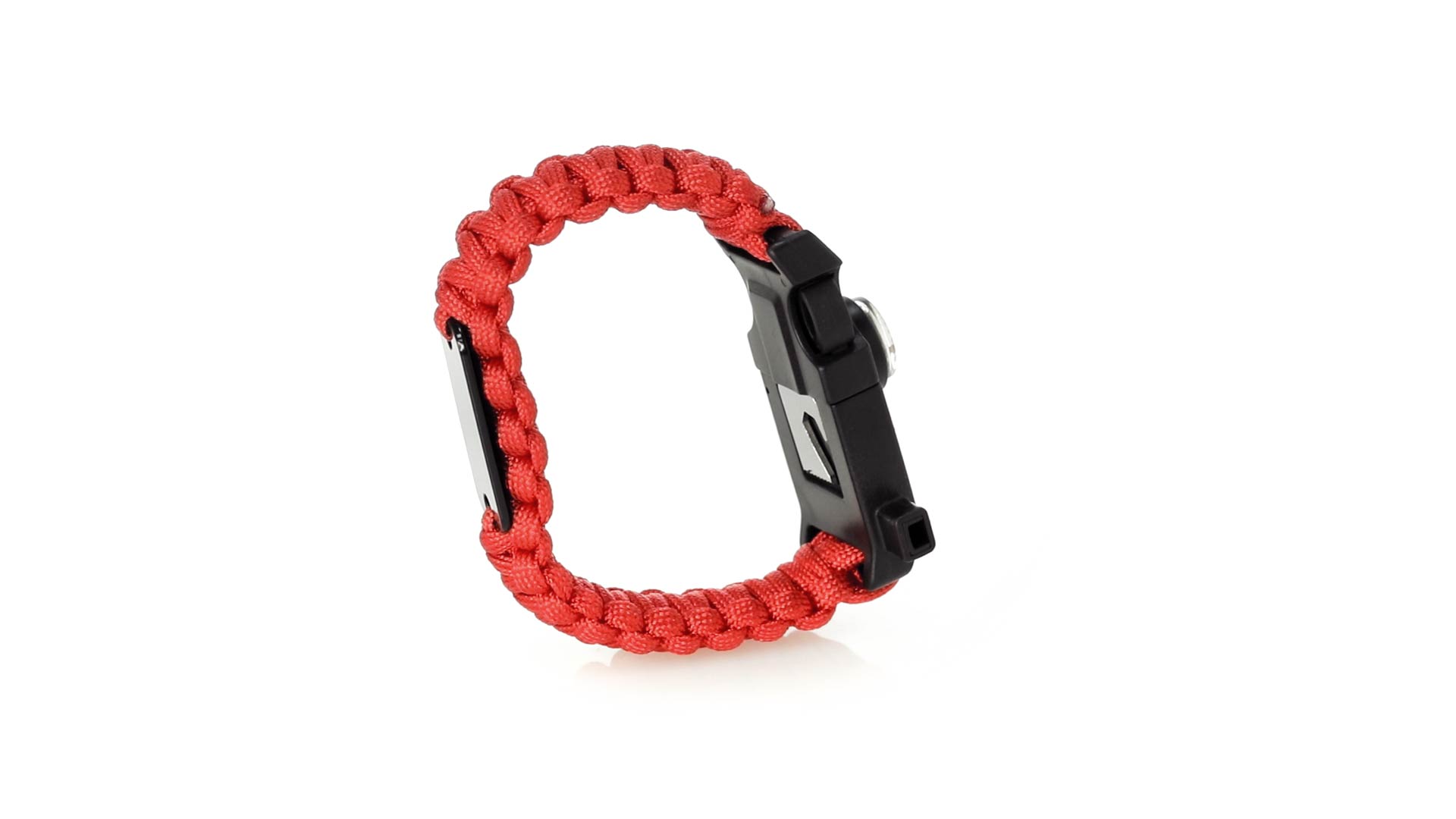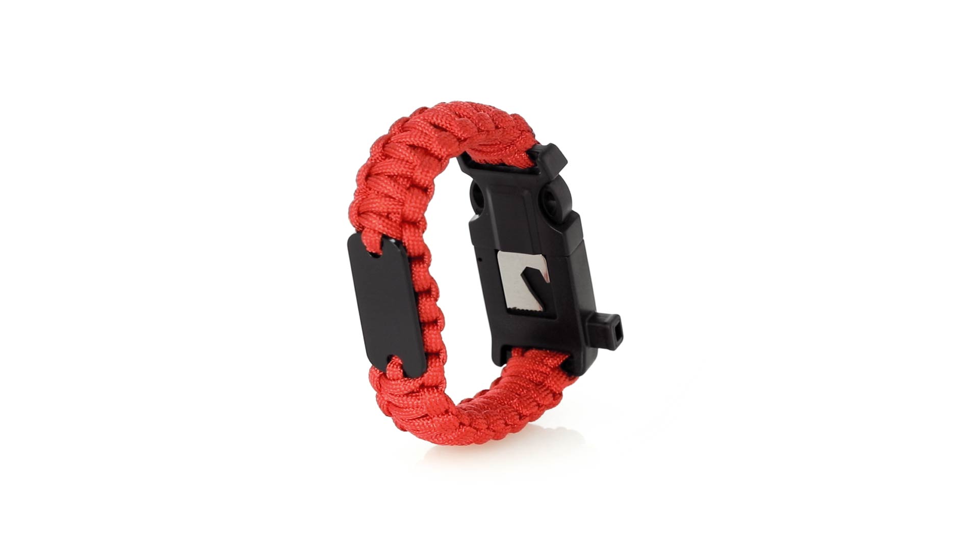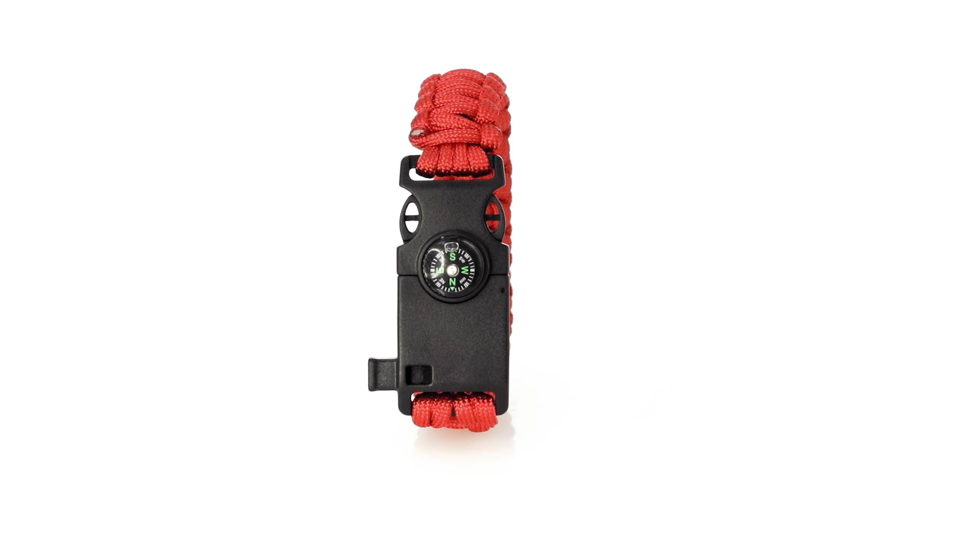 Multifunktionsarmband für Abenteuerlustige. Aus widerstandsfähigem Nylonmaterial, mit 5 Funktionen: Armband, Kompass, Pfeife, Feuersteinschaber und Öffner. Erhältlich in einer breiten Palette von Farben, mit Sicherheitsschnalle.