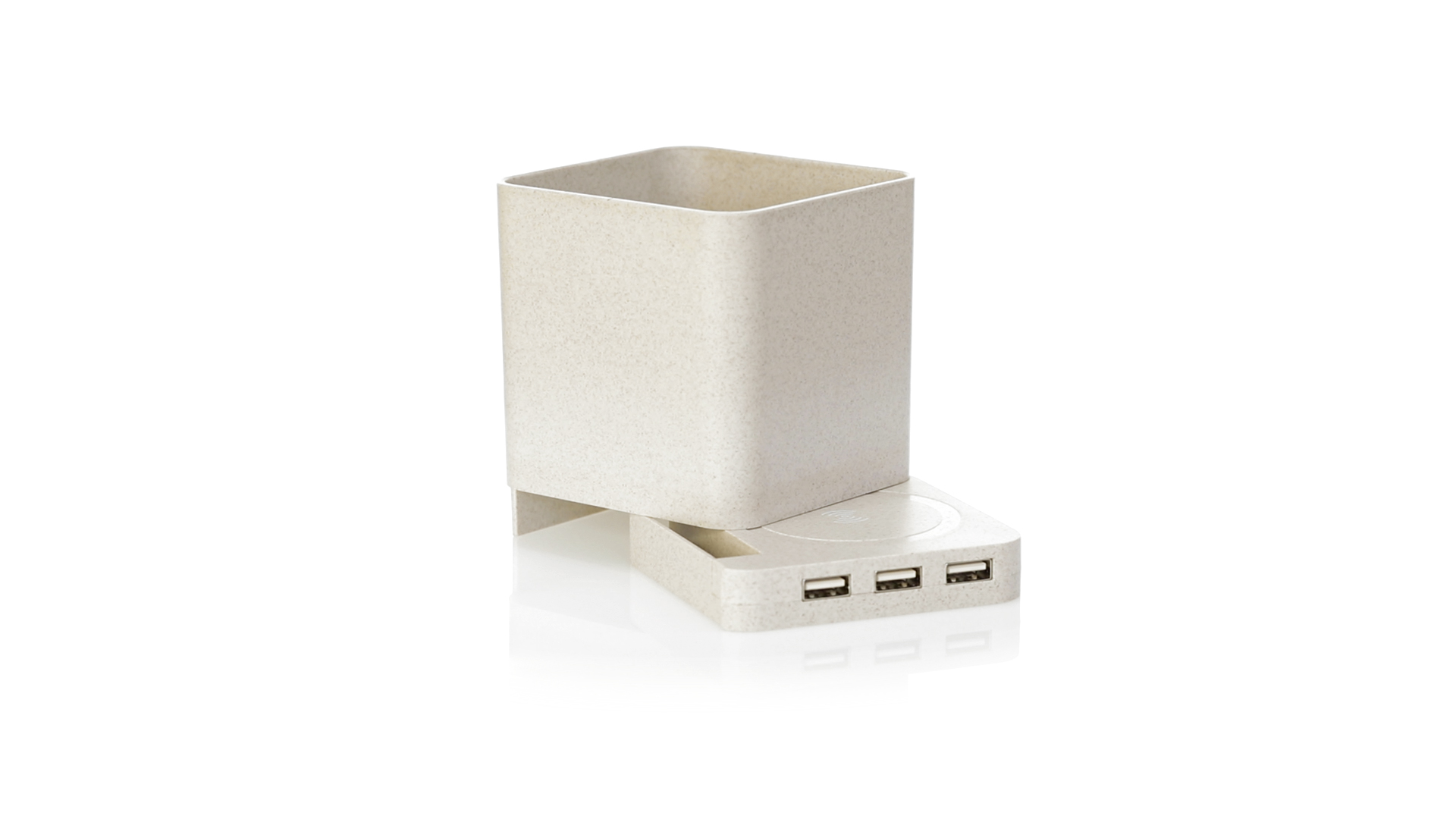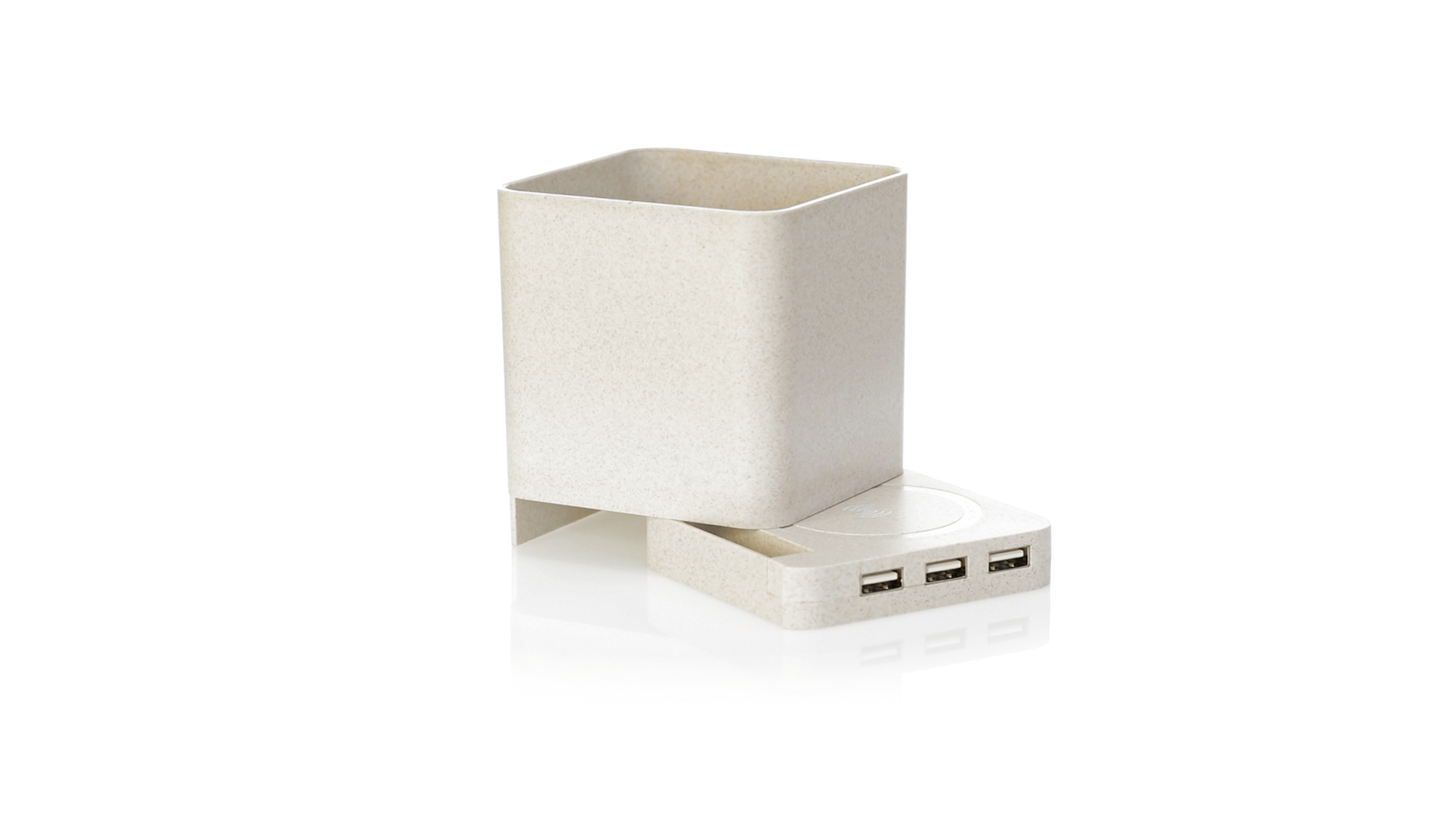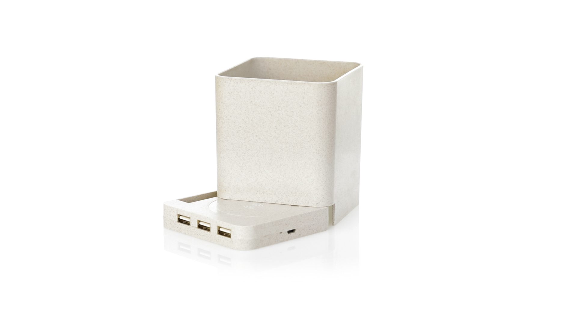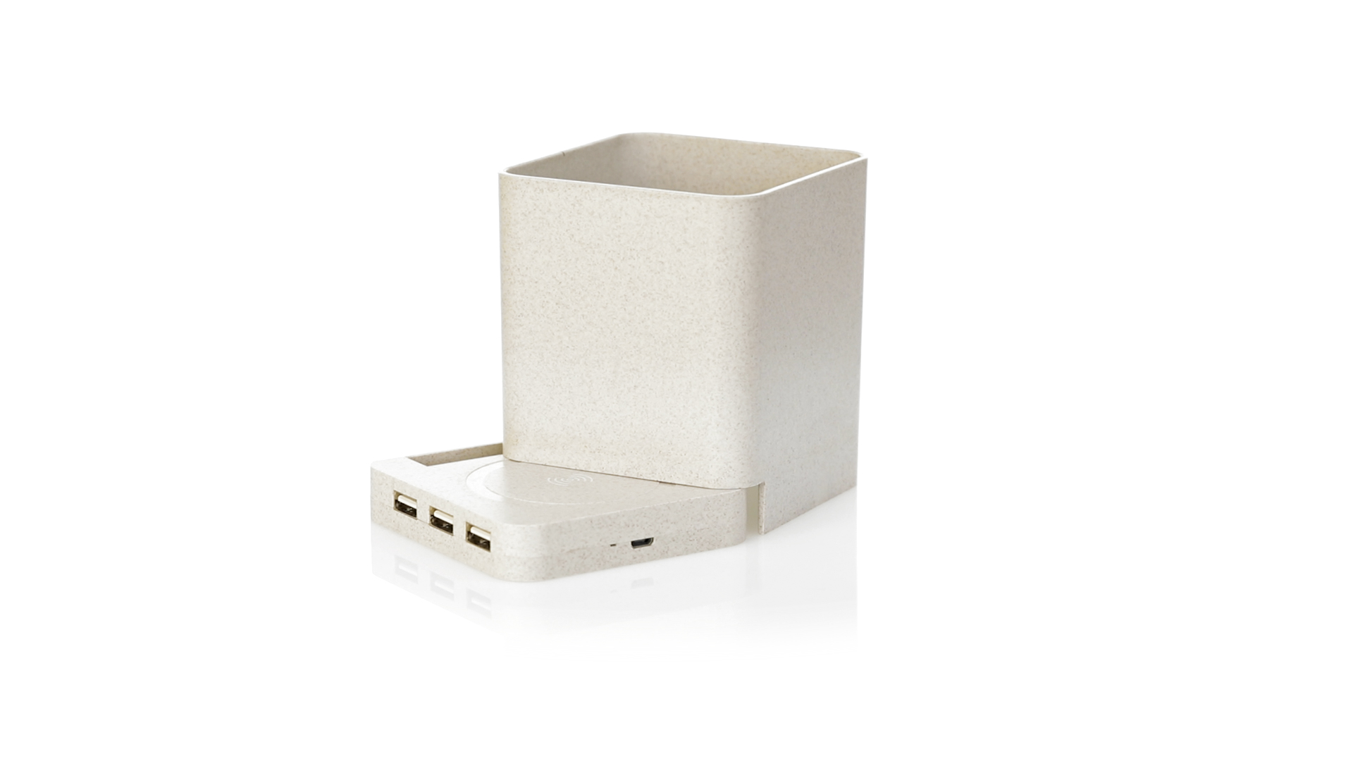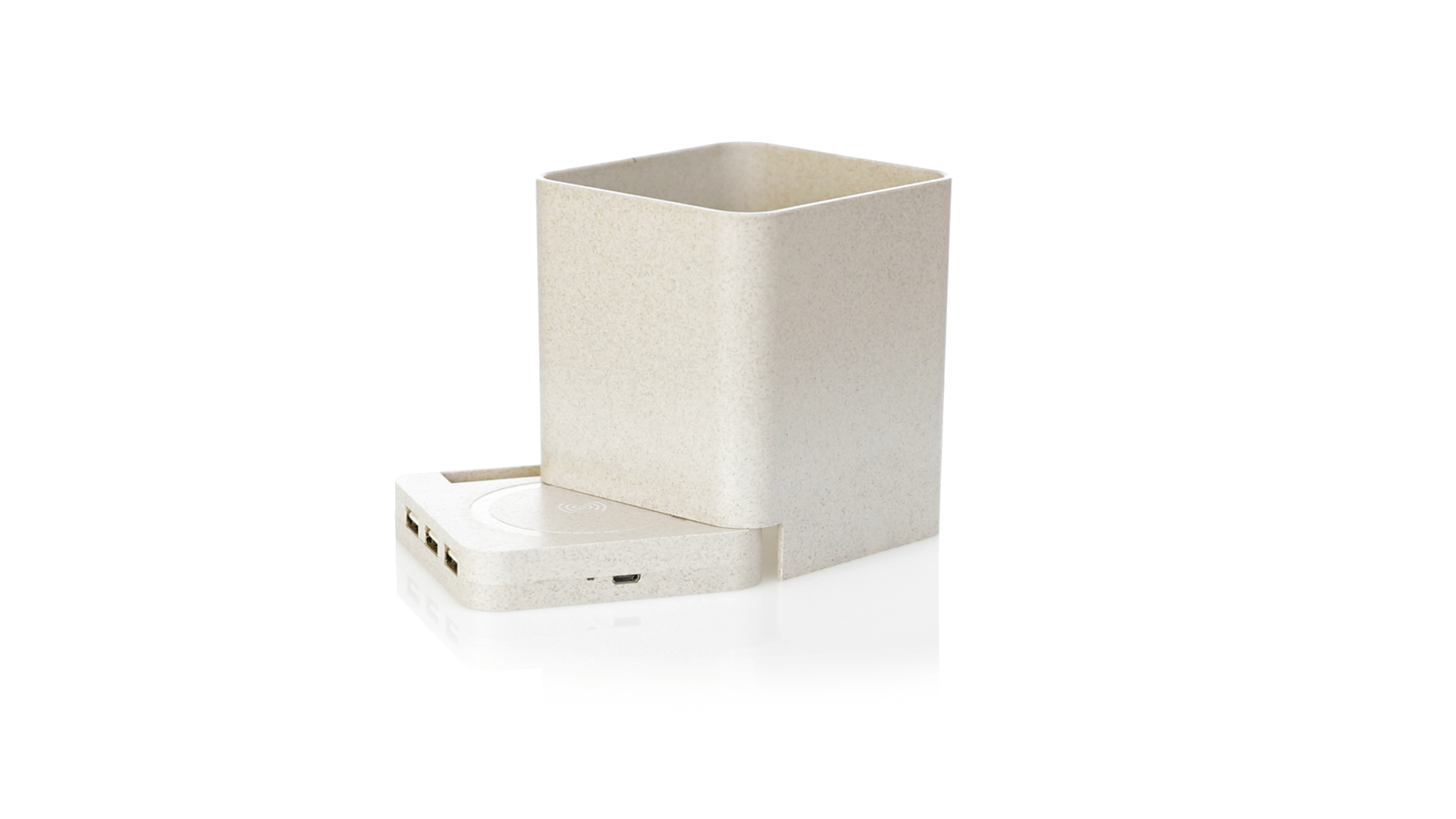 4 in 1 Multifunktionsstifthalter aus unserer Naturlinie. Hergestellt aus Weizenstroh, um die Verwendung natürlicher Rohstoffe zu fördern und Schadstoffemissionen zu reduzieren.Mit Stifthalter, Smartphone-Halter, drahtlosem Ladegerät und USB-Port (3xUSB 2.0) Funktionen. Kompatibel mit Smartphones, die mit drahtloser Ladetechnologie ausgestattet sind. Inklusive 1 Meter langem, weissem Mikro-USB-Kabel. Präsentiert in einer attraktiven Ökodesign-Box. Bedienungsanleitung in Spanisch und Englisch erhältlich.