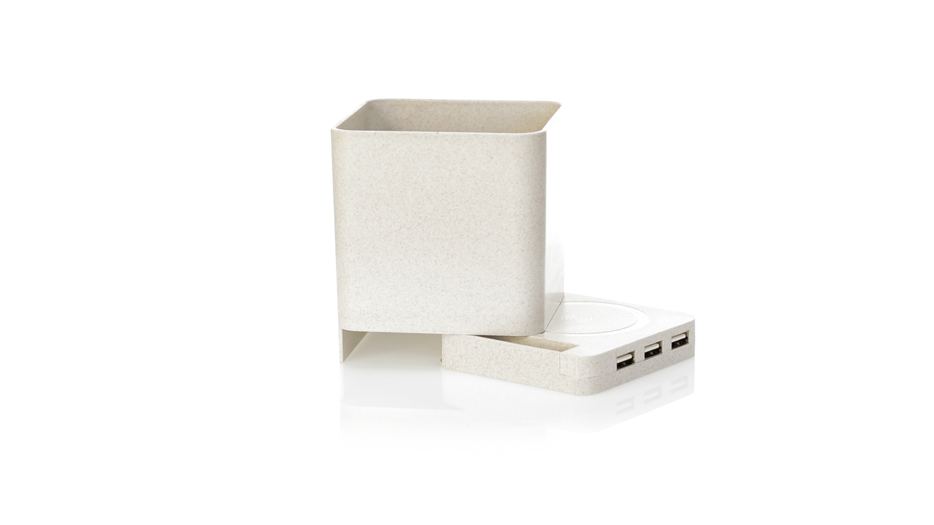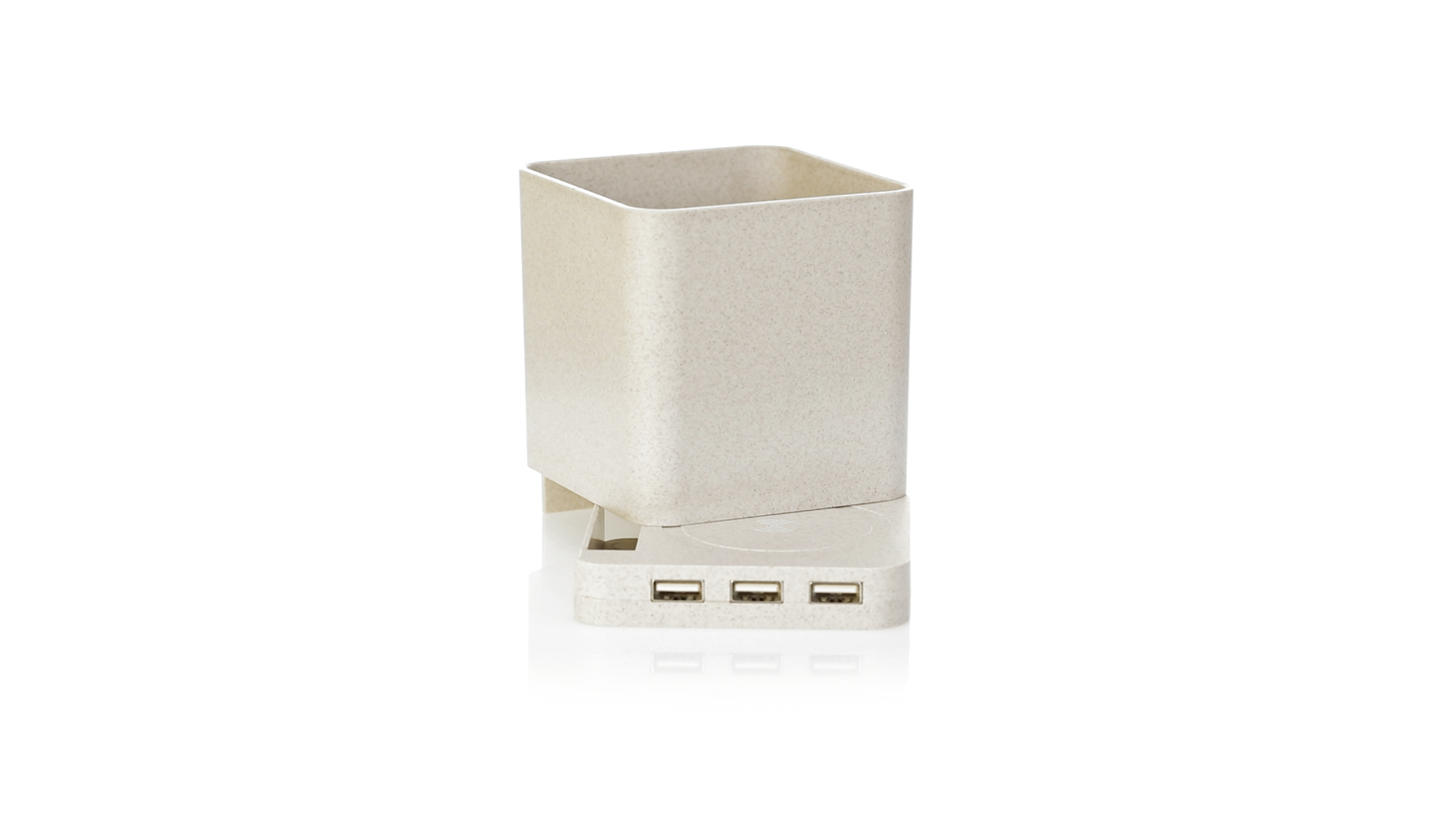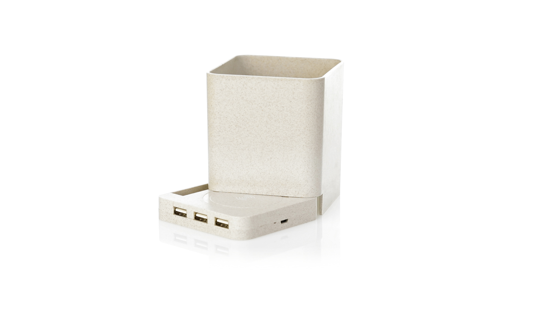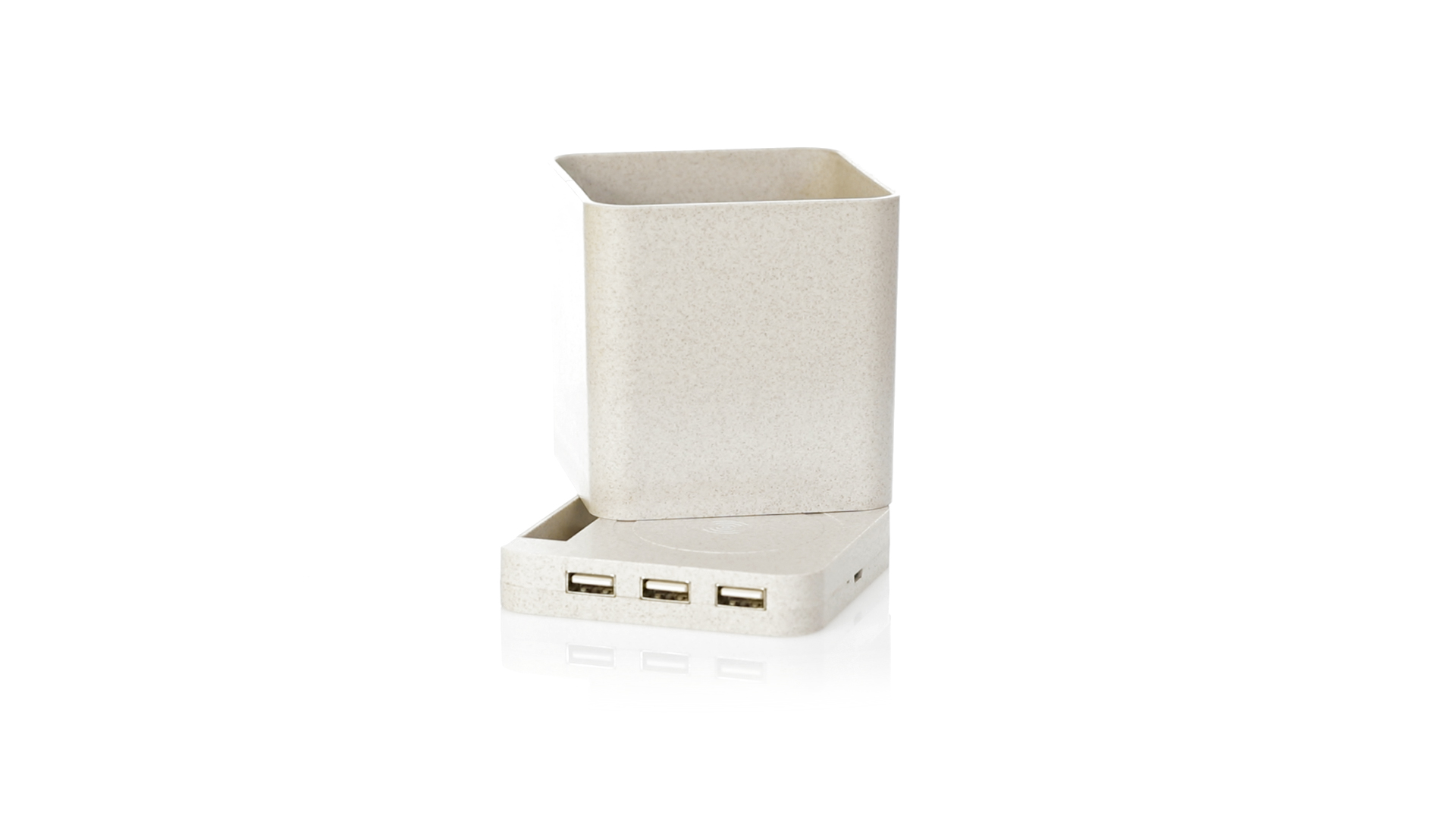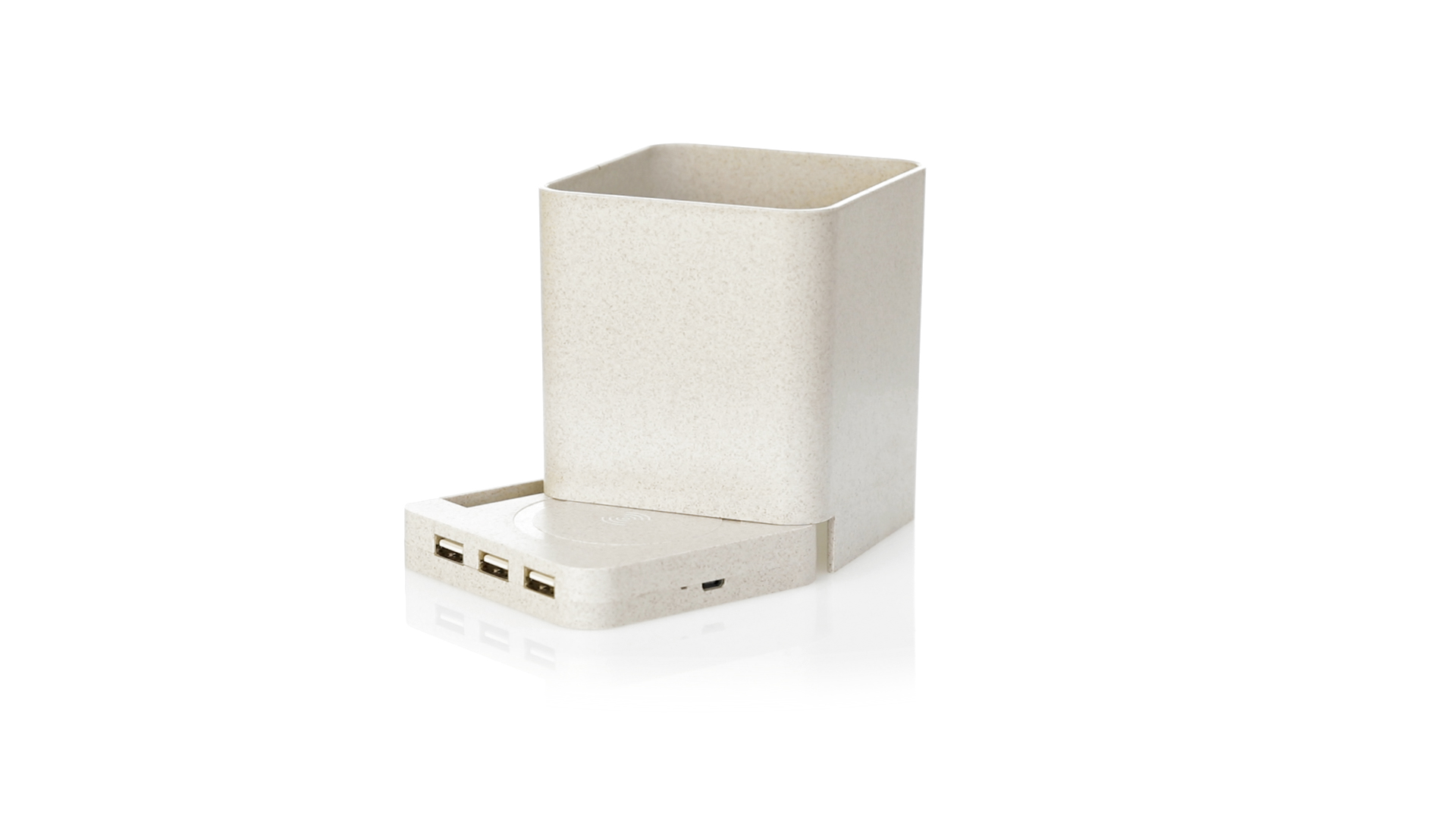 4 in 1 Multifunktionsstifthalter aus unserer Naturlinie. Hergestellt aus Weizenstroh, um die Verwendung natürlicher Rohstoffe zu fördern und Schadstoffemissionen zu reduzieren.Mit Stifthalter, Smartphone-Halter, drahtlosem Ladegerät und USB-Port (3xUSB 2.0) Funktionen. Kompatibel mit Smartphones, die mit drahtloser Ladetechnologie ausgestattet sind. Inklusive 1 Meter langem, weissem Mikro-USB-Kabel. Präsentiert in einer attraktiven Ökodesign-Box. Bedienungsanleitung in Spanisch und Englisch erhältlich.