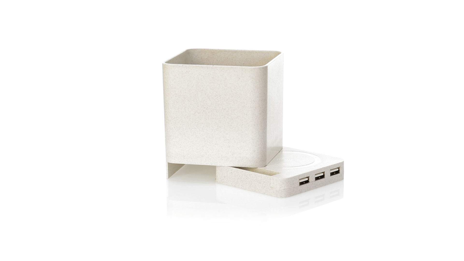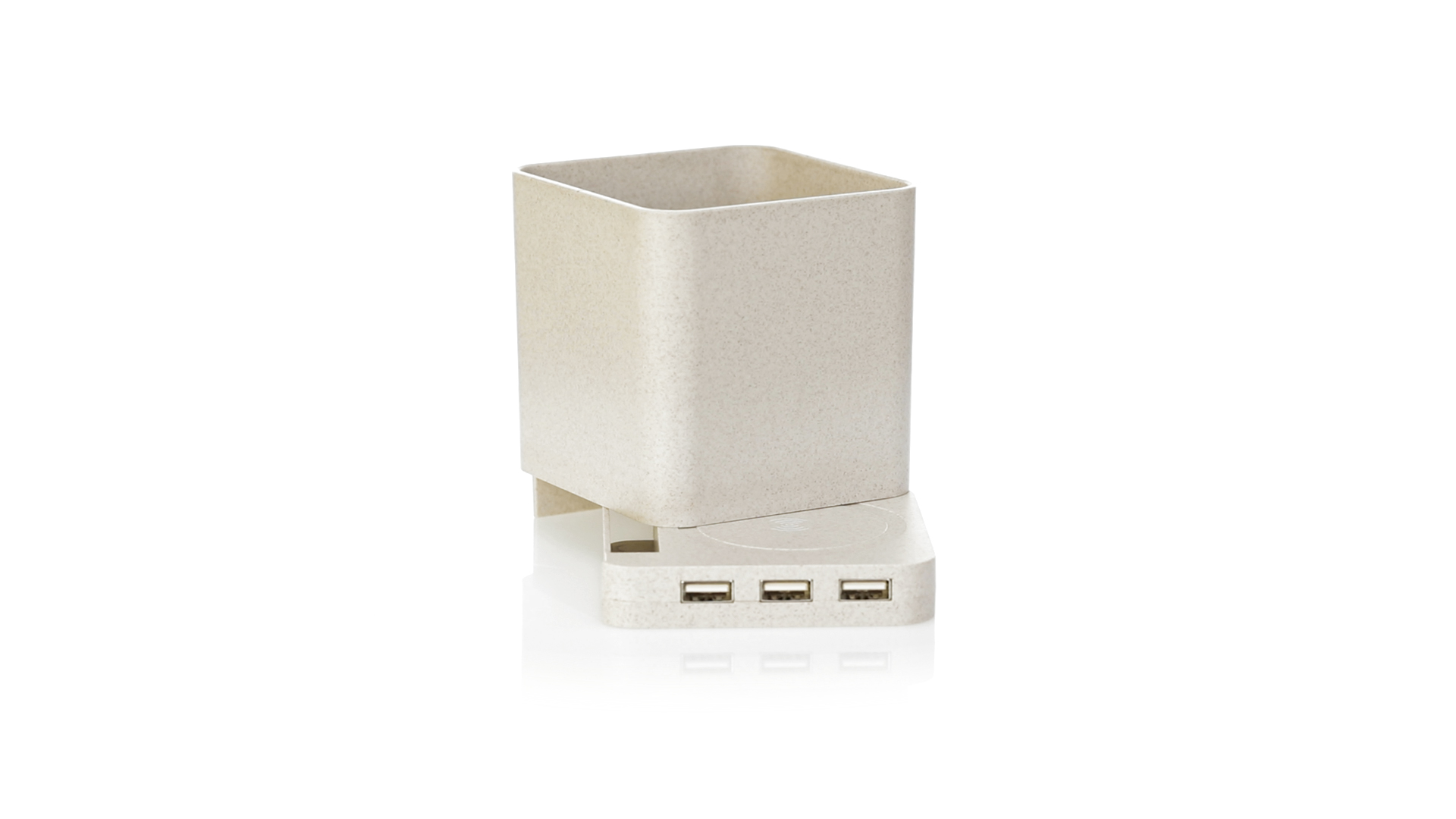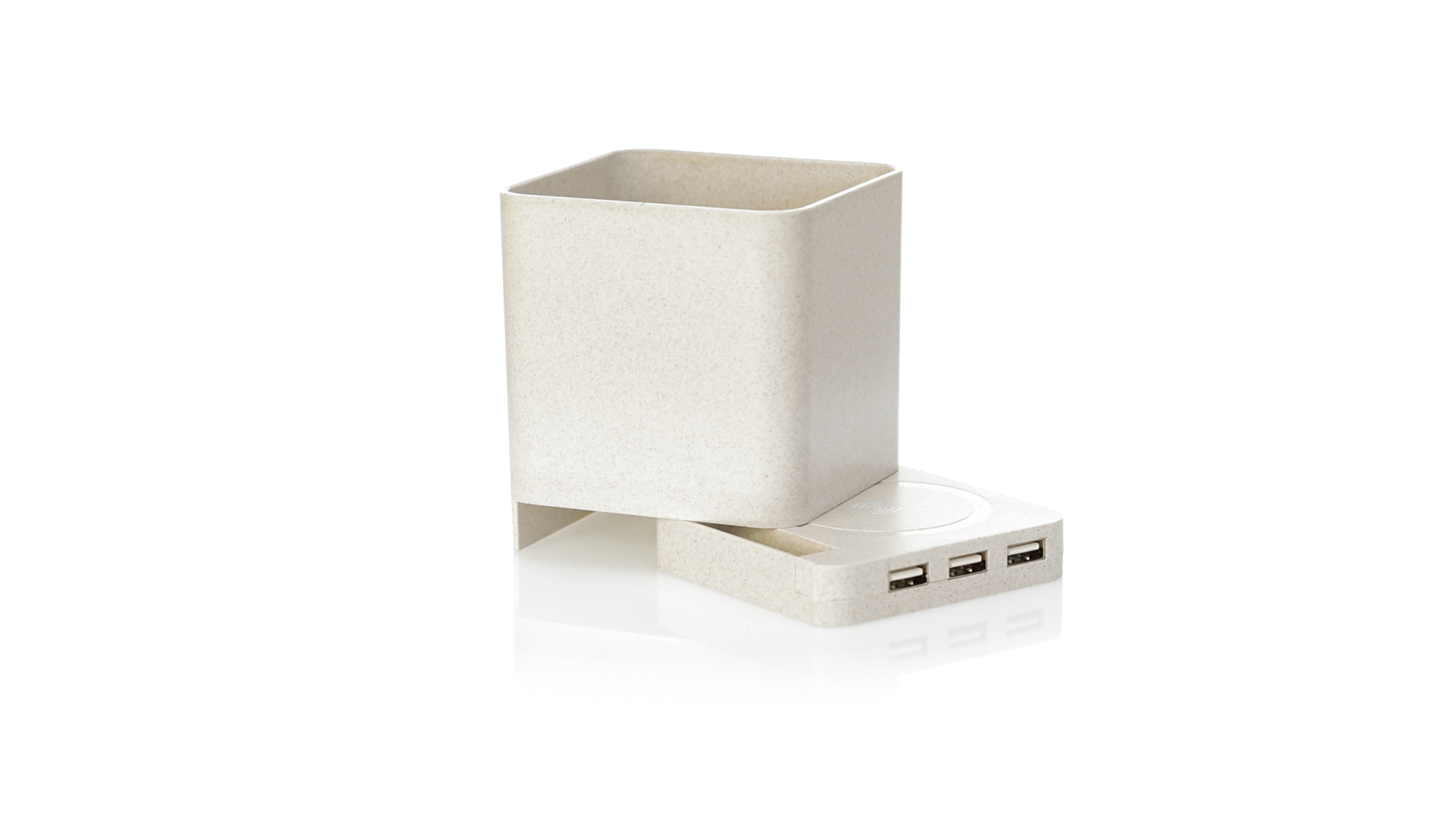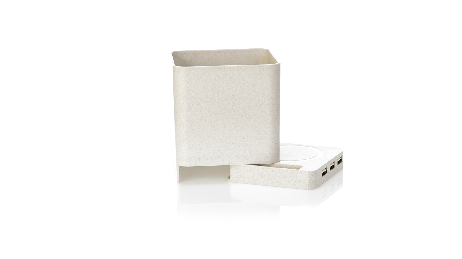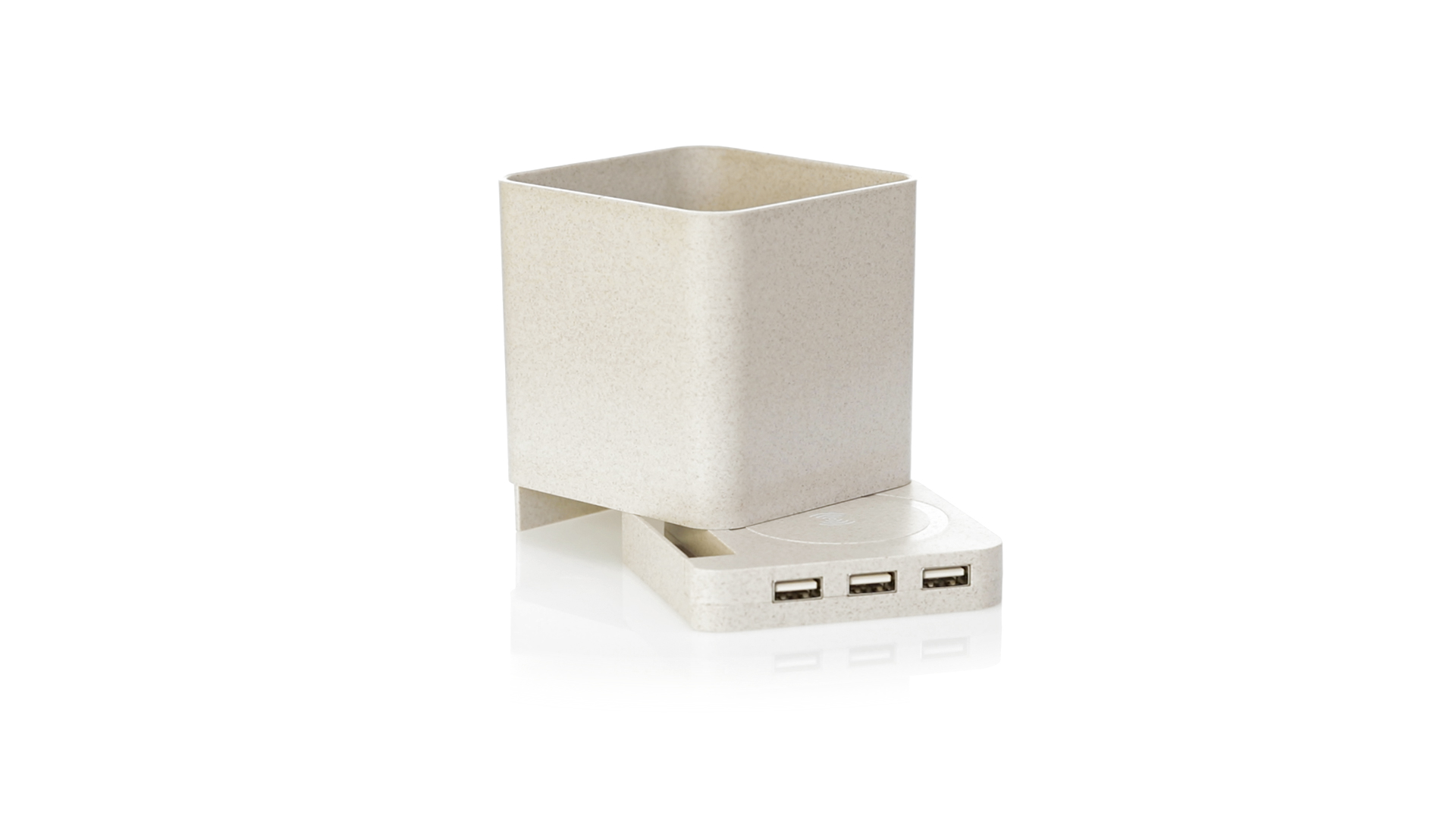 4 in 1 Multifunktionsstifthalter aus unserer Naturlinie. Hergestellt aus Weizenstroh, um die Verwendung natürlicher Rohstoffe zu fördern und Schadstoffemissionen zu reduzieren.Mit Stifthalter, Smartphone-Halter, drahtlosem Ladegerät und USB-Port (3xUSB 2.0) Funktionen. Kompatibel mit Smartphones, die mit drahtloser Ladetechnologie ausgestattet sind. Inklusive 1 Meter langem, weissem Mikro-USB-Kabel. Präsentiert in einer attraktiven Ökodesign-Box. Bedienungsanleitung in Spanisch und Englisch erhältlich.