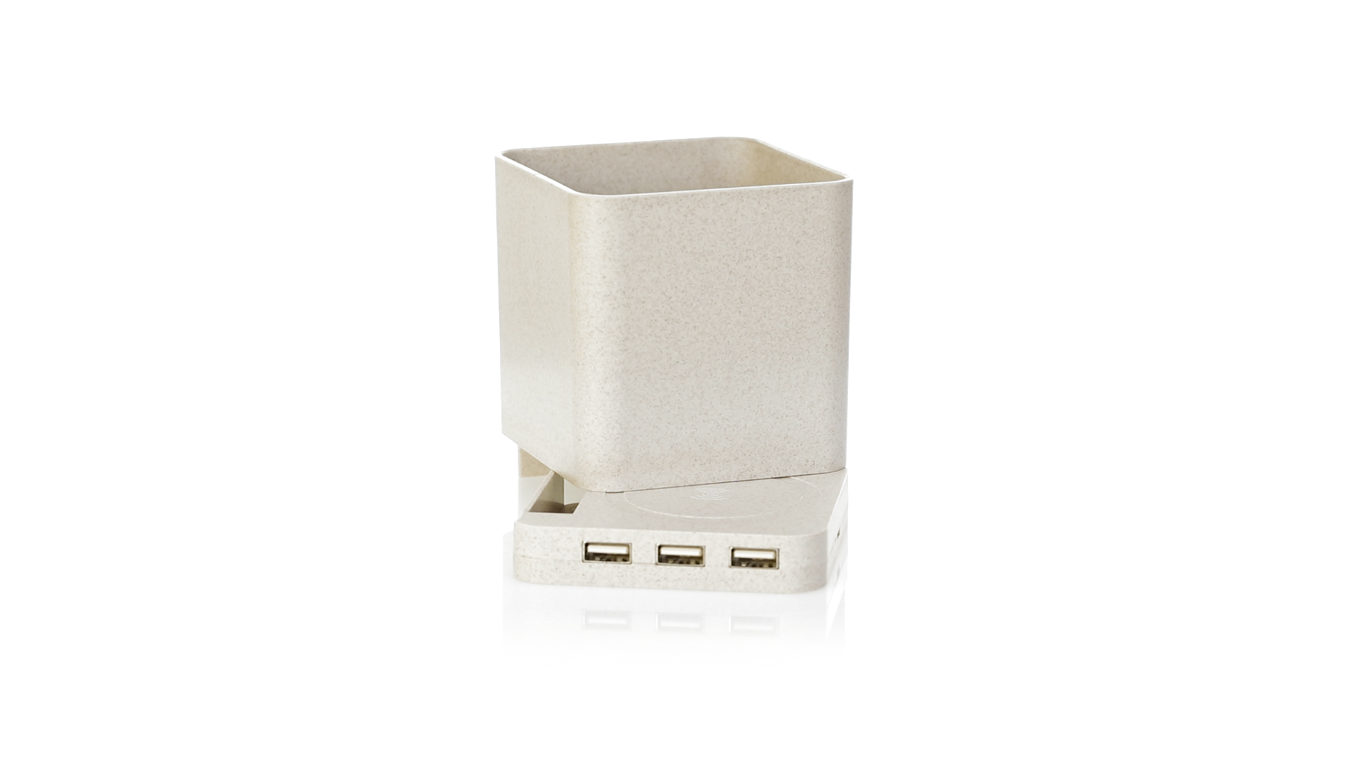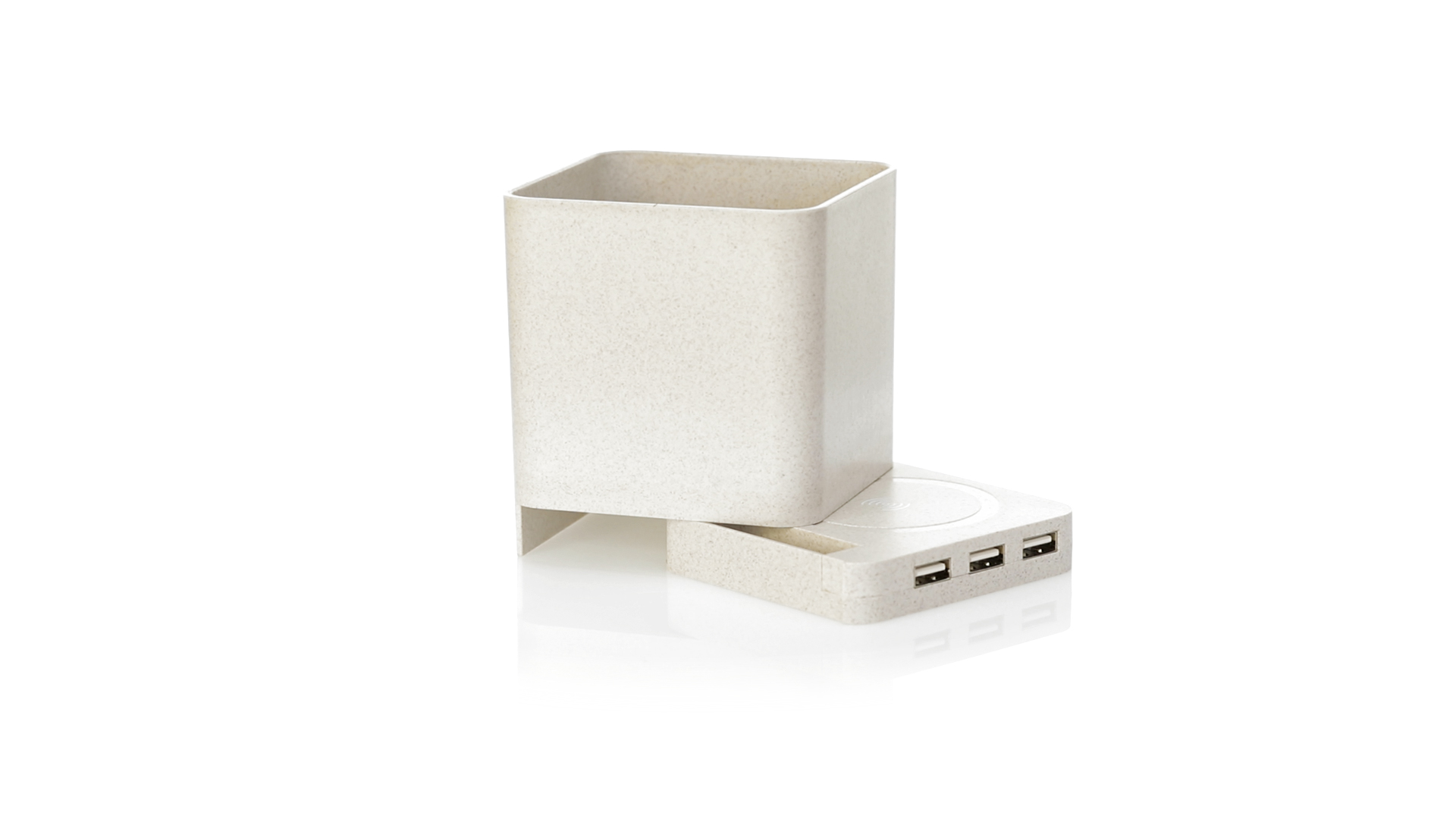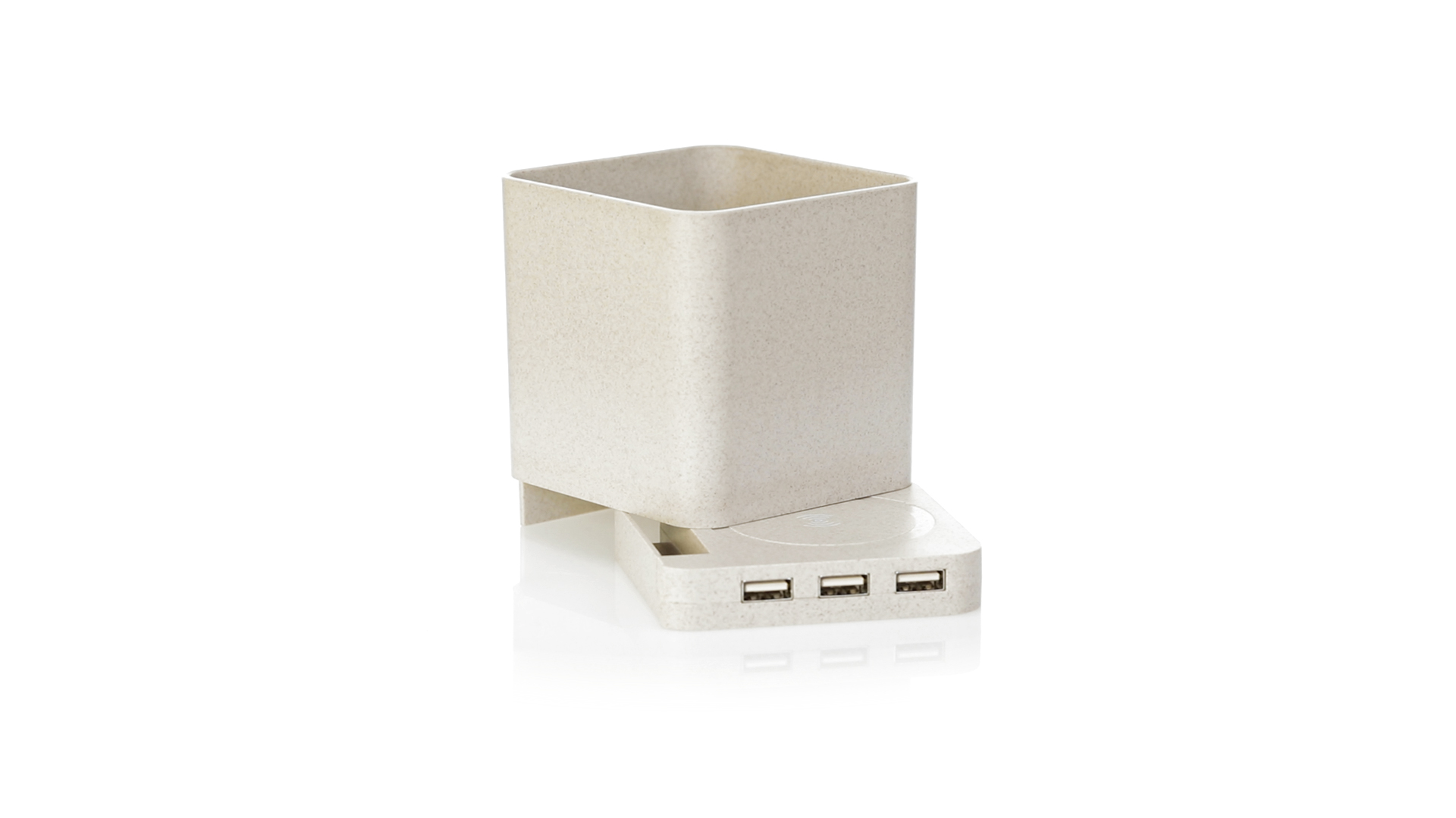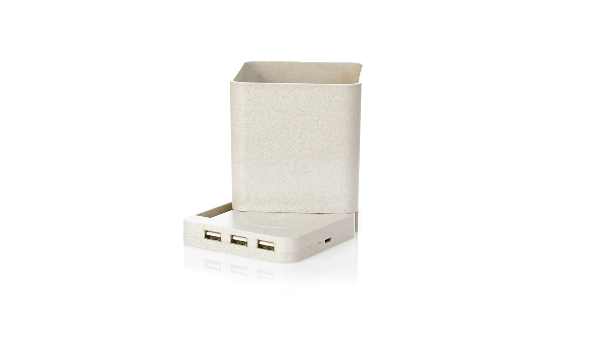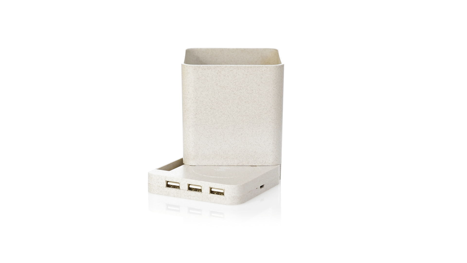 4 in 1 Multifunktionsstifthalter aus unserer Naturlinie. Hergestellt aus Weizenstroh, um die Verwendung natürlicher Rohstoffe zu fördern und Schadstoffemissionen zu reduzieren.Mit Stifthalter, Smartphone-Halter, drahtlosem Ladegerät und USB-Port (3xUSB 2.0) Funktionen. Kompatibel mit Smartphones, die mit drahtloser Ladetechnologie ausgestattet sind. Inklusive 1 Meter langem, weissem Mikro-USB-Kabel. Präsentiert in einer attraktiven Ökodesign-Box. Bedienungsanleitung in Spanisch und Englisch erhältlich.