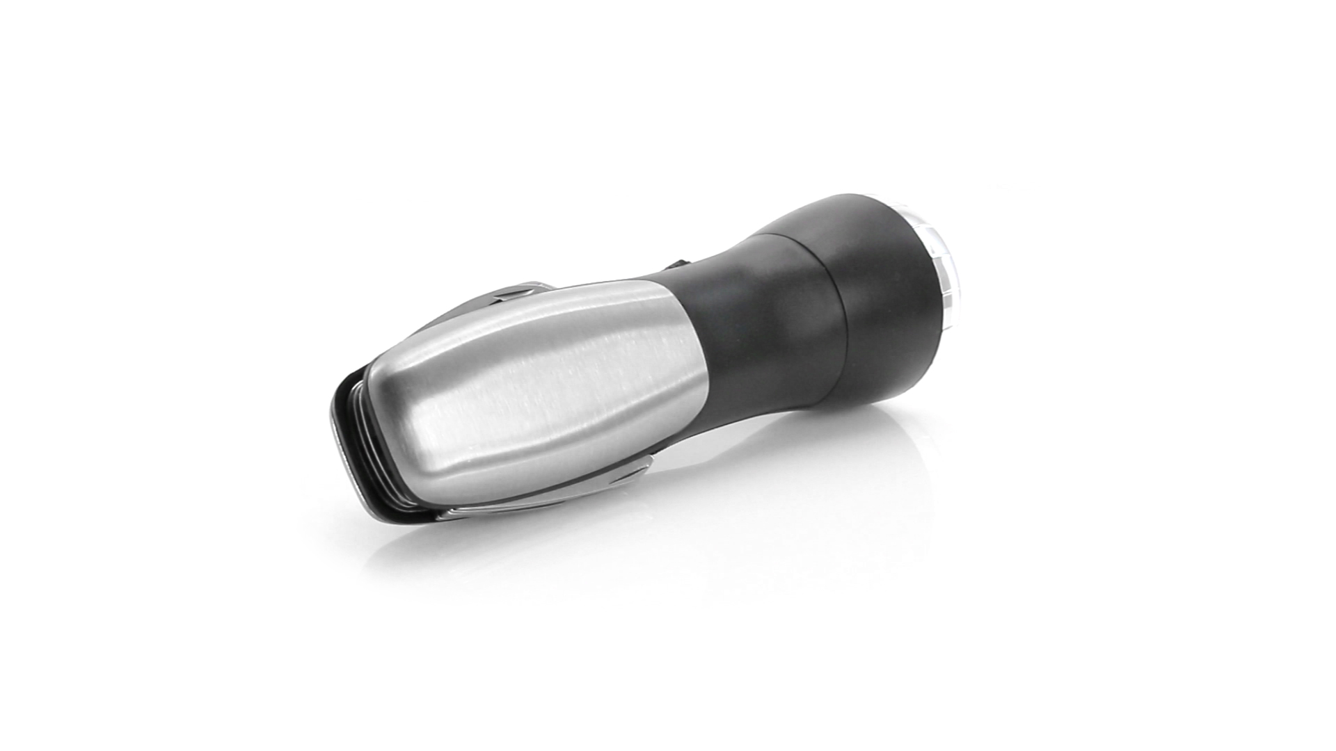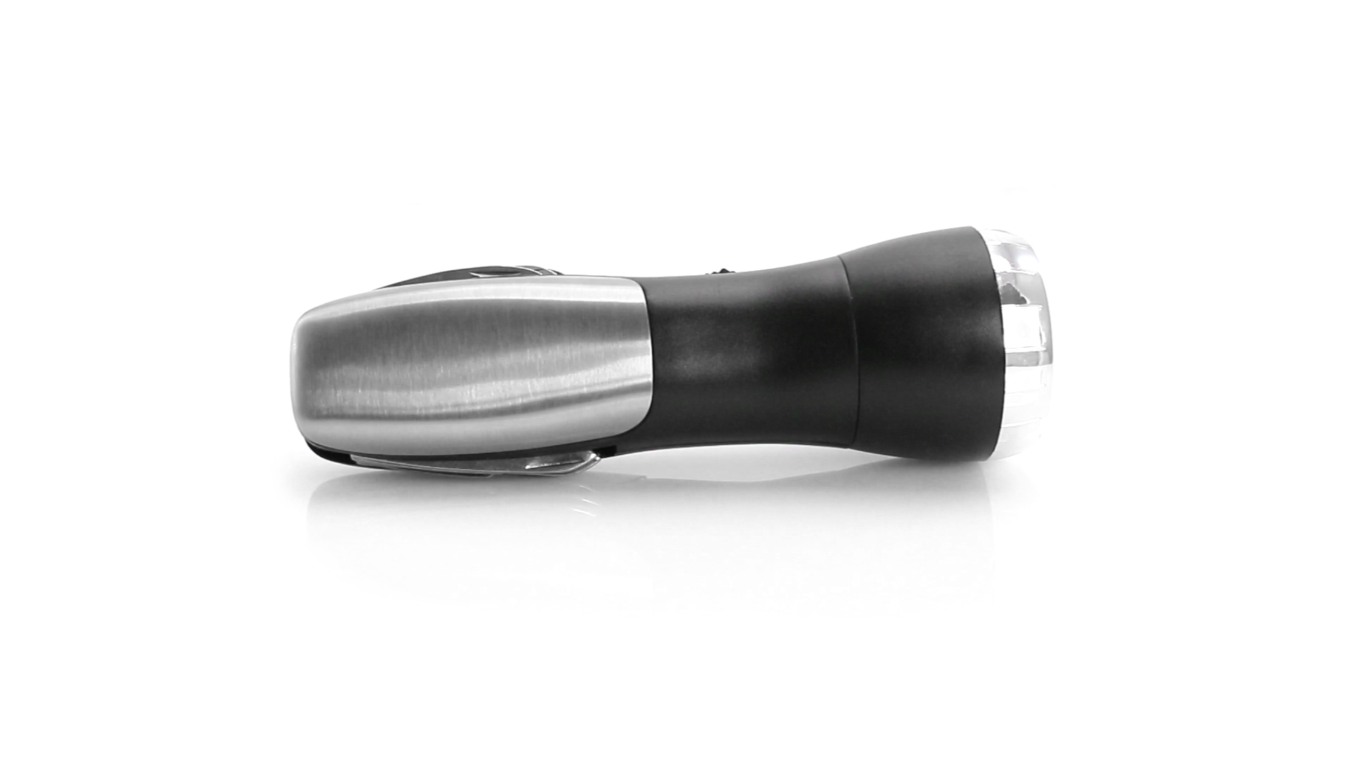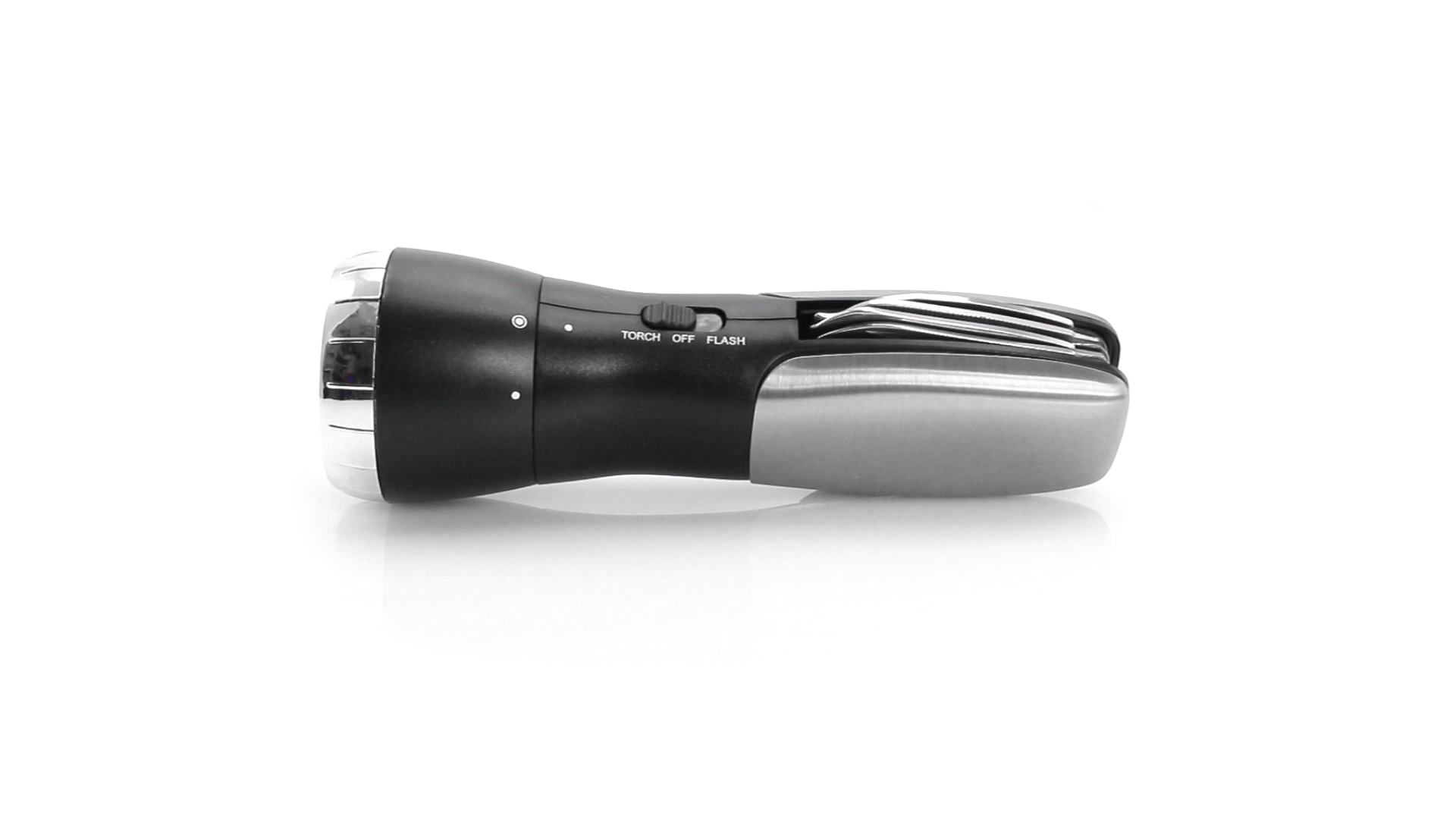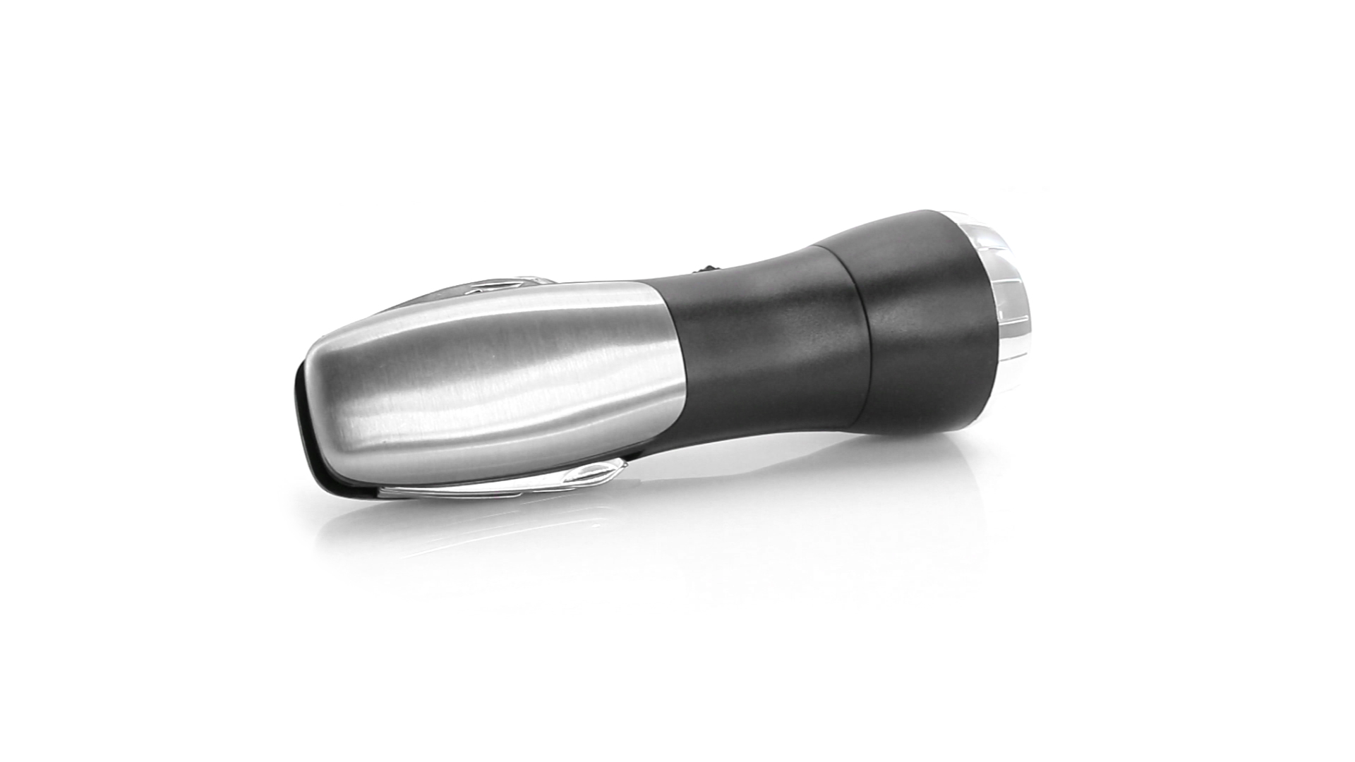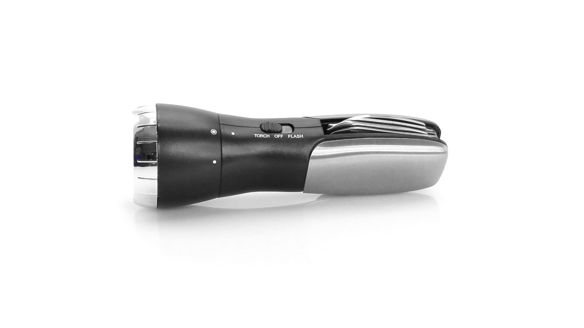Multi-Tool mit robuster, rutschfester Oberfläche in Metallic-Farbe. Mit 12 Funktionen und eingebauter 4 LED-Taschenlampe. Enthält Schraubendreherköpfe, Messer, Schraubenschlüssel, Schere und Öffner. Präsentiert in einer individuellen Box. Batterie 1 x AAA nicht inklusive.