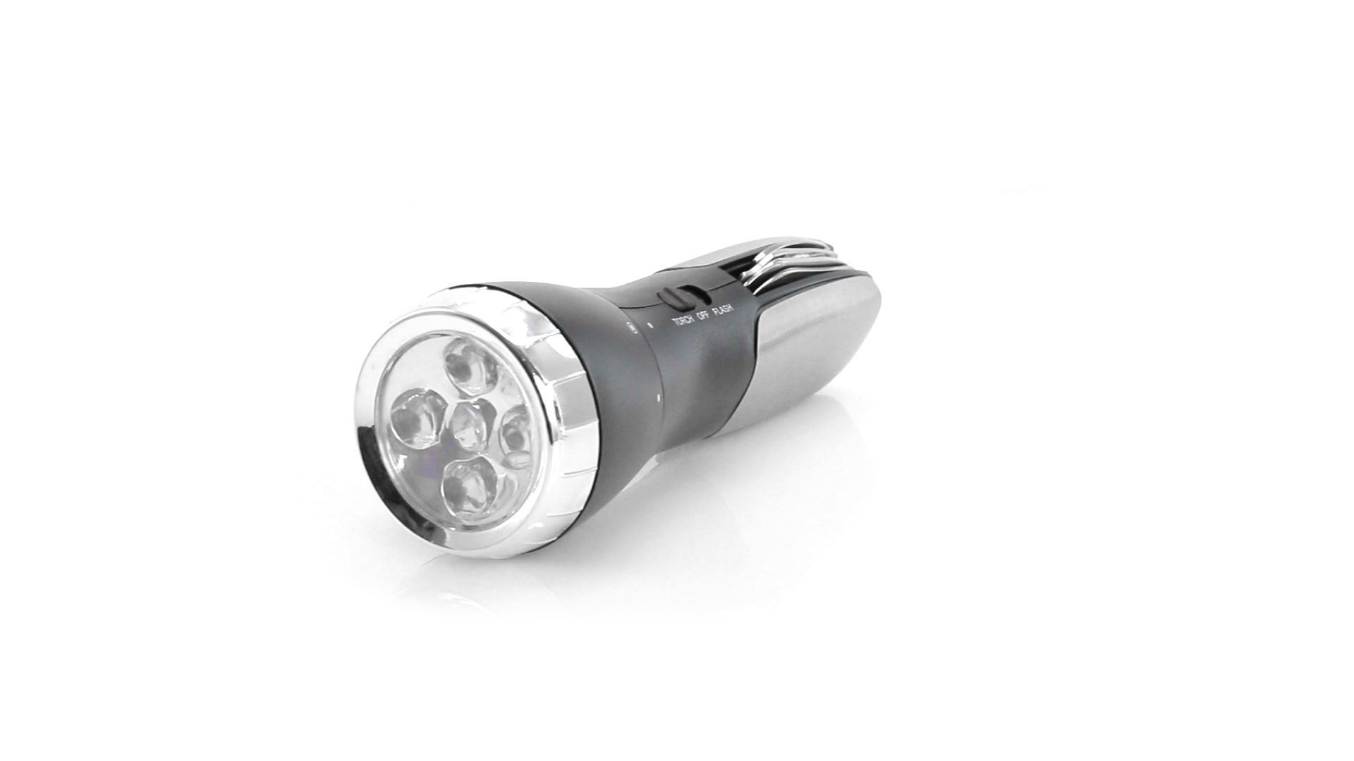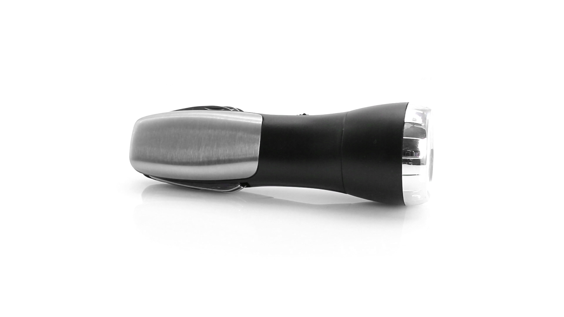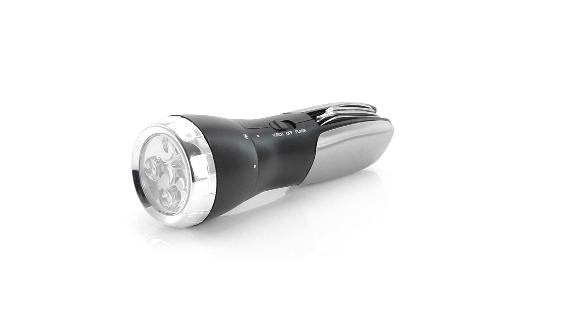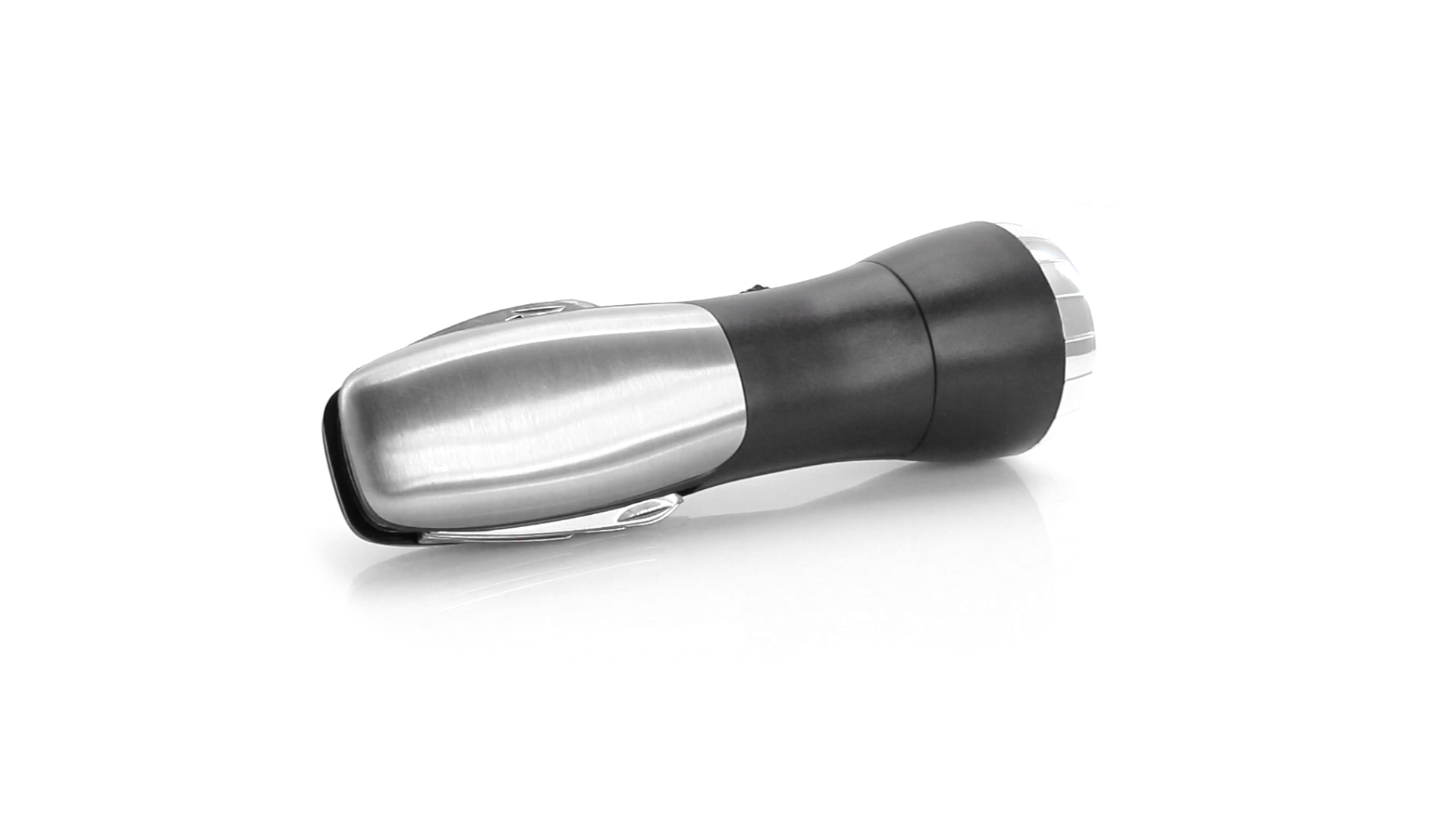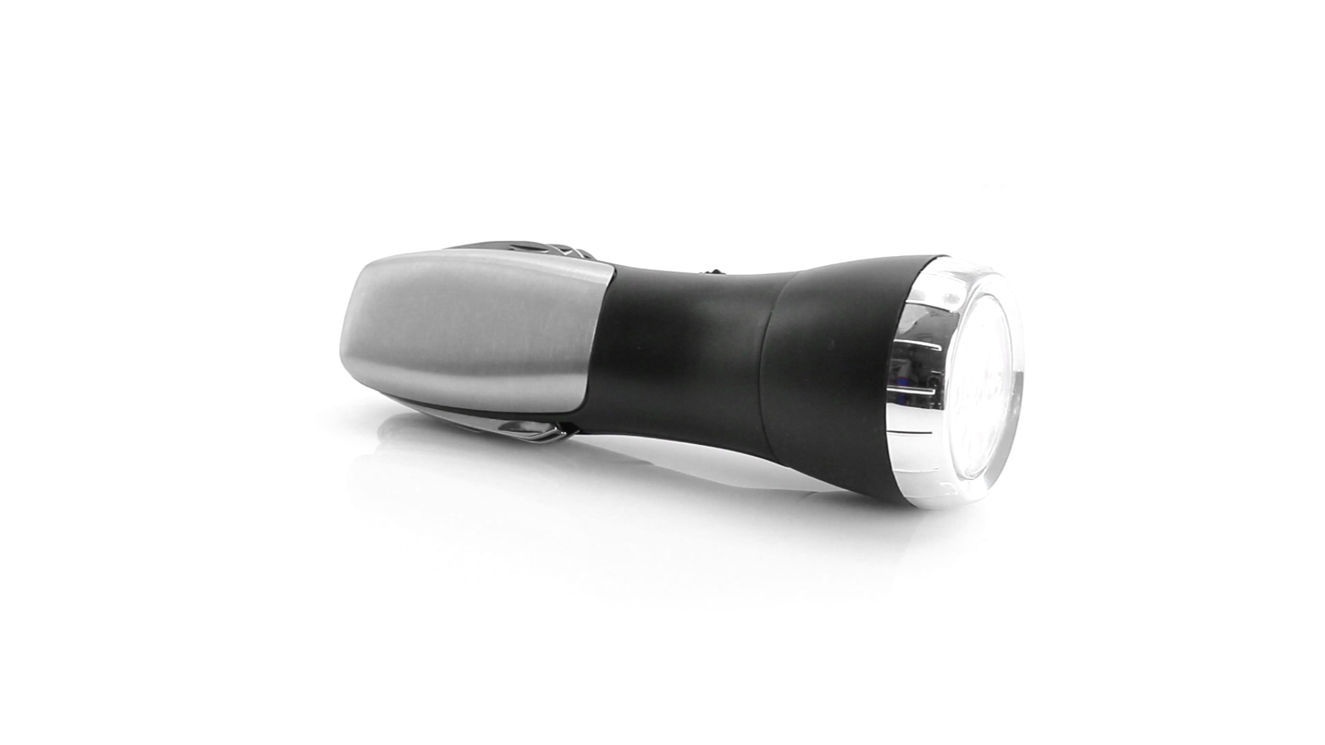 Multi-Tool mit robuster, rutschfester Oberfläche in Metallic-Farbe. Mit 12 Funktionen und eingebauter 4 LED-Taschenlampe. Enthält Schraubendreherköpfe, Messer, Schraubenschlüssel, Schere und Öffner. Präsentiert in einer individuellen Box. Batterie 1 x AAA nicht inklusive.