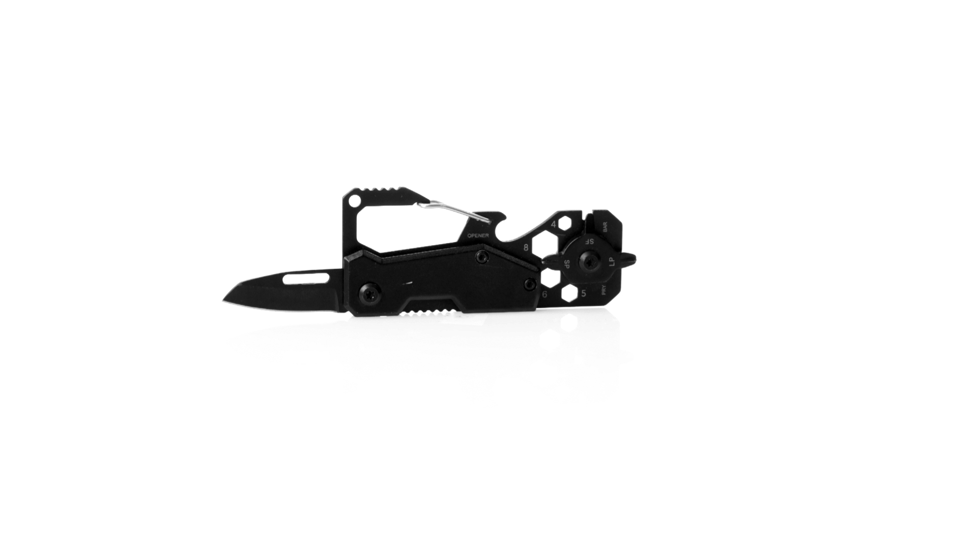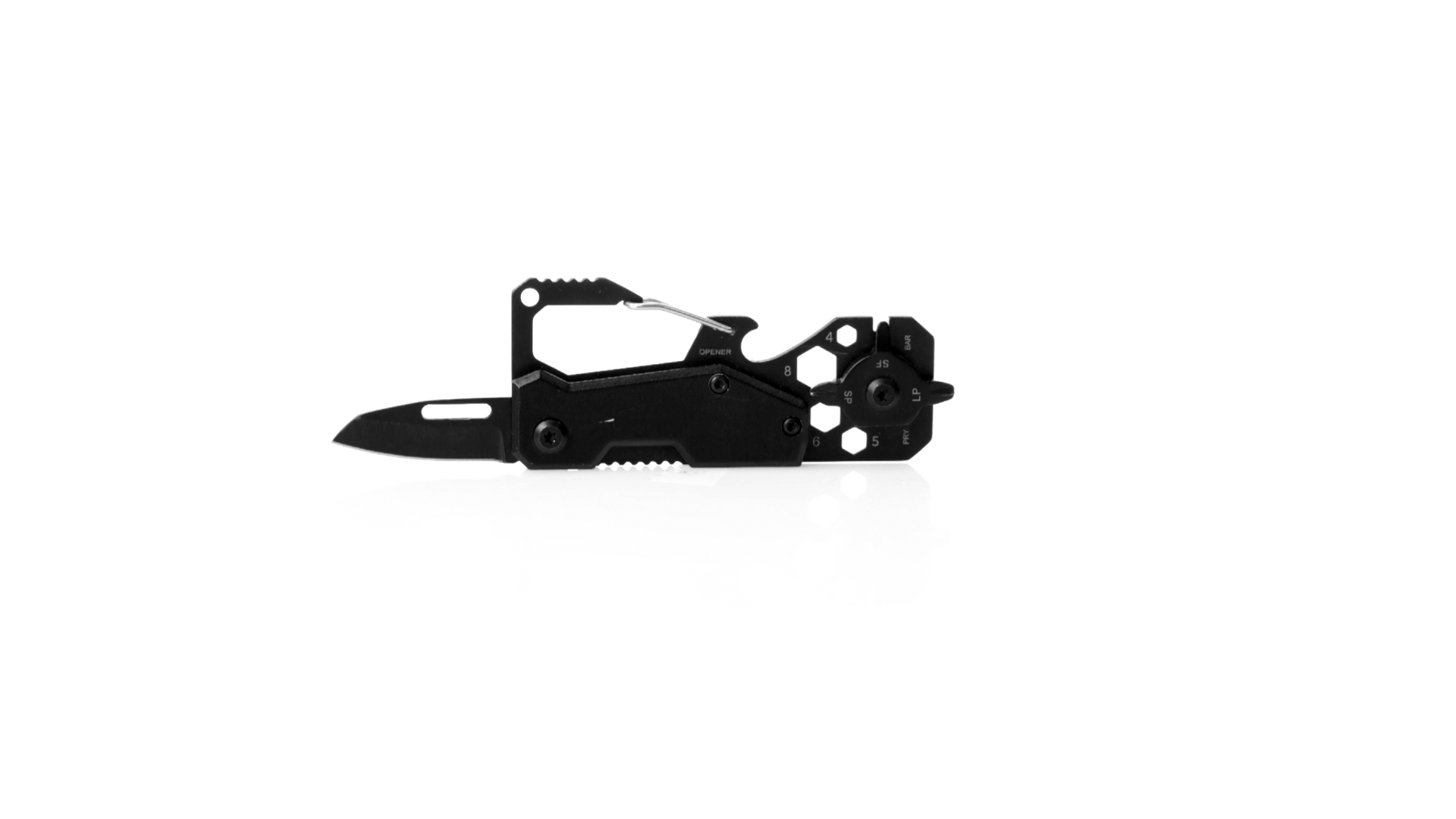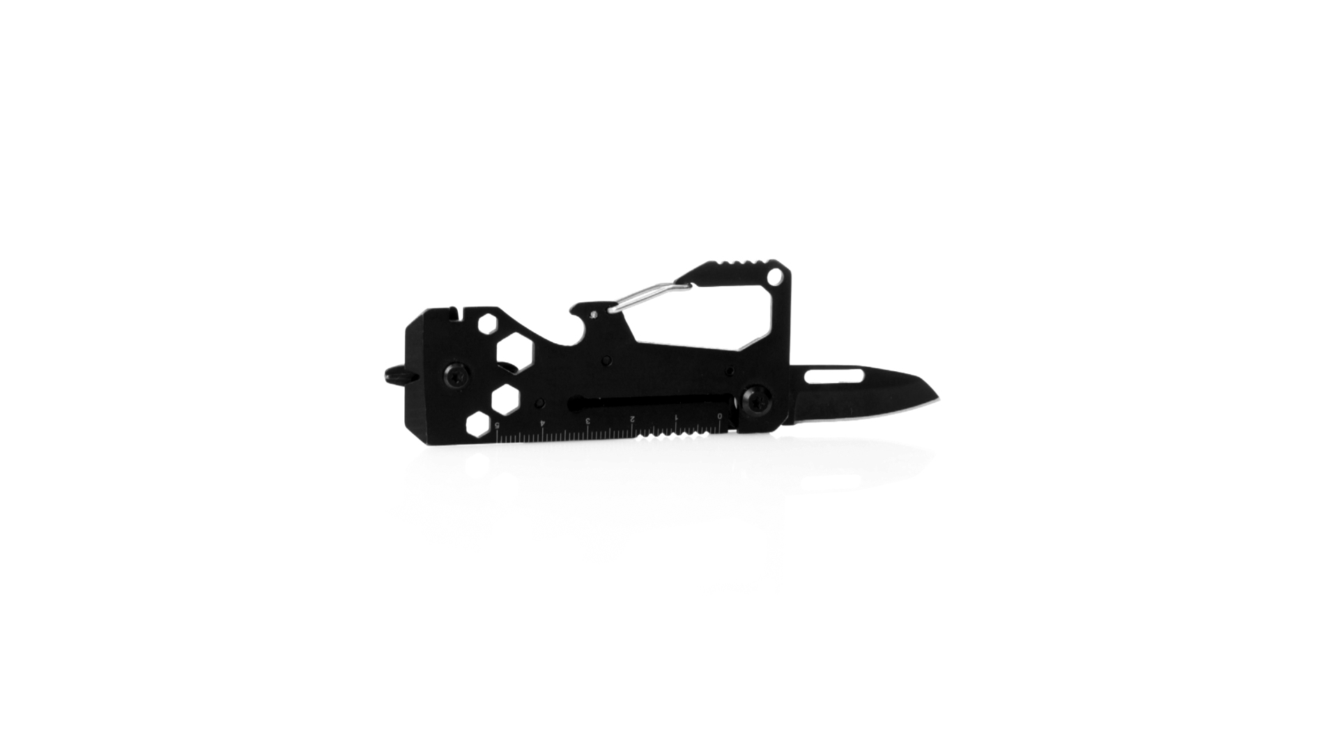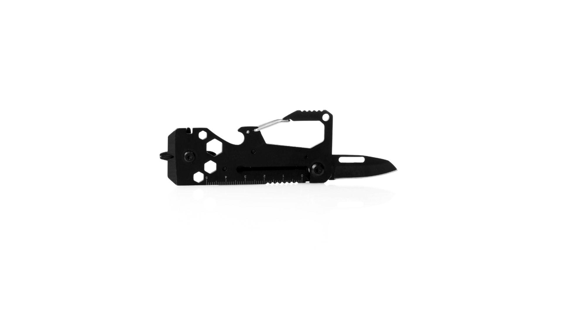 Hervorragendes Multitool aus Aluminium und Edelstahl mit schwarzer Oberfläche. Mit 13 verschiedenen Funktionen: Schraubenschlüssel für Sechskantmuttern in verschiedenen Grössen, Karabiner, Dosenöffner, Lineal, Schaber, Messer, Flach- und Kreuzschlitzschraubendreher. Präsentiert in einer Kraft-Design-Box.