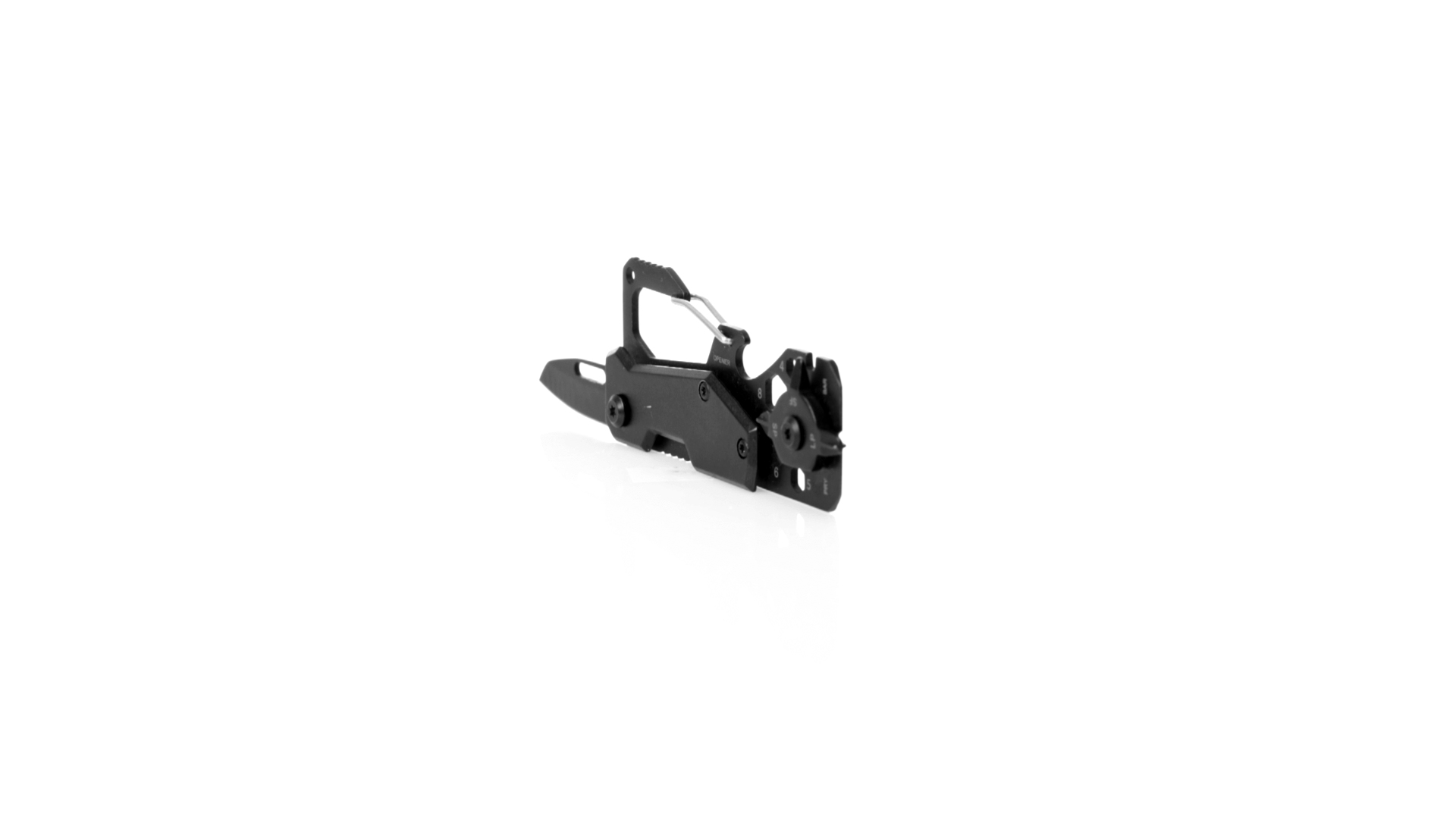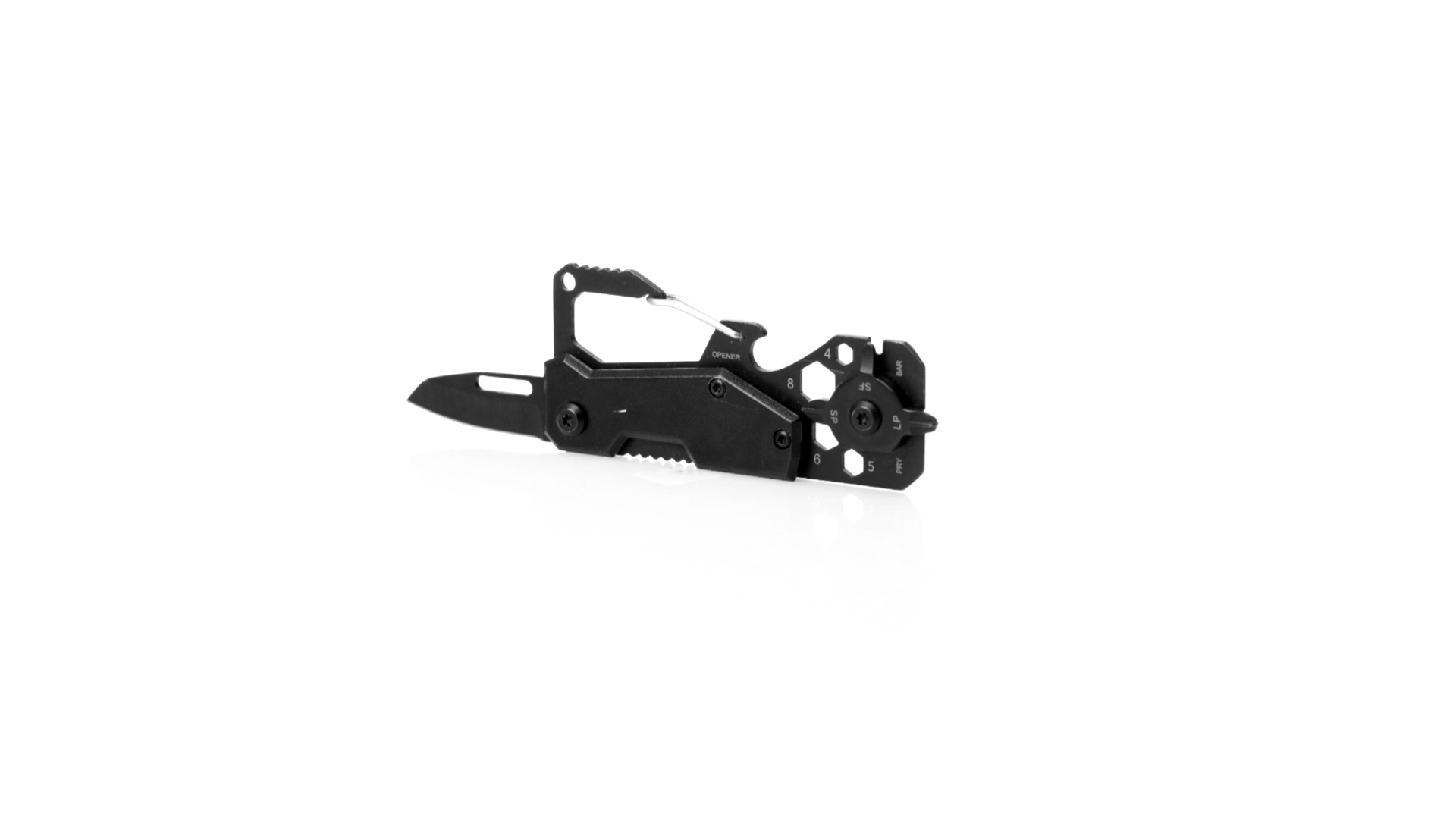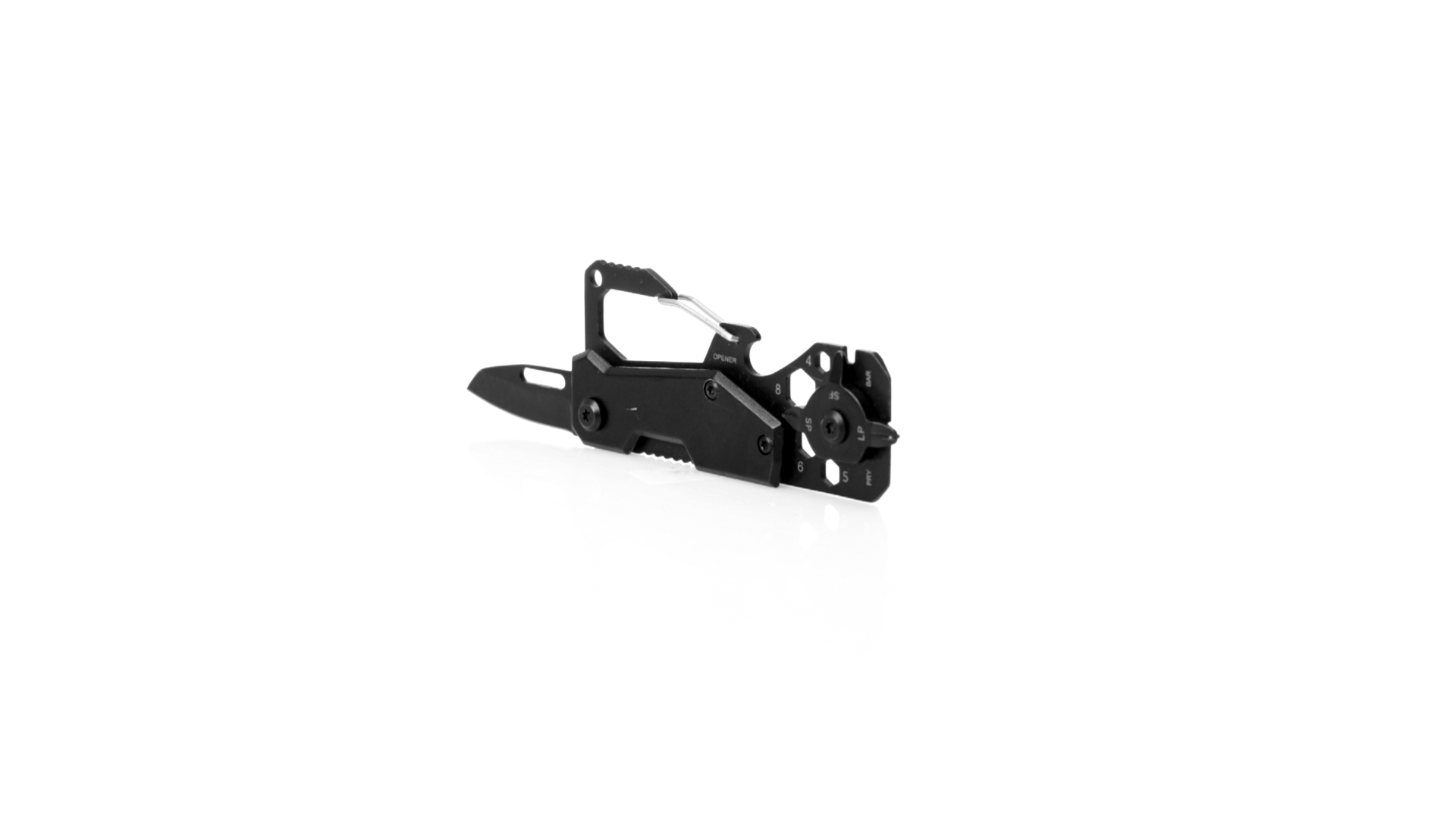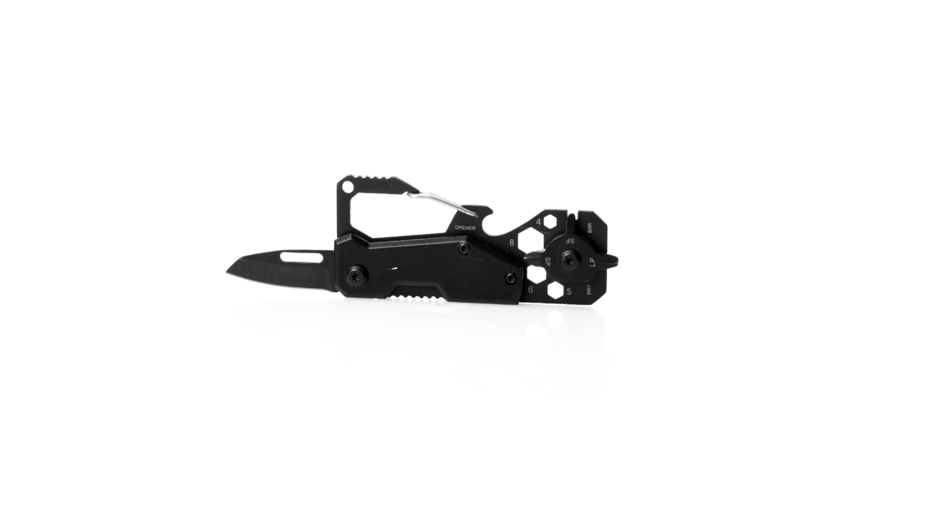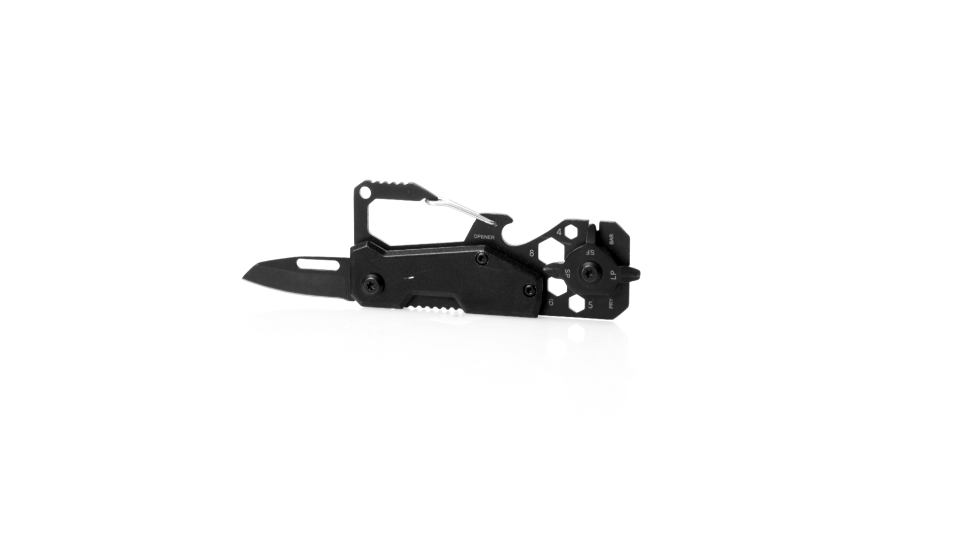 Hervorragendes Multitool aus Aluminium und Edelstahl mit schwarzer Oberfläche. Mit 13 verschiedenen Funktionen: Schraubenschlüssel für Sechskantmuttern in verschiedenen Grössen, Karabiner, Dosenöffner, Lineal, Schaber, Messer, Flach- und Kreuzschlitzschraubendreher. Präsentiert in einer Kraft-Design-Box.