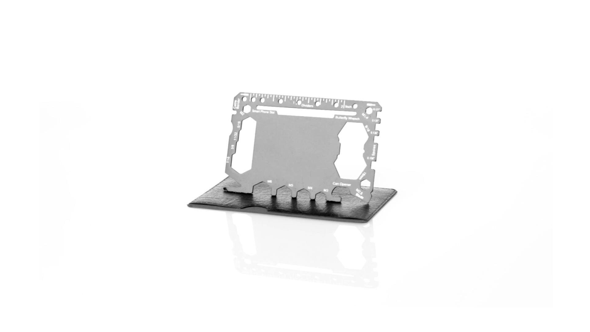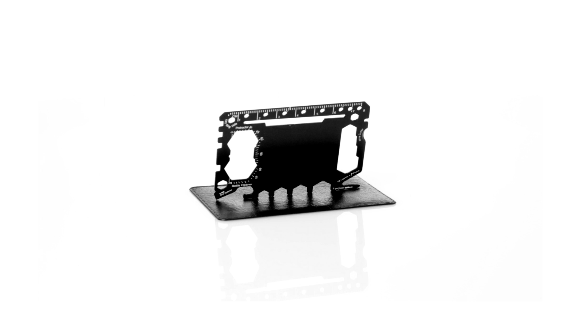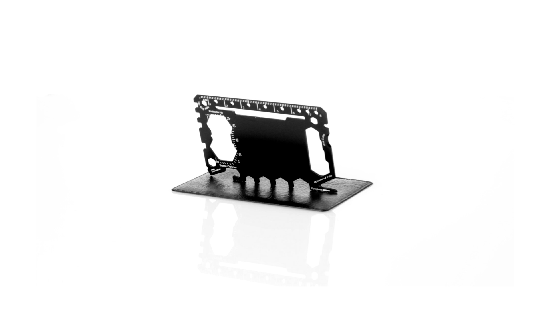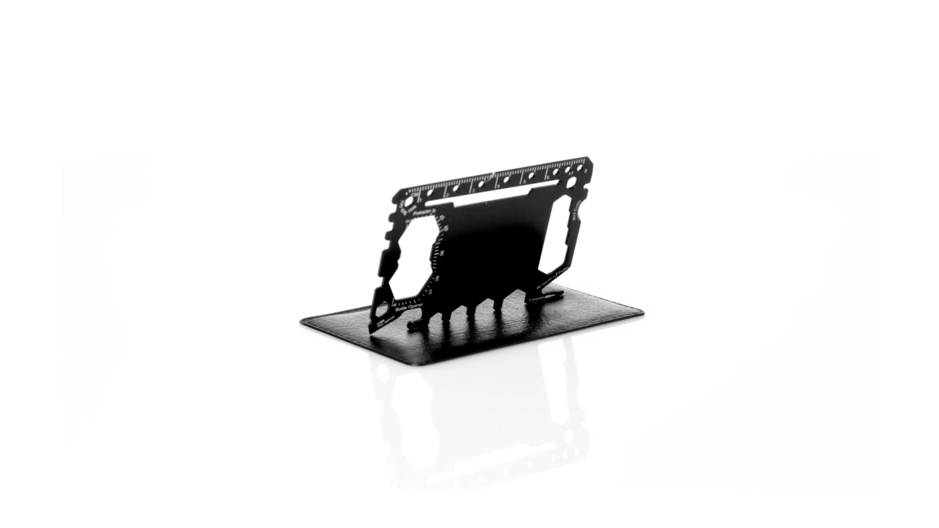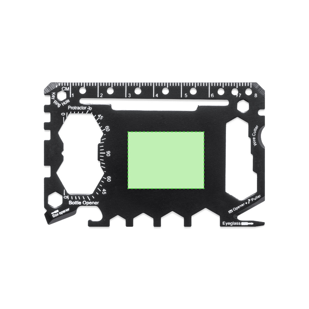 Multitool mit robustem Gehäuse aus rostfreiem Stahl und 17 Funktionen. Unter anderem: Dosenöffner, Messer, Schraubendreher, Lineal, Flaschenöffner, Schraubenschlüssel, Butterfly-Schlüssel und Winkelmesser.