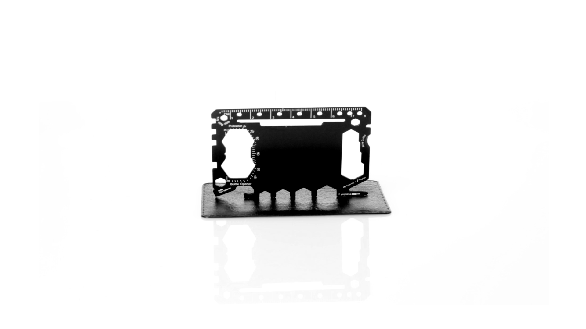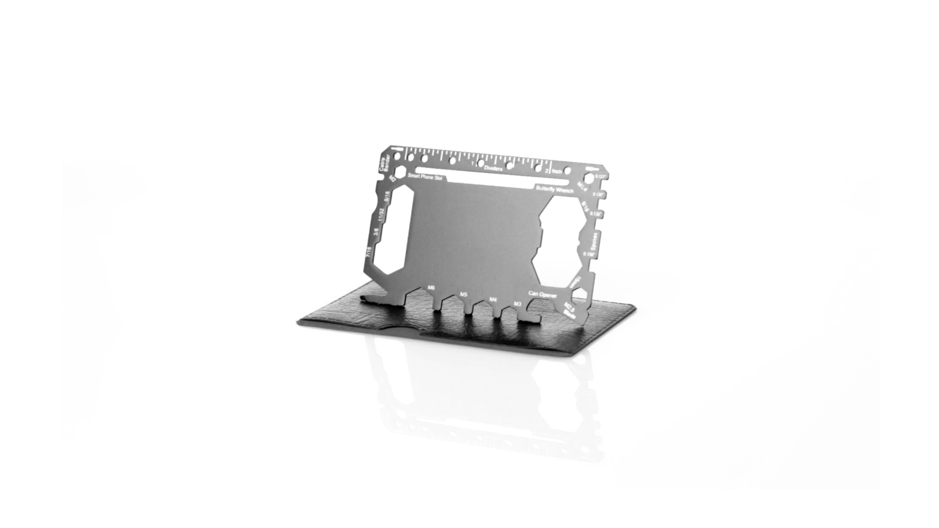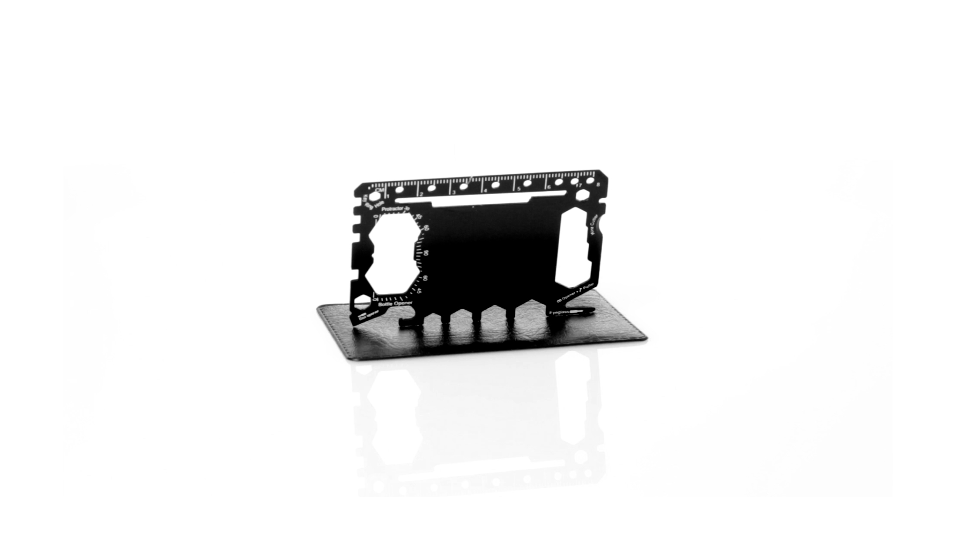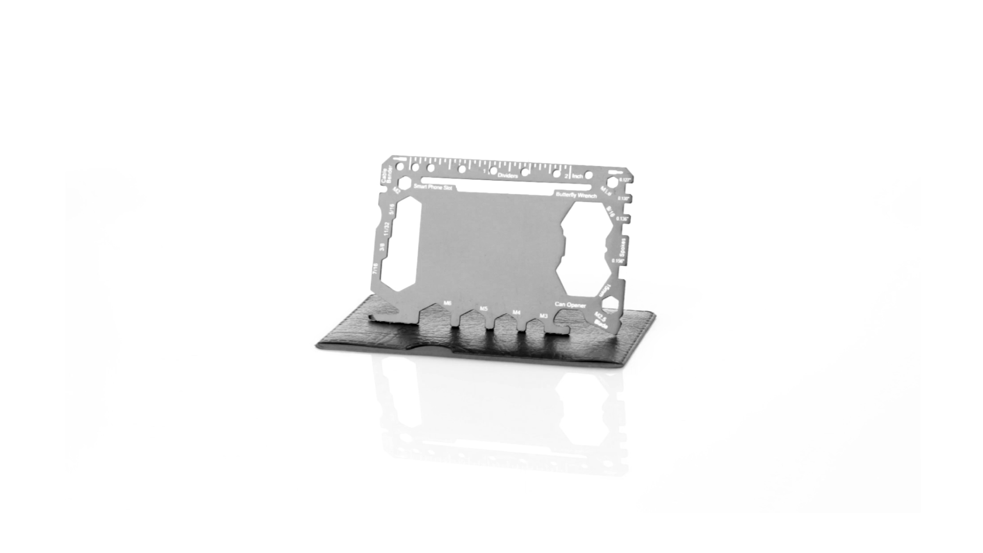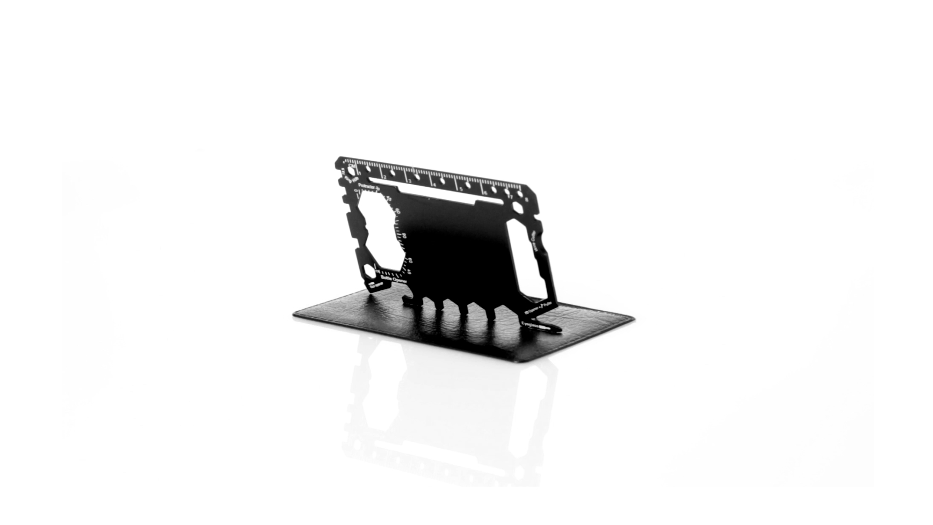 Multitool mit robustem Gehäuse aus rostfreiem Stahl und 17 Funktionen. Unter anderem: Dosenöffner, Messer, Schraubendreher, Lineal, Flaschenöffner, Schraubenschlüssel, Butterfly-Schlüssel und Winkelmesser.