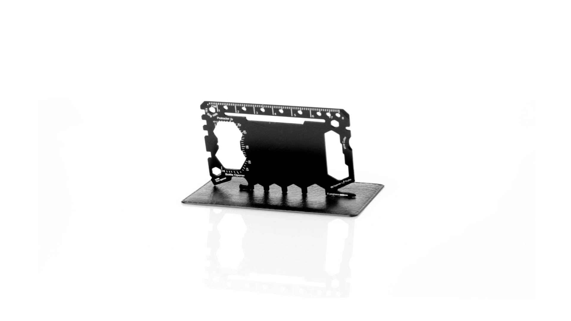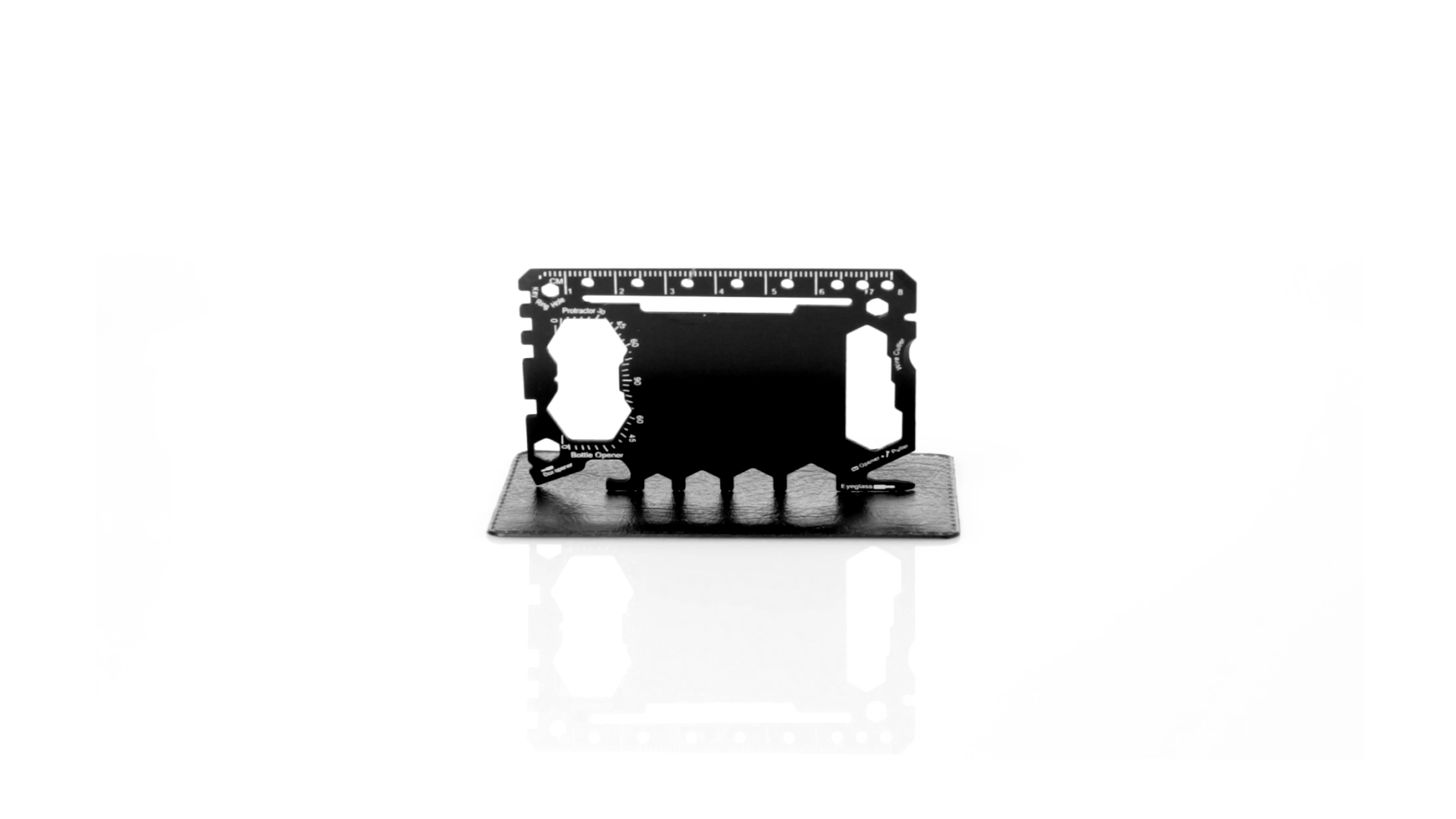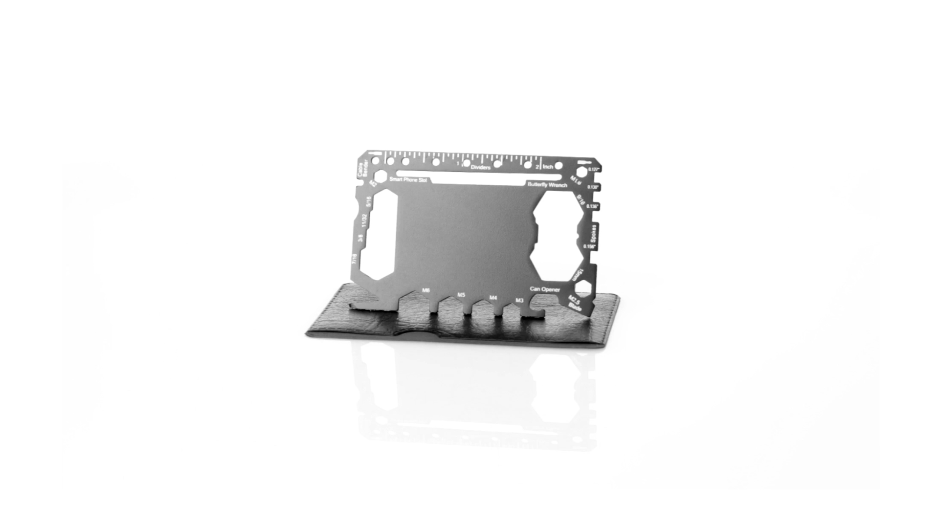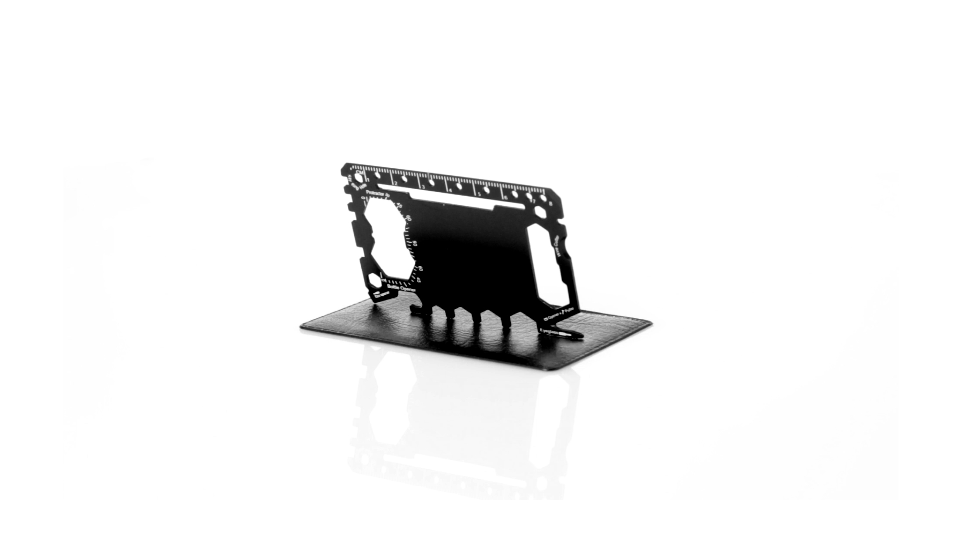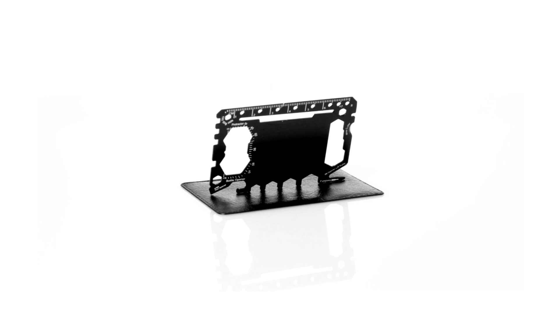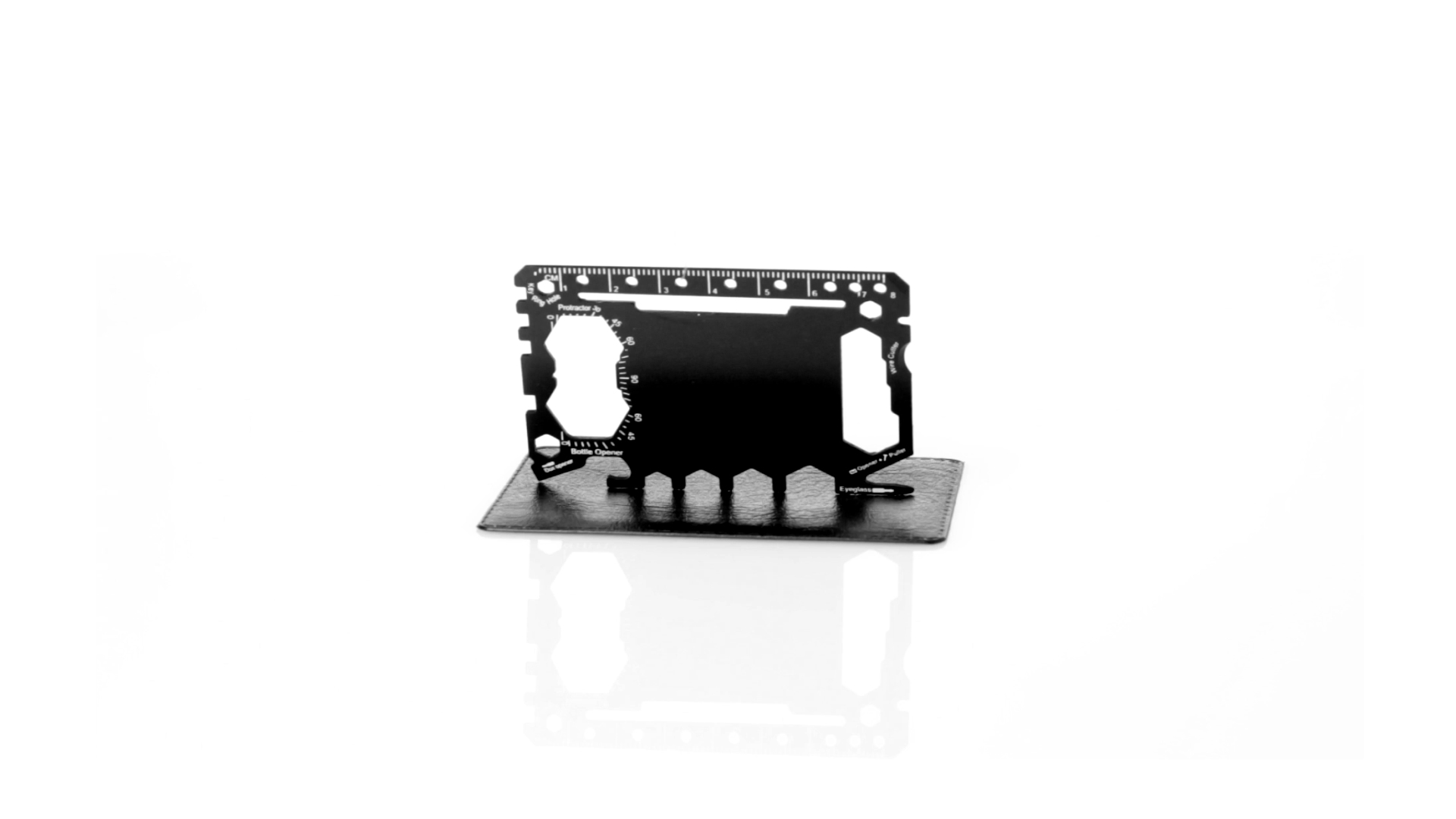 Multitool mit robustem Gehäuse aus rostfreiem Stahl und 17 Funktionen. Unter anderem: Dosenöffner, Messer, Schraubendreher, Lineal, Flaschenöffner, Schraubenschlüssel, Butterfly-Schlüssel und Winkelmesser.