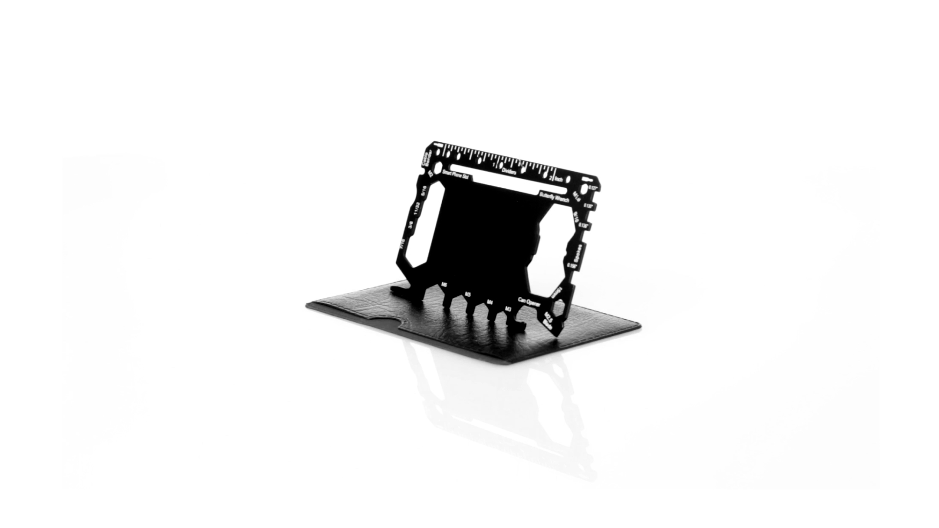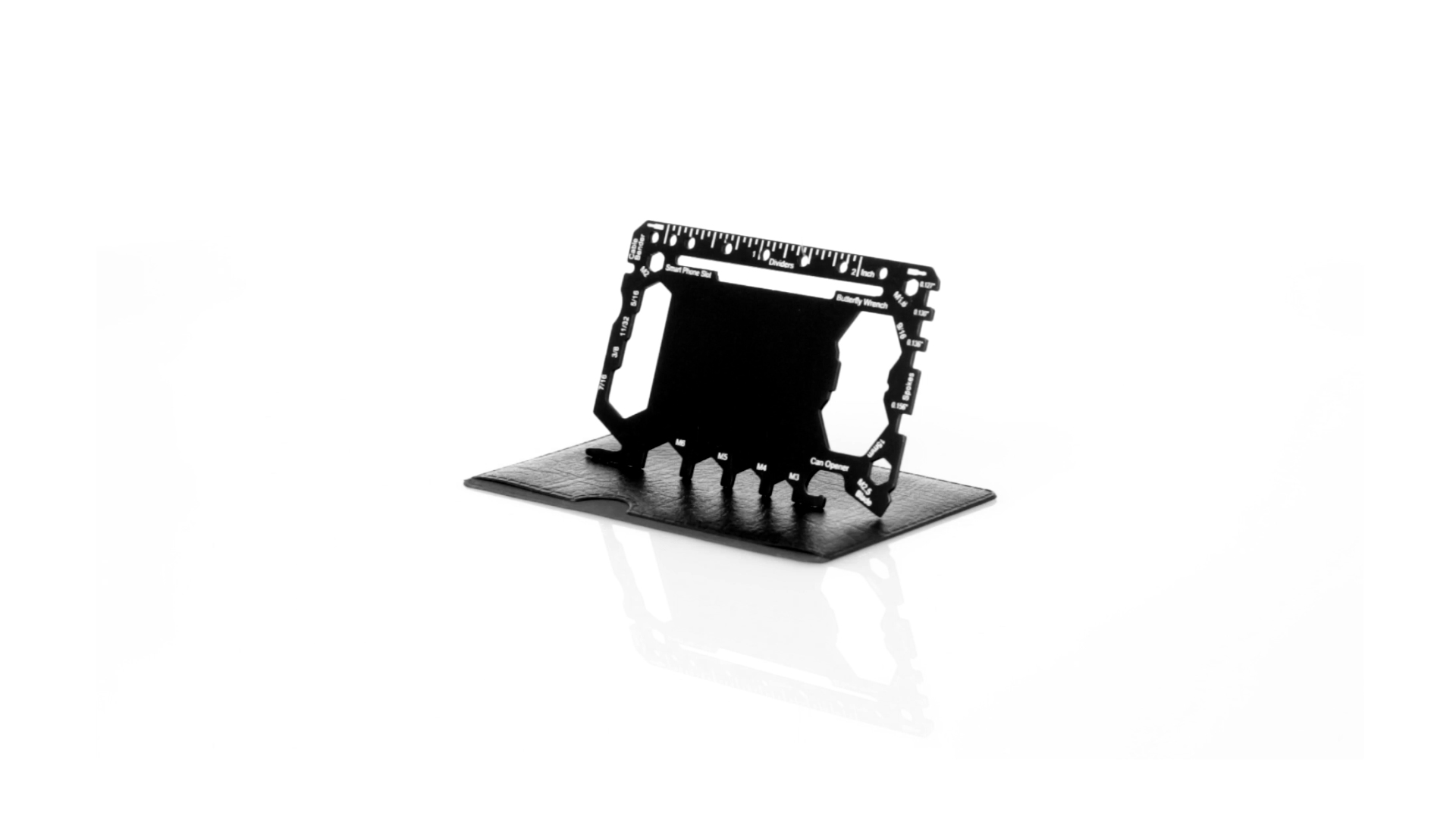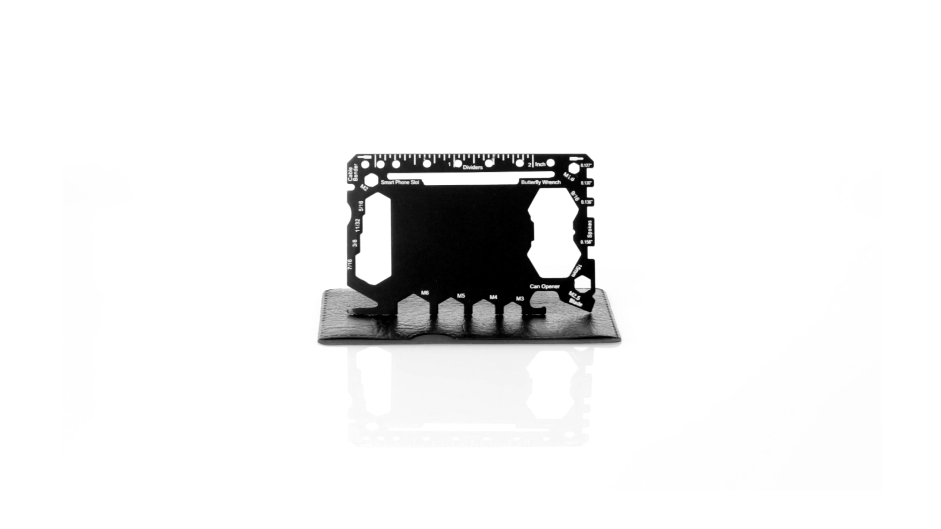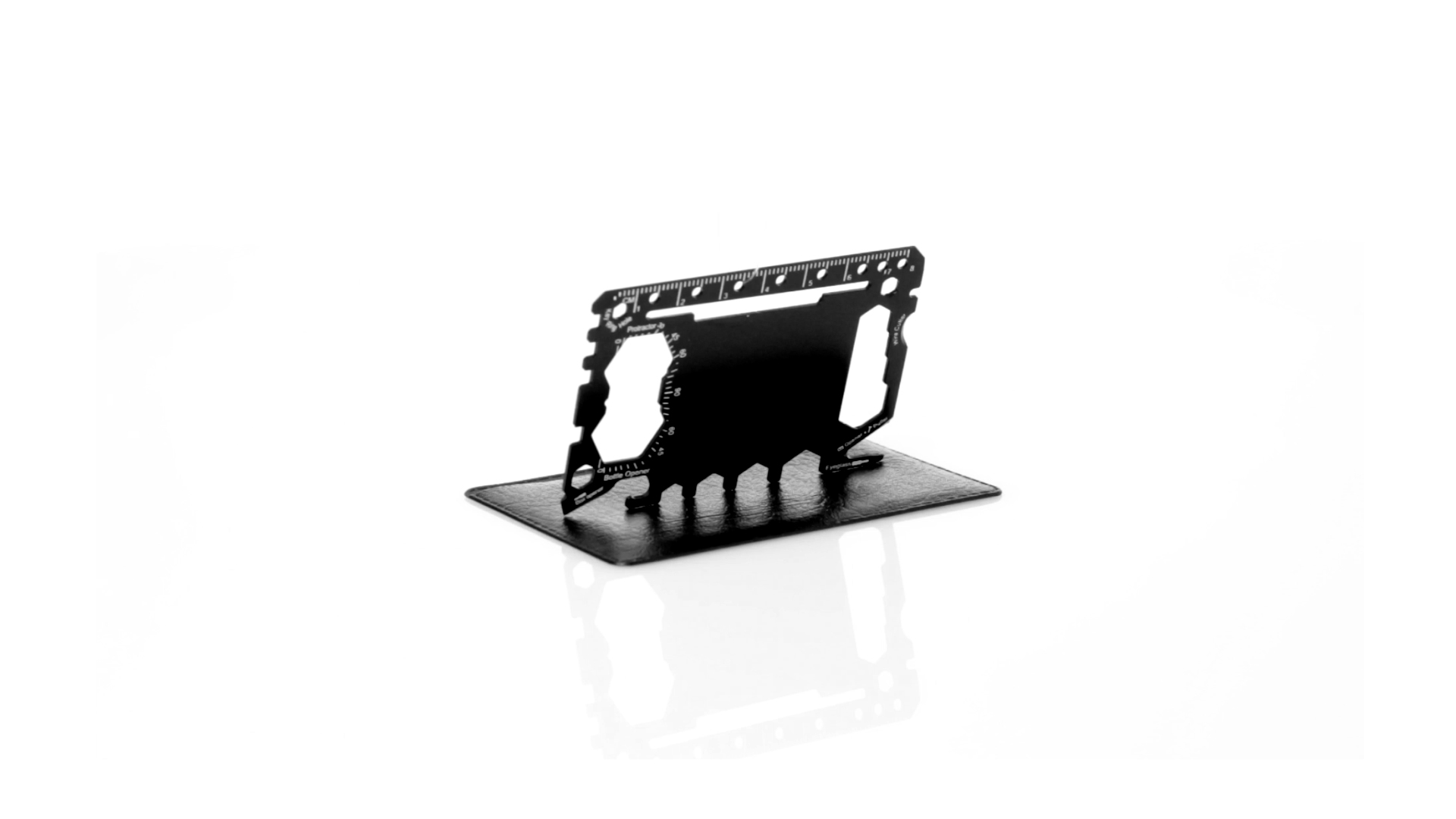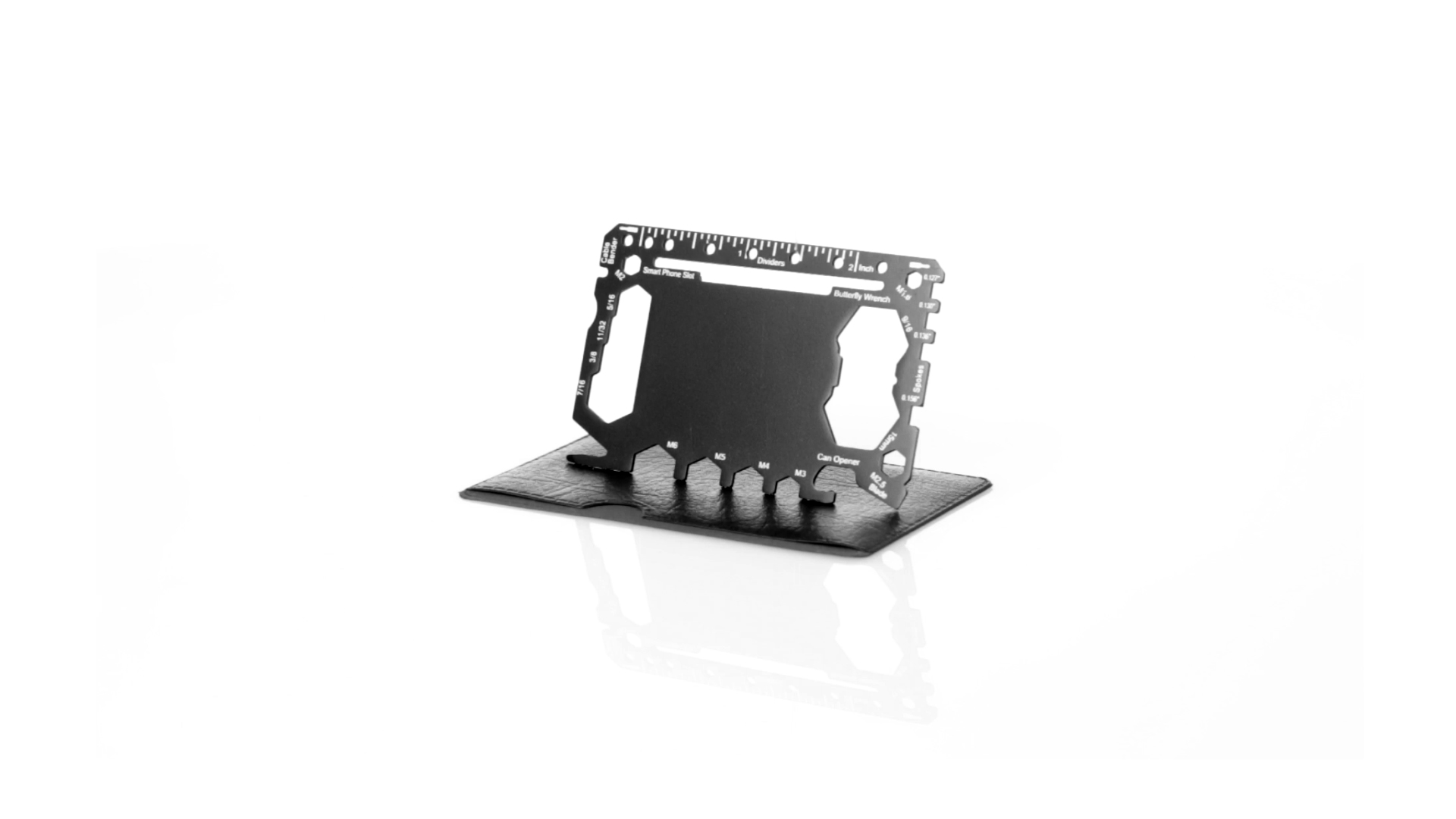Multitool mit robustem Gehäuse aus rostfreiem Stahl und 17 Funktionen. Unter anderem: Dosenöffner, Messer, Schraubendreher, Lineal, Flaschenöffner, Schraubenschlüssel, Butterfly-Schlüssel und Winkelmesser.