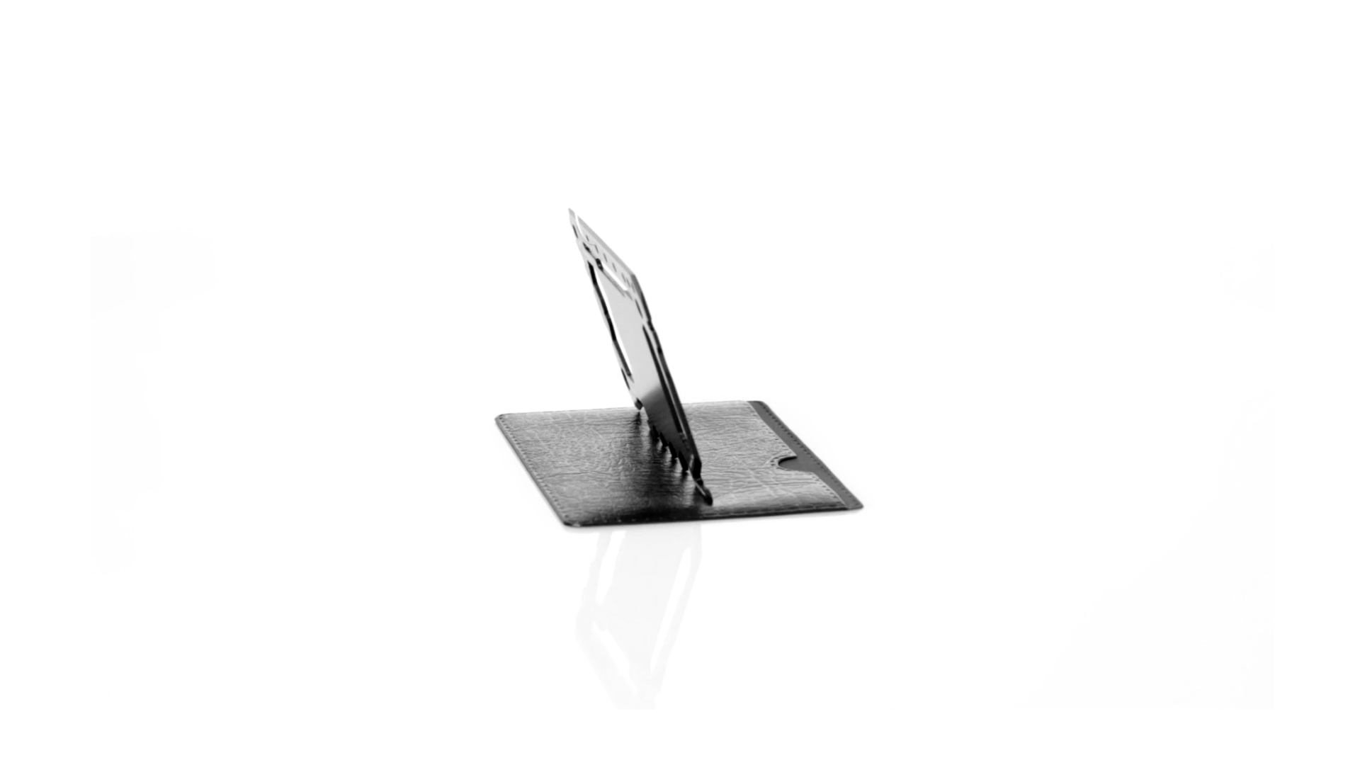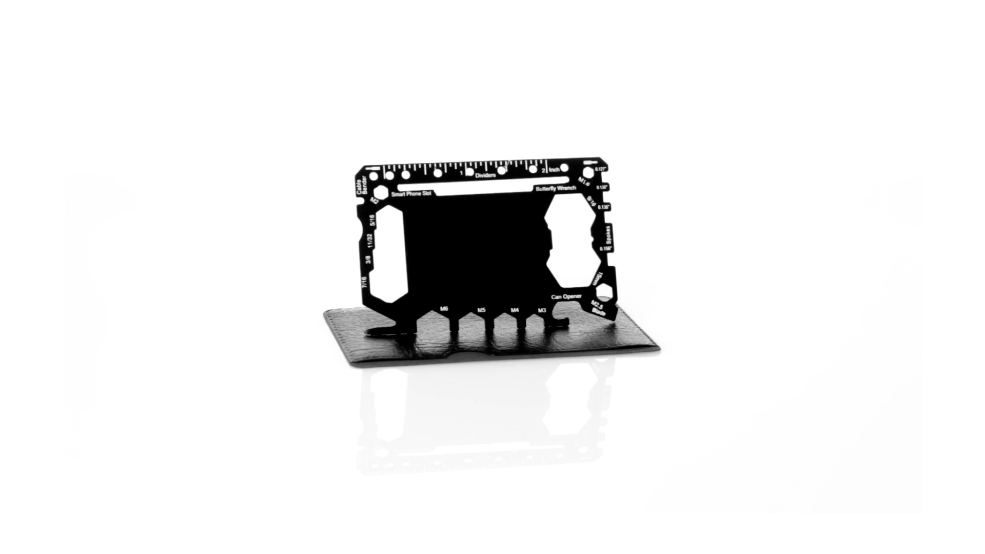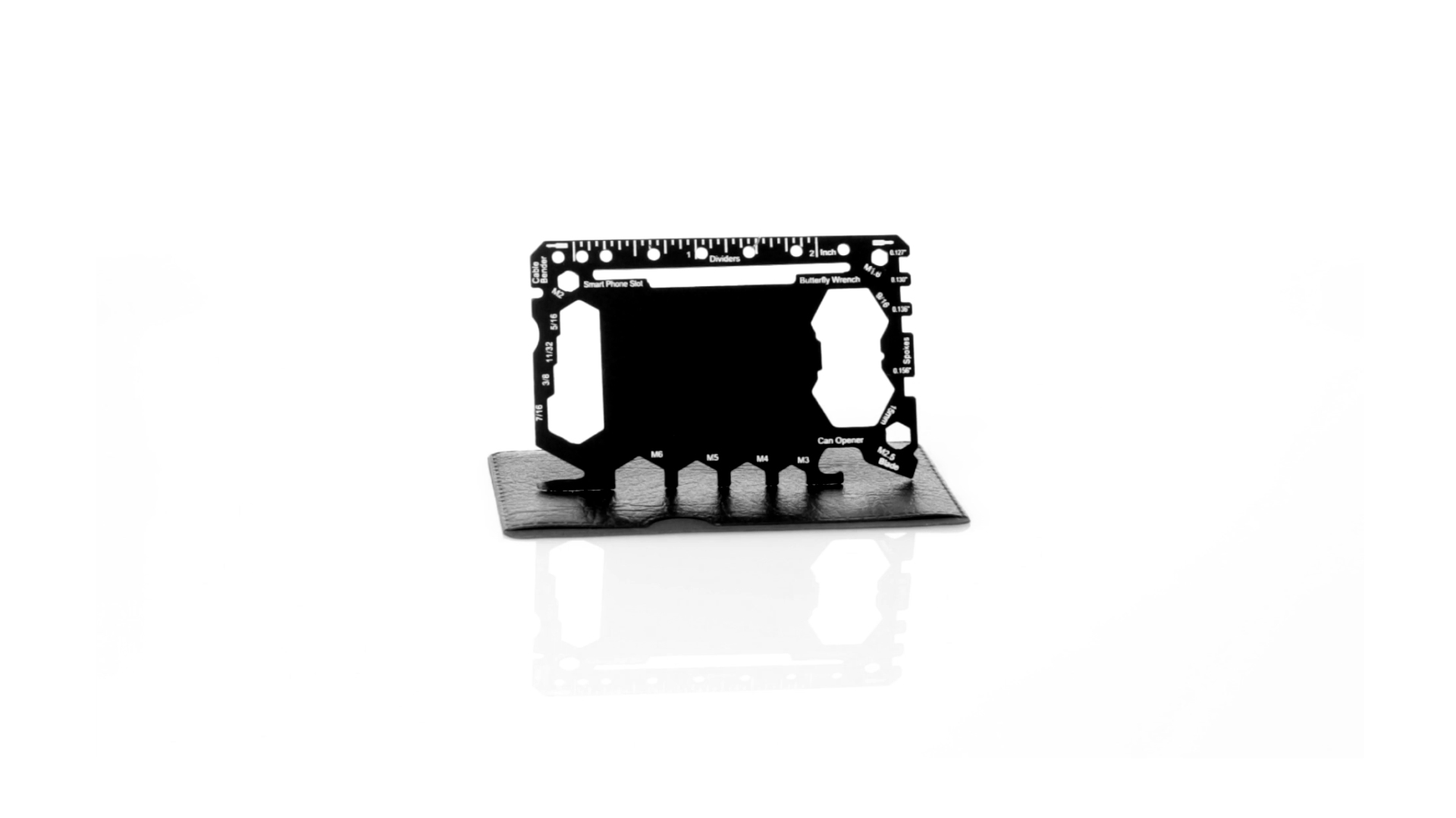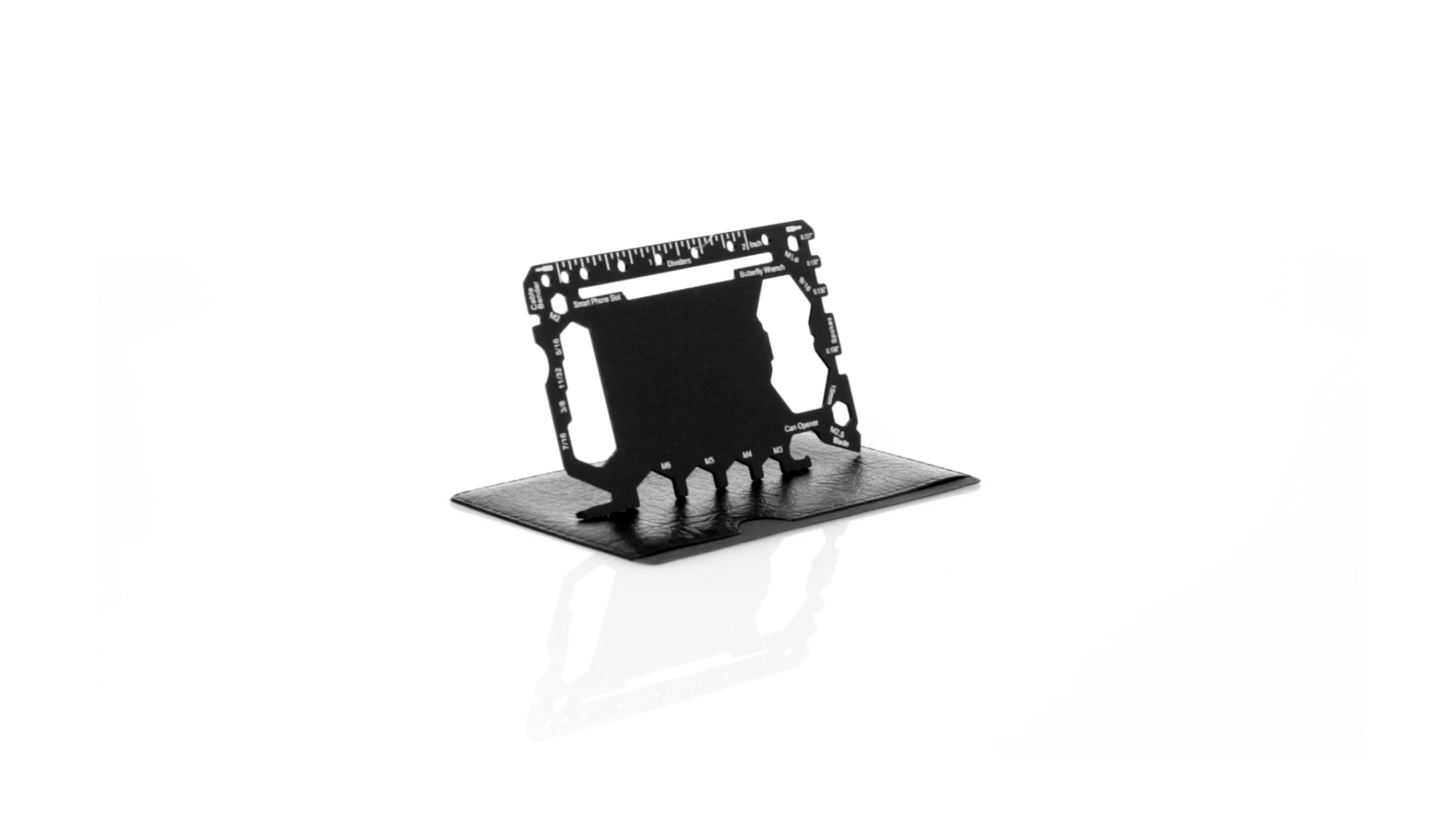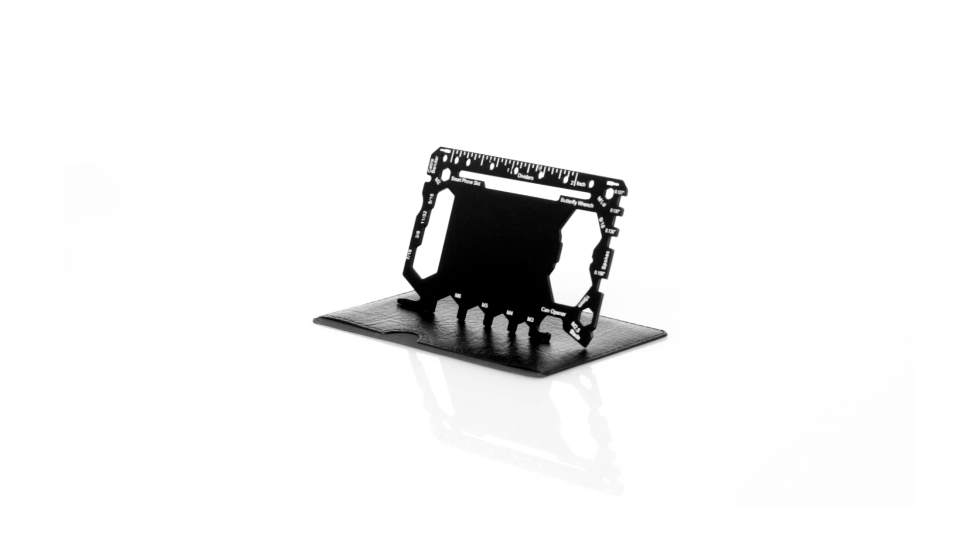 Multitool mit robustem Gehäuse aus rostfreiem Stahl und 17 Funktionen. Unter anderem: Dosenöffner, Messer, Schraubendreher, Lineal, Flaschenöffner, Schraubenschlüssel, Butterfly-Schlüssel und Winkelmesser.