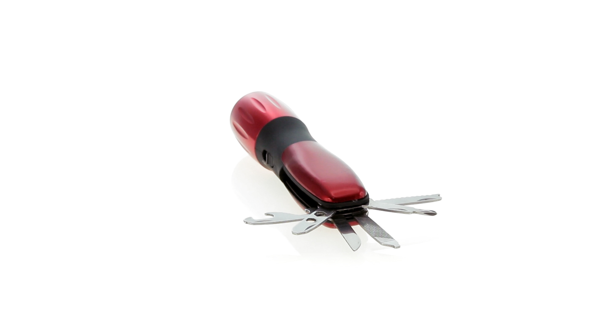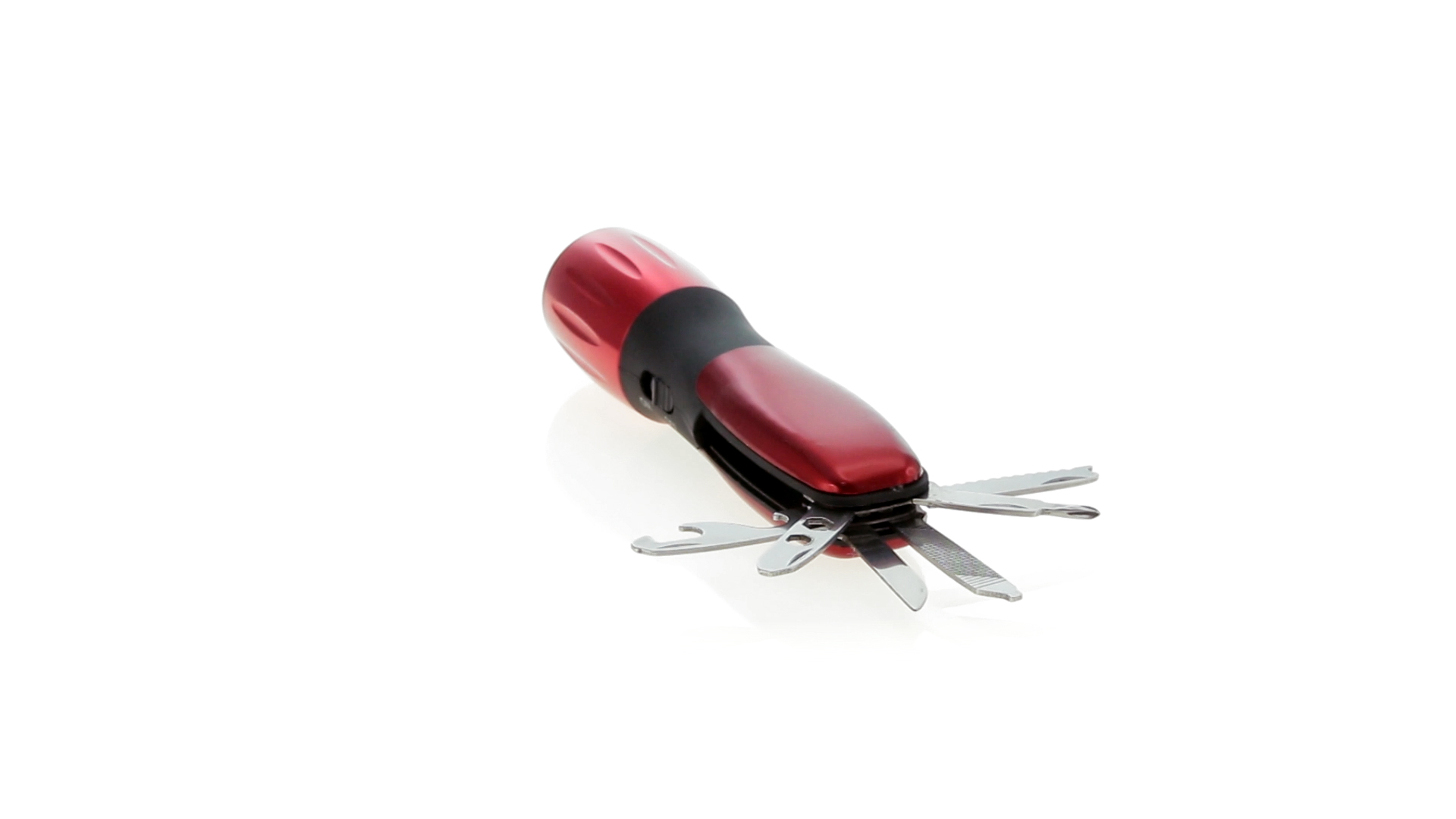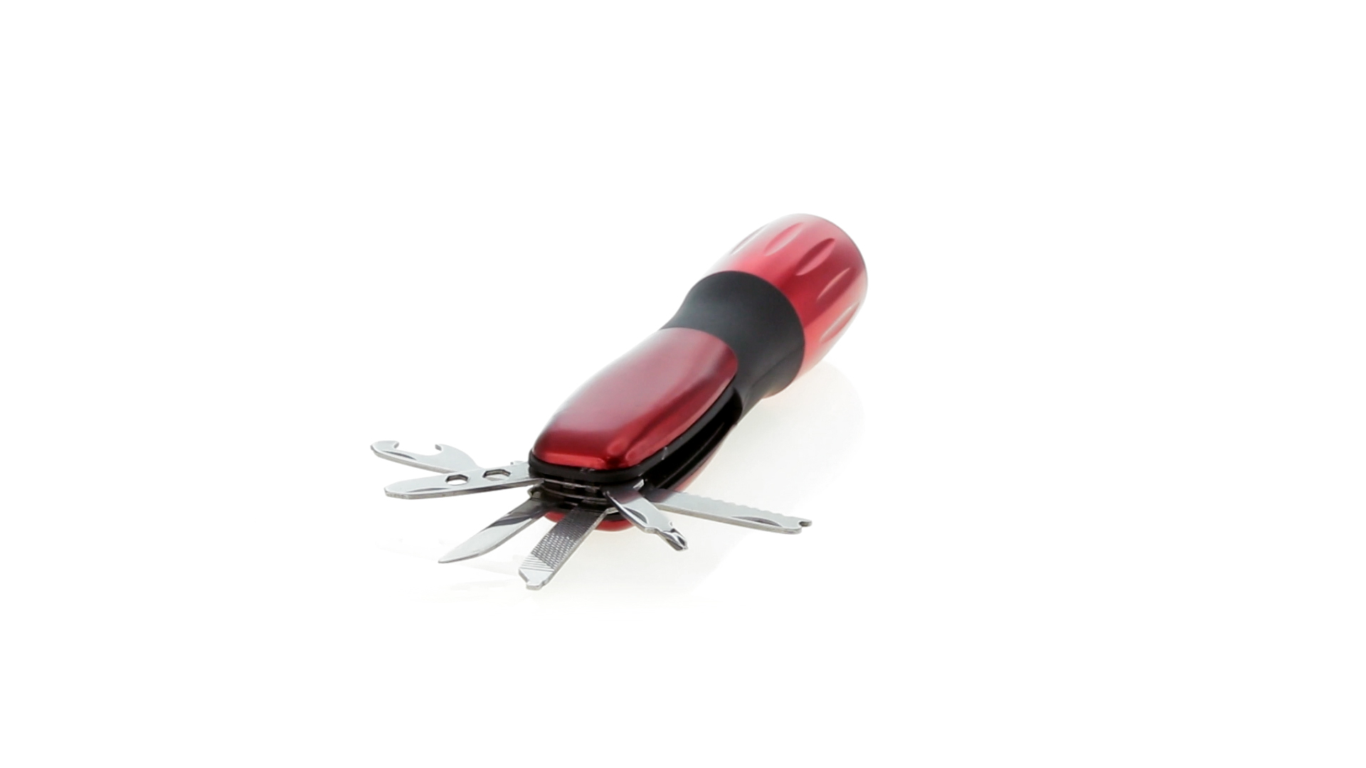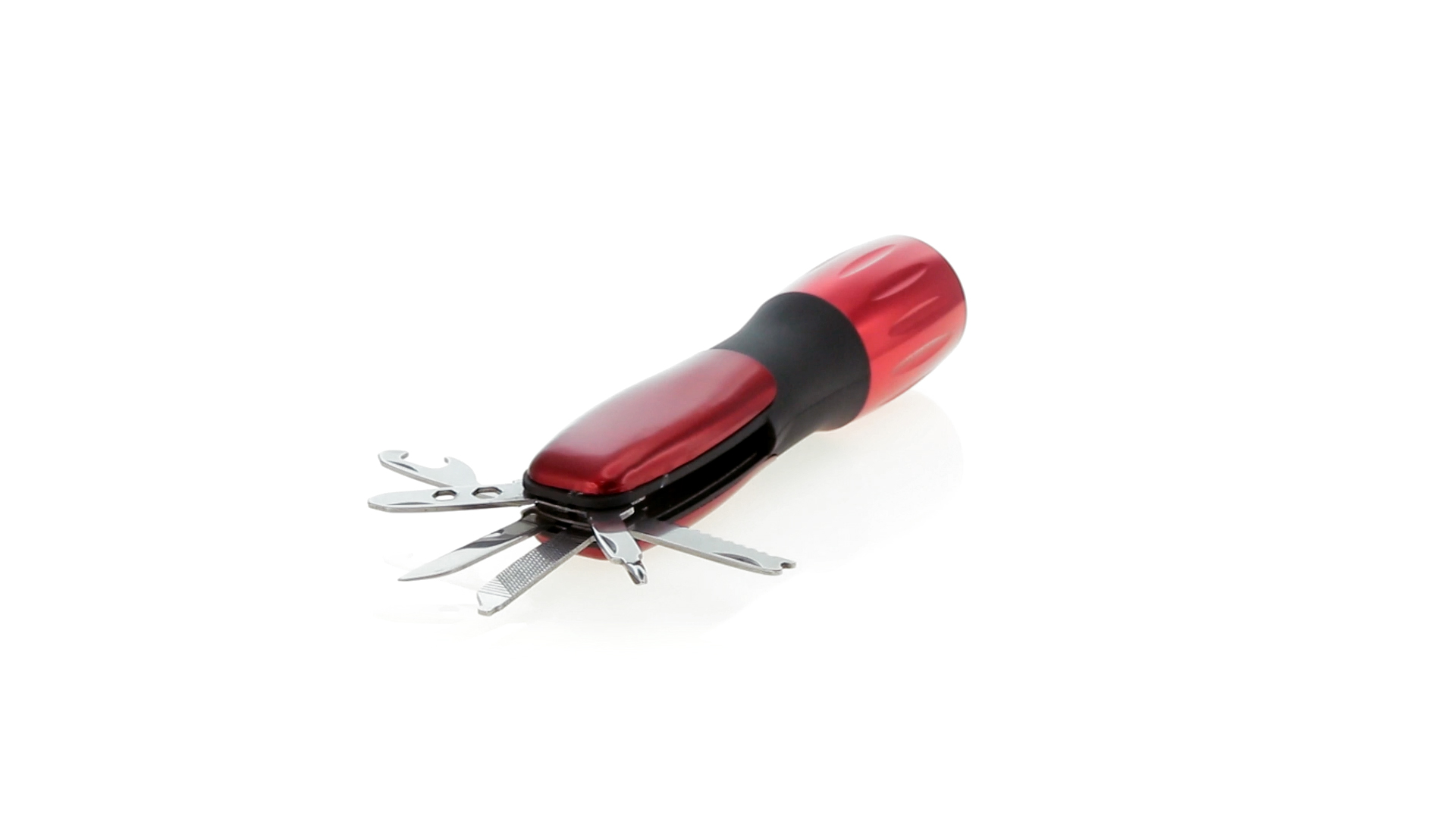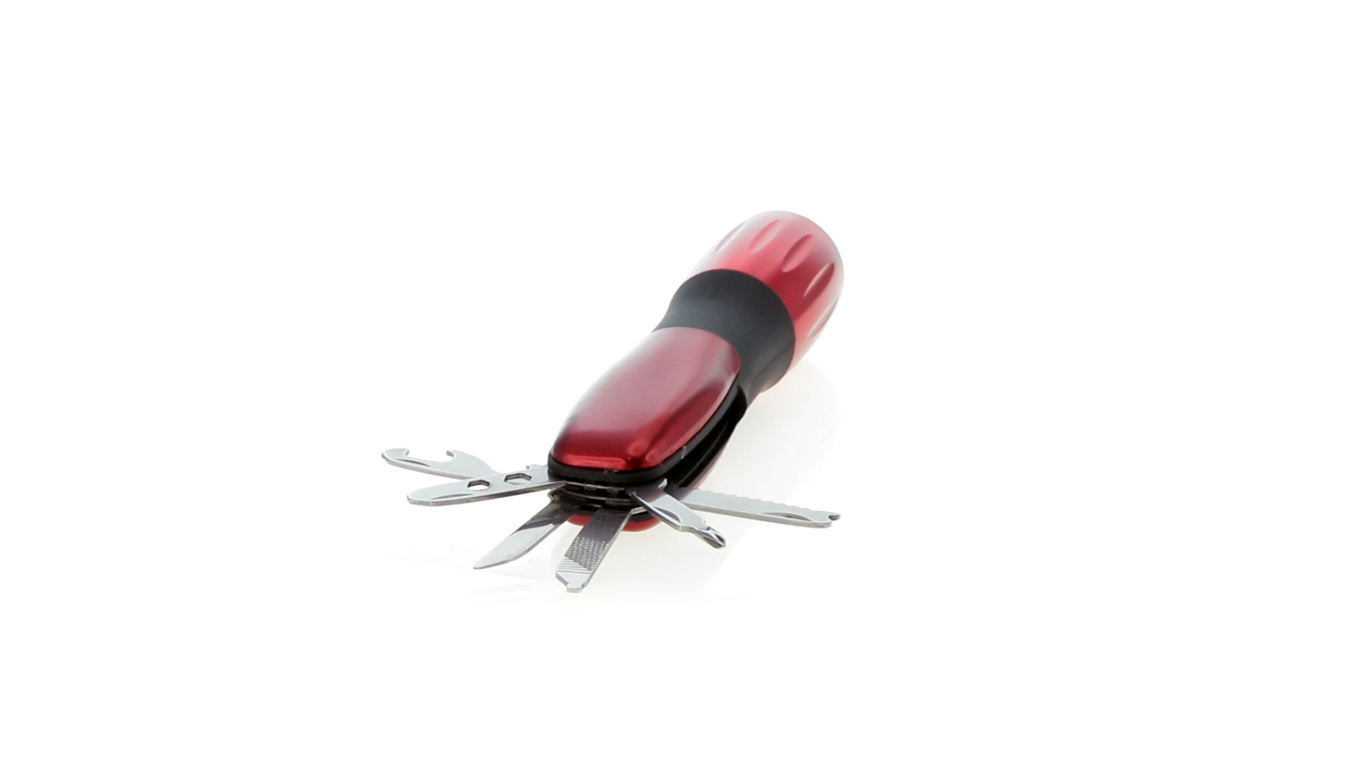 Multi-Tool mit robustem, rutschfestem Aluminiumgehäuse in einer Vielzahl von Metallic-Farben. Mit 9 Funktionen und integrierter LED-Taschenlampe. Enthält Schraubendreheraufsätze, Messer, Säge, Schraubenschlüssel und Flaschenöffner. Knopfzellen inklusive. Präsentiert in einer individuellen Box.
