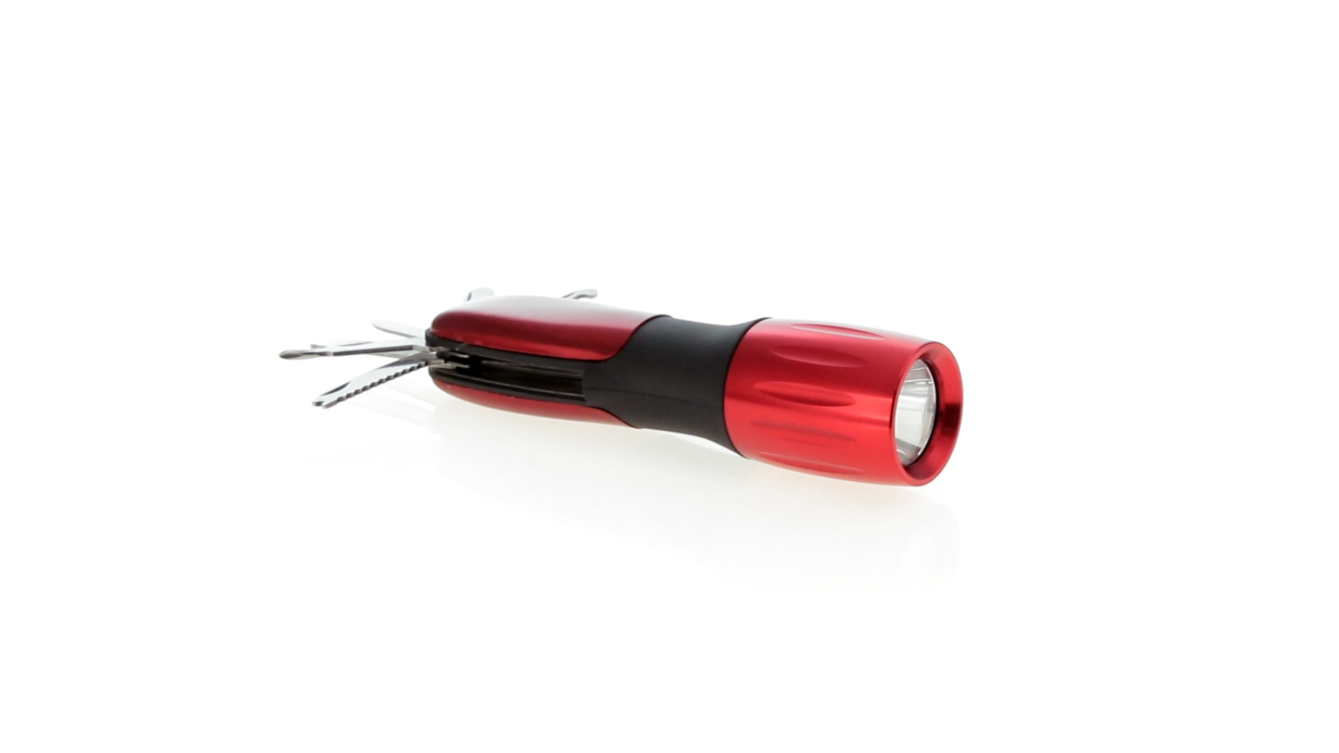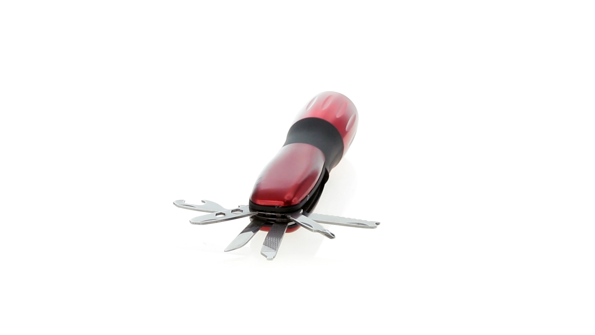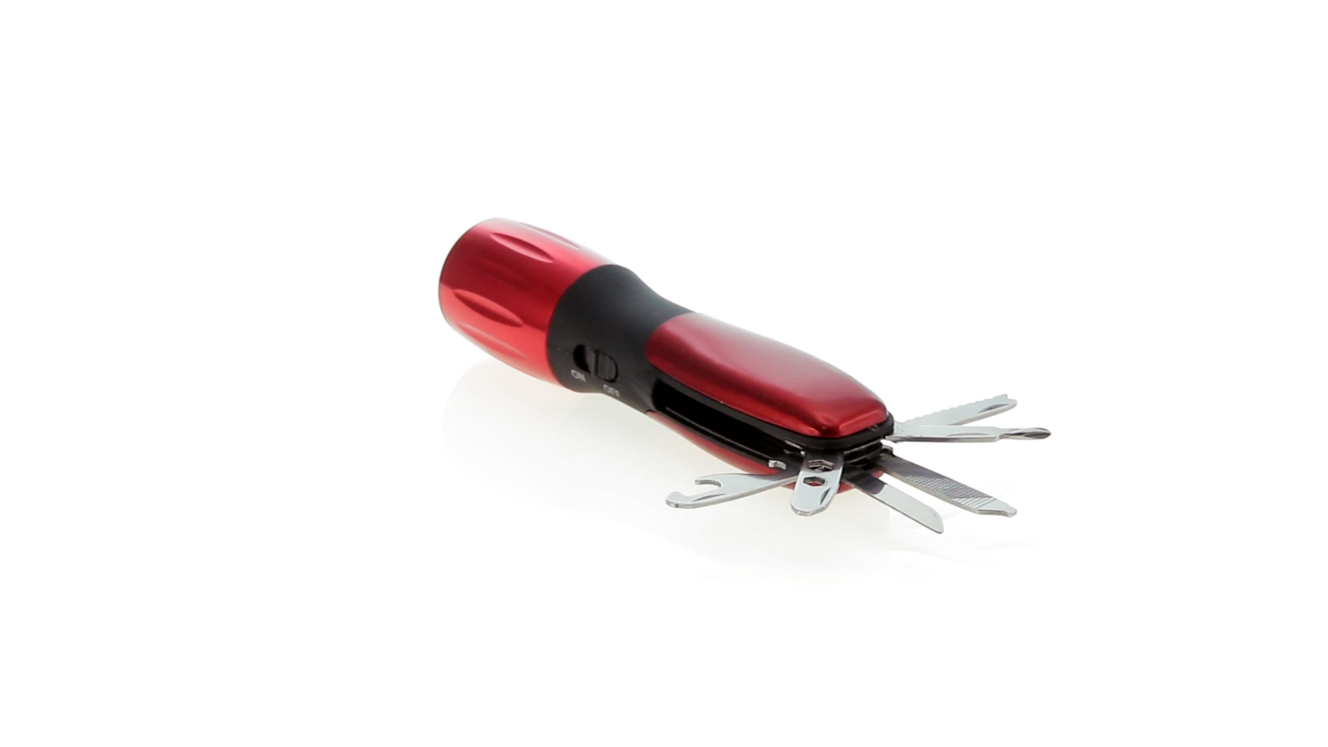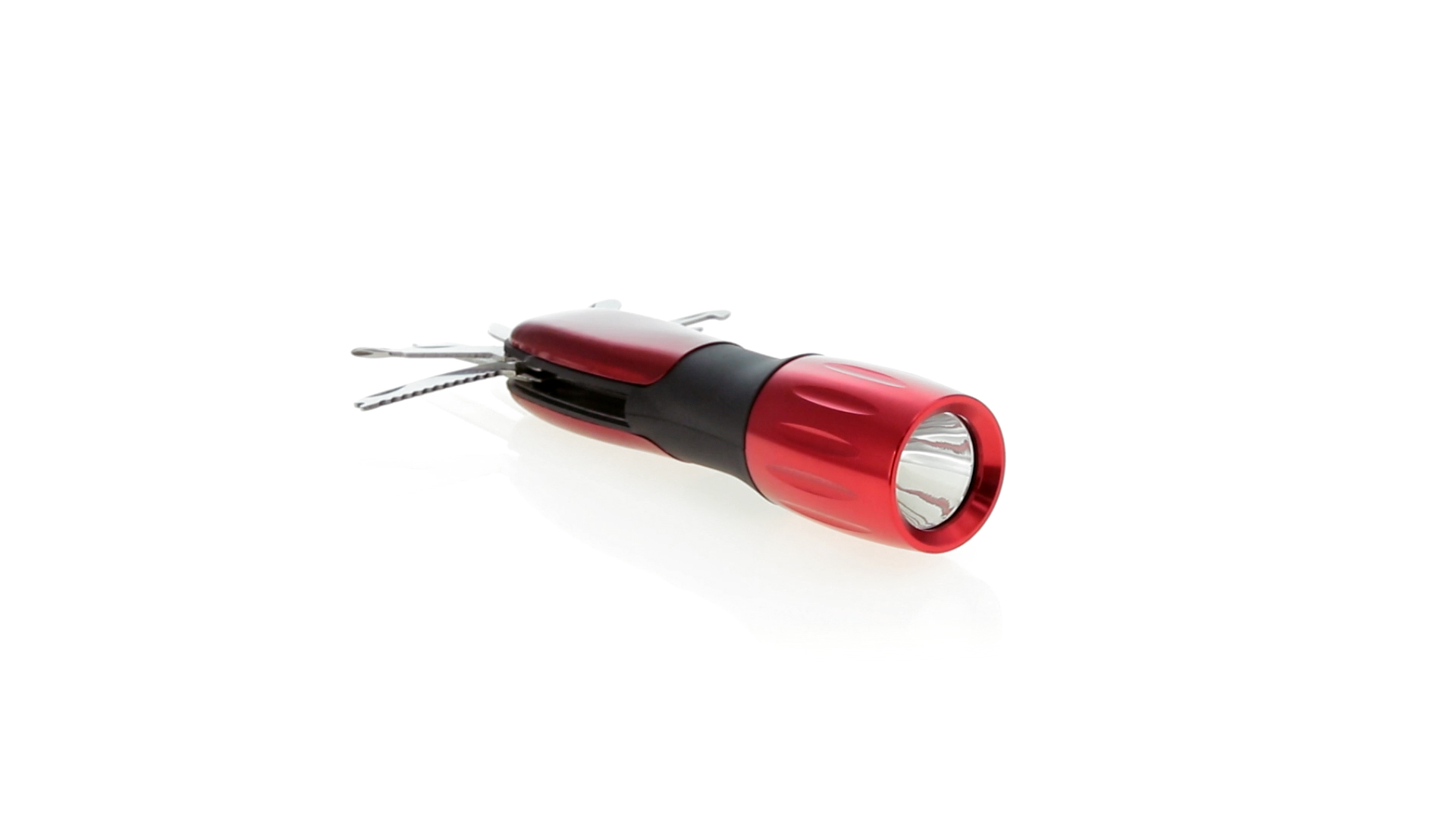 Multi-Tool mit robustem, rutschfestem Aluminiumgehäuse in einer Vielzahl von Metallic-Farben. Mit 9 Funktionen und integrierter LED-Taschenlampe. Enthält Schraubendreheraufsätze, Messer, Säge, Schraubenschlüssel und Flaschenöffner. Knopfzellen inklusive. Präsentiert in einer individuellen Box.