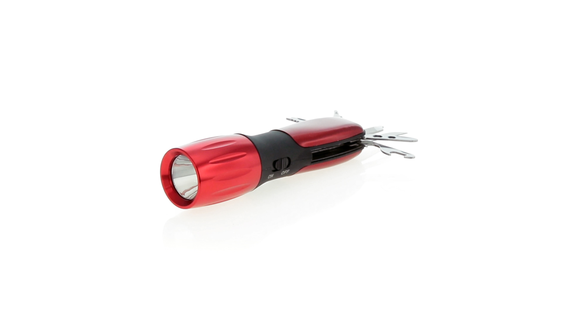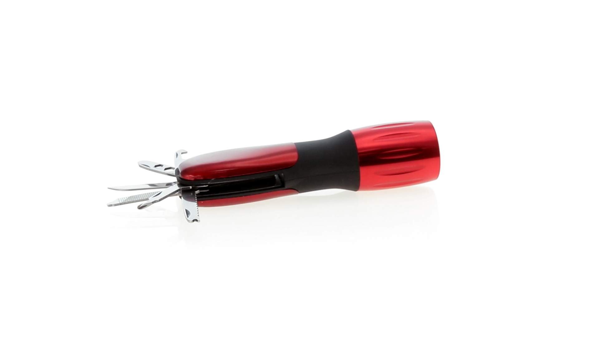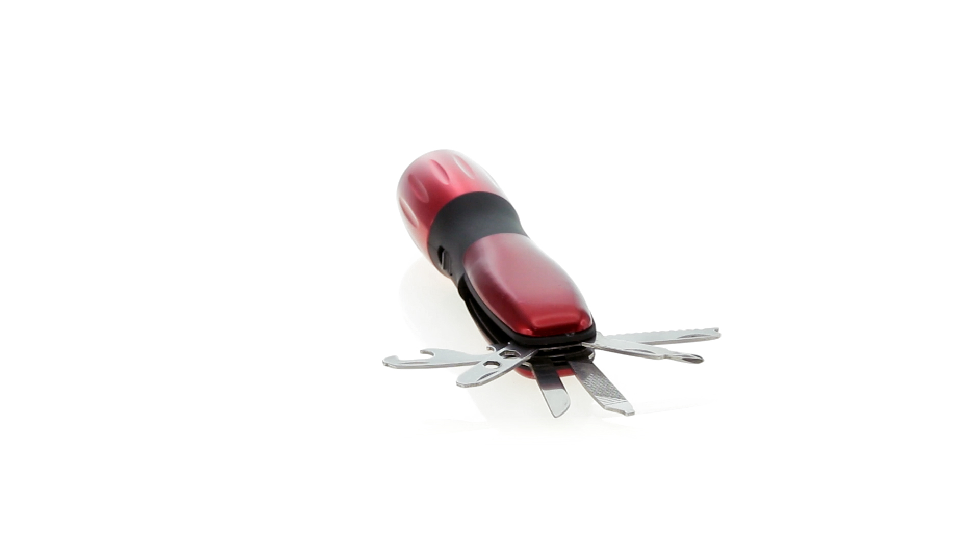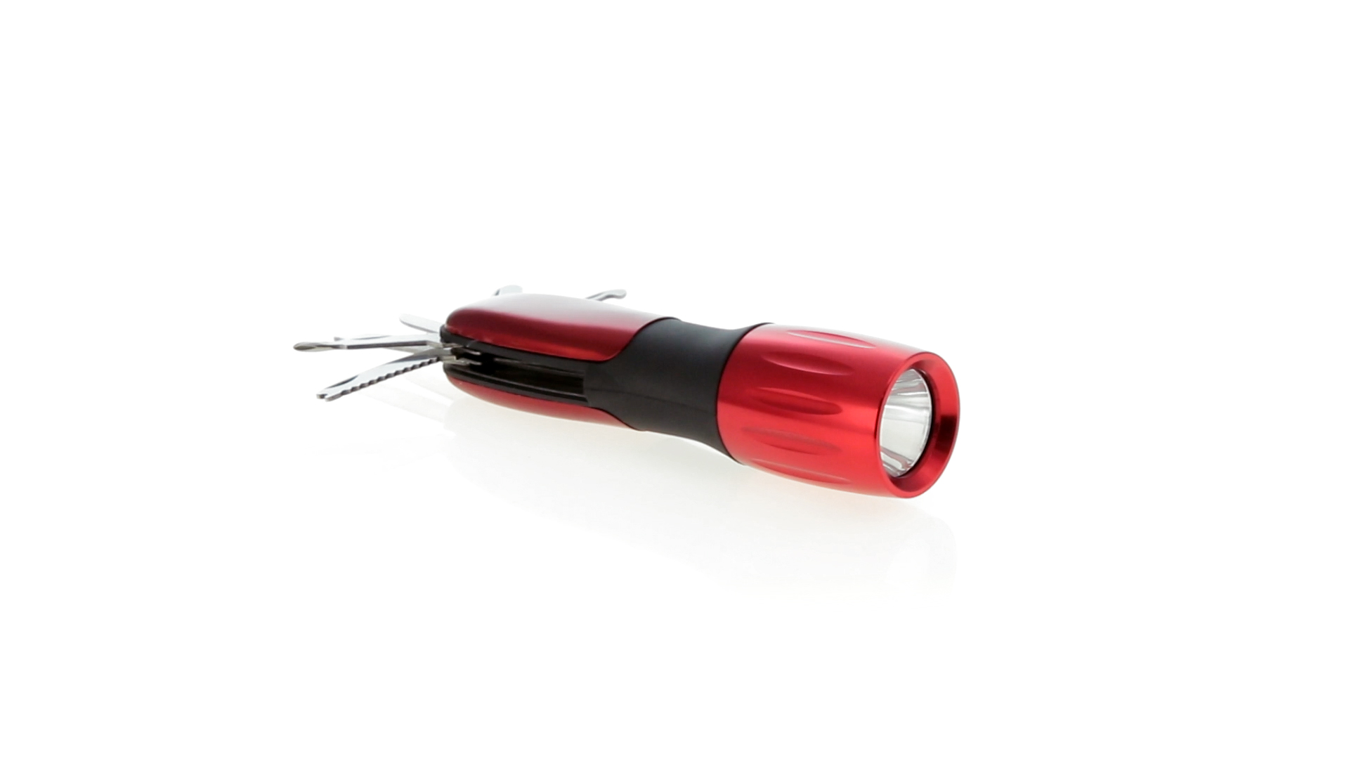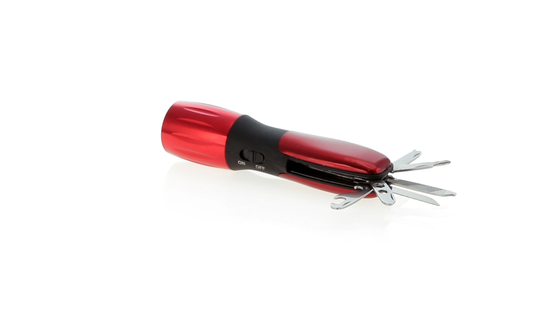 Multi-Tool mit robustem, rutschfestem Aluminiumgehäuse in einer Vielzahl von Metallic-Farben. Mit 9 Funktionen und integrierter LED-Taschenlampe. Enthält Schraubendreheraufsätze, Messer, Säge, Schraubenschlüssel und Flaschenöffner. Knopfzellen inklusive. Präsentiert in einer individuellen Box.