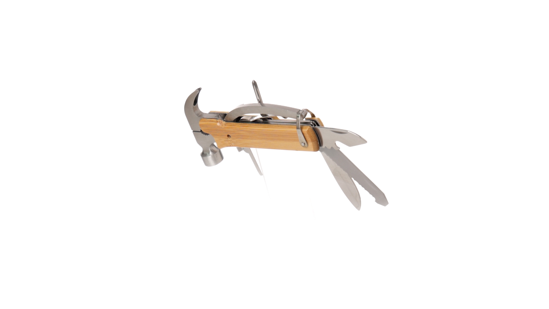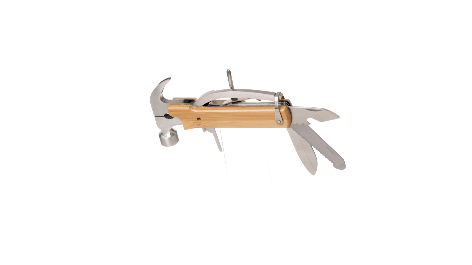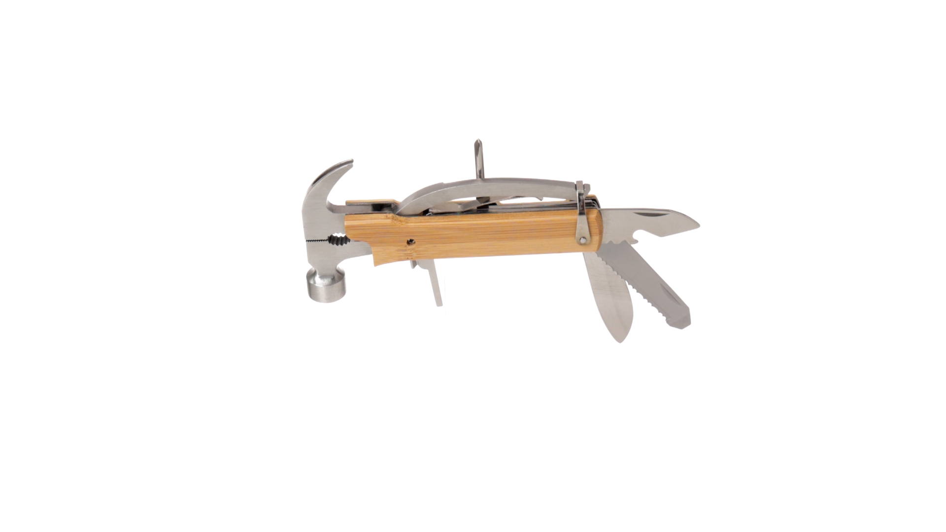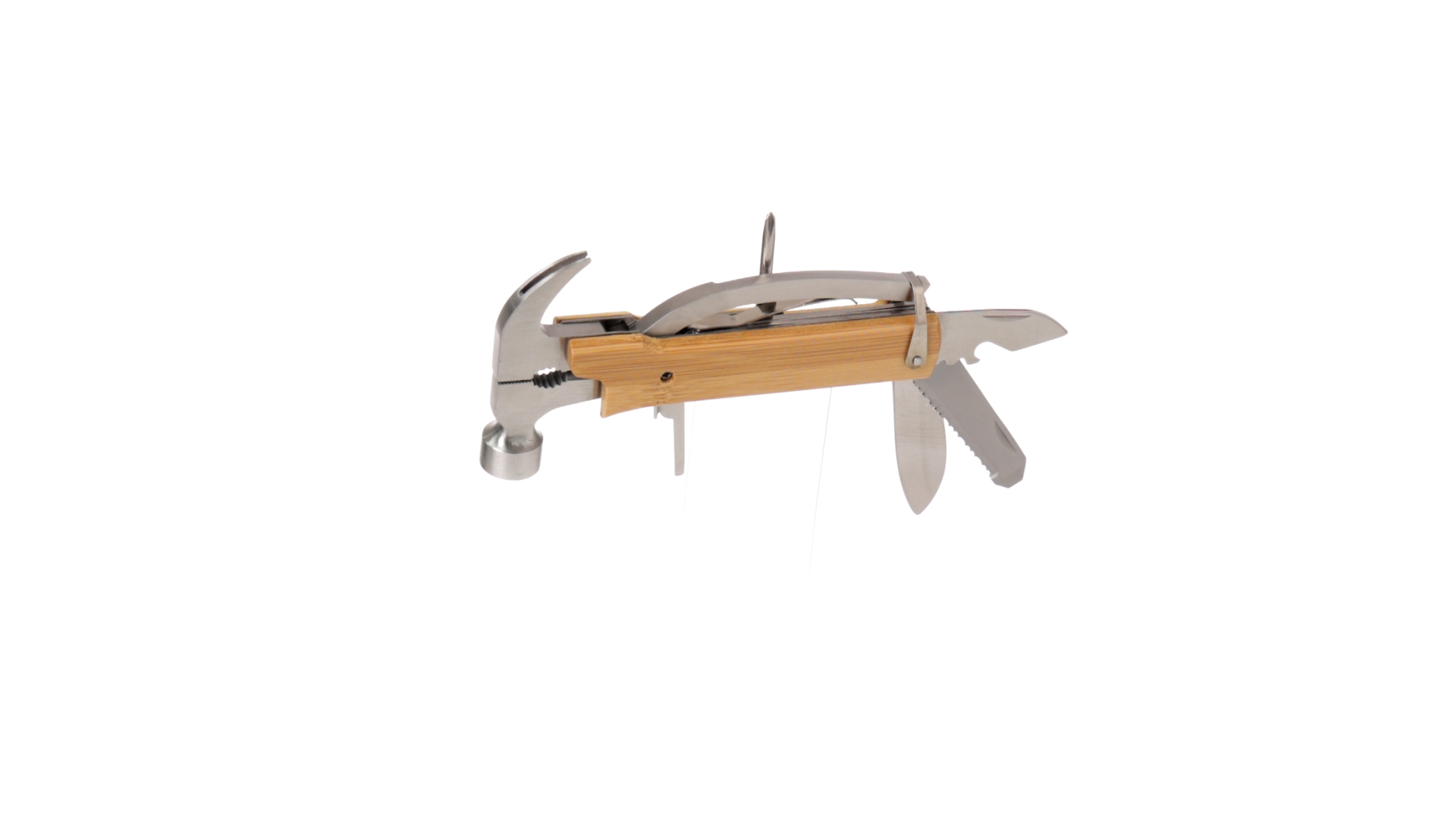Multitool der Nature-Linie mit widerstandsfähigem Gehäuse aus Edelstahl und Bambusgriff. Mit 13 Funktionen, darunter Hammer und Nagelzieher, Messer, Nagelknipser, Kreuzschlitzschraubendreher, Feilenöffner und Zange. Passendes PU-Armband und präsentiert in einer individuellen Box mit Kraft-Design.