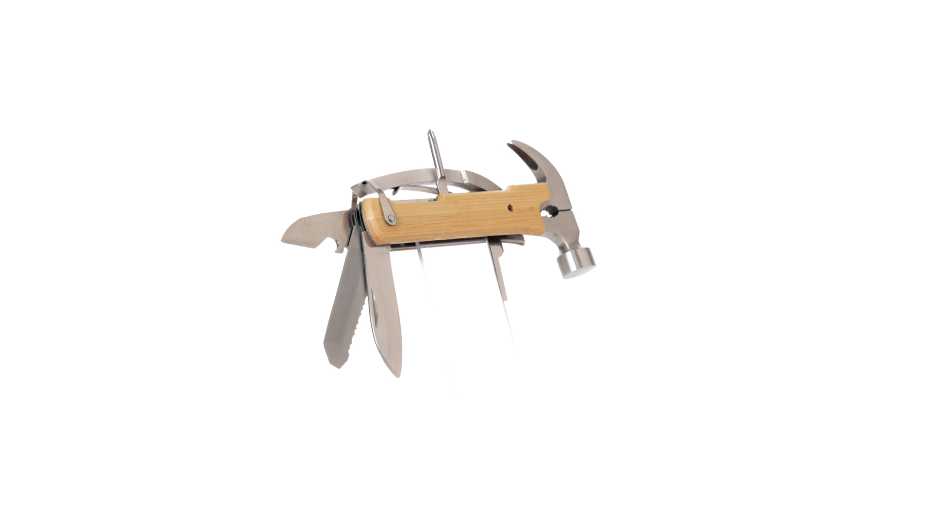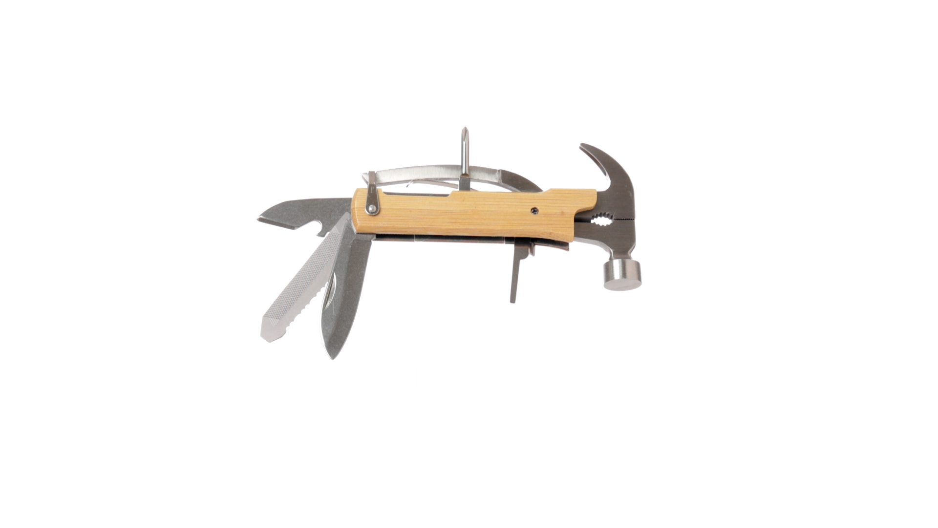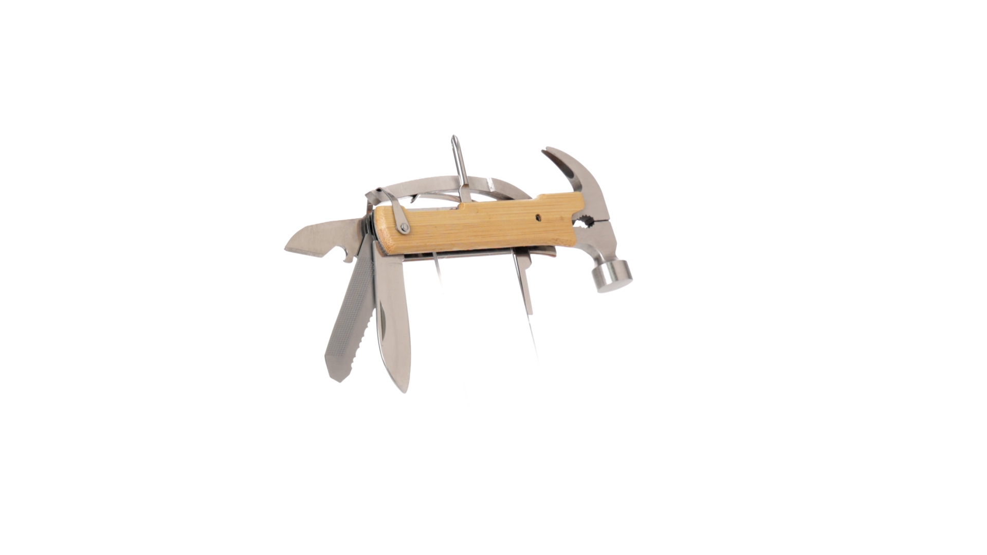 Multitool der Nature-Linie mit widerstandsfähigem Gehäuse aus Edelstahl und Bambusgriff. Mit 13 Funktionen, darunter Hammer und Nagelzieher, Messer, Nagelknipser, Kreuzschlitzschraubendreher, Feilenöffner und Zange. Passendes PU-Armband und präsentiert in einer individuellen Box mit Kraft-Design.