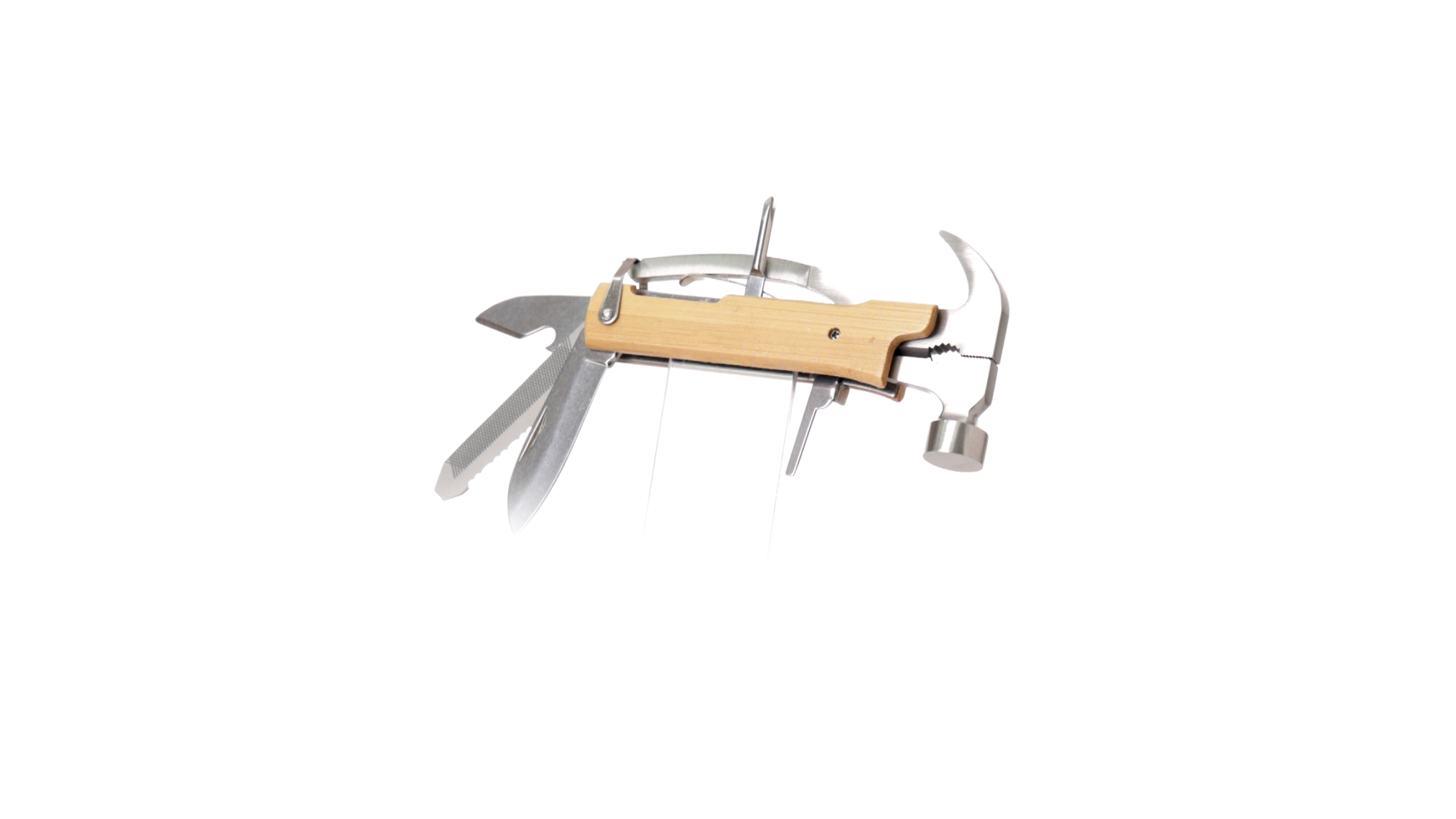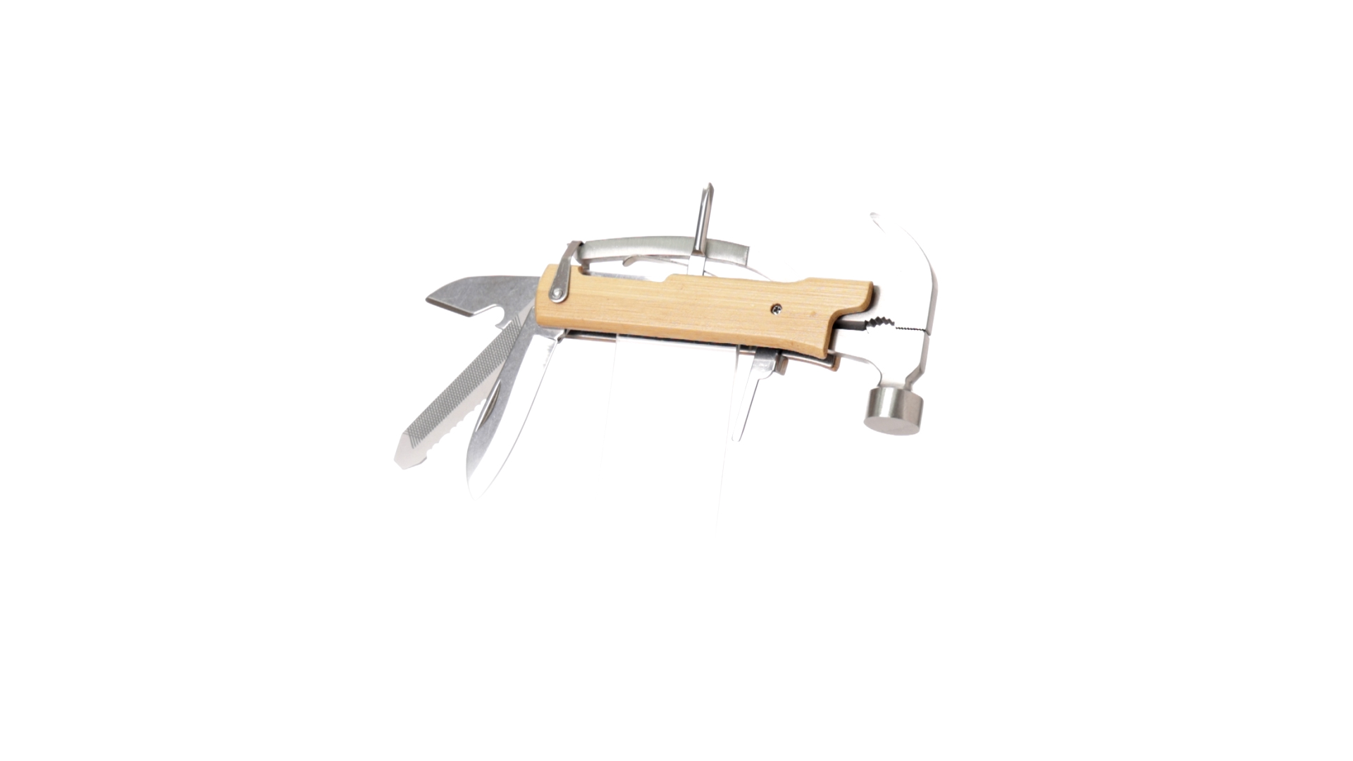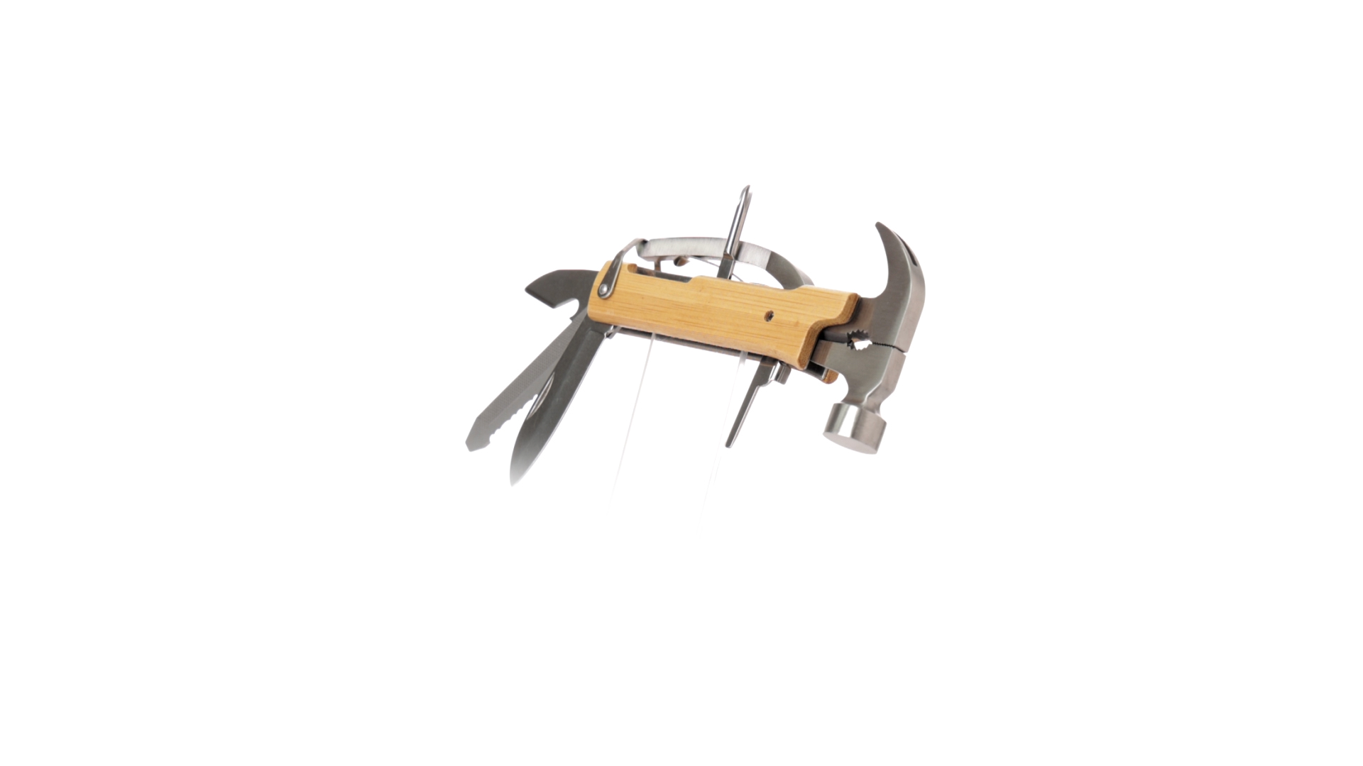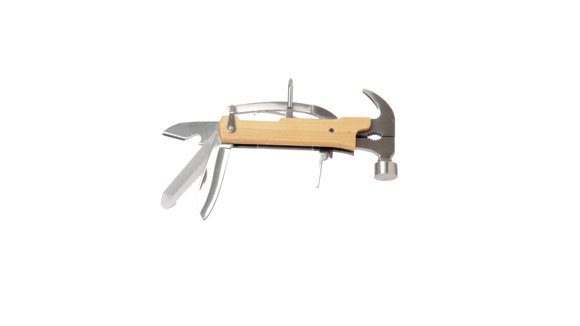 Multitool der Nature-Linie mit widerstandsfähigem Gehäuse aus Edelstahl und Bambusgriff. Mit 13 Funktionen, darunter Hammer und Nagelzieher, Messer, Nagelknipser, Kreuzschlitzschraubendreher, Feilenöffner und Zange. Passendes PU-Armband und präsentiert in einer individuellen Box mit Kraft-Design.
