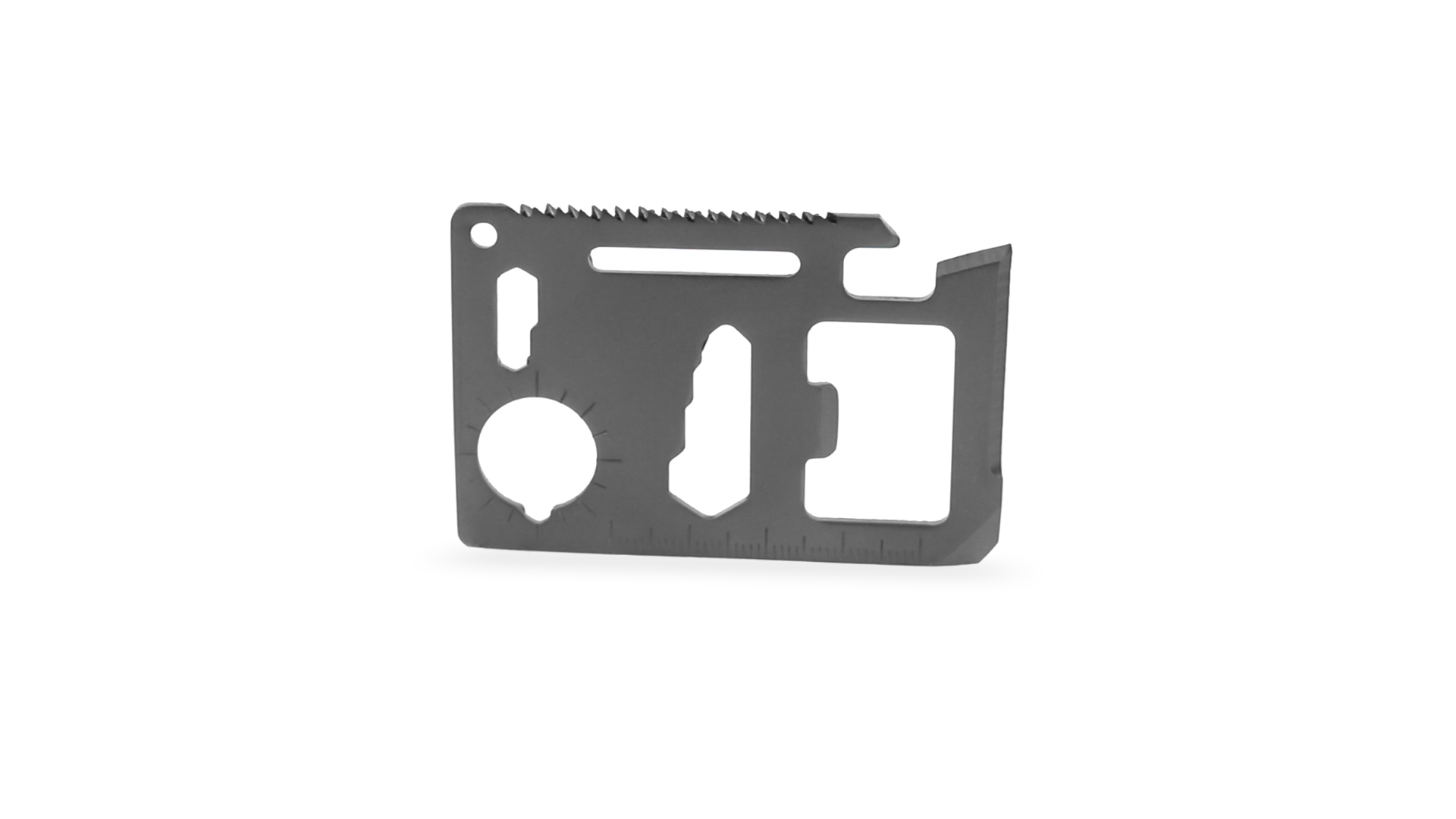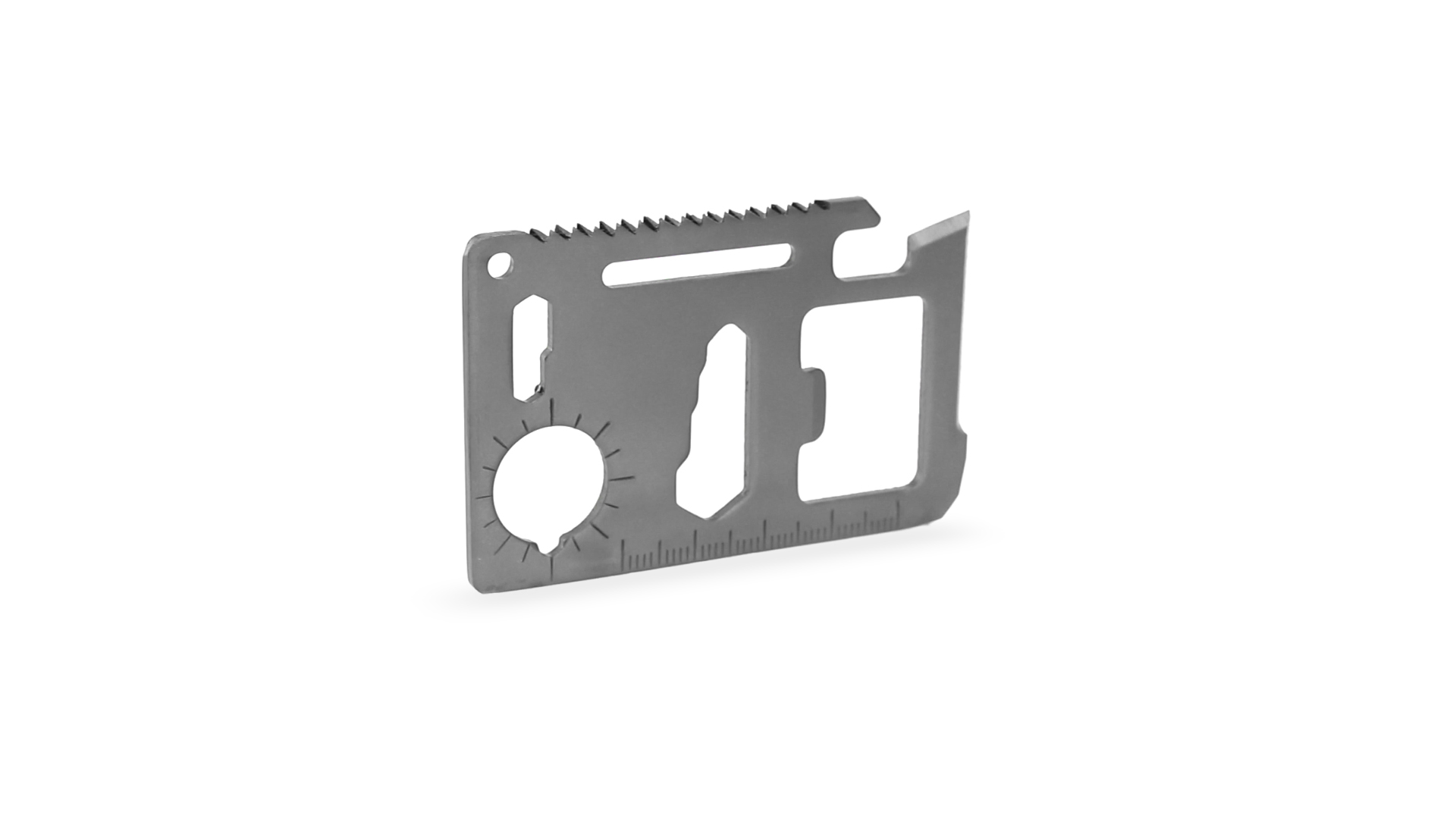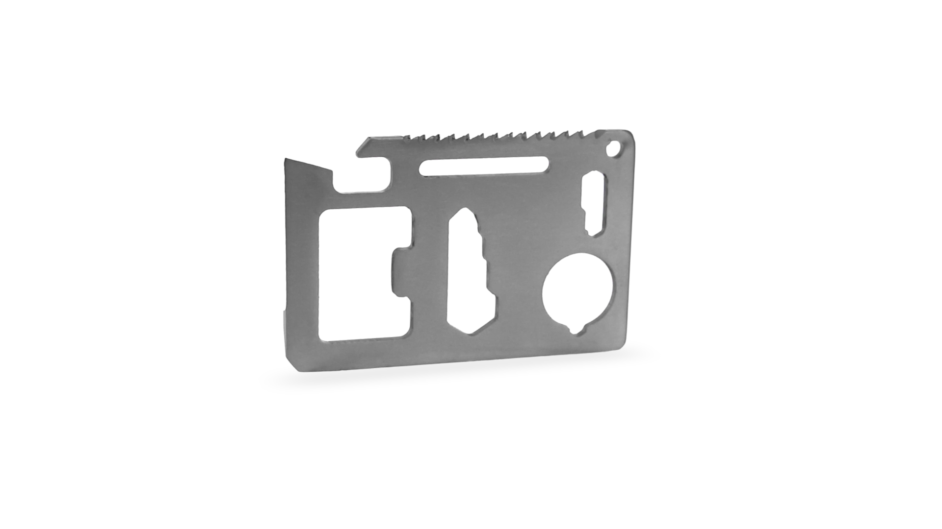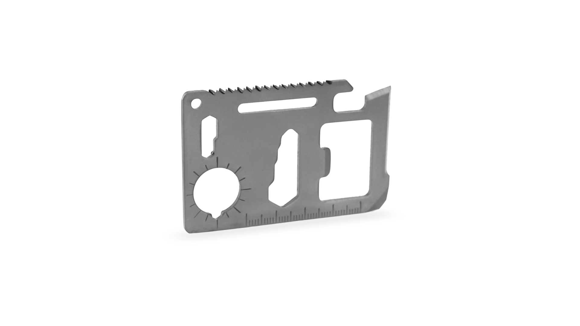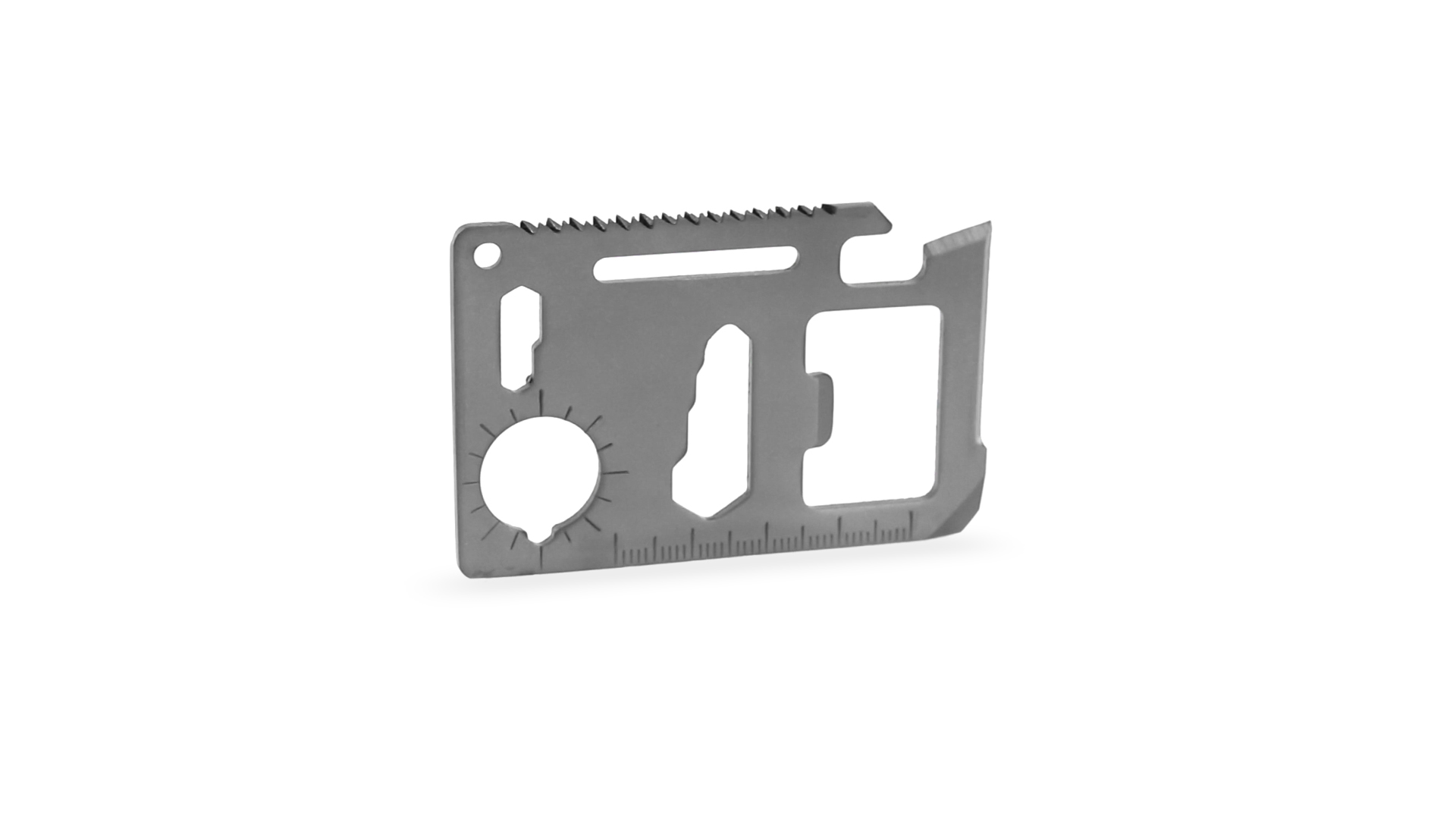 Multi-Tool aus robustem Edelstahl mit 11 Funktionen. Enthält unter anderem Dosenöffner, Messer, Schraubendreher, Lineal, Flaschenöffner, Schraubenschlüssel, Flügelmutterschlüssel, Säge und Orientierungshilfe. Präsentiert in einem widerstandsfähigem Kunstlederetui.