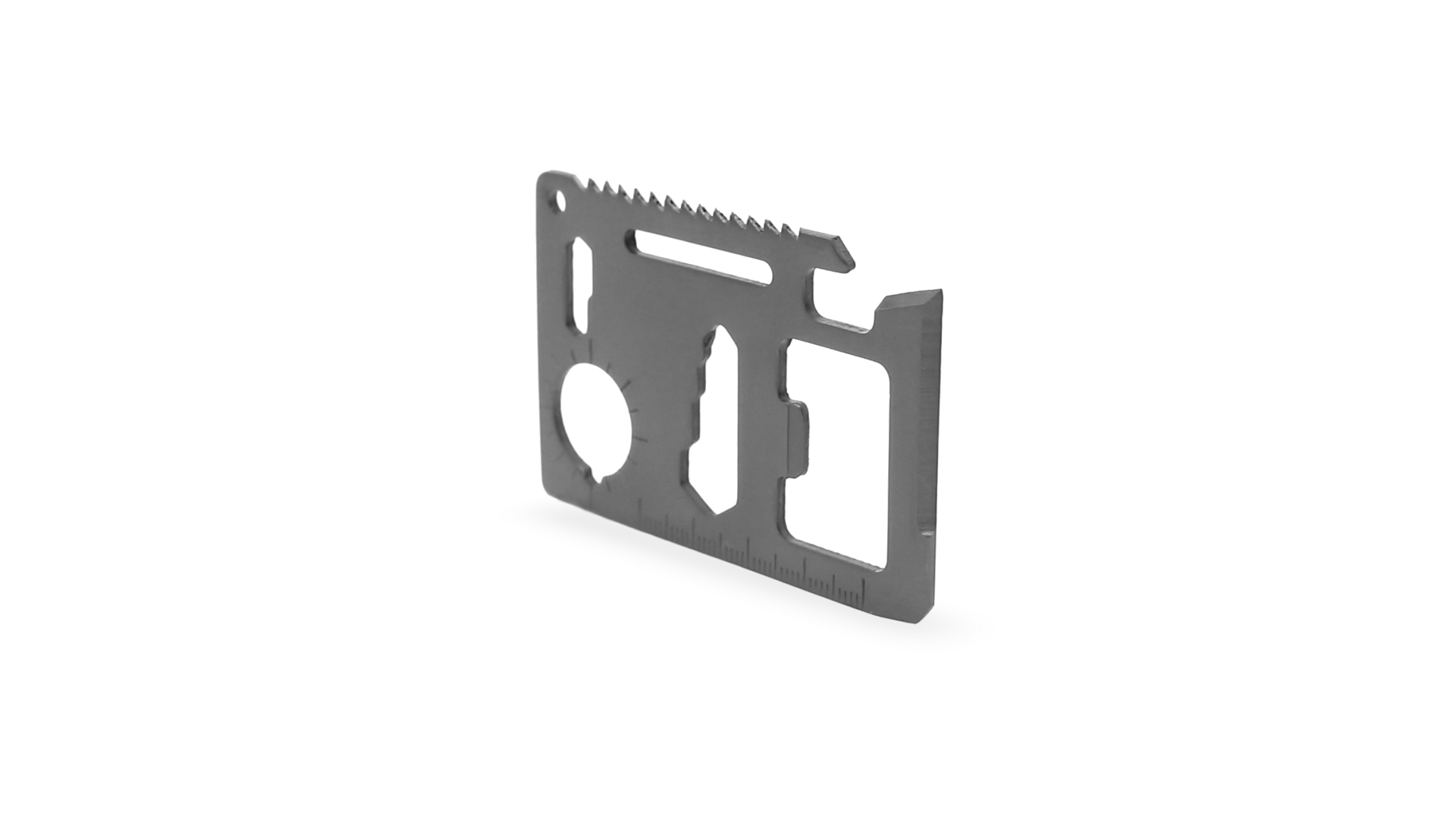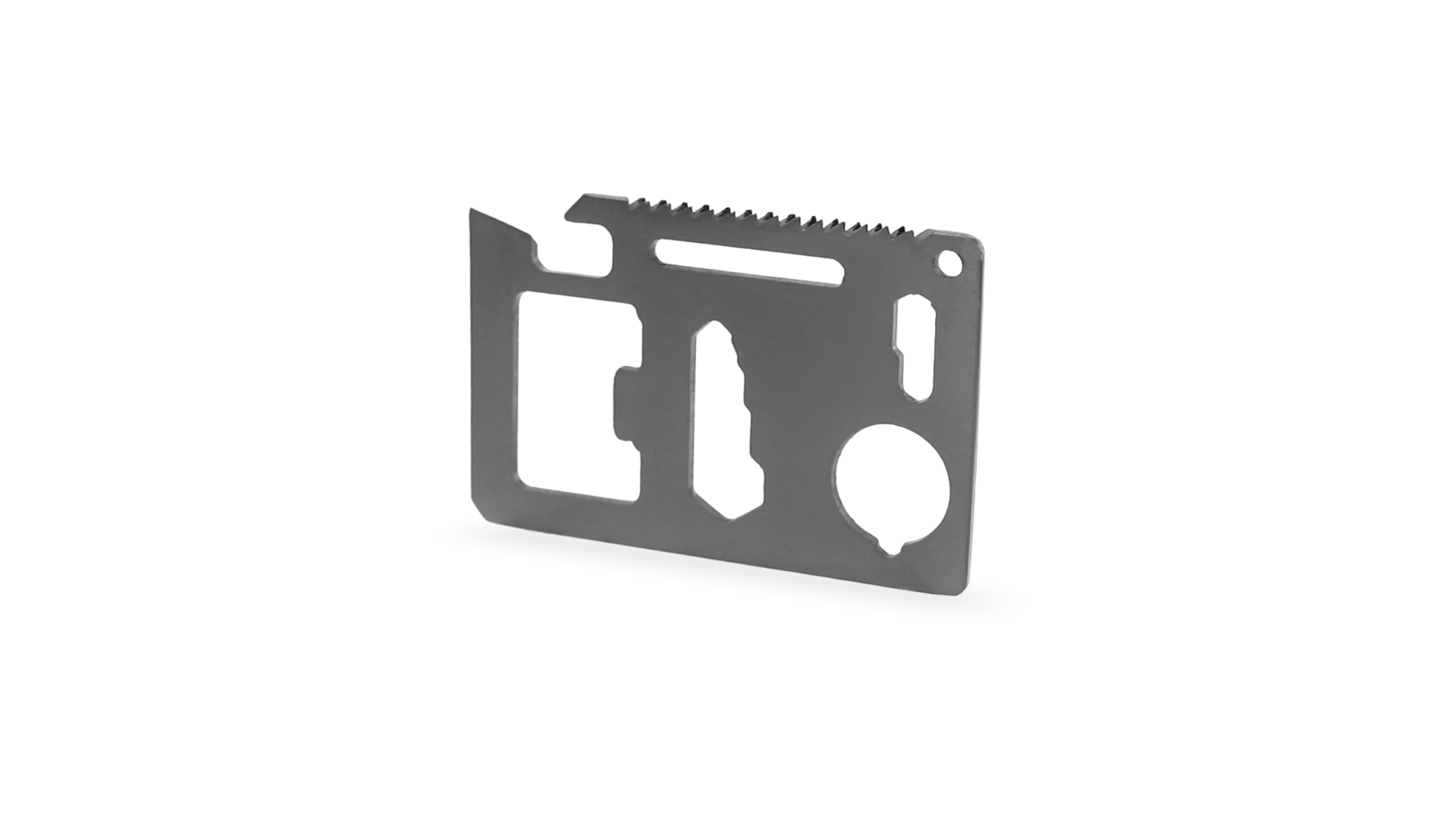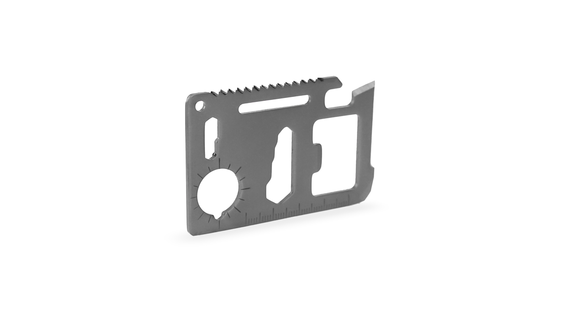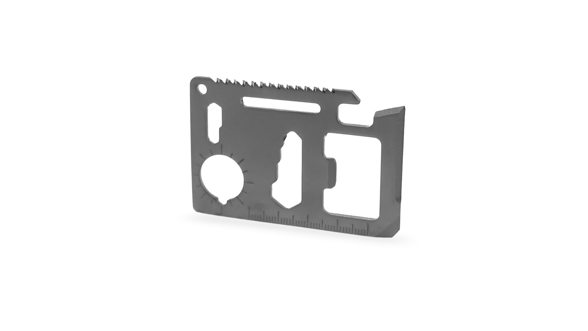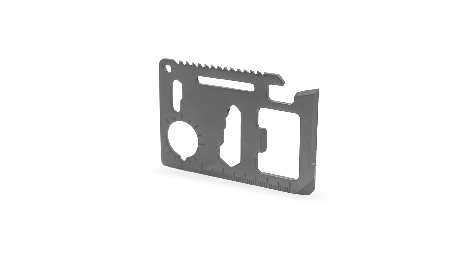 Multi-Tool aus robustem Edelstahl mit 11 Funktionen. Enthält unter anderem Dosenöffner, Messer, Schraubendreher, Lineal, Flaschenöffner, Schraubenschlüssel, Flügelmutterschlüssel, Säge und Orientierungshilfe. Präsentiert in einem widerstandsfähigem Kunstlederetui.