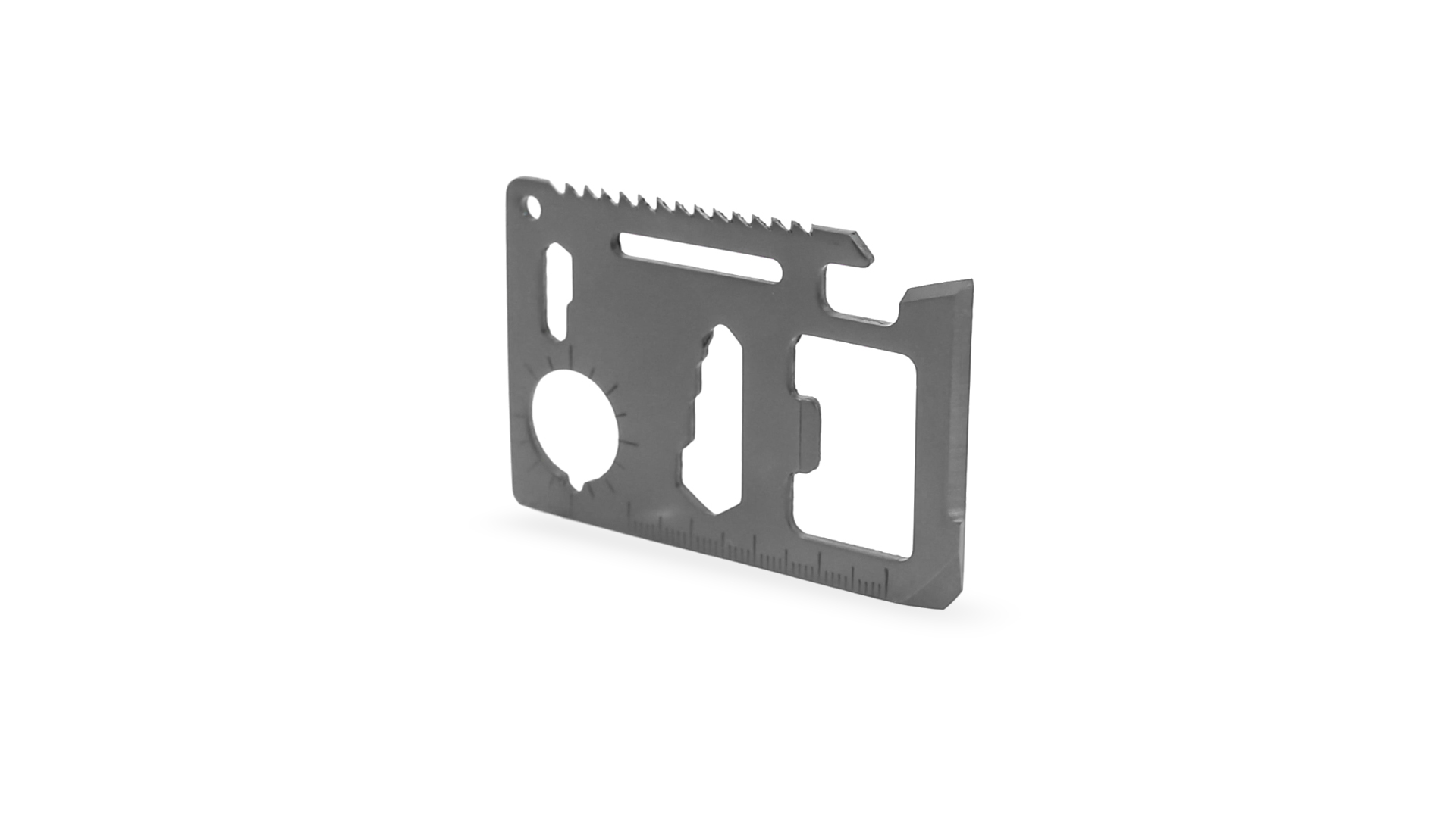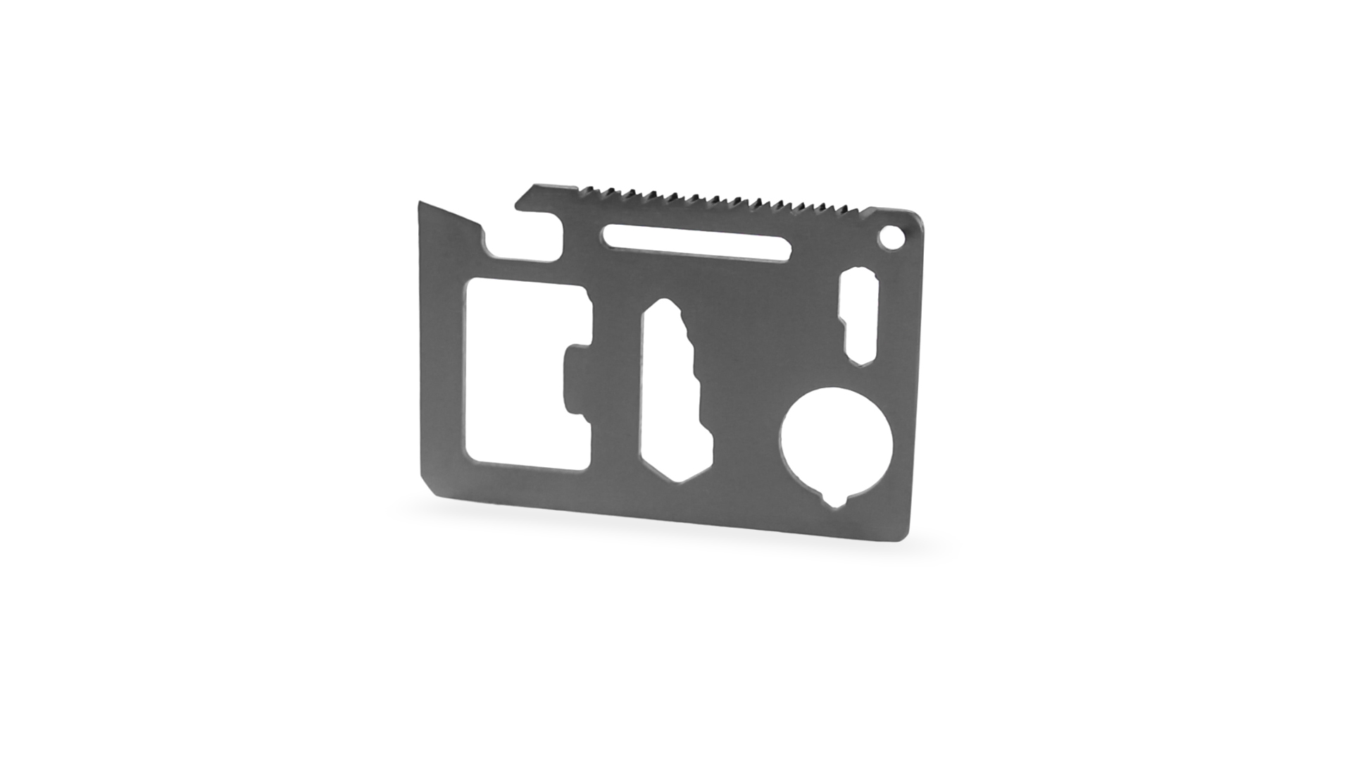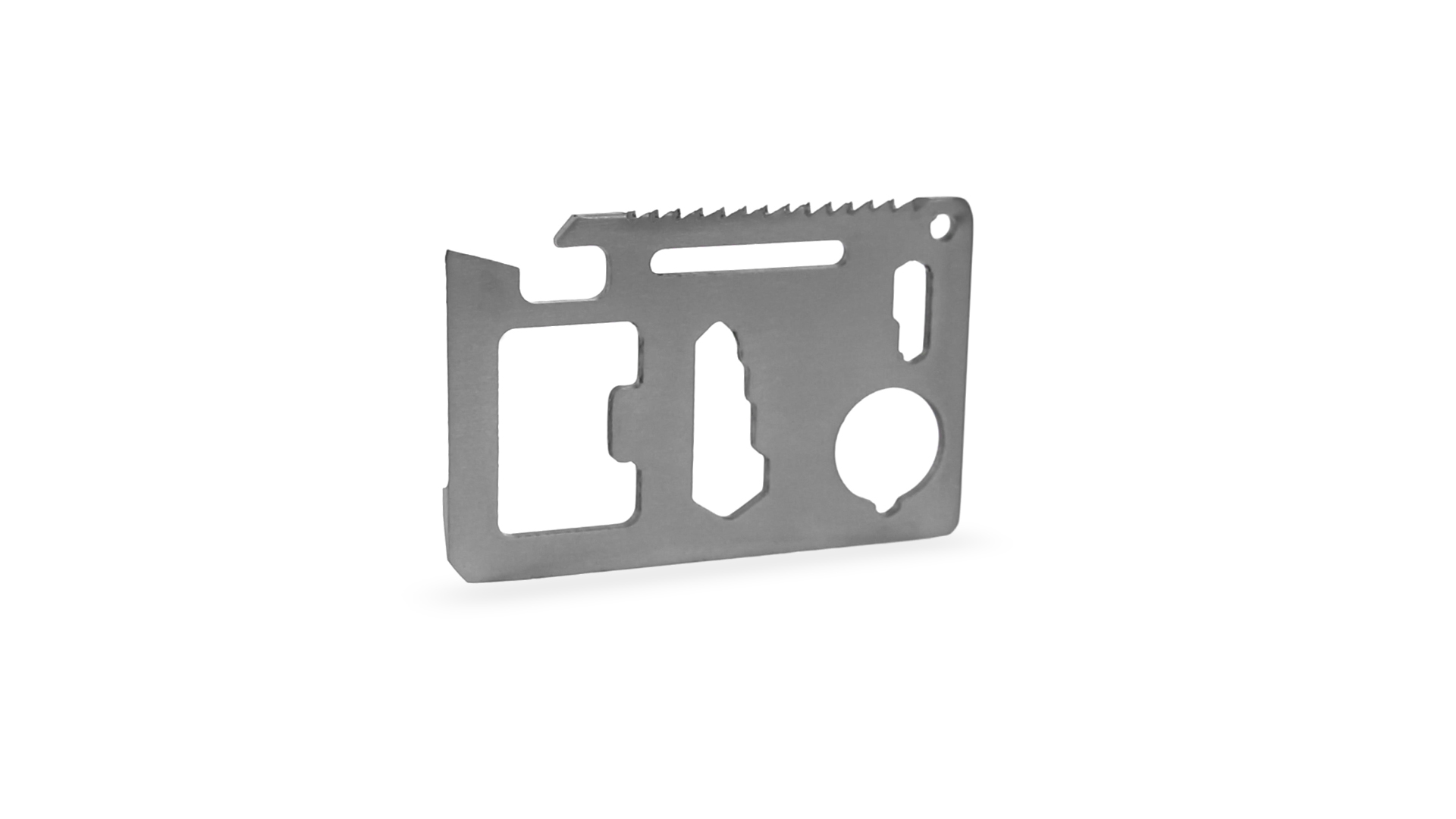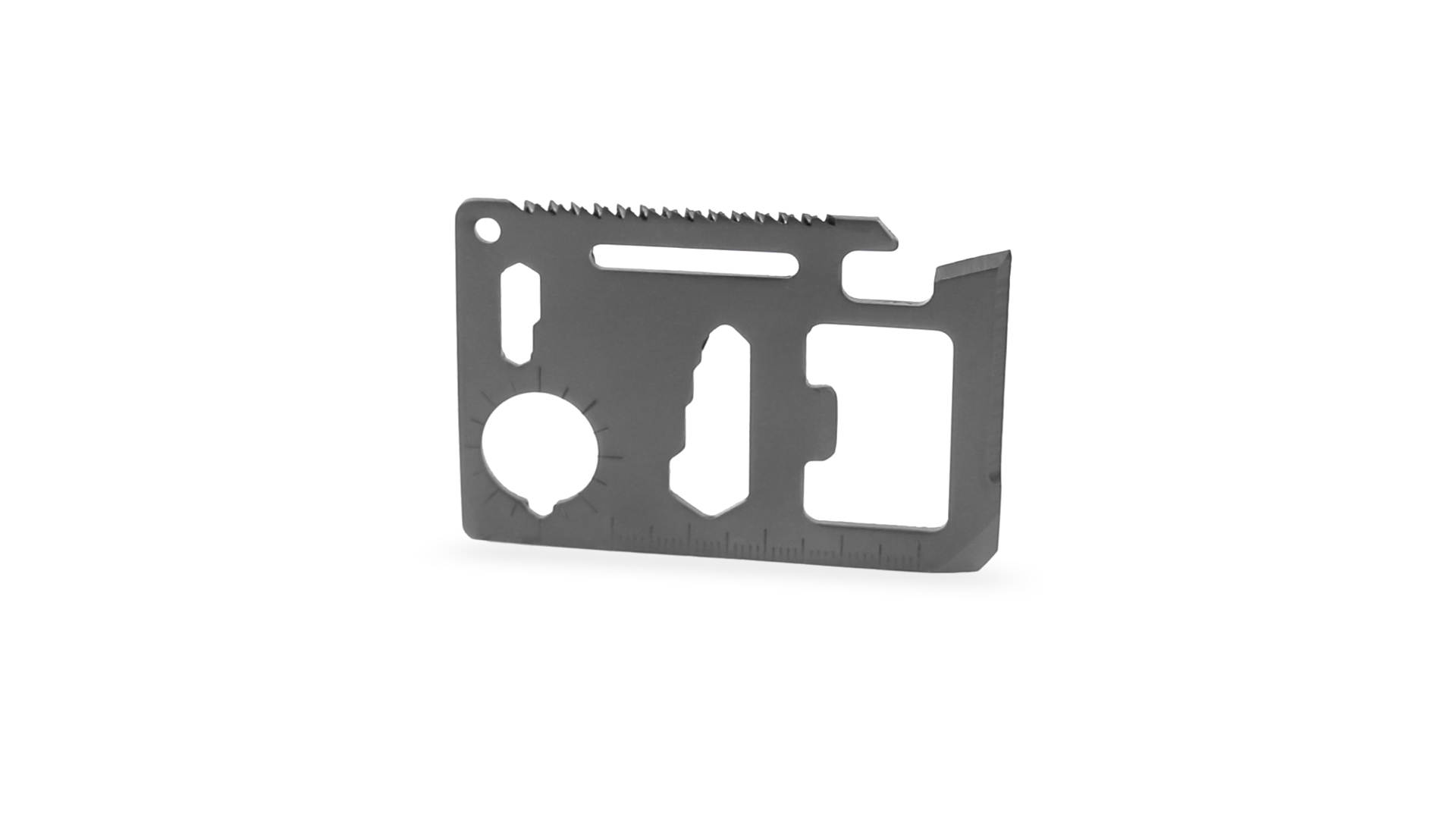 Multi-Tool aus robustem Edelstahl mit 11 Funktionen. Enthält unter anderem Dosenöffner, Messer, Schraubendreher, Lineal, Flaschenöffner, Schraubenschlüssel, Flügelmutterschlüssel, Säge und Orientierungshilfe. Präsentiert in einem widerstandsfähigem Kunstlederetui.