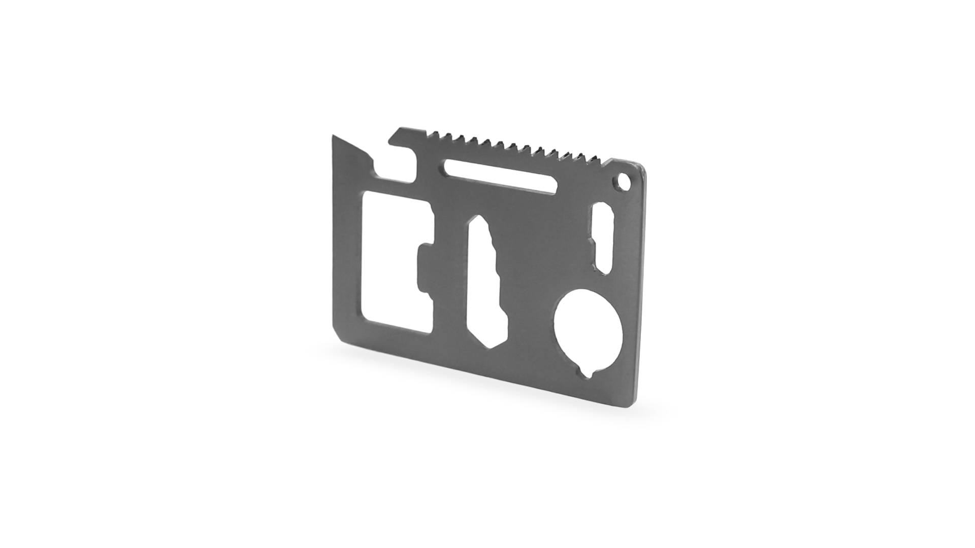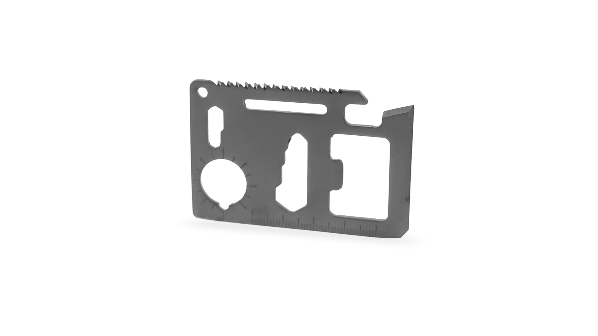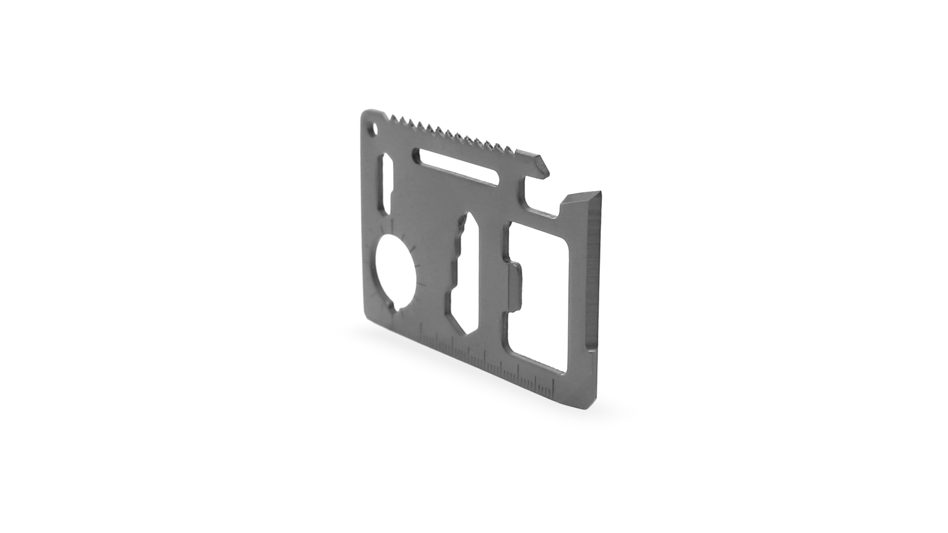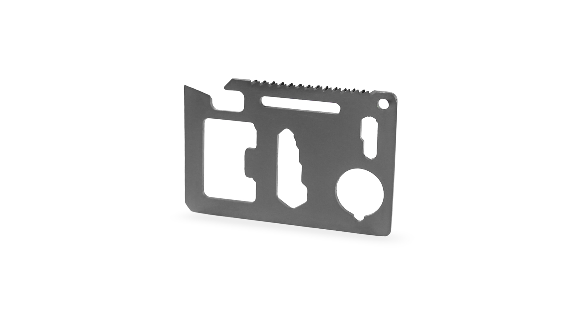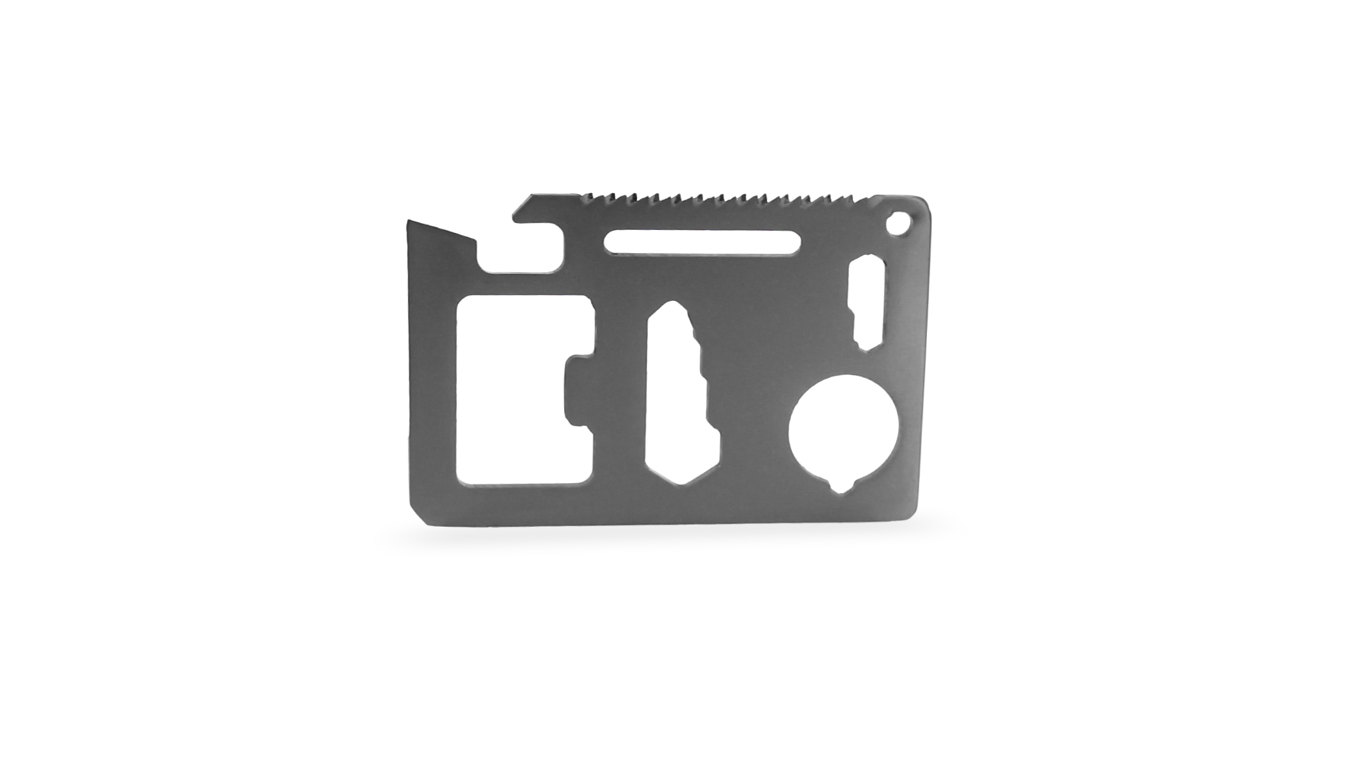 Multi-Tool aus robustem Edelstahl mit 11 Funktionen. Enthält unter anderem Dosenöffner, Messer, Schraubendreher, Lineal, Flaschenöffner, Schraubenschlüssel, Flügelmutterschlüssel, Säge und Orientierungshilfe. Präsentiert in einem widerstandsfähigem Kunstlederetui.