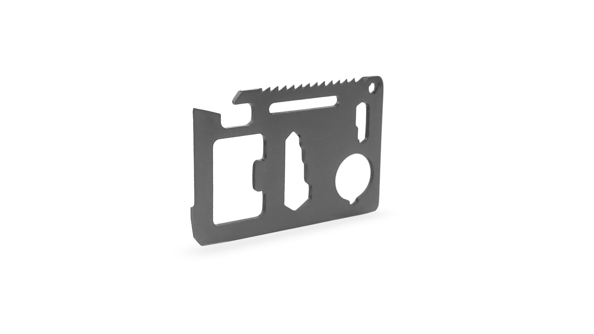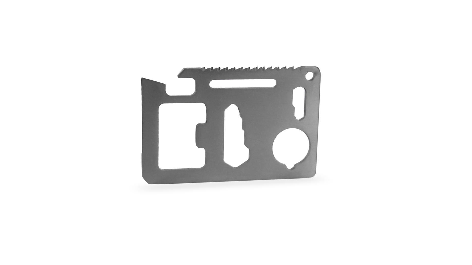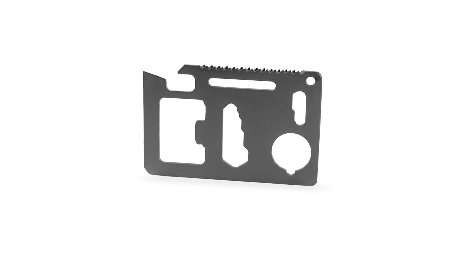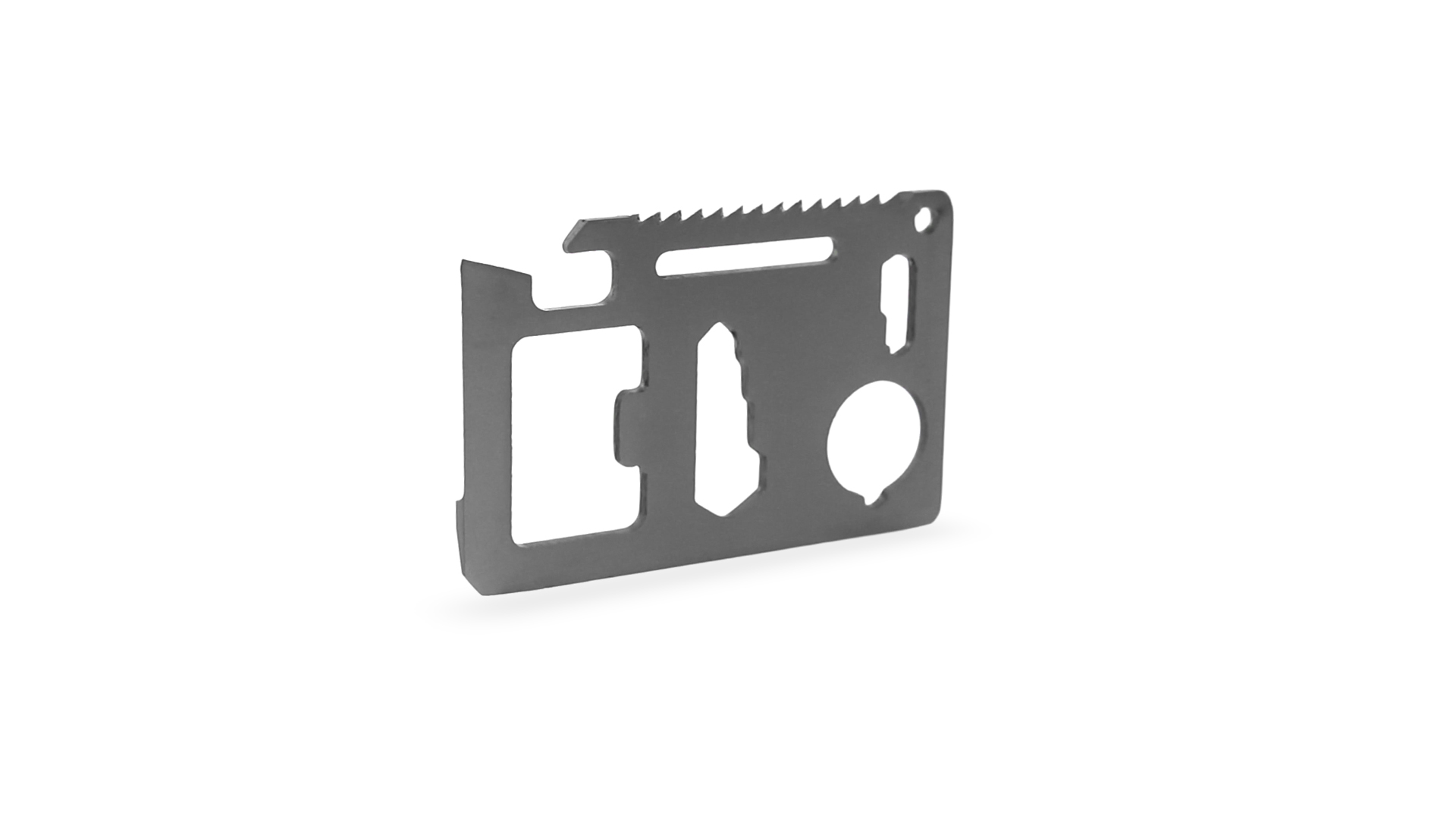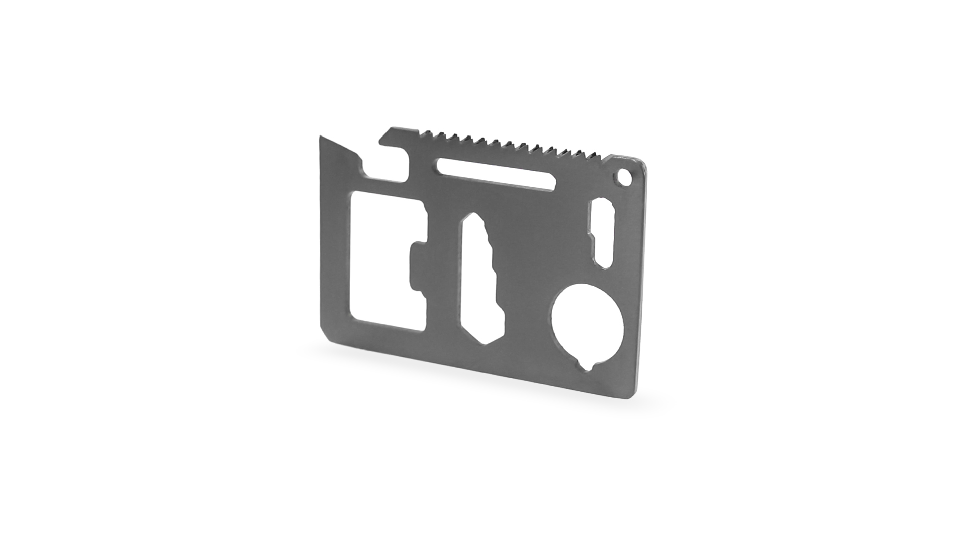 Multi-Tool aus robustem Edelstahl mit 11 Funktionen. Enthält unter anderem Dosenöffner, Messer, Schraubendreher, Lineal, Flaschenöffner, Schraubenschlüssel, Flügelmutterschlüssel, Säge und Orientierungshilfe. Präsentiert in einem widerstandsfähigem Kunstlederetui.