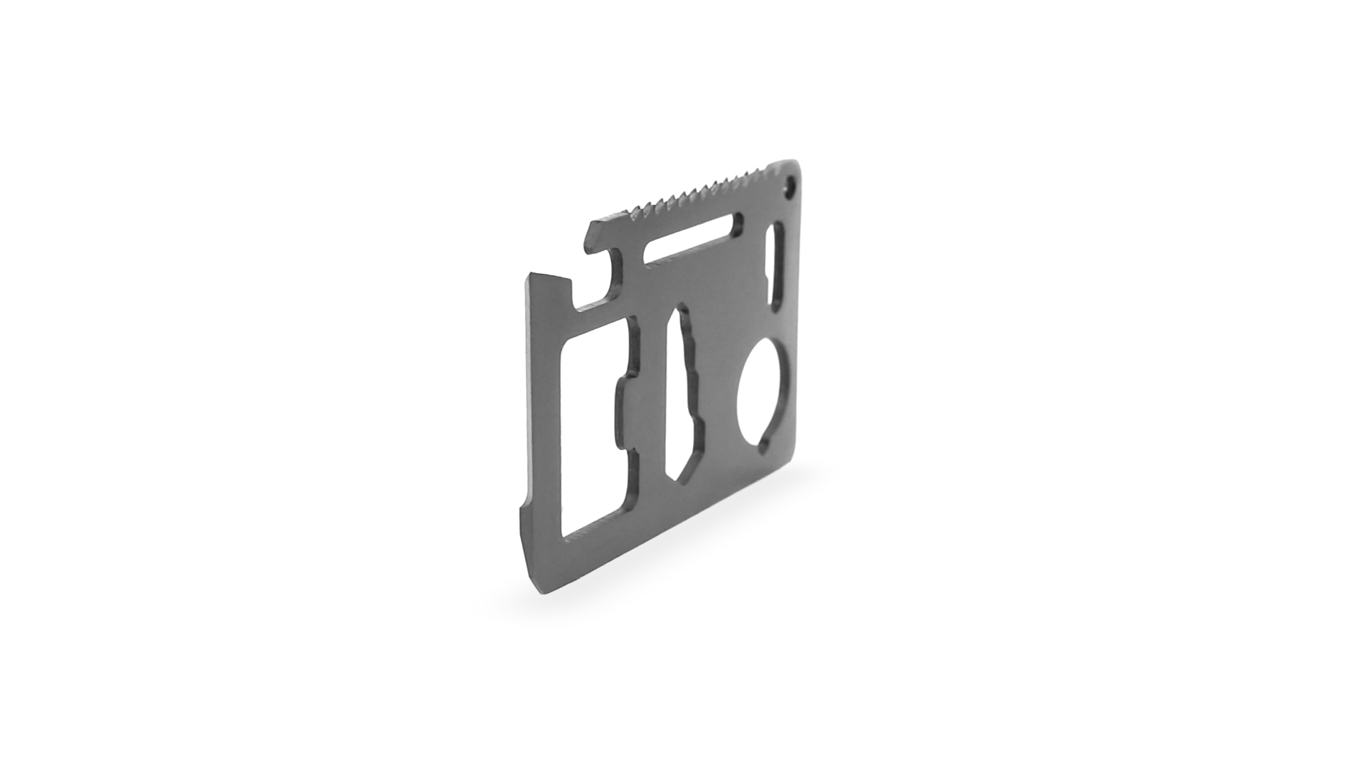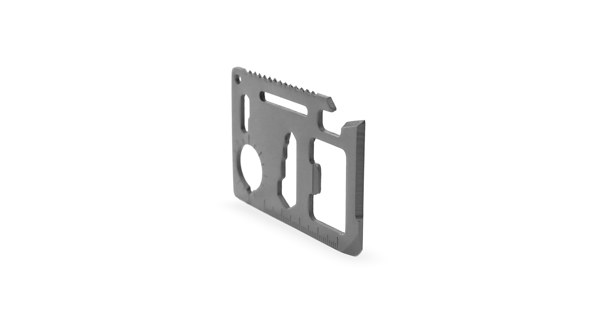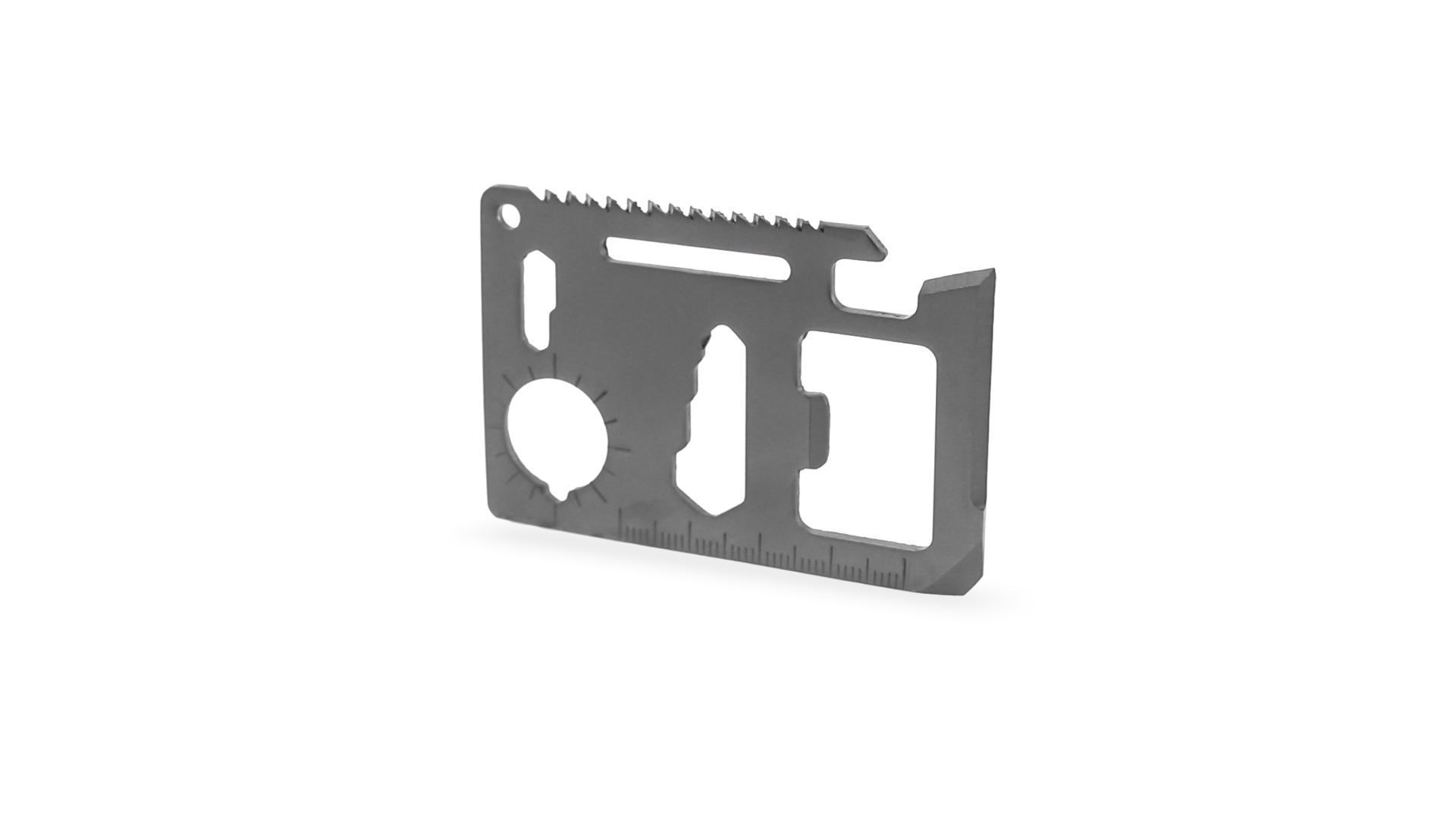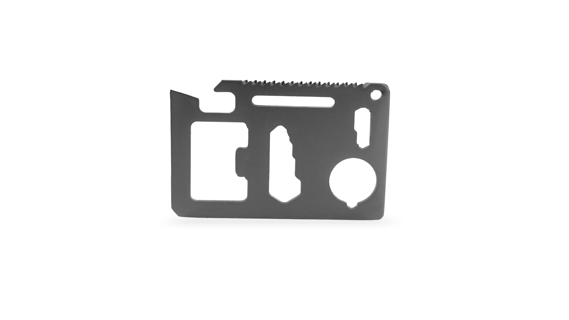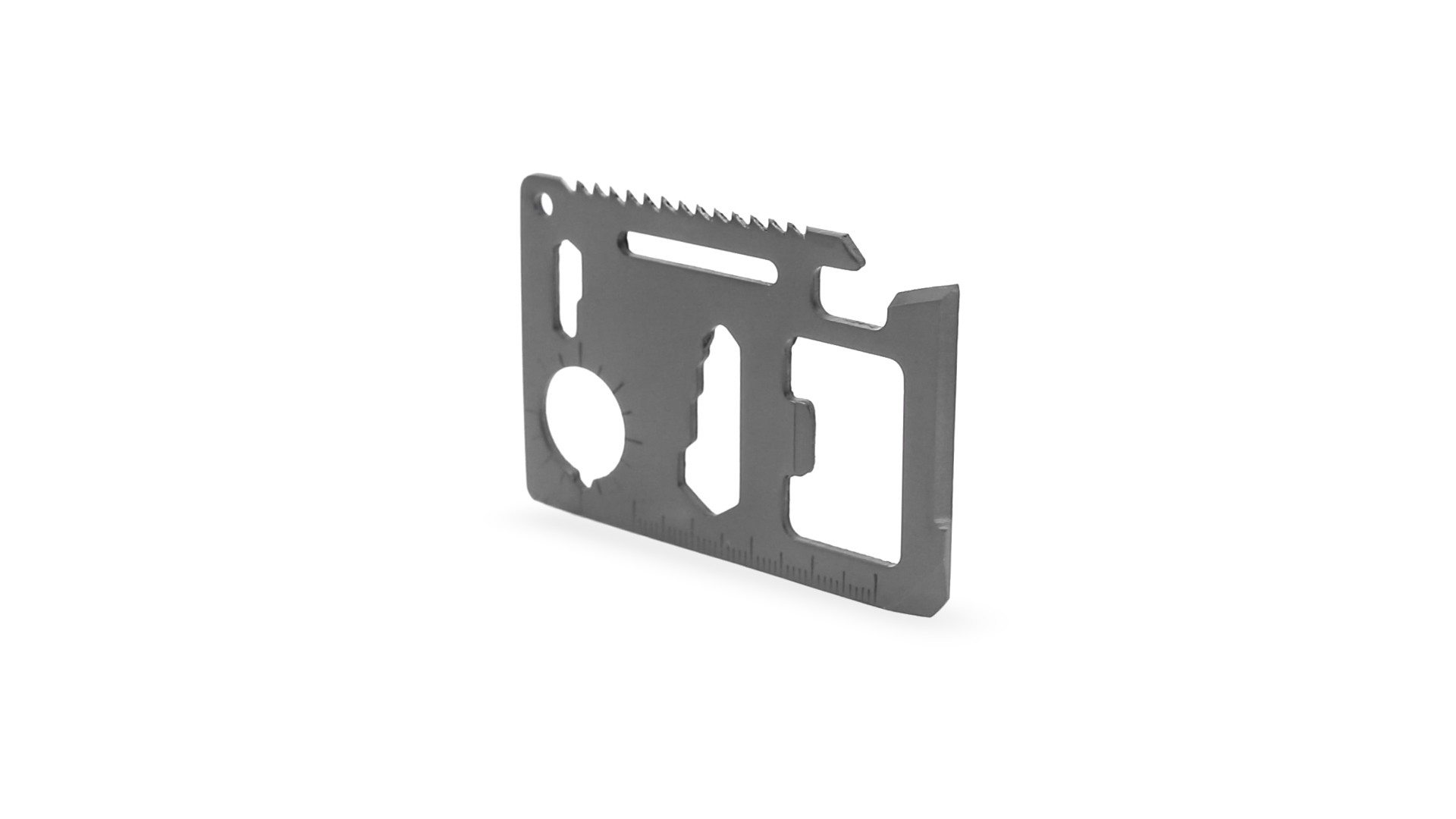 Multi-Tool aus robustem Edelstahl mit 11 Funktionen. Enthält unter anderem Dosenöffner, Messer, Schraubendreher, Lineal, Flaschenöffner, Schraubenschlüssel, Flügelmutterschlüssel, Säge und Orientierungshilfe. Präsentiert in einem widerstandsfähigem Kunstlederetui.