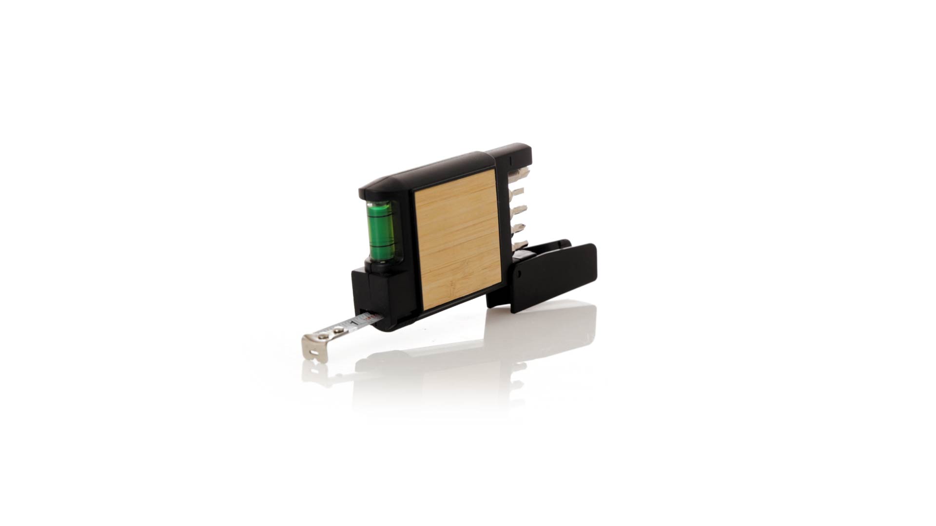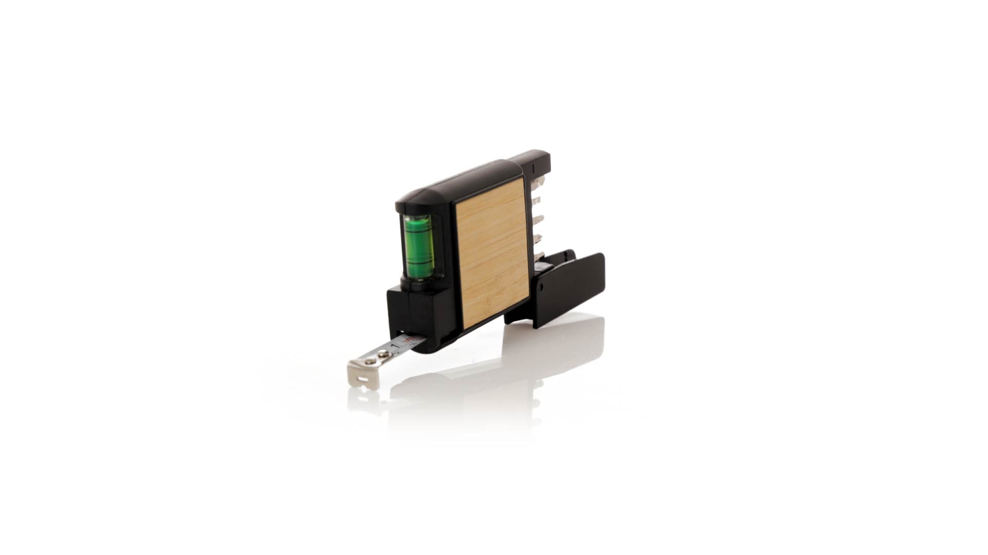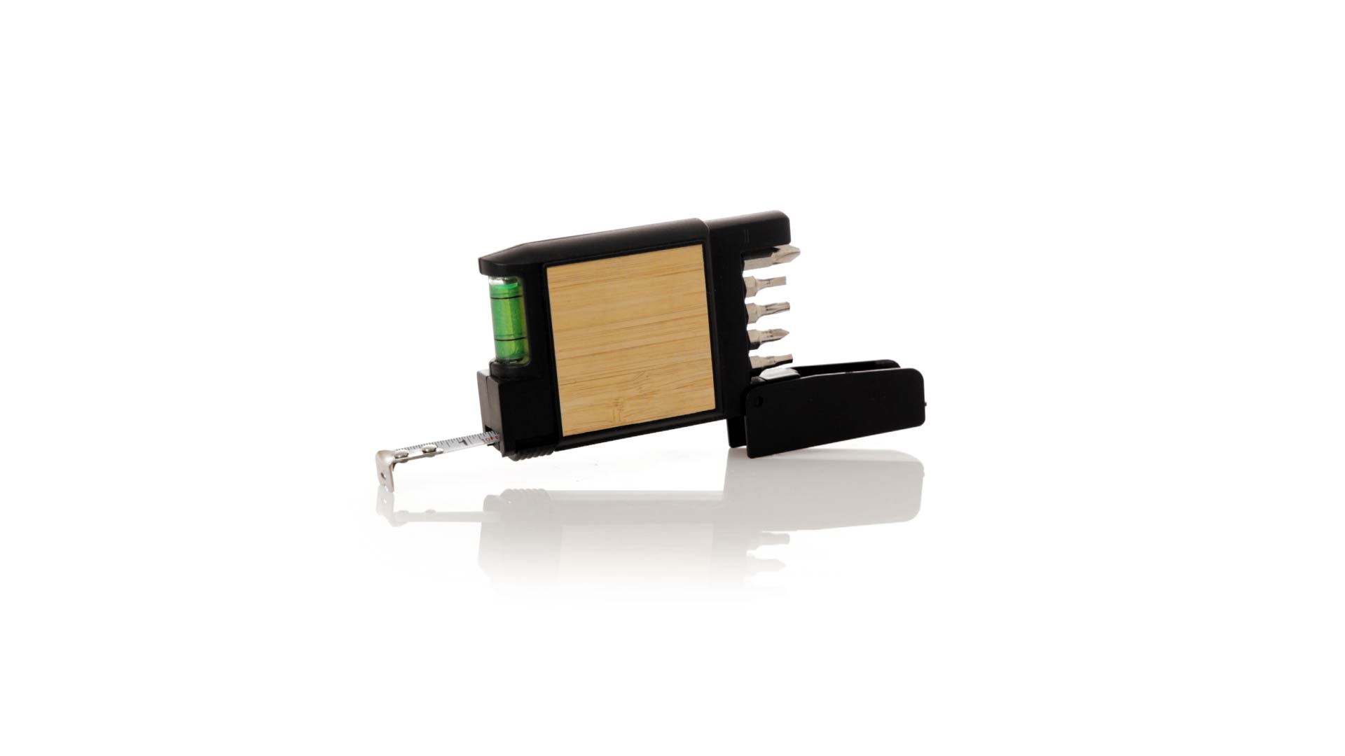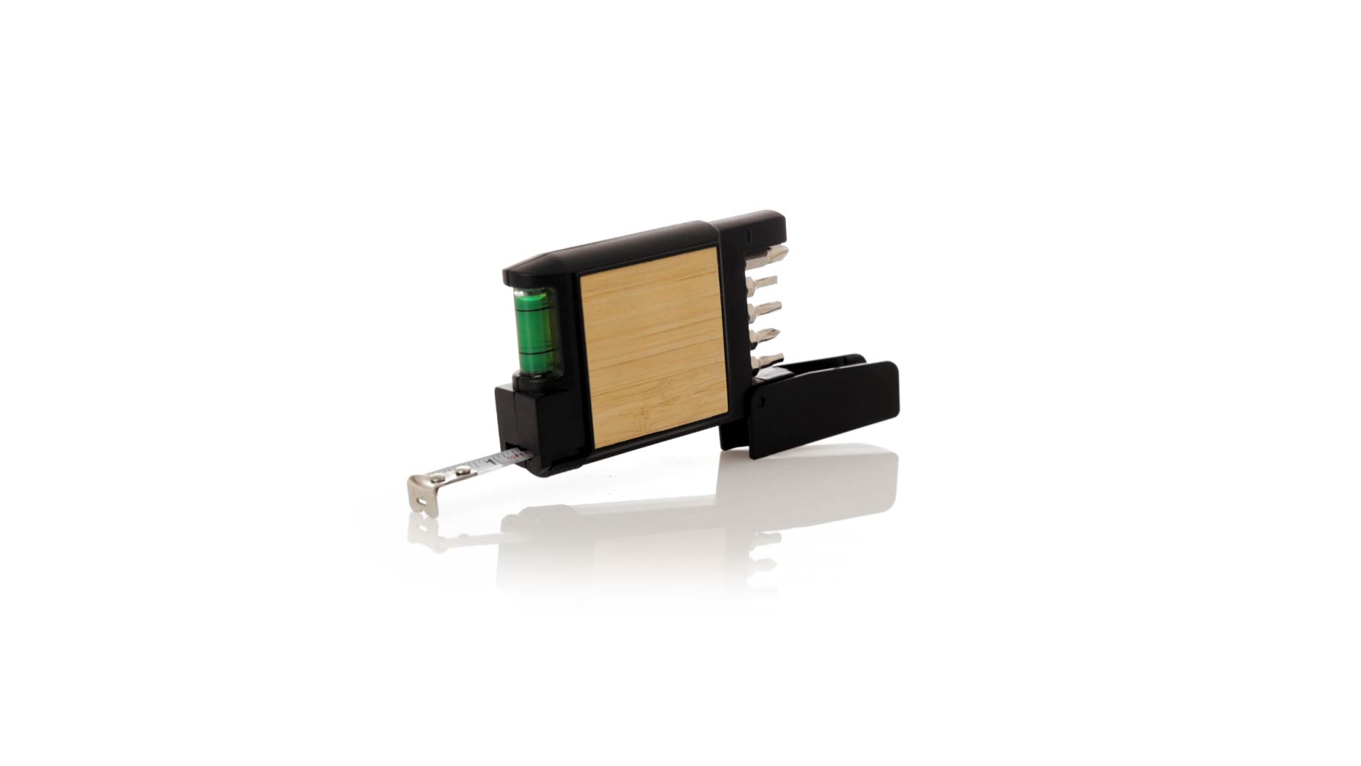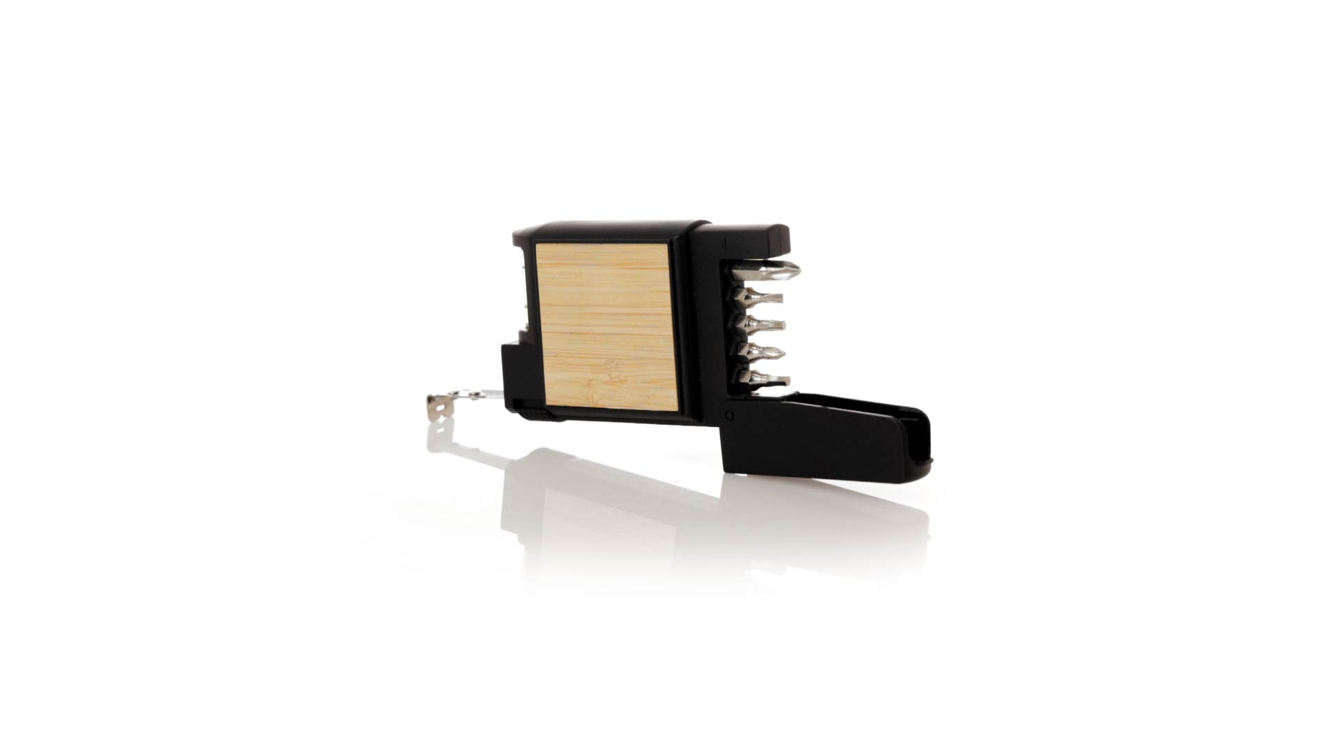 3 m langes Multifunktions-Flexometer, hergestellt aus einer langlebigen Kombination aus Bambus und ABS. Mit 7 Funktionen: 3-Meter-Massband, Schraubendreher mit verschiedenen Bits (Flach-, Kreuz- und Innensechskant) und integriertem Füllstandsmesser. Elegant in Schwarz mit Bambusdetails gestaltet und einzeln in einer Kraft-Designbox präsentiert.