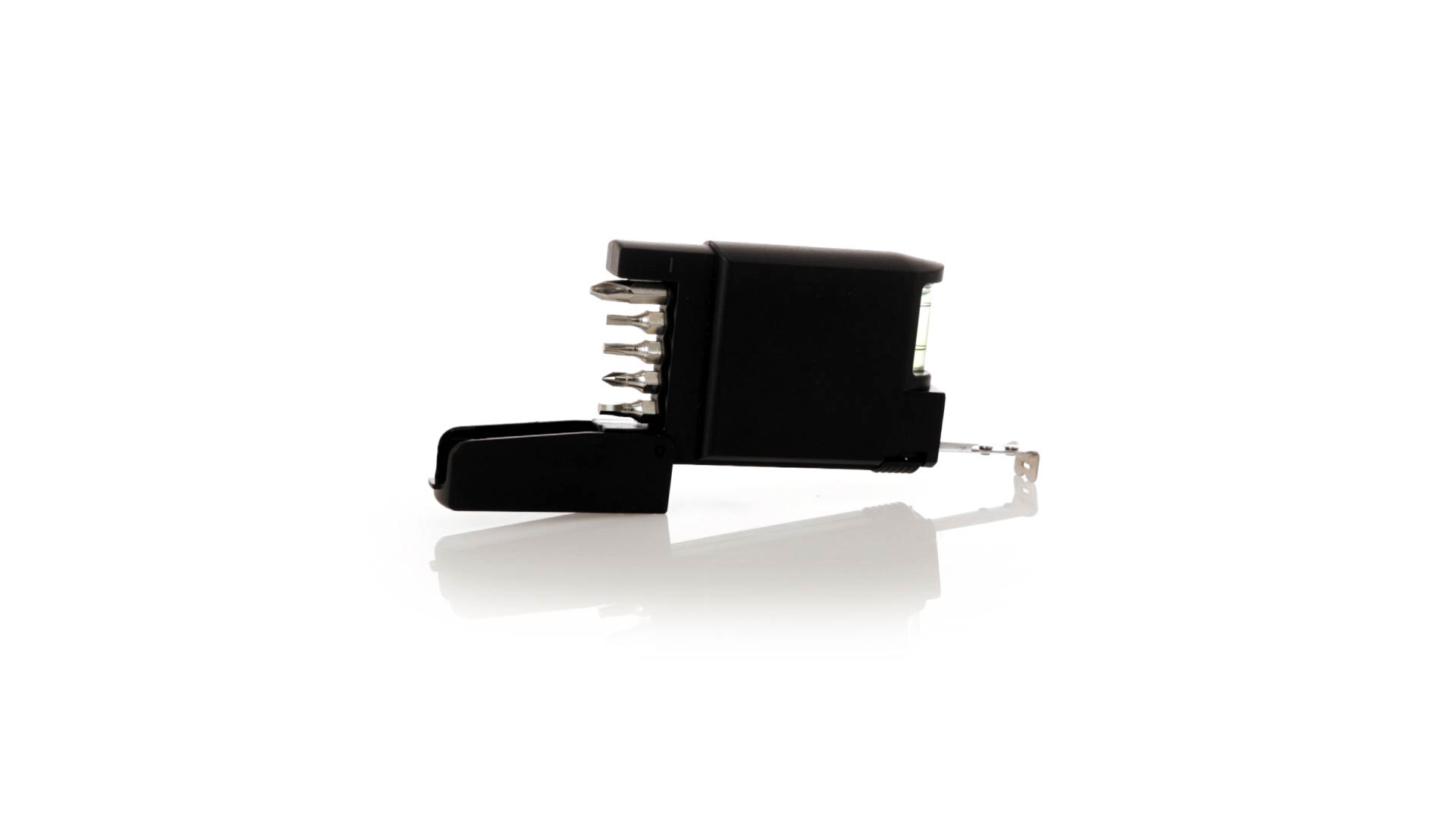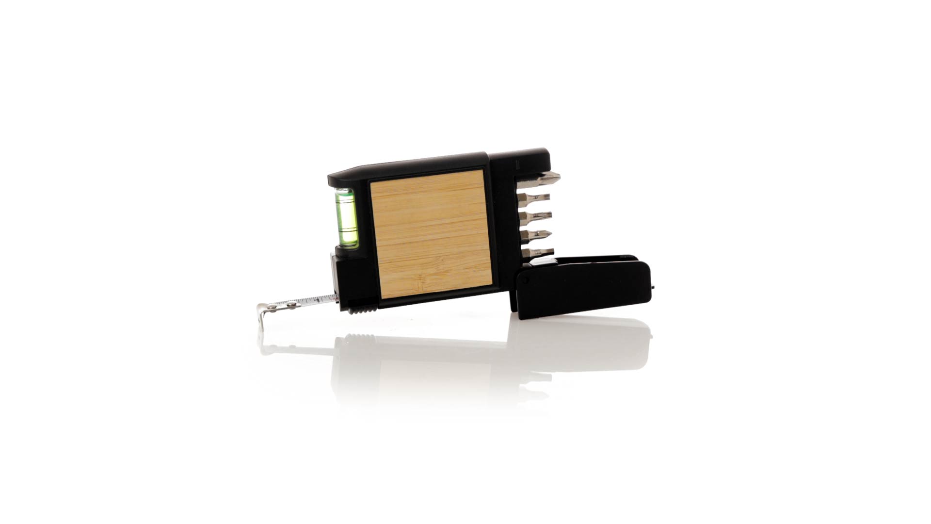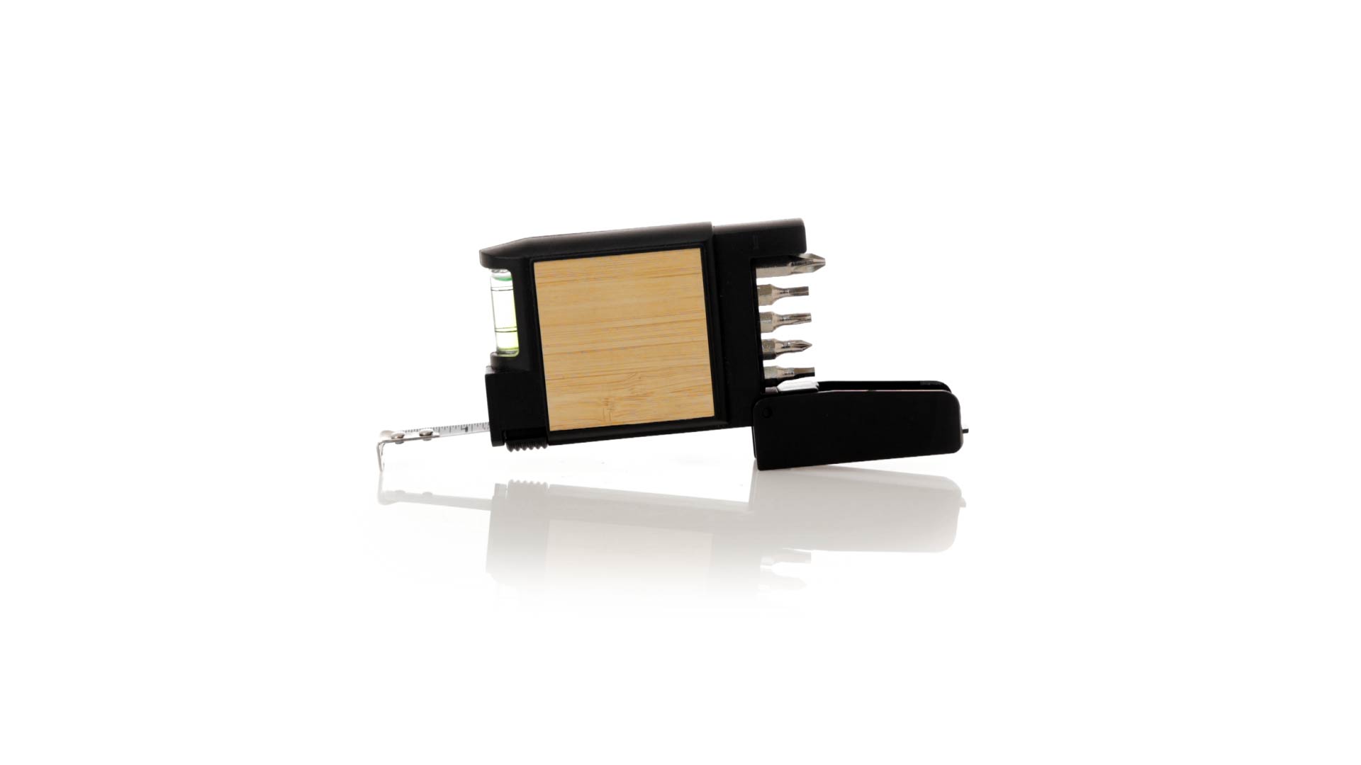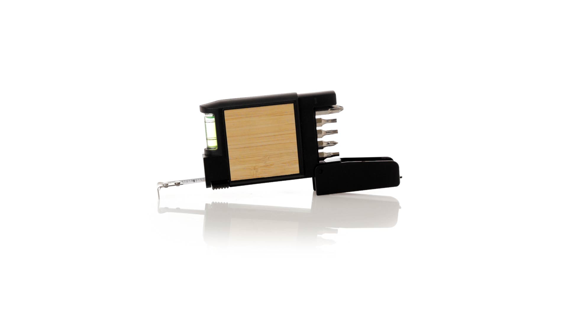 3 m langes Multifunktions-Flexometer, hergestellt aus einer langlebigen Kombination aus Bambus und ABS. Mit 7 Funktionen: 3-Meter-Massband, Schraubendreher mit verschiedenen Bits (Flach-, Kreuz- und Innensechskant) und integriertem Füllstandsmesser. Elegant in Schwarz mit Bambusdetails gestaltet und einzeln in einer Kraft-Designbox präsentiert.