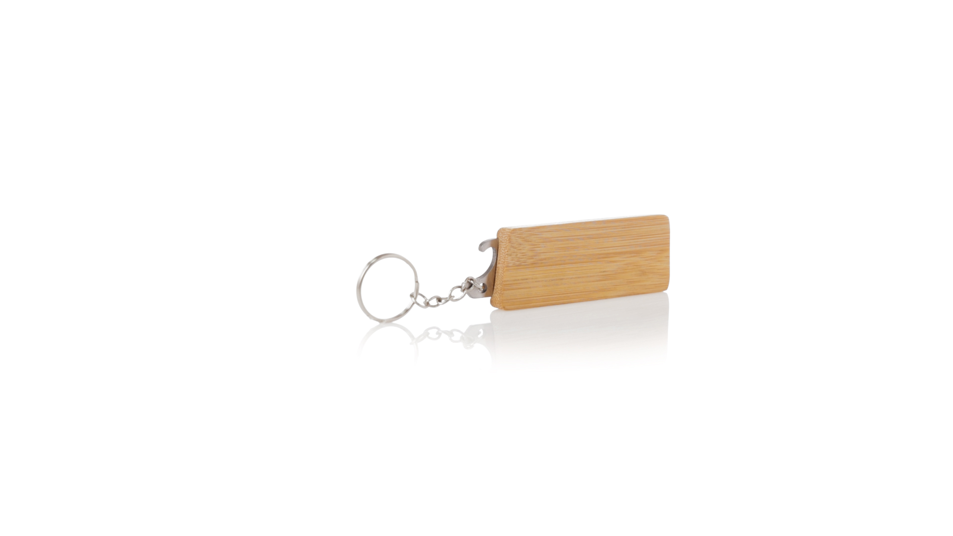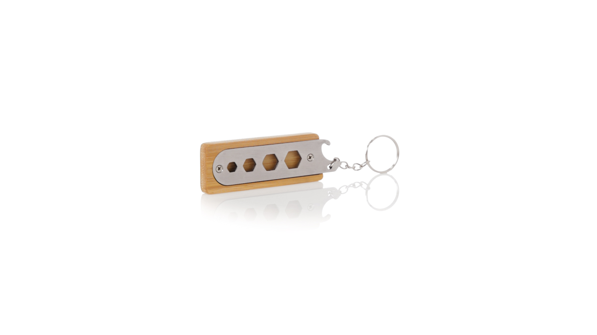 Multitool-Schlüsselanhänger aus robustem Edelstahl und Bambus. Mit praktischem Set aus 4 gestanzten Sechskantschlüsseln und Flaschenöffner. Präsentiert in individueller Kraft-Design-Box.