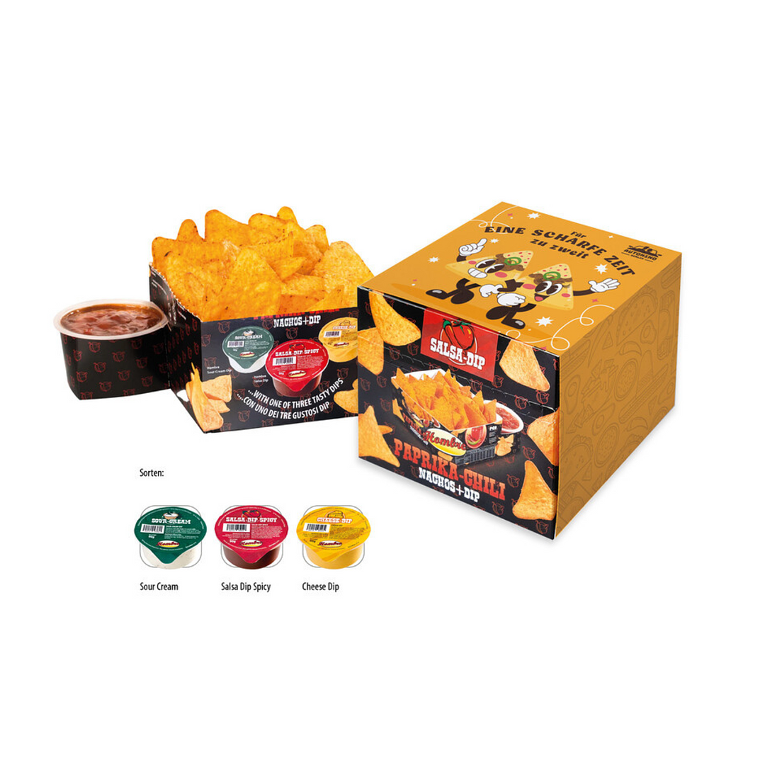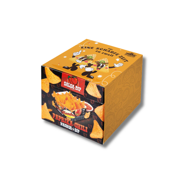Die Nacho Box im Schuber (190 g) ist eine köstliche Kombination aus knusprigen Paprika Chips und drei leckeren Dips. Besonders herausragend ist die individuell gestaltbare Banderole, die Ihnen ermöglicht, das Design perfekt an Ihr Unternehmen oder Event anzupassen – für einen einzigartigen Werbeauftritt.