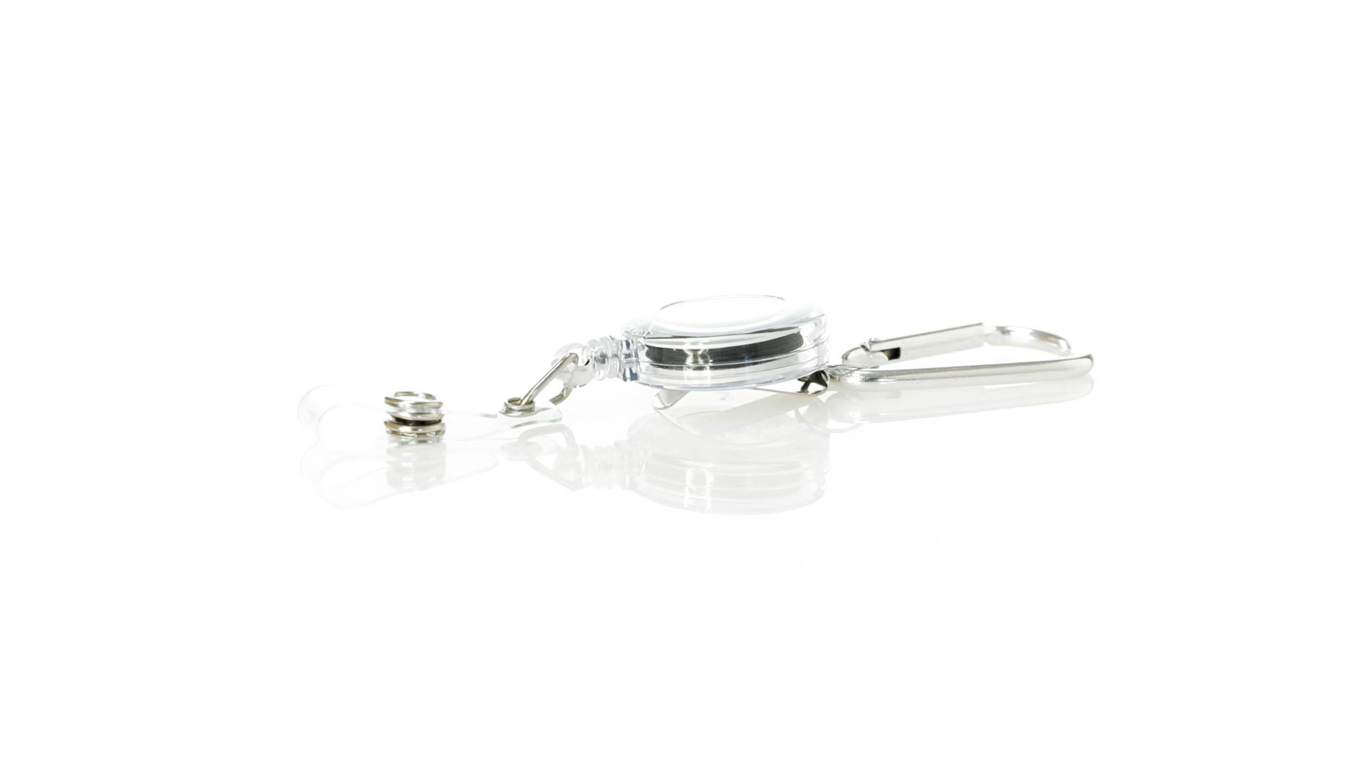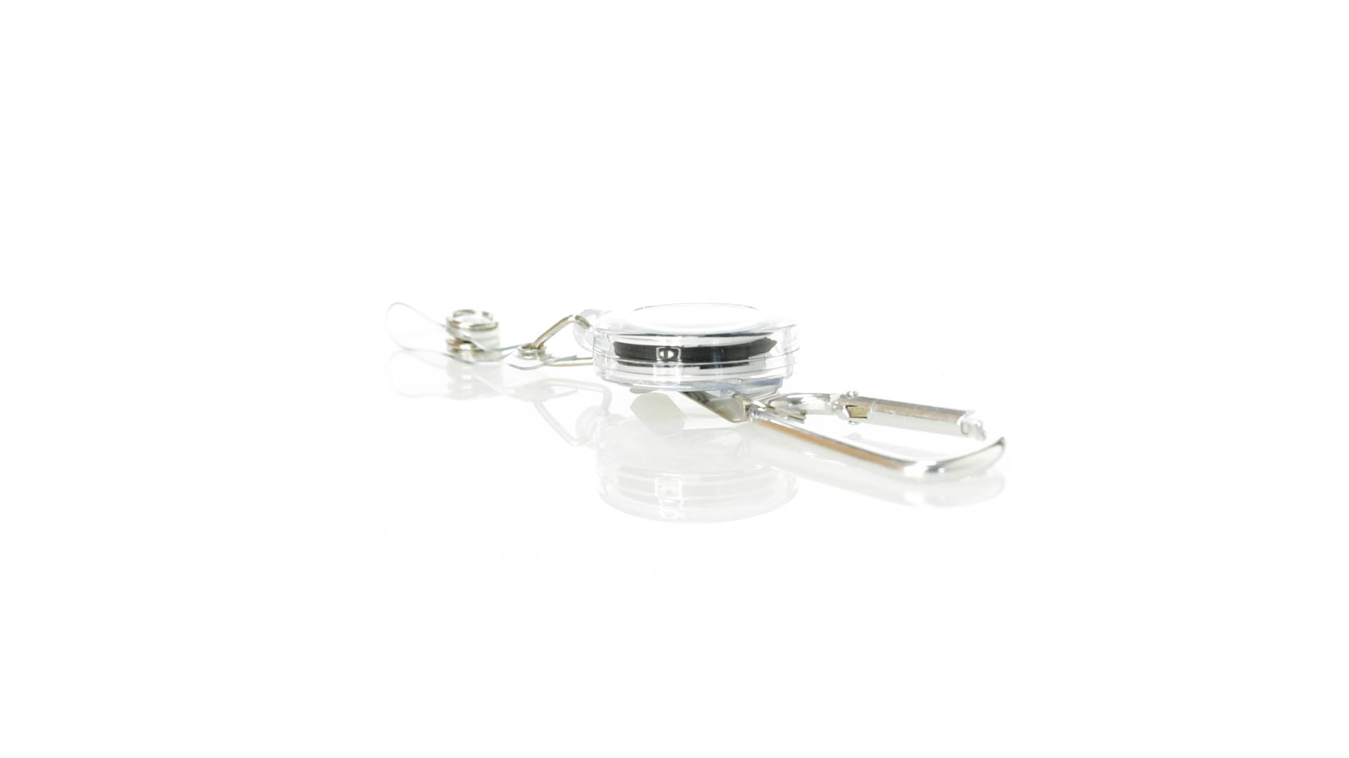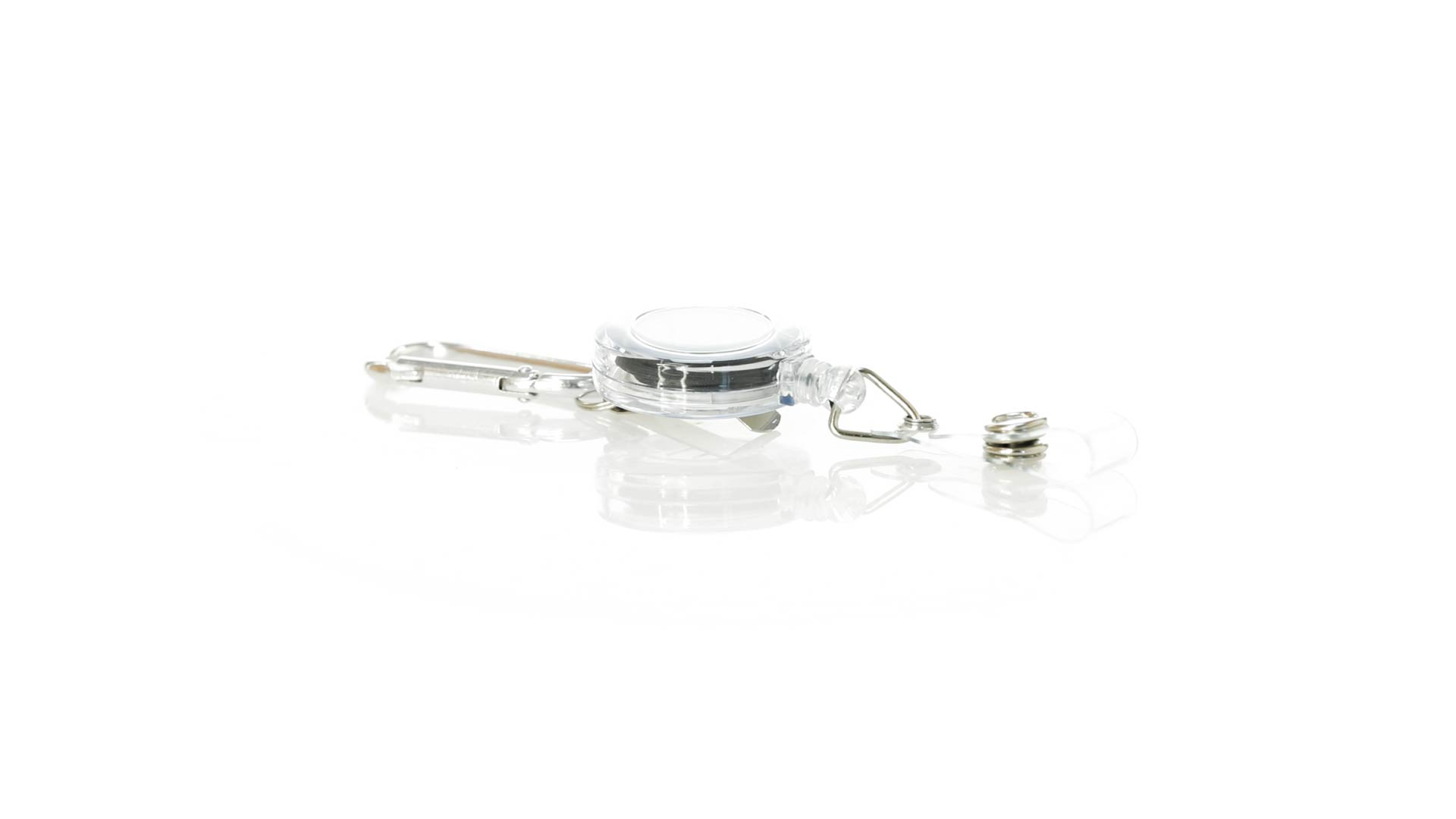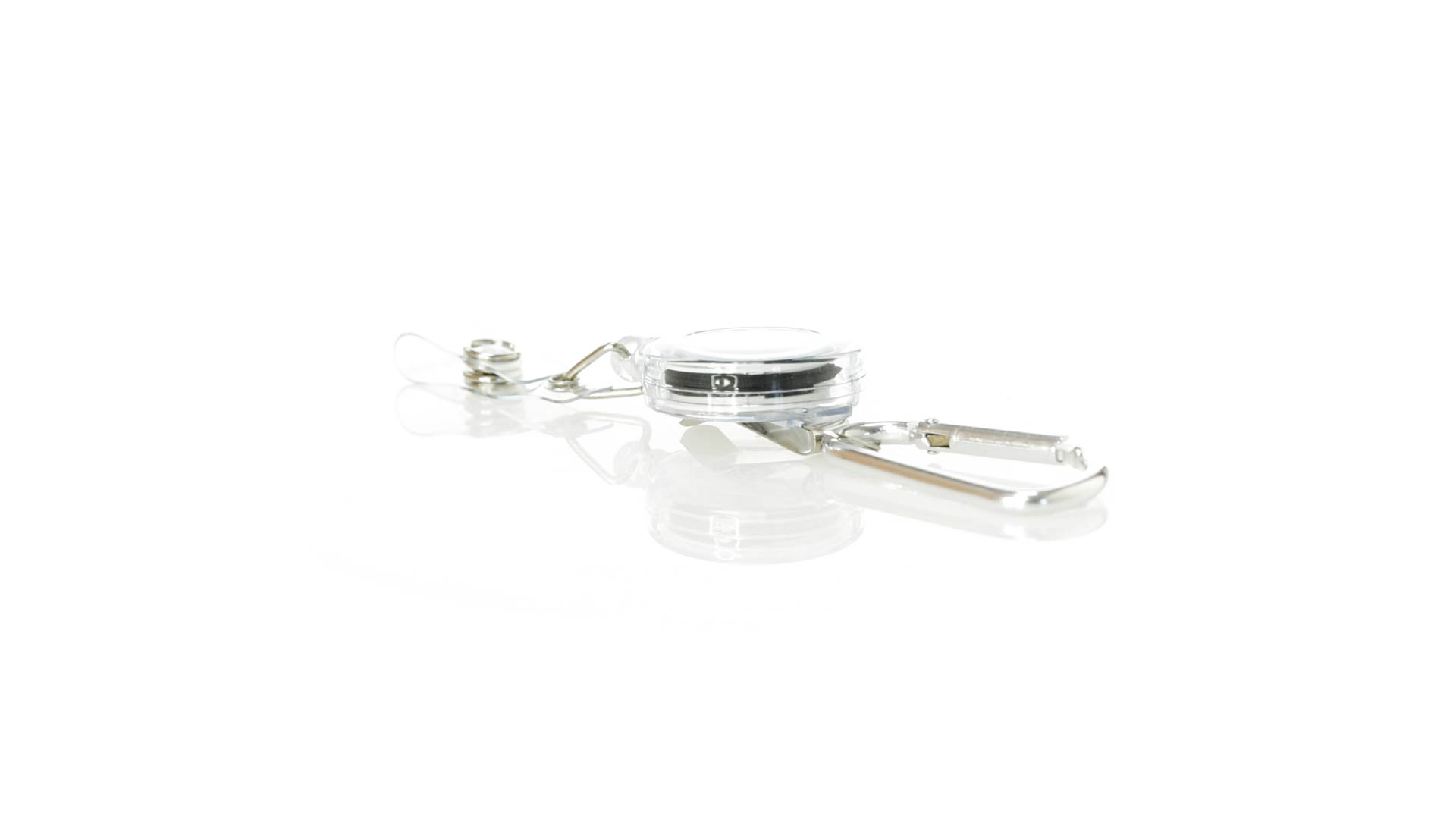 Schlicht gestalteter, ausziehbarer Gegenstandshalter mit Knopfverschlussriemen und Ausziehmechanismus bis zu 65 cm. Einschliesslich eines Metallkarabiners und speziell entworfen, um alltägliche Objekte zu tragen und leichten Zugang zu ihnen zu erhalten (berührungssichere Schlüsselanhänger, Sicherheitszeiger, Ausweis...). Grosse Markierungsfläche auf dem Mittelstück.