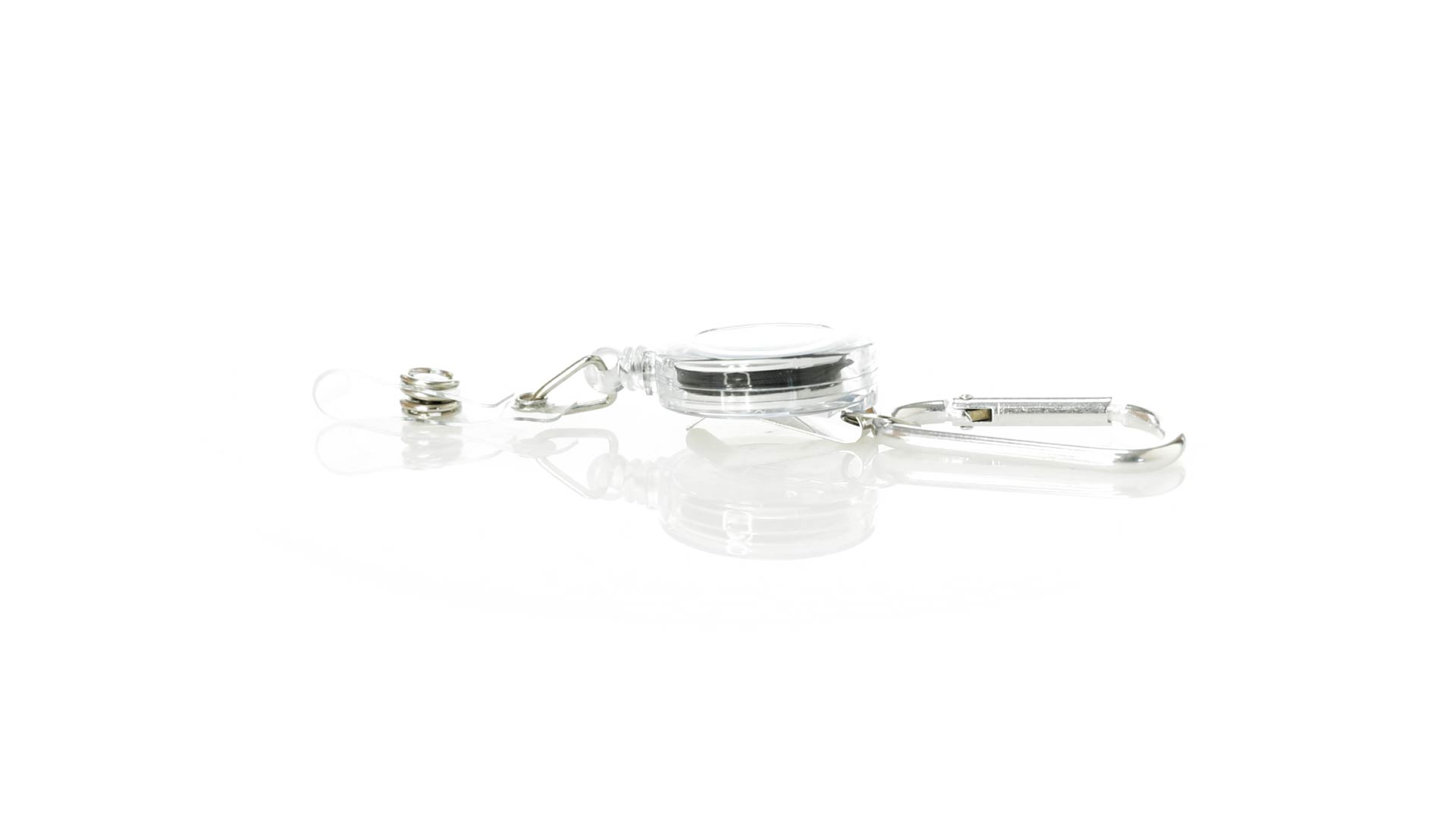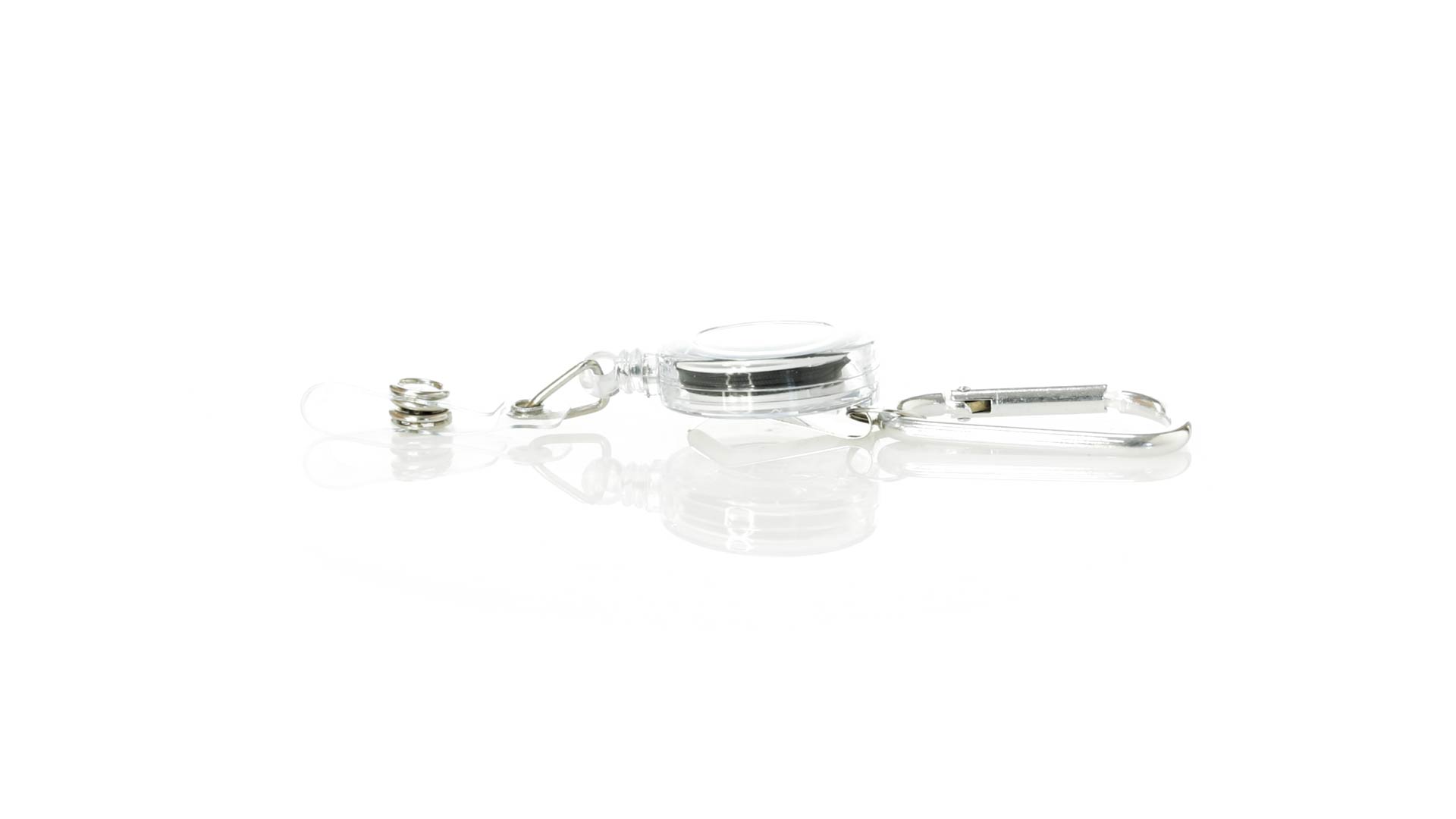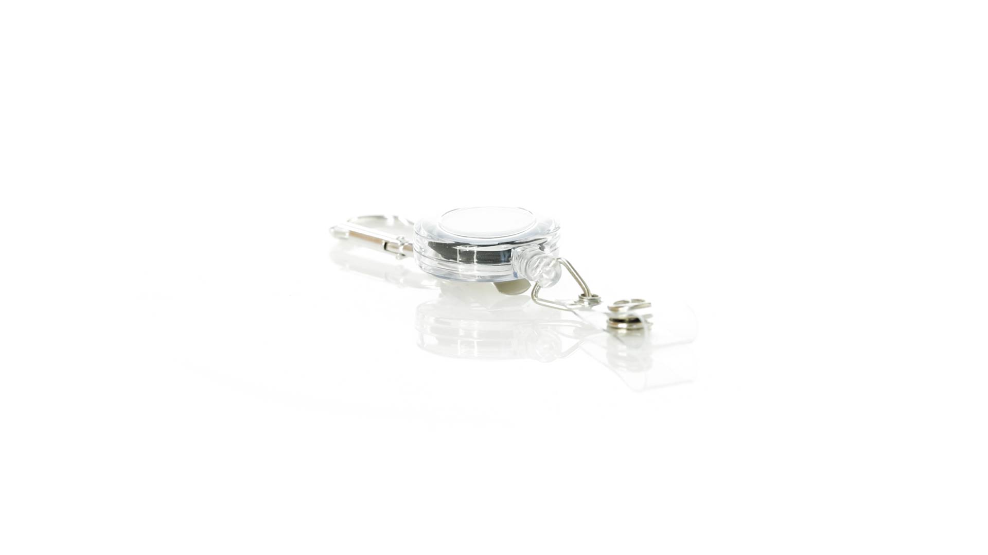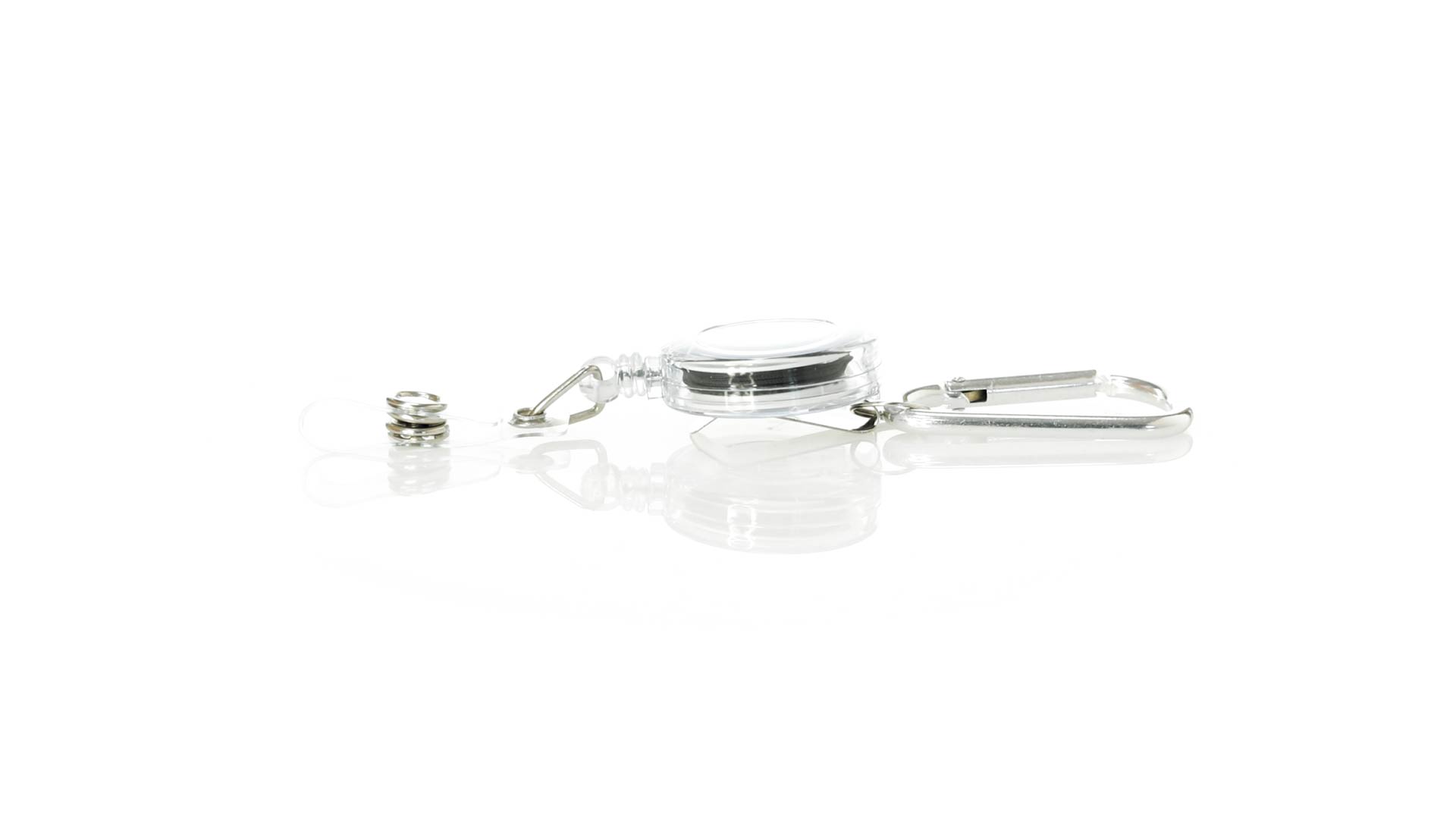 Schlicht gestalteter, ausziehbarer Gegenstandshalter mit Knopfverschlussriemen und Ausziehmechanismus bis zu 65 cm. Einschliesslich eines Metallkarabiners und speziell entworfen, um alltägliche Objekte zu tragen und leichten Zugang zu ihnen zu erhalten (berührungssichere Schlüsselanhänger, Sicherheitszeiger, Ausweis...). Grosse Markierungsfläche auf dem Mittelstück.