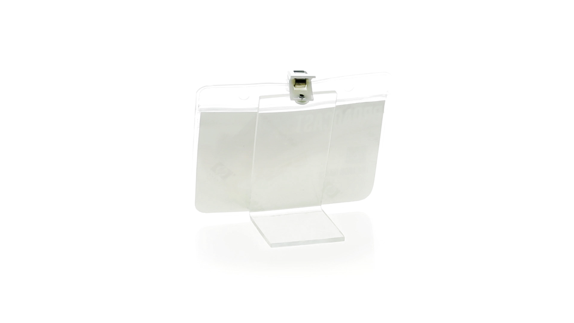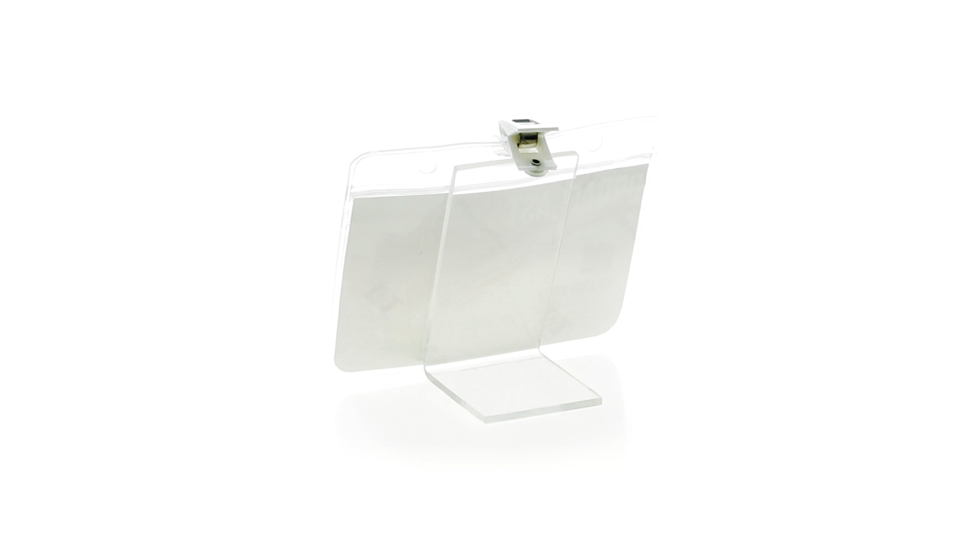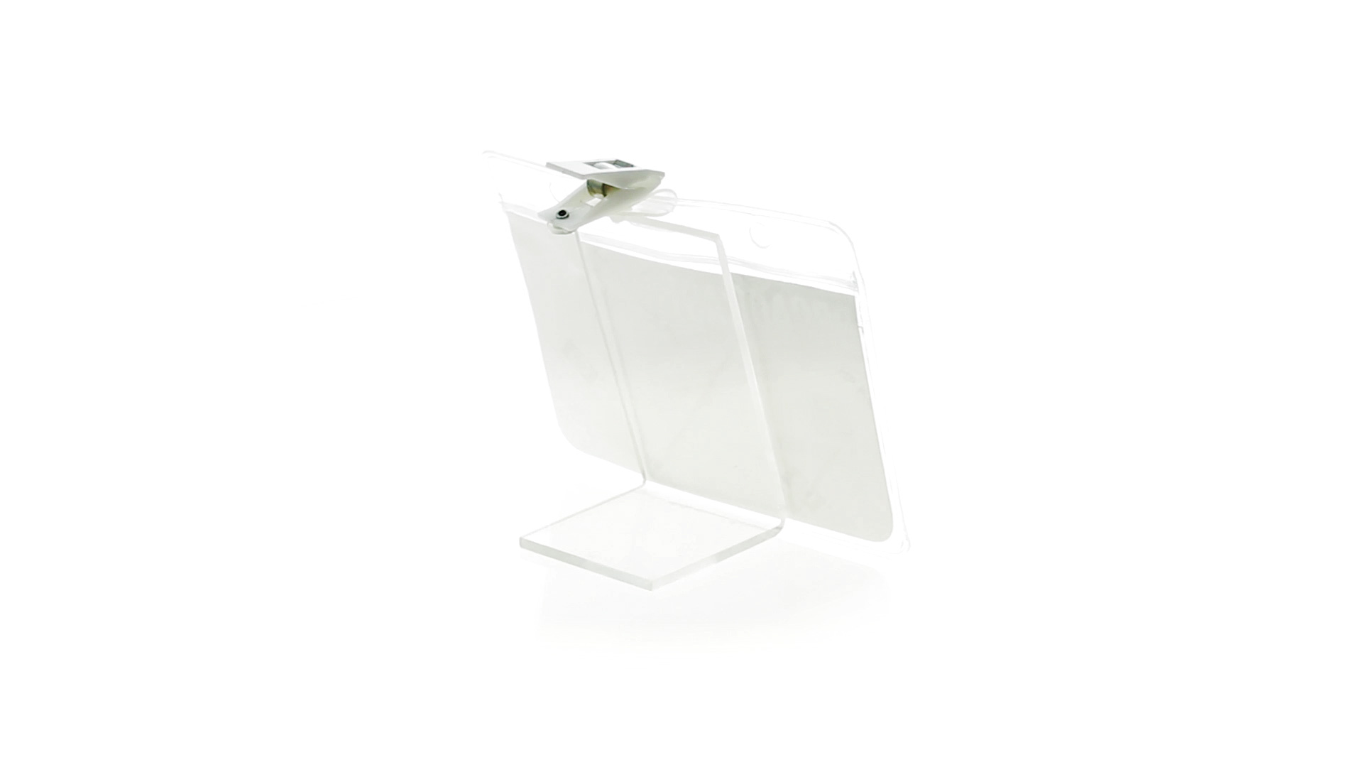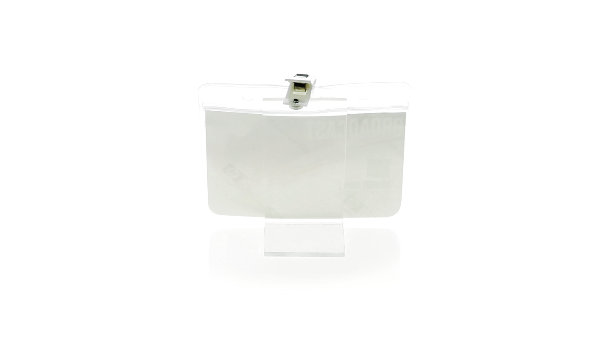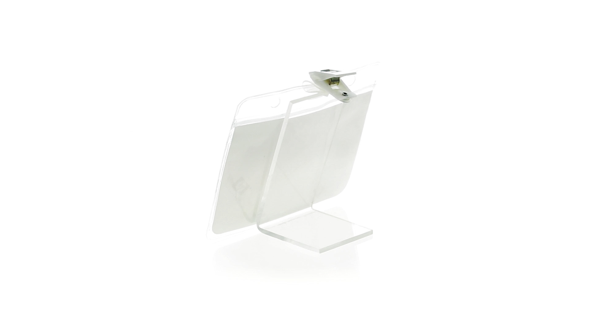 Gestanzter Ausweishalter aus PVC mit Befestigungsclip in Weiss. Erhältlich in horizontaler und vertikaler Ausführung.