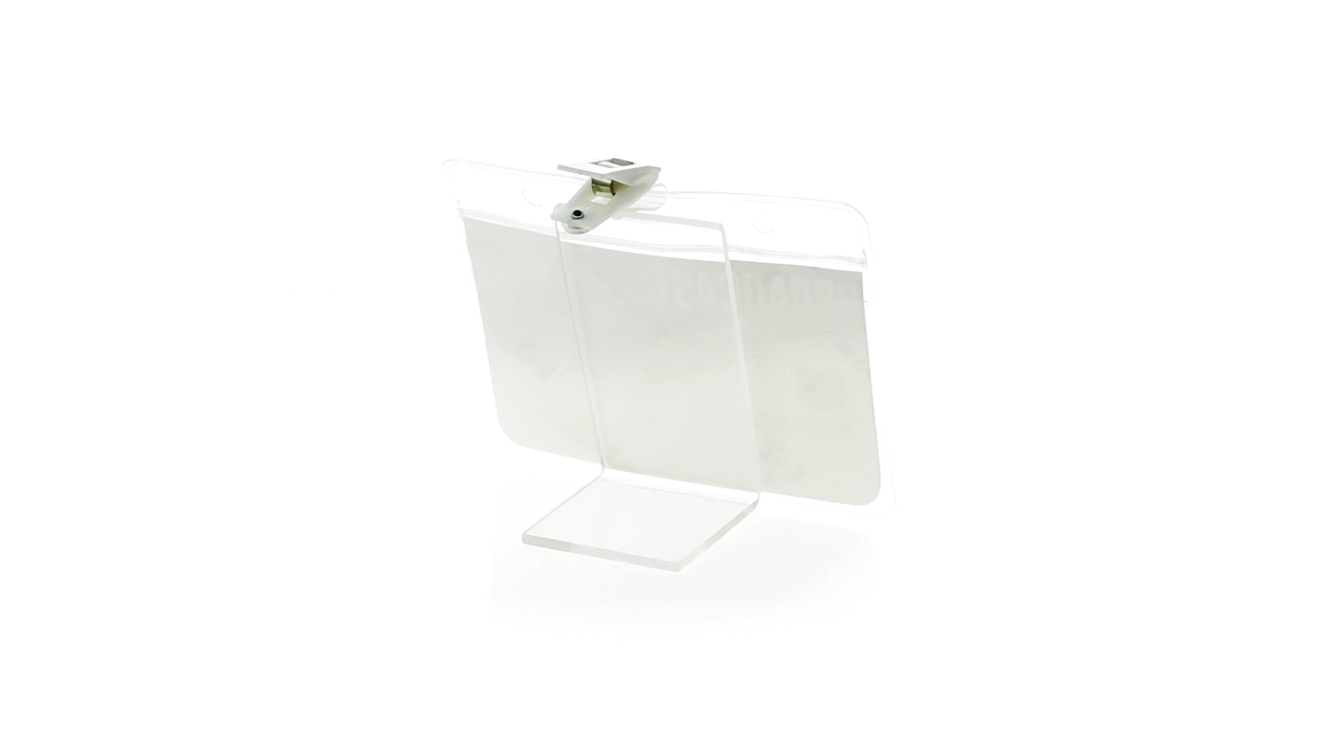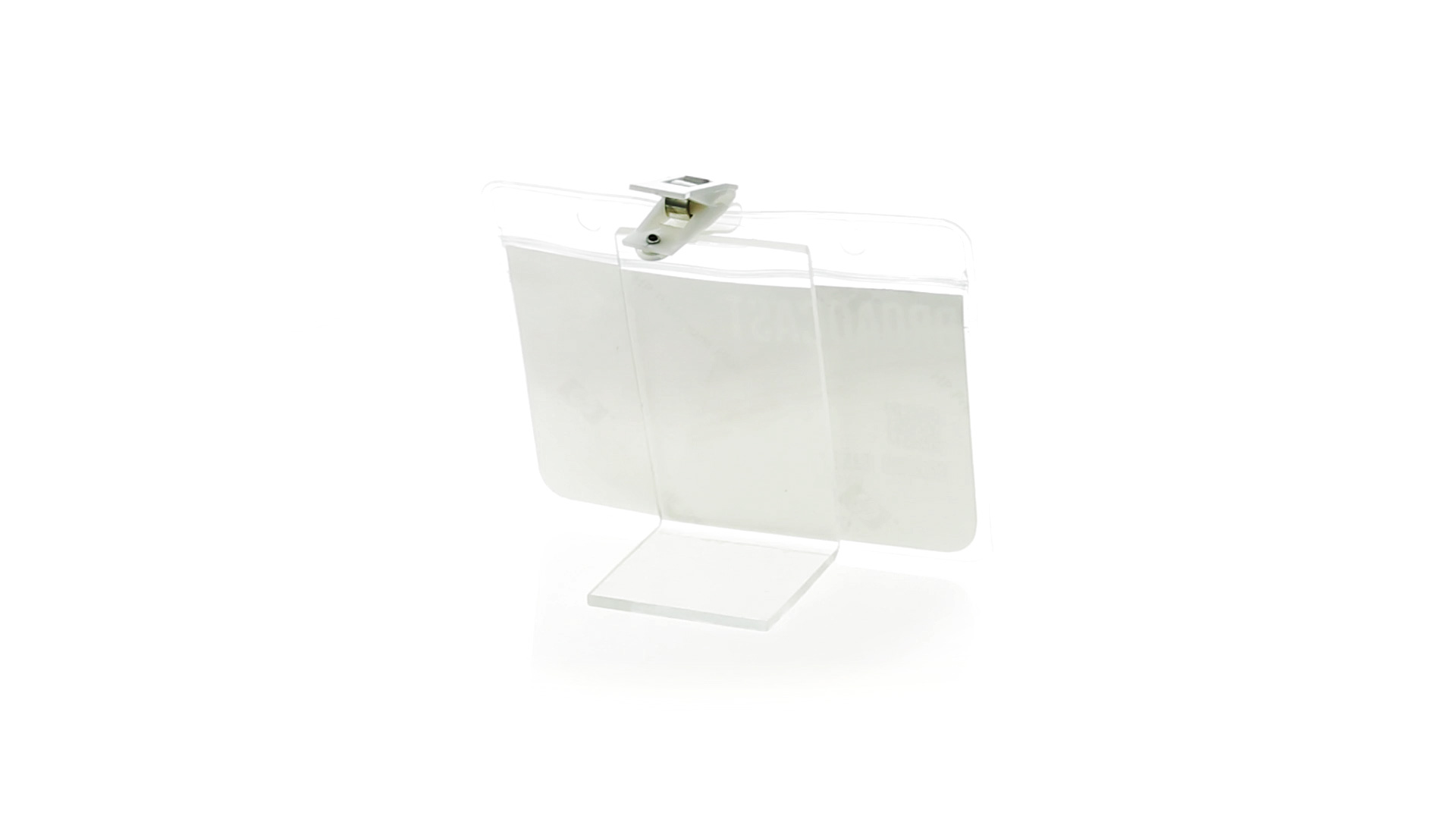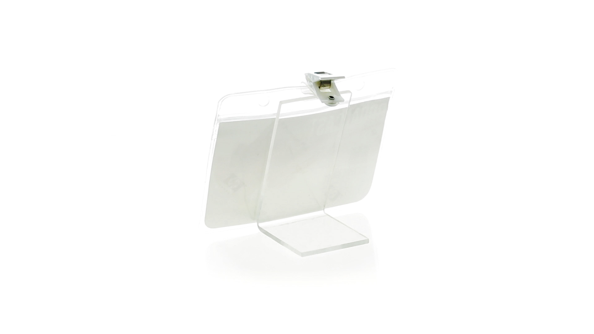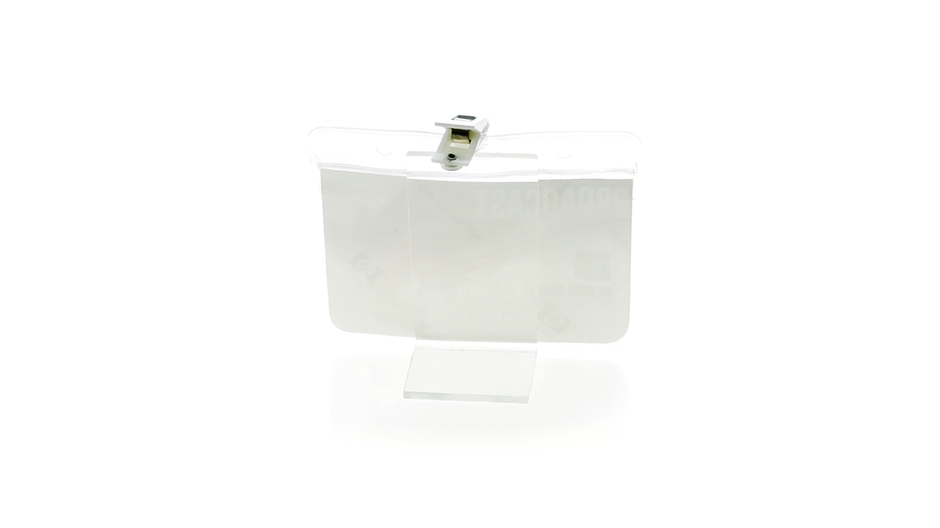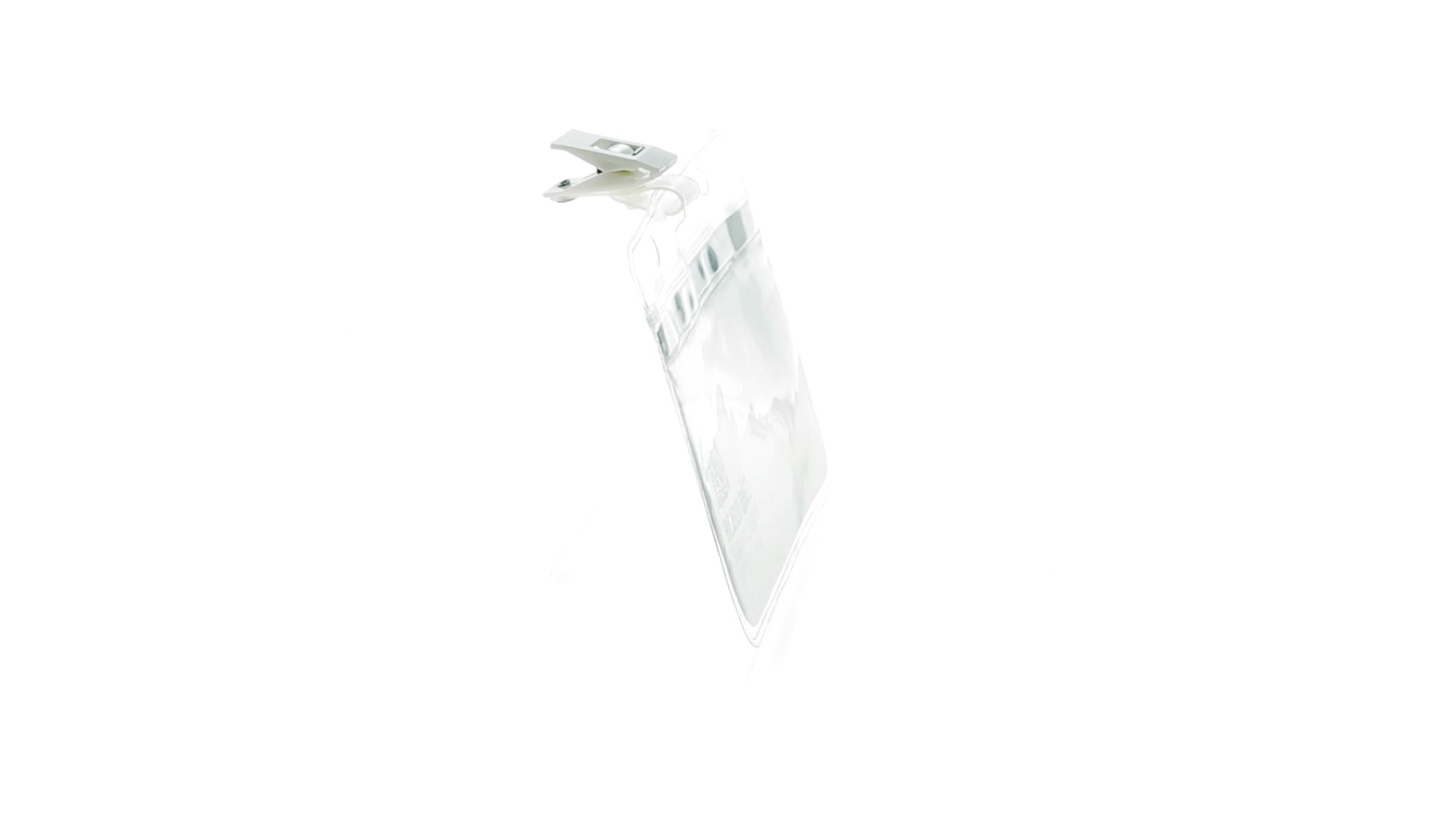 Gestanzter Ausweishalter aus PVC mit Befestigungsclip in Weiss. Erhältlich in horizontaler und vertikaler Ausführung.
