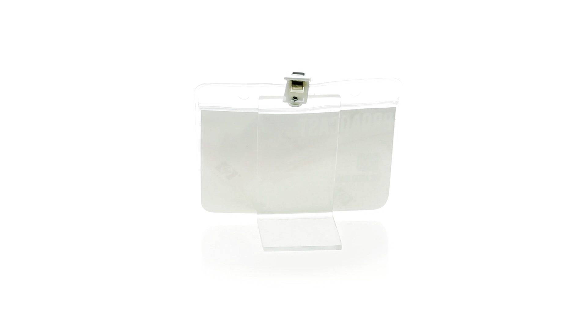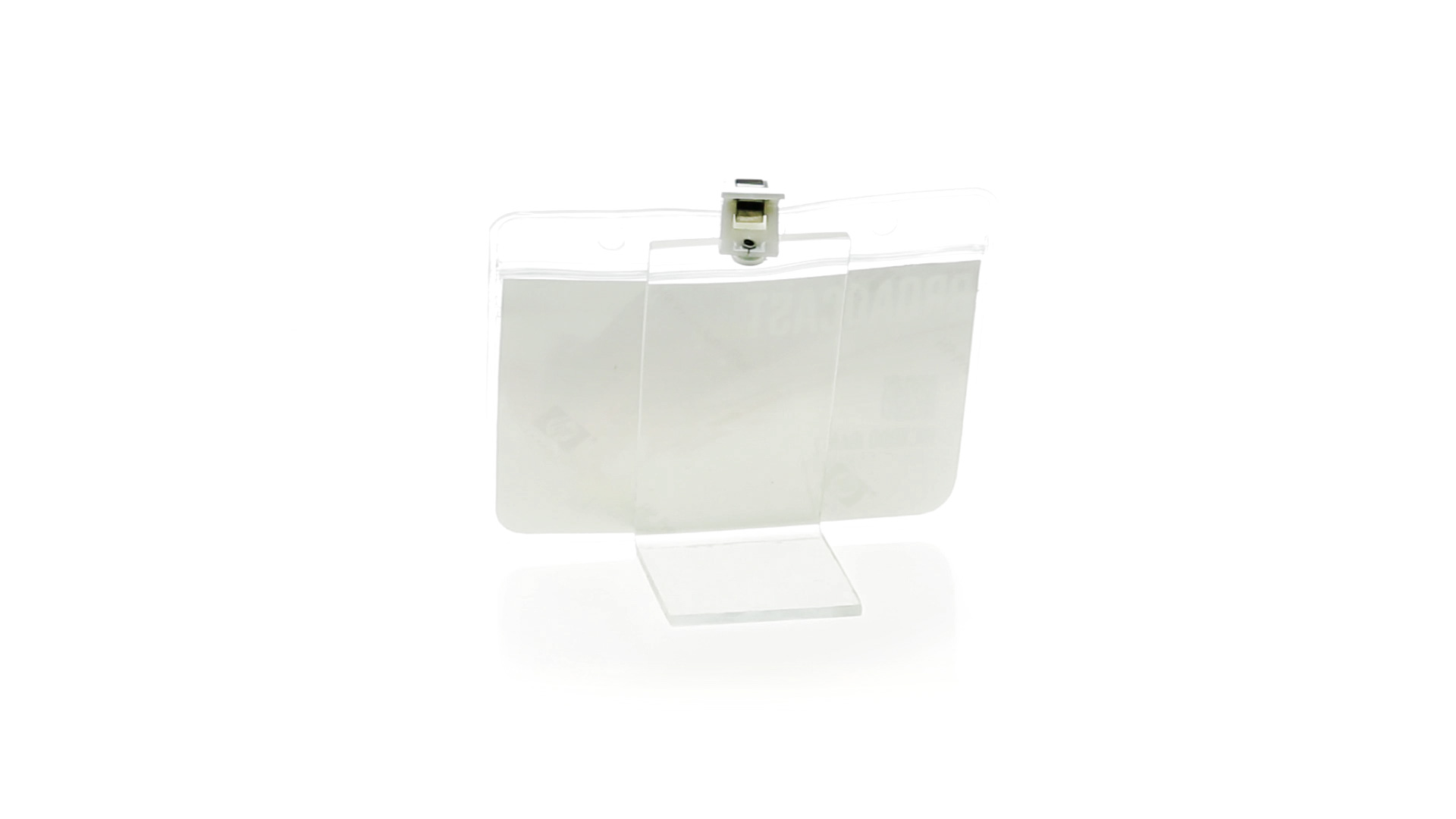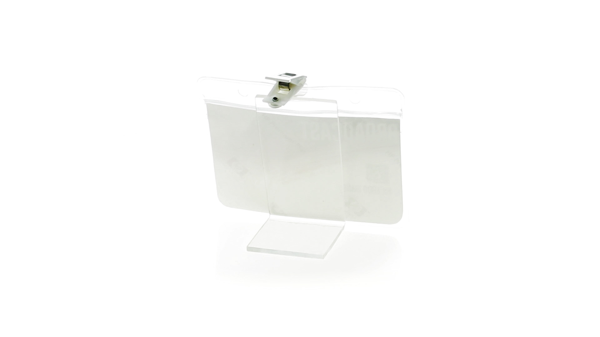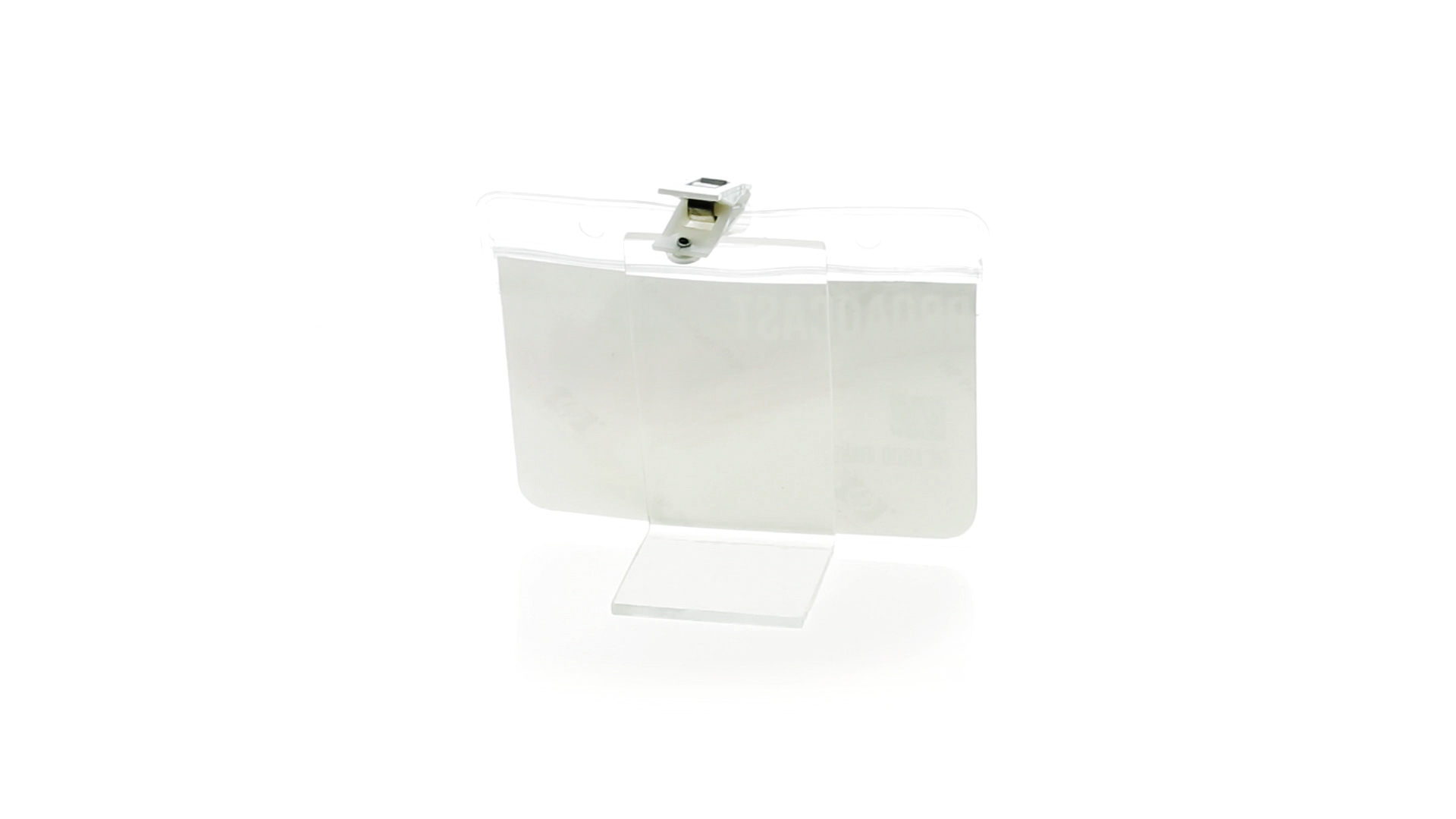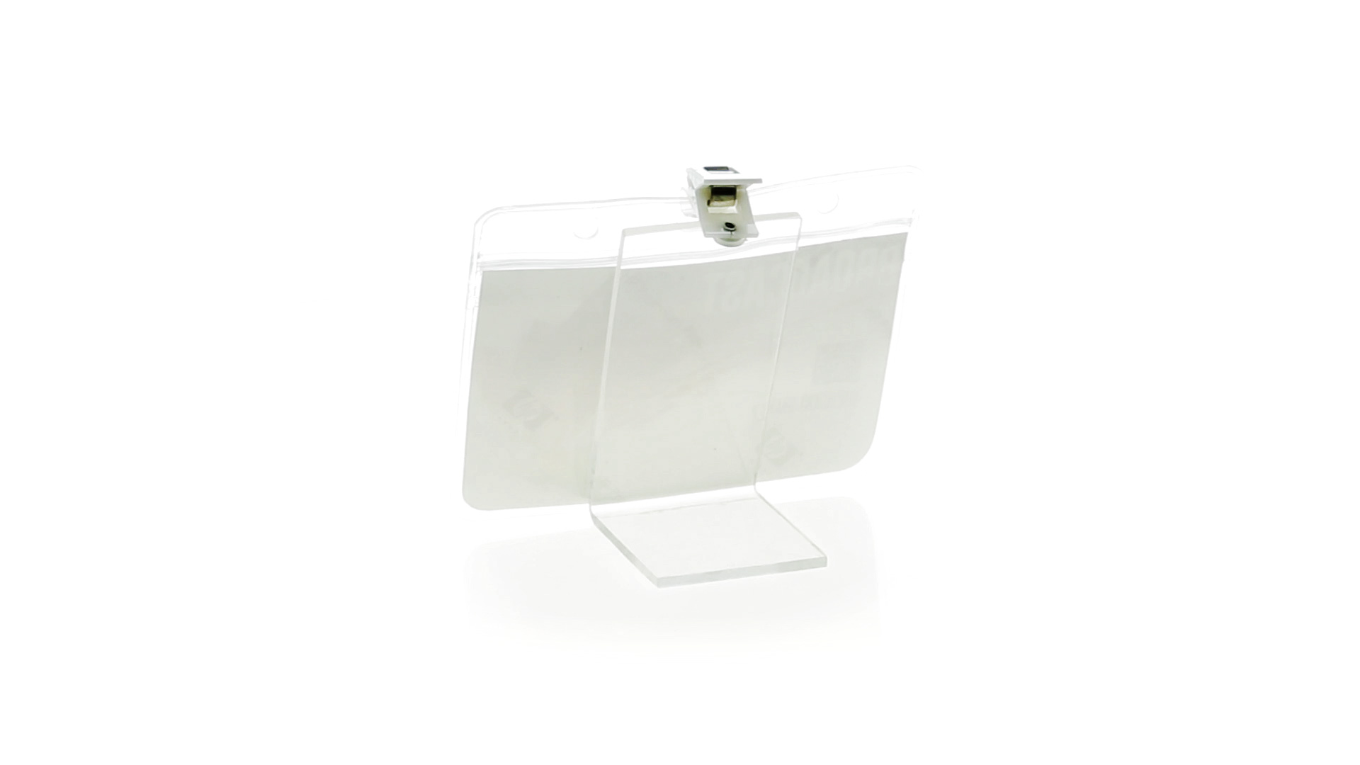 Gestanzter Ausweishalter aus PVC mit Befestigungsclip in Weiss. Erhältlich in horizontaler und vertikaler Ausführung.