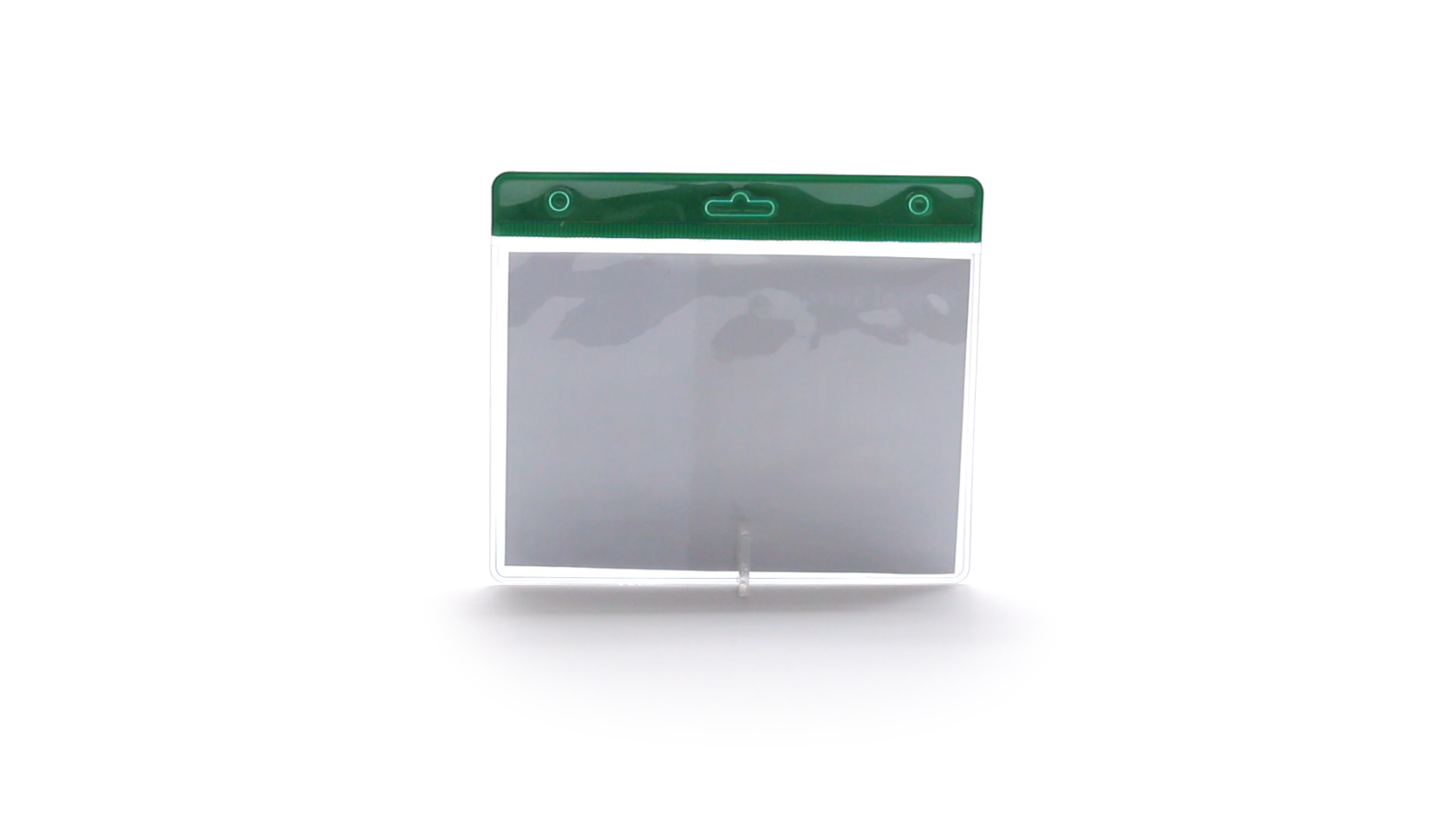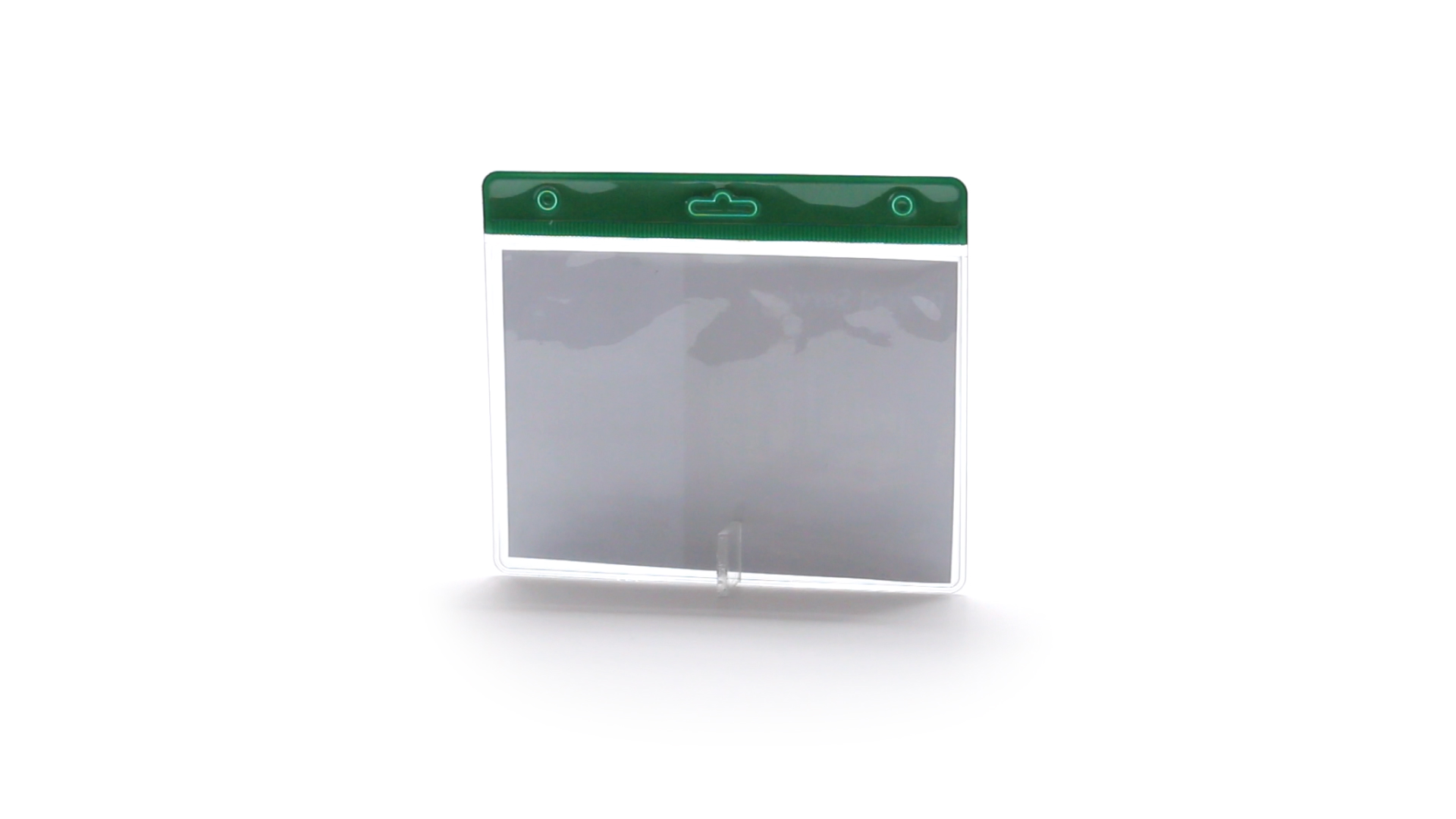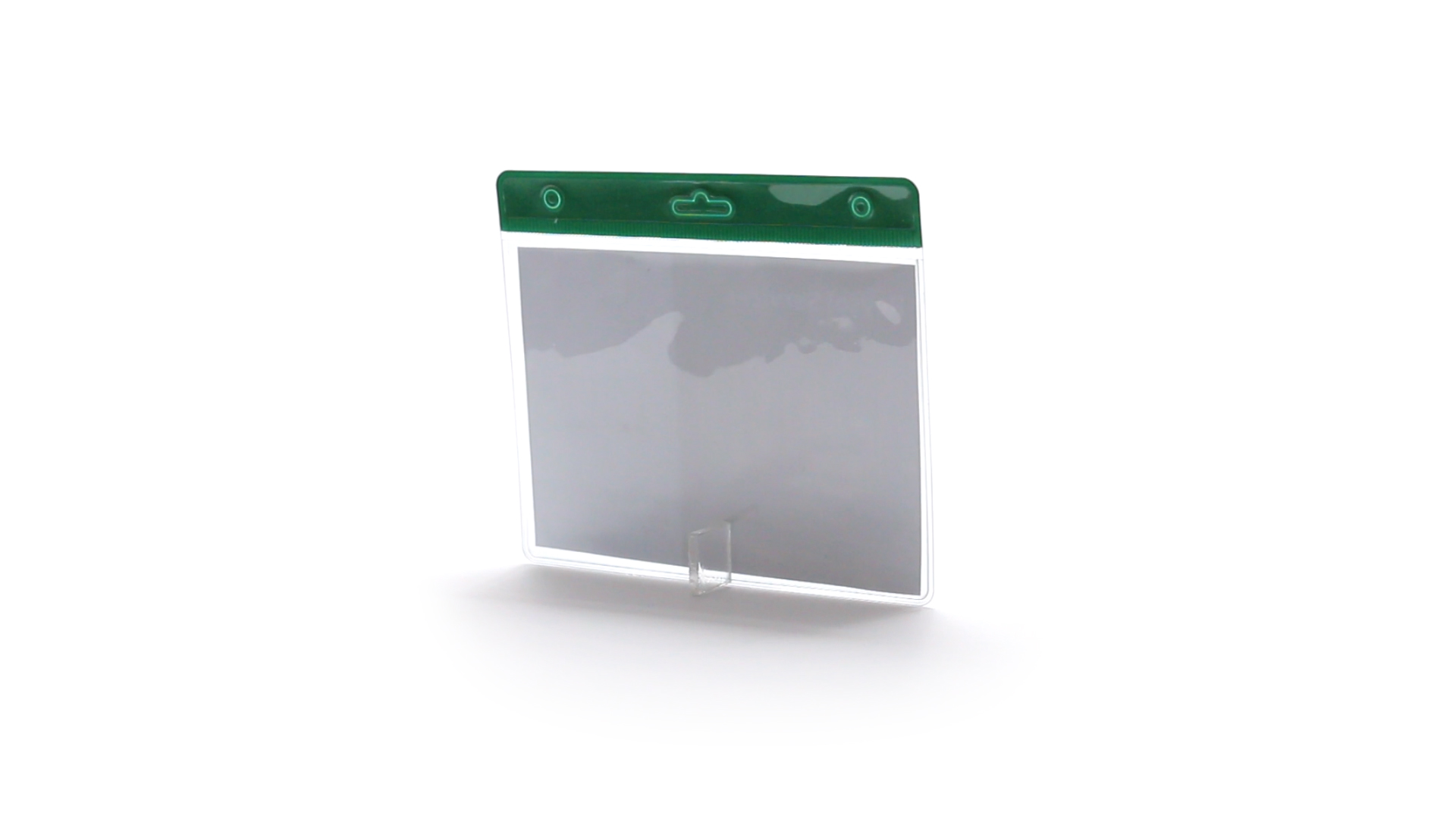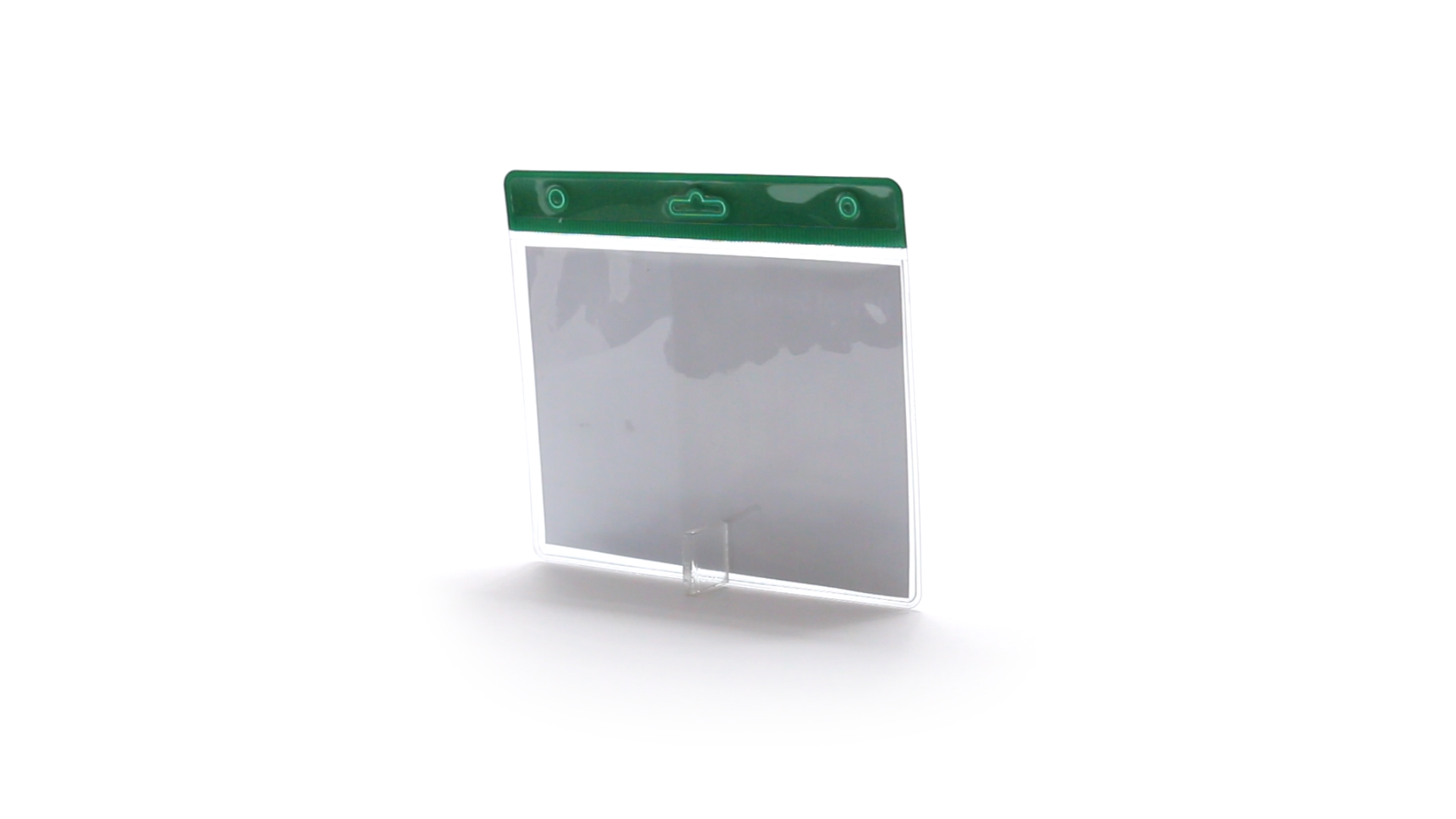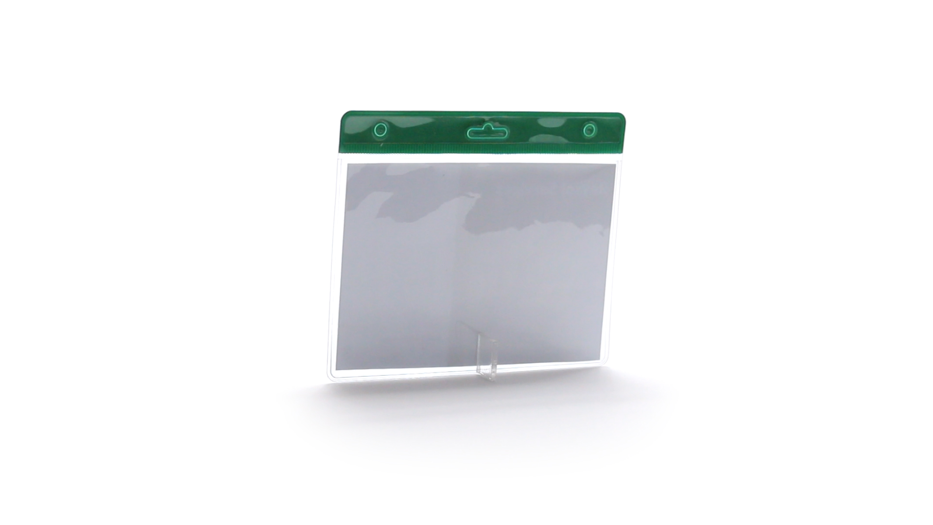 Gestanzte Ausweishülle aus PVC. Mit oberer Kante in verschiedenen Farben, transparentem Frontfenster und weisser Rückseite.
