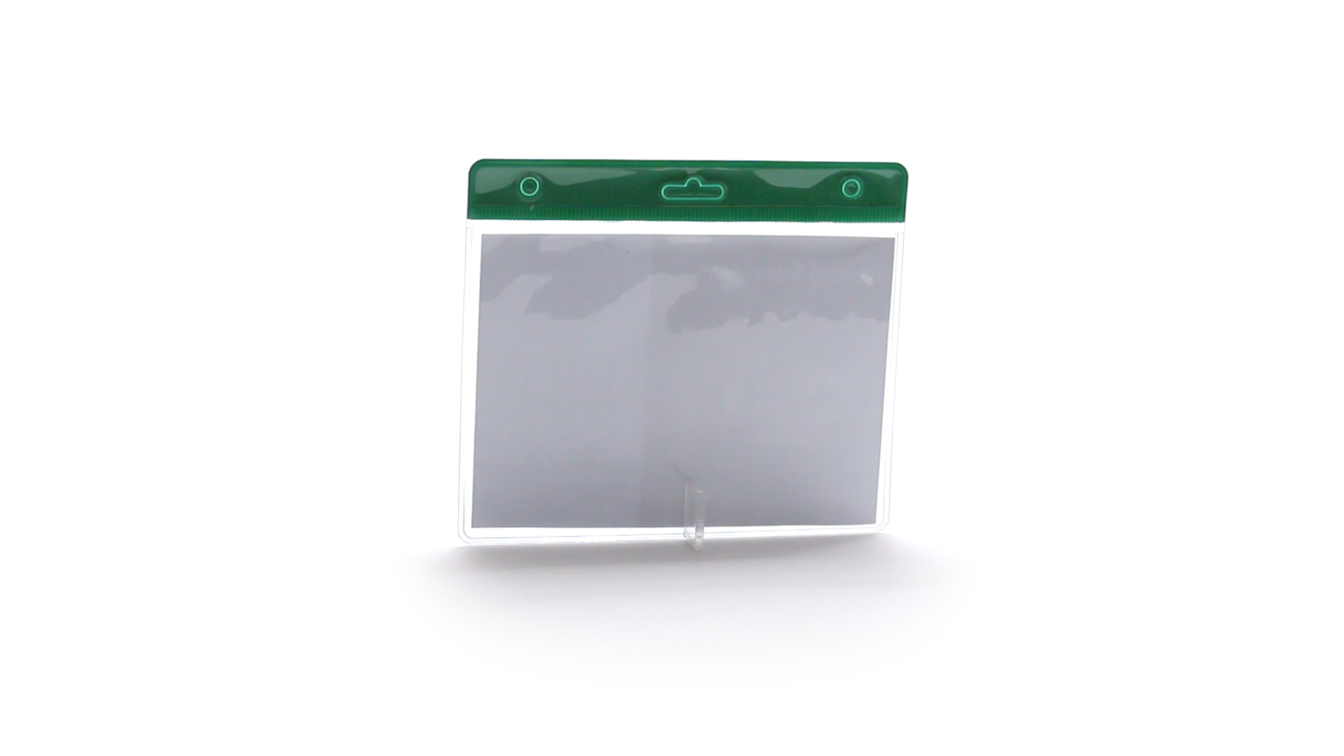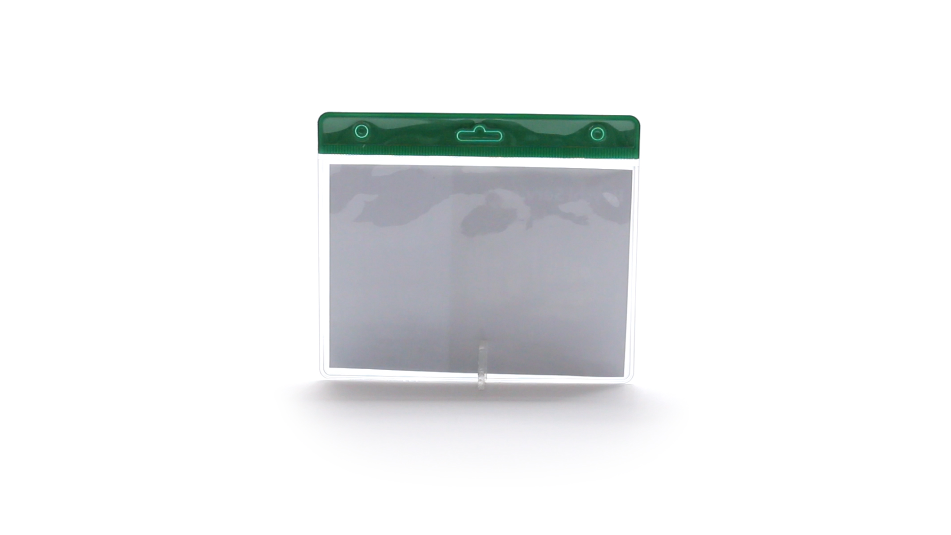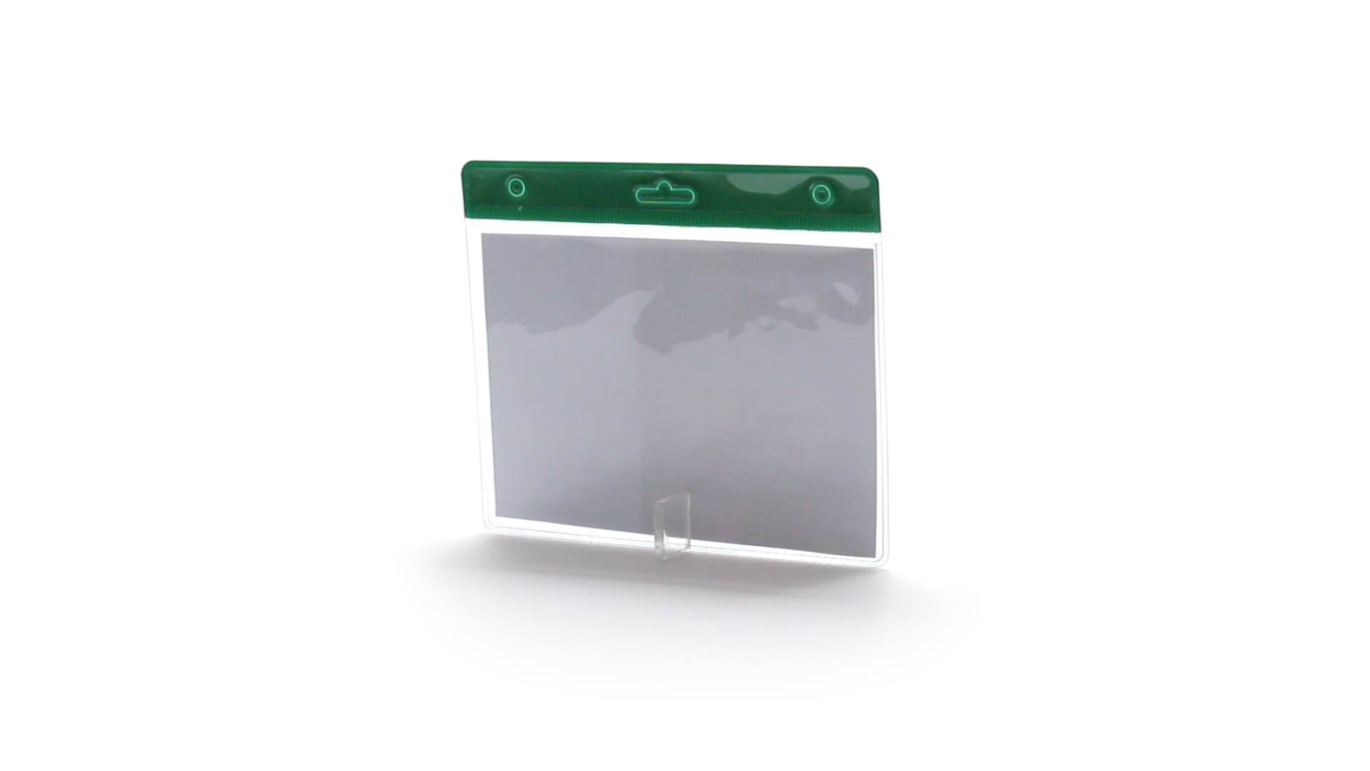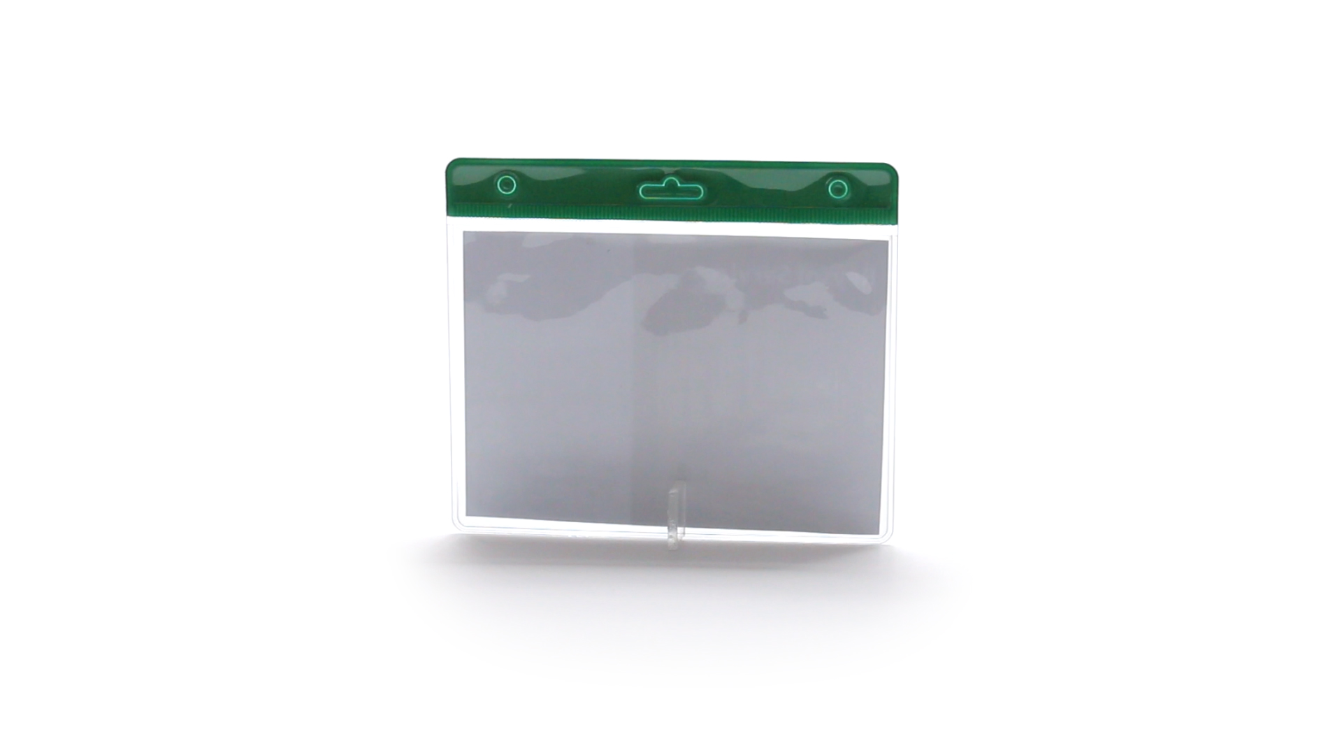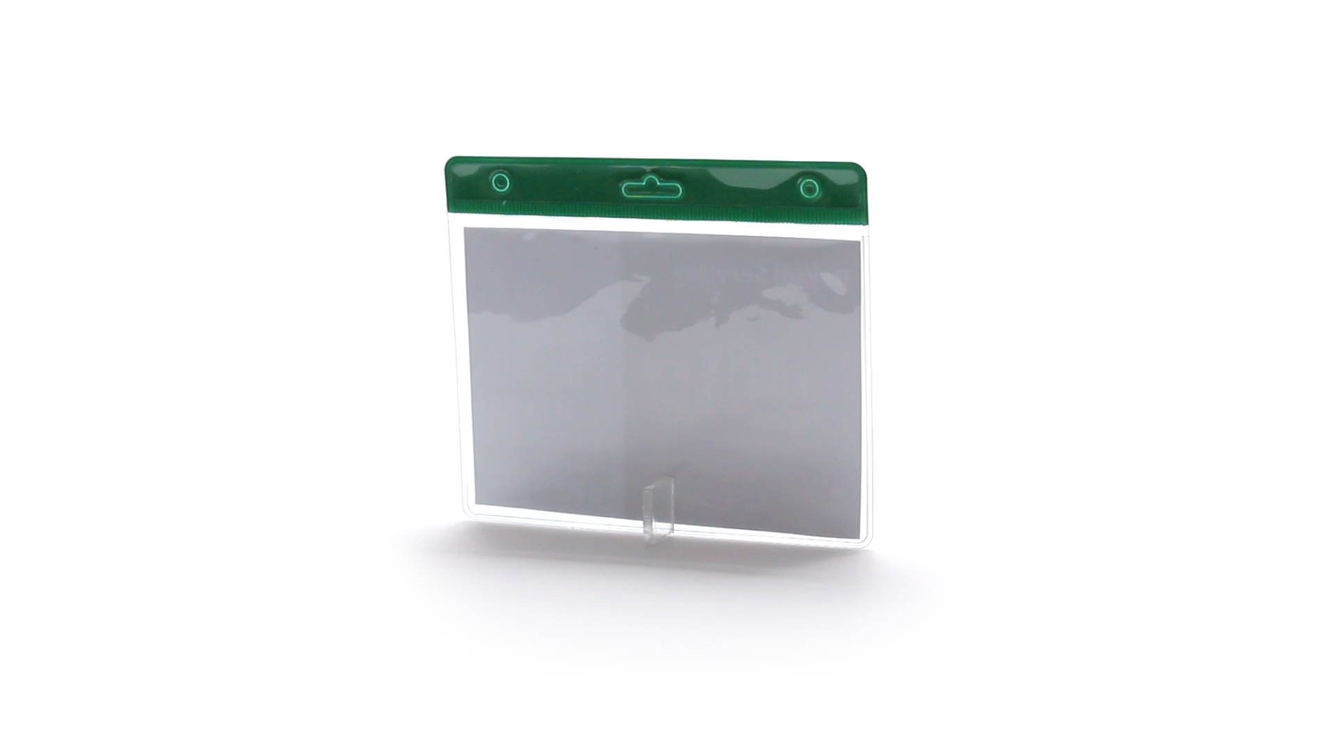 Gestanzte Ausweishülle aus PVC. Mit oberer Kante in verschiedenen Farben, transparentem Frontfenster und weisser Rückseite.