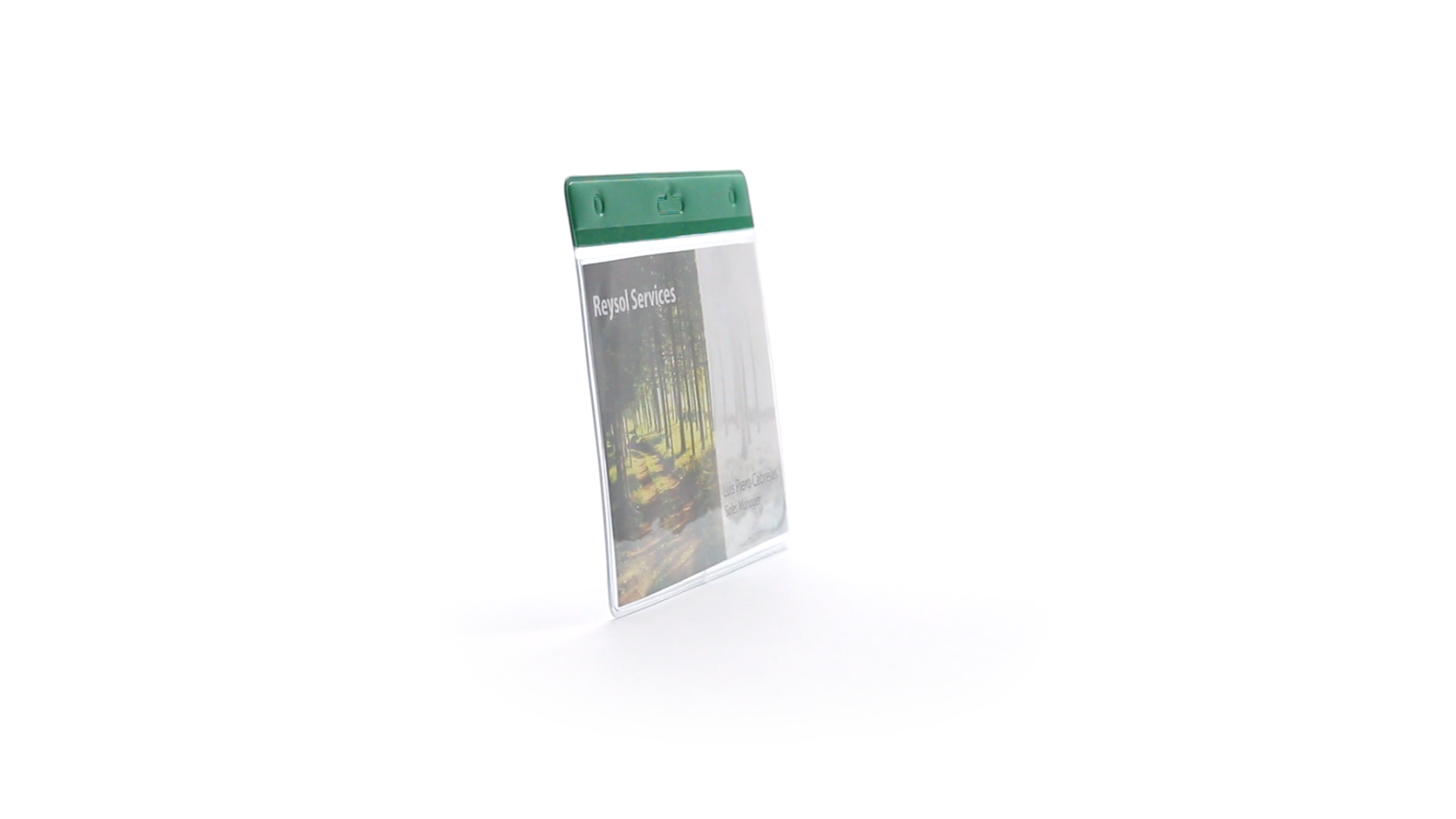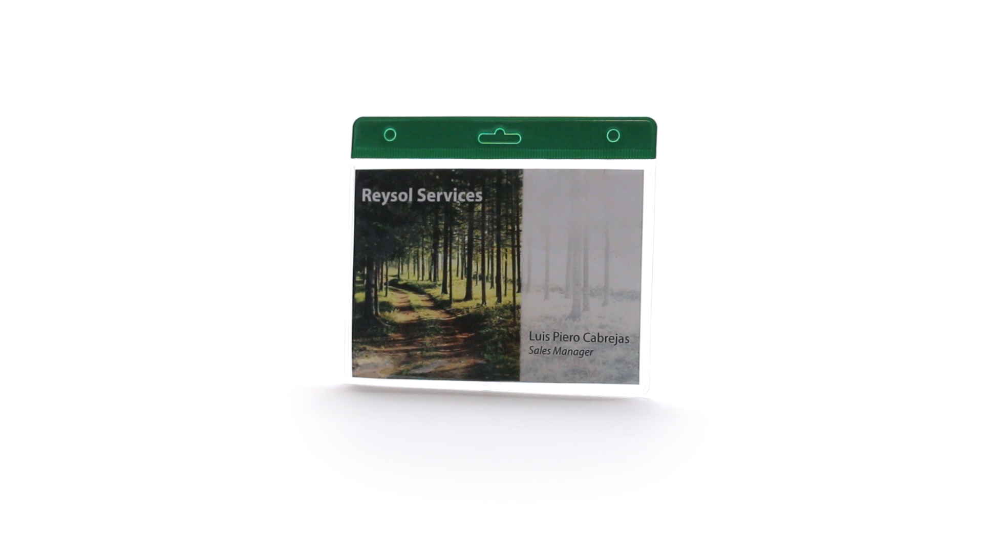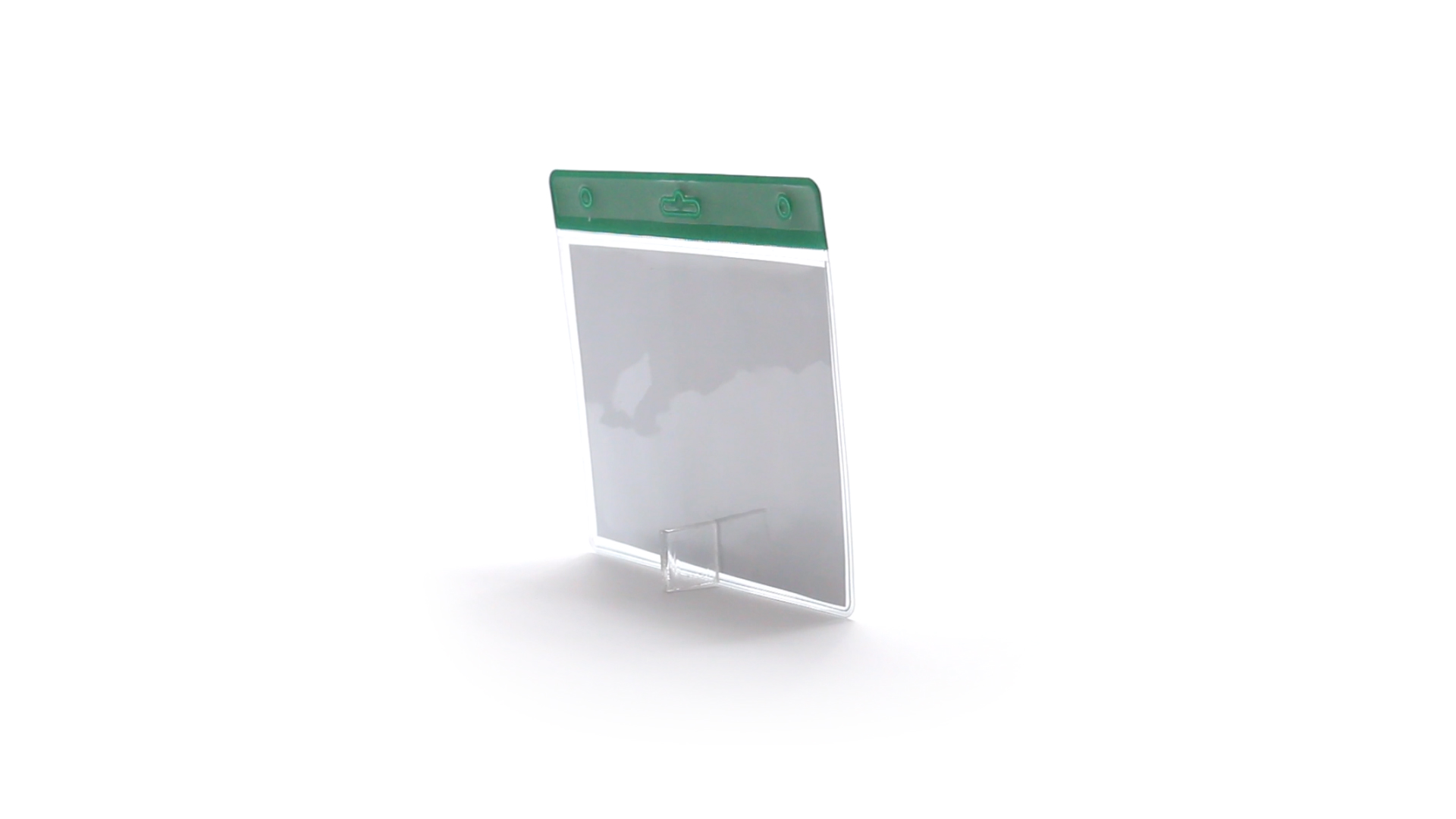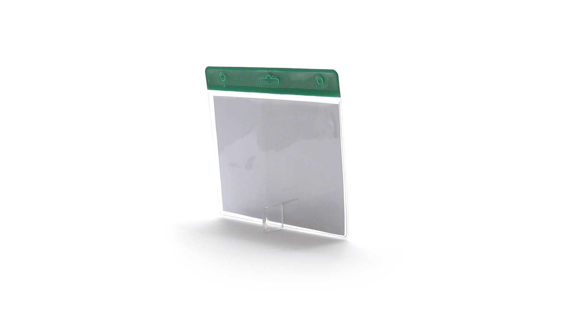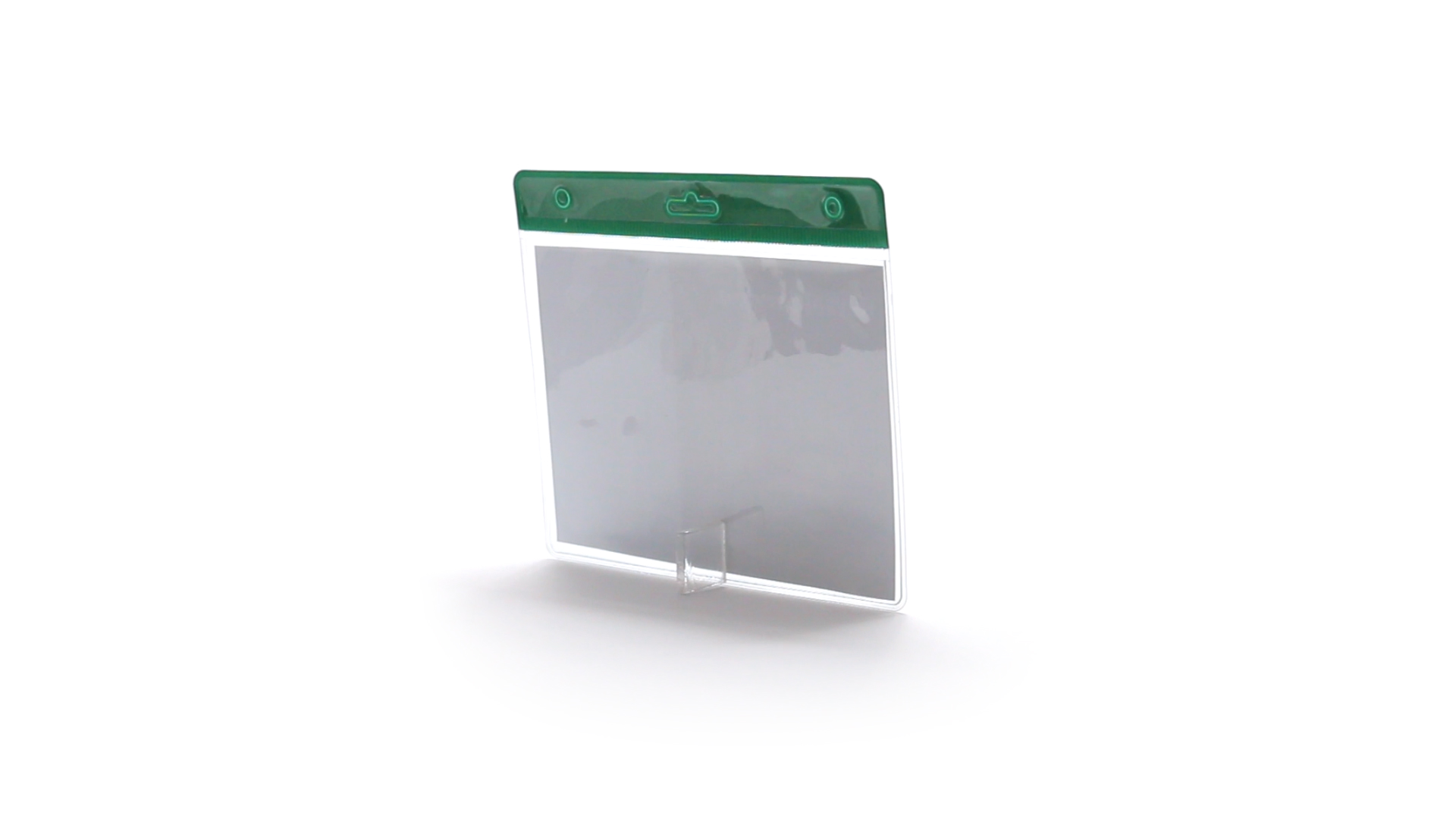 Gestanzte Ausweishülle aus PVC. Mit oberer Kante in verschiedenen Farben, transparentem Frontfenster und weisser Rückseite.
