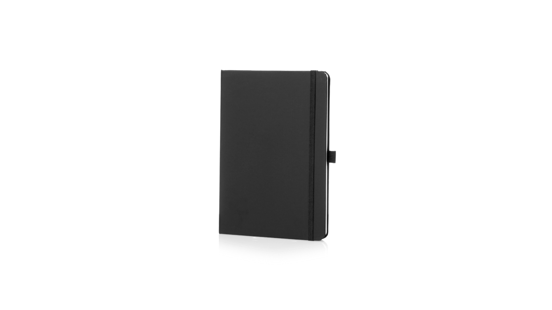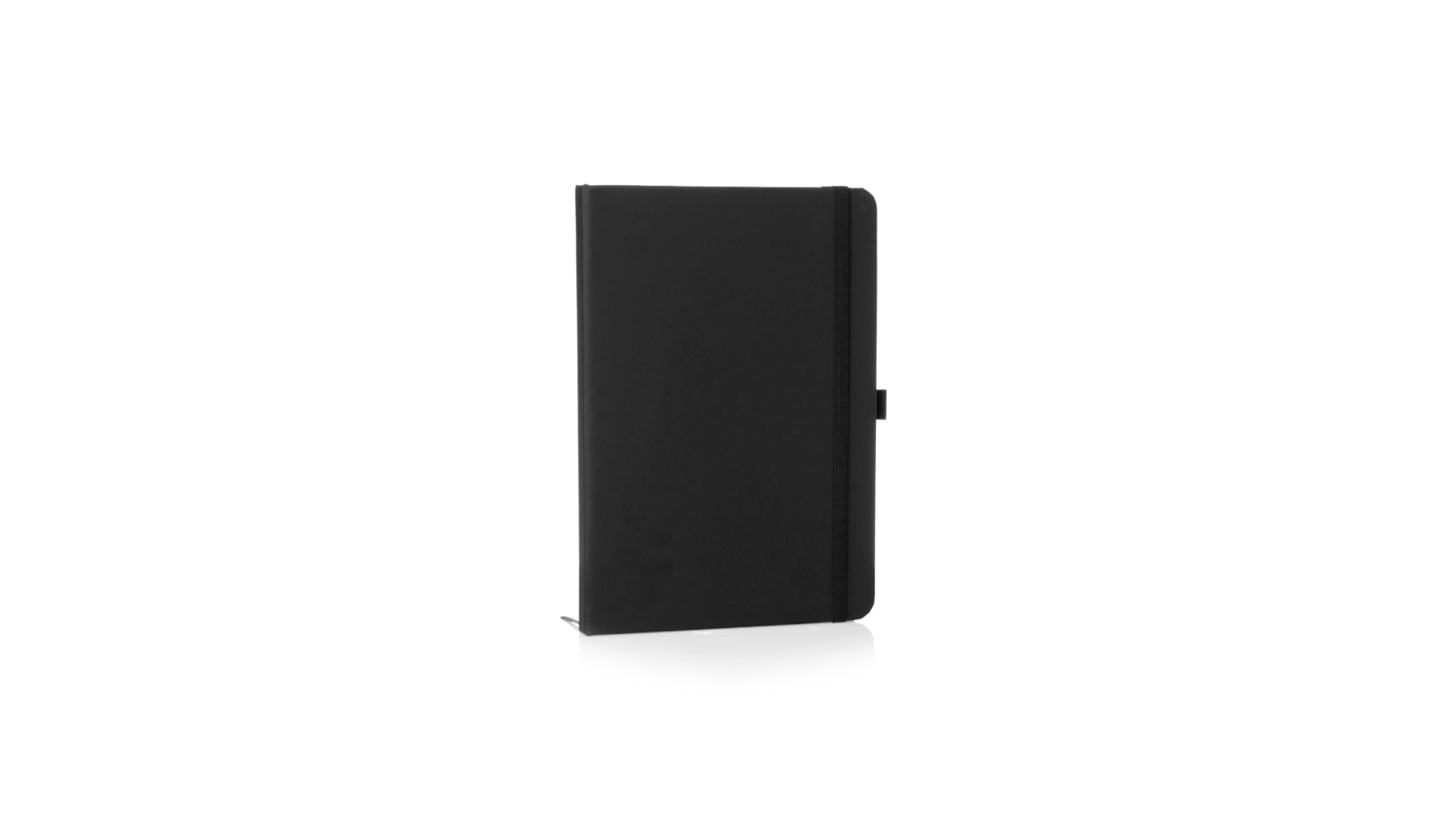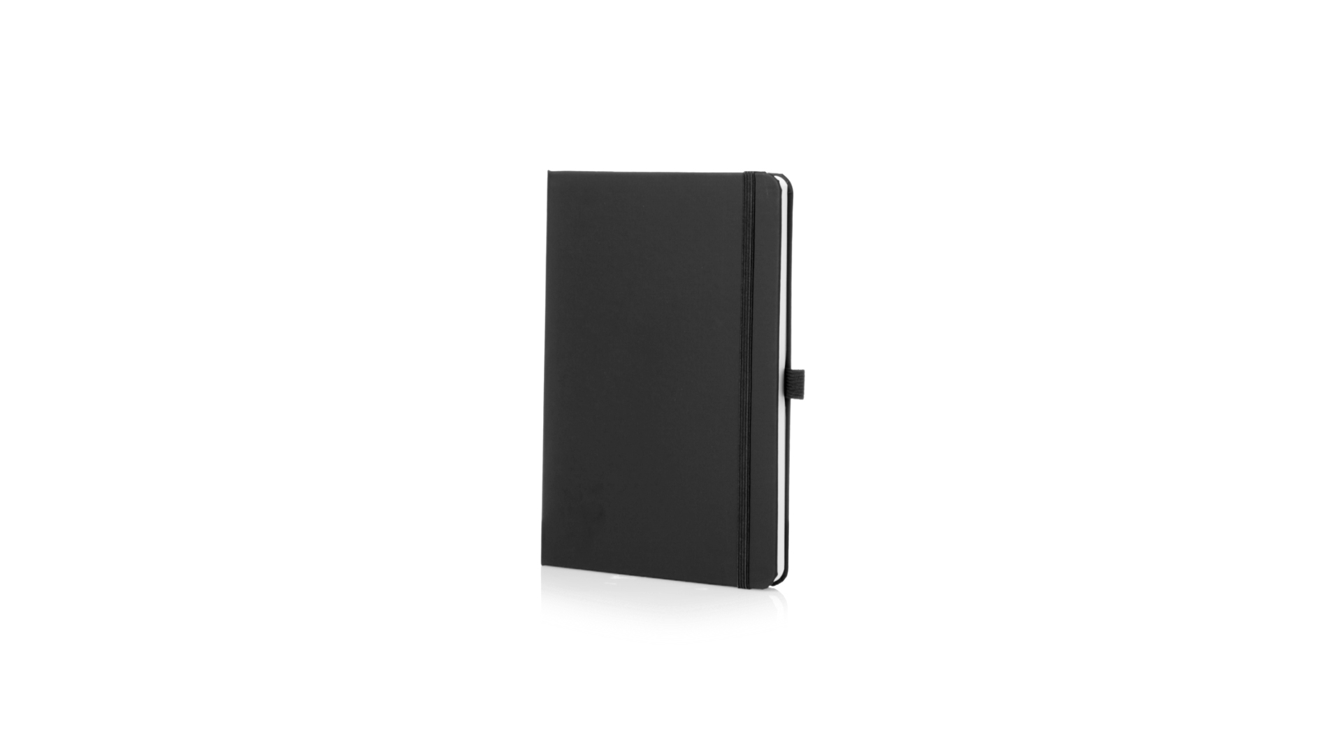 Notizblock aus PU-Leder mit eleganter schwarzer Oberfläche. Mit festem Einband, farblich passendem Lesezeichen und Gummiband. Innen mit 100 Blatt Einstreifen-Layout und Kugelschreiberhalter (Kugelschreiber nicht enthalten).