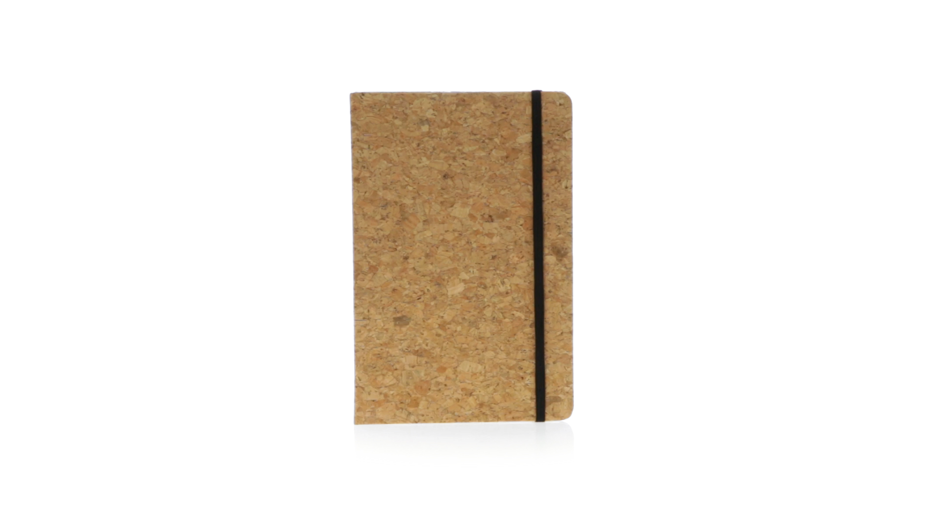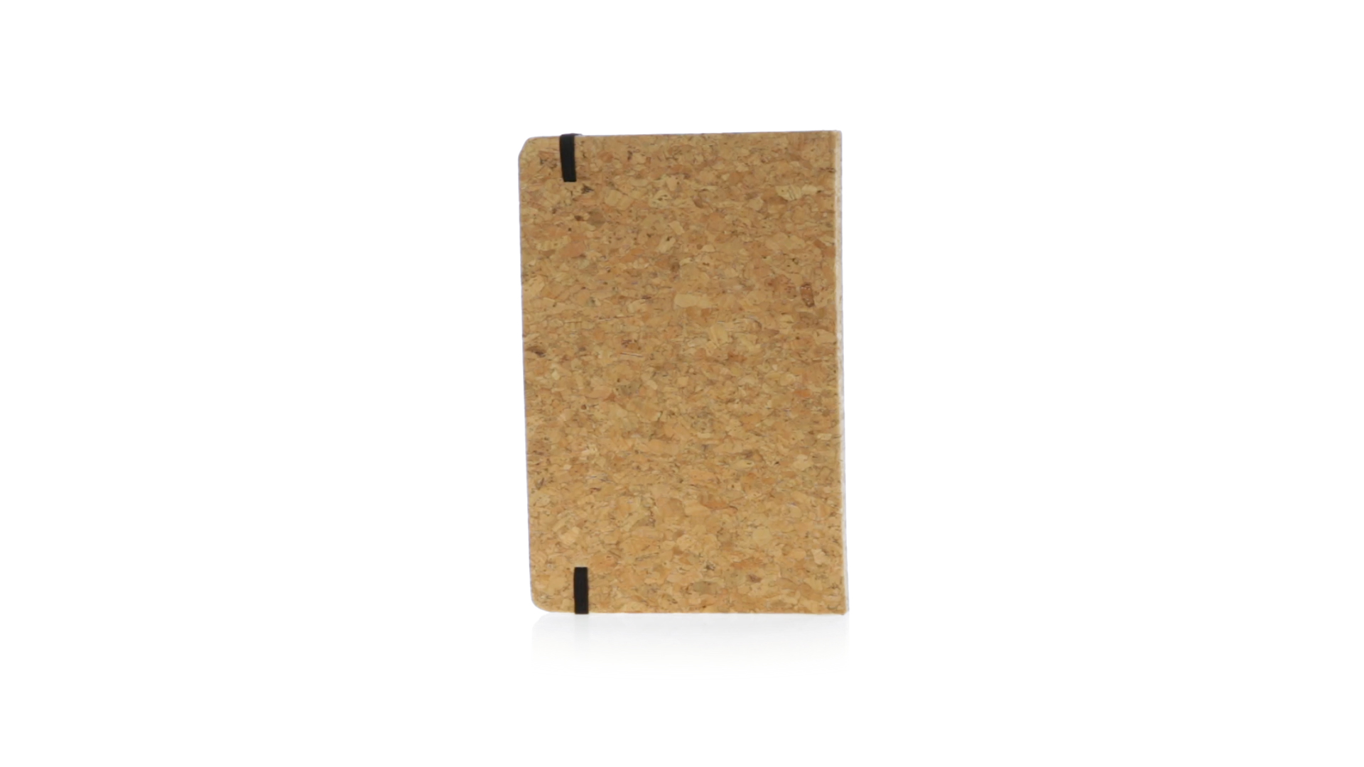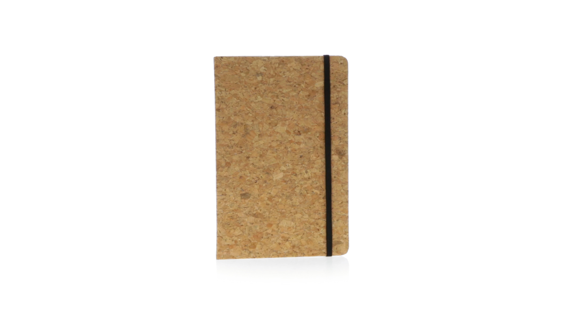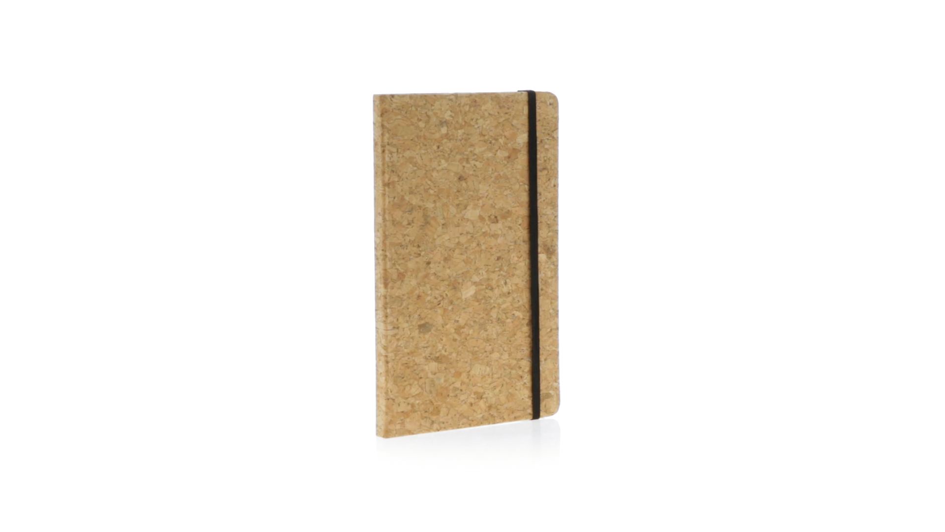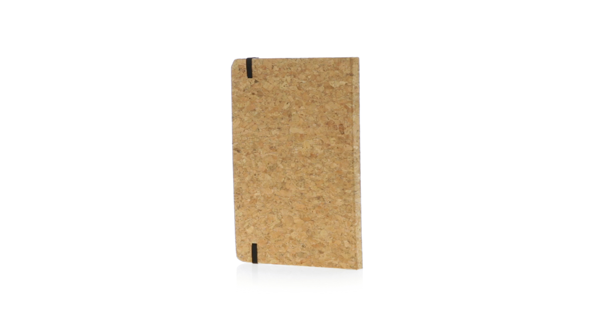 Ökologischer Notizblock aus Naturkork mit festem Cover. Mit 80 Blättern in Naturfarbe, Gummibandverschluss und Lesezeichenband in Schwarz.