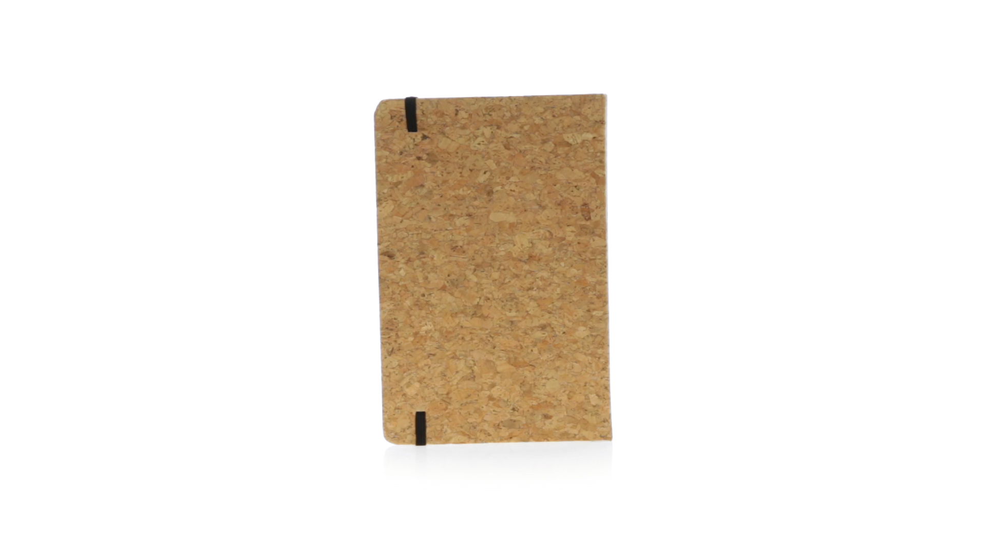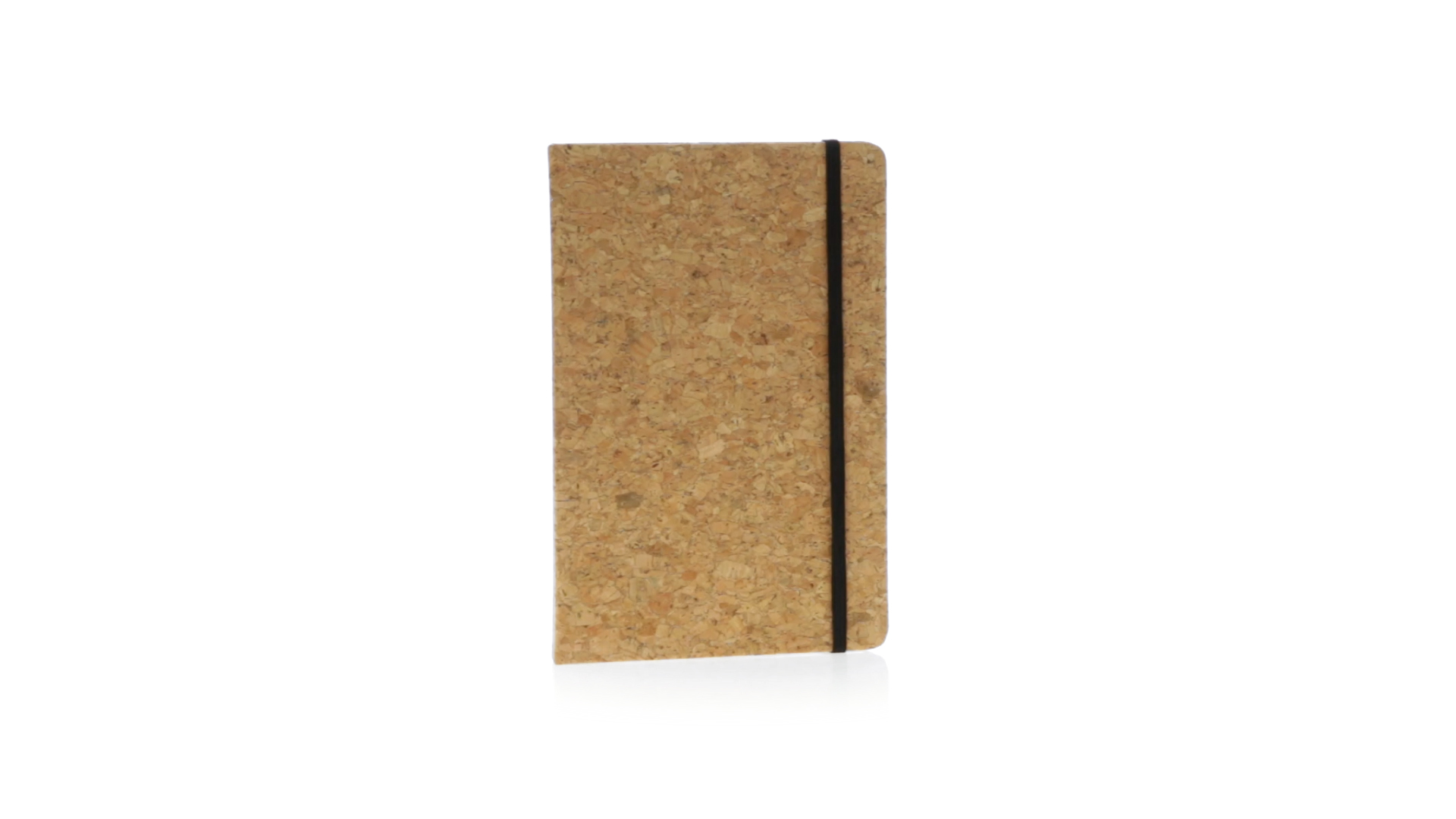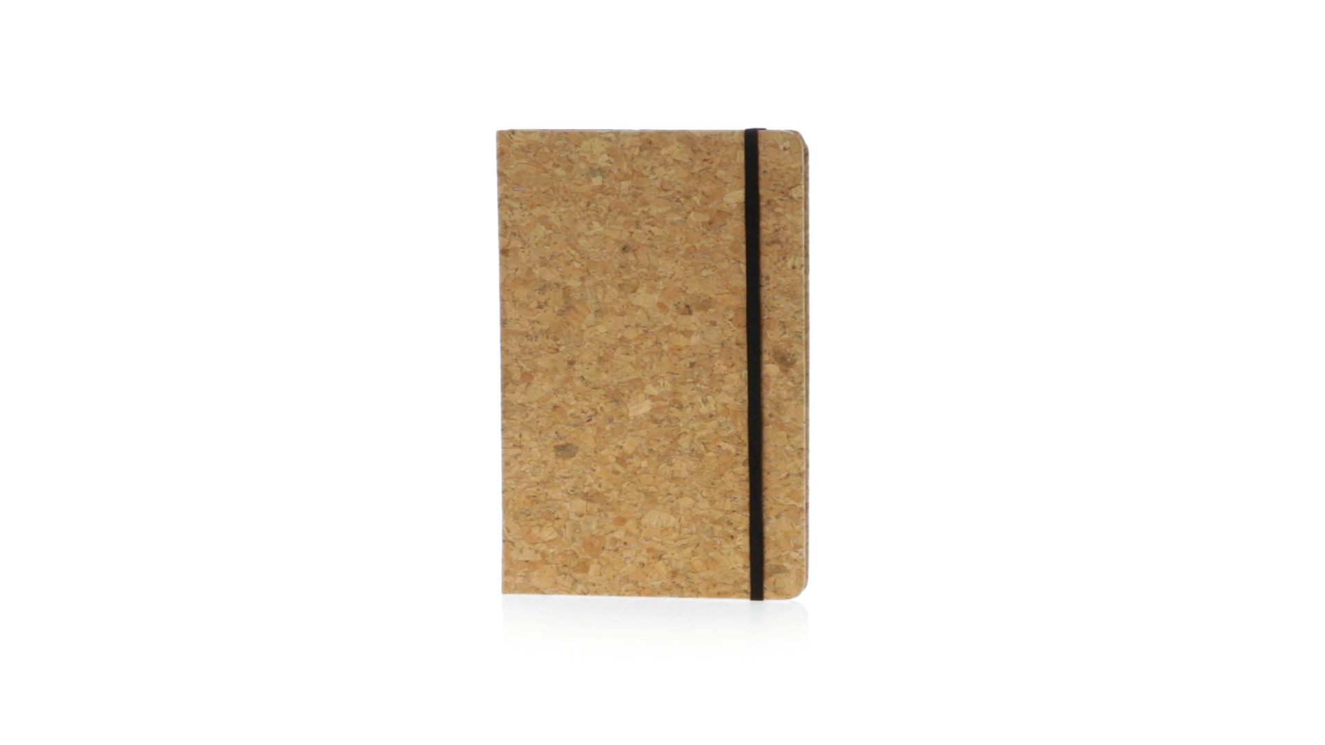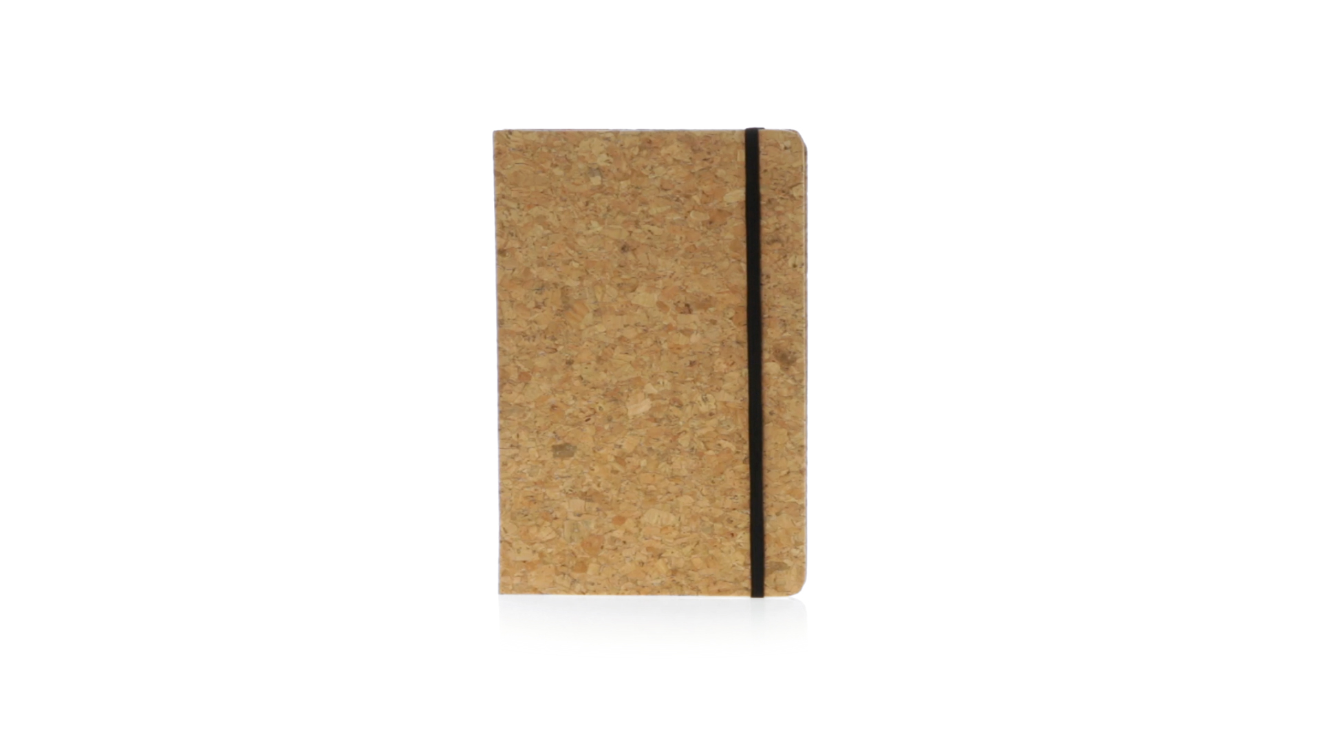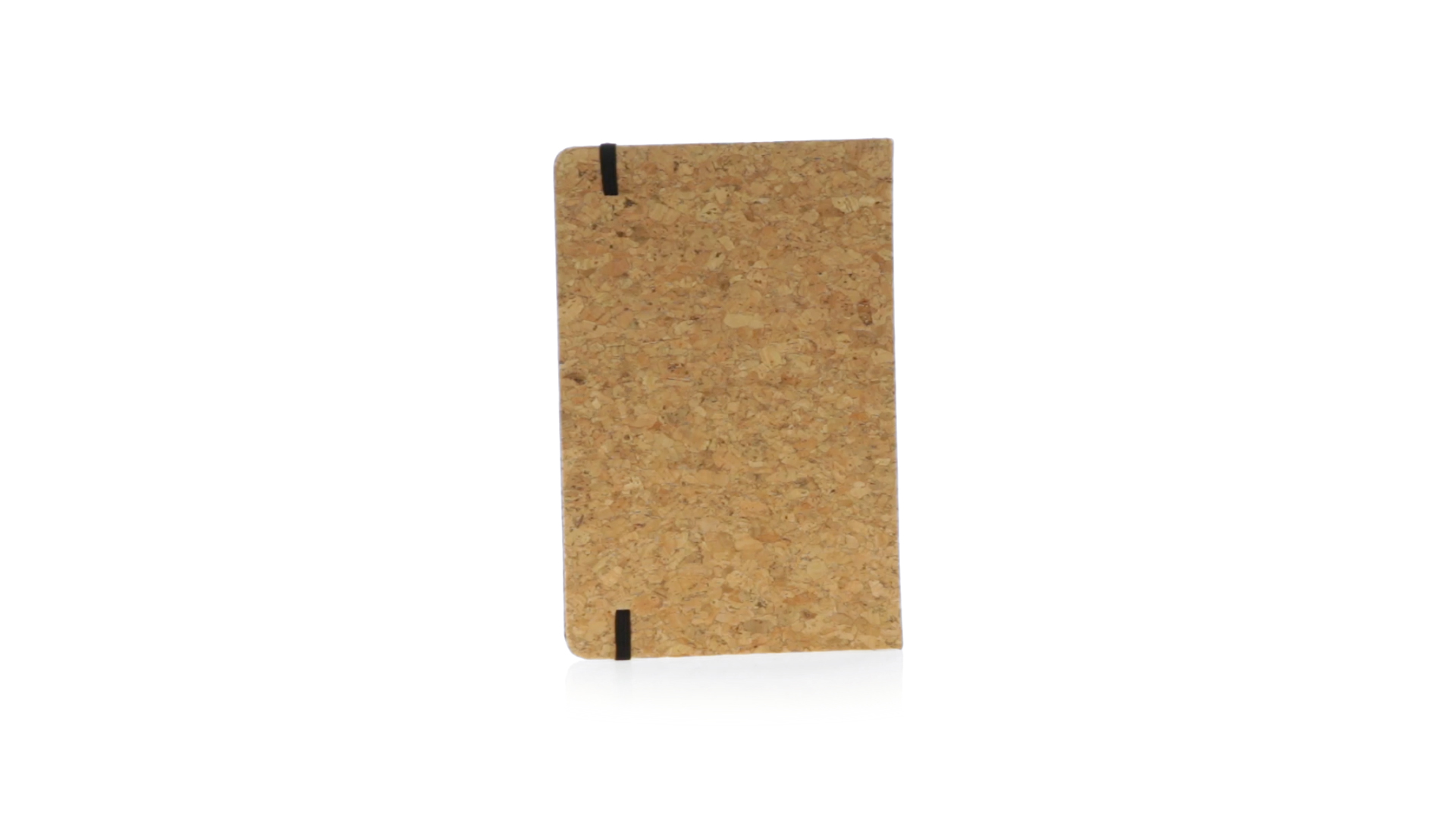 Ökologischer Notizblock aus Naturkork mit festem Cover. Mit 80 Blättern in Naturfarbe, Gummibandverschluss und Lesezeichenband in Schwarz.