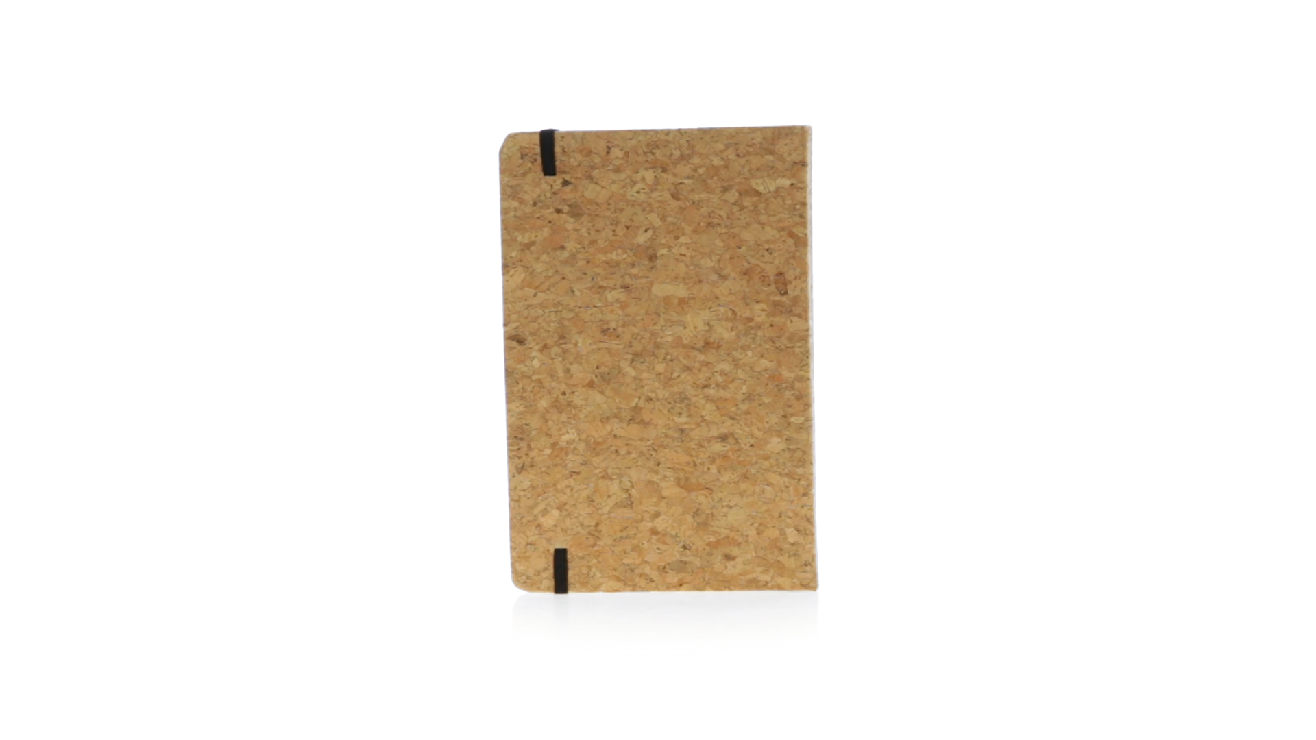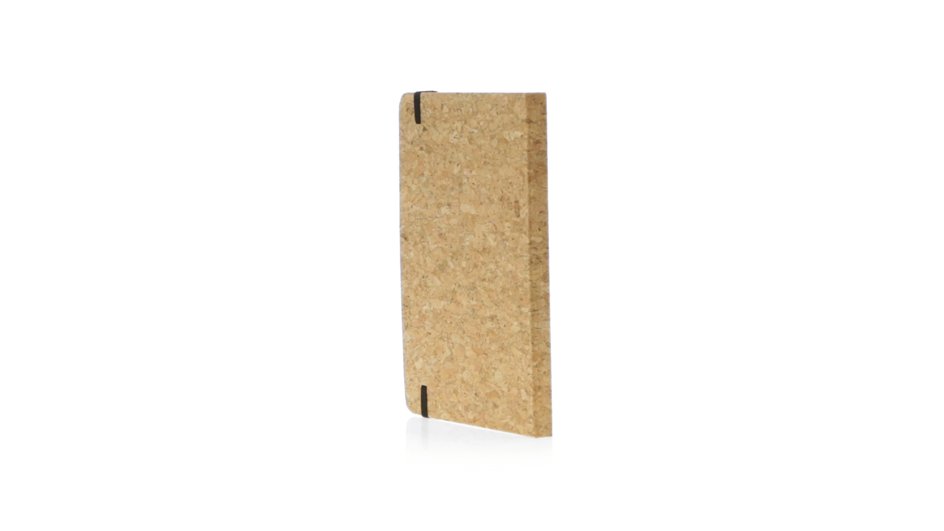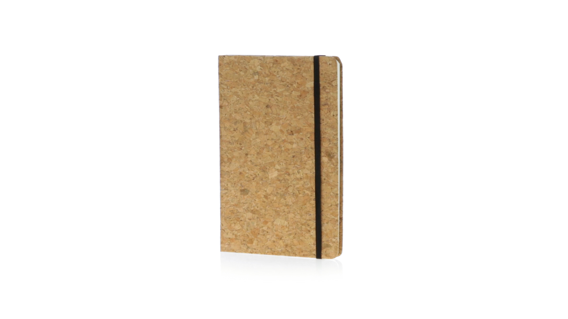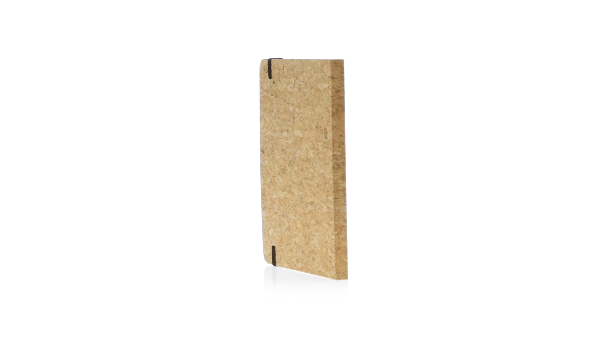 Ökologischer Notizblock aus Naturkork mit festem Cover. Mit 80 Blättern in Naturfarbe, Gummibandverschluss und Lesezeichenband in Schwarz.