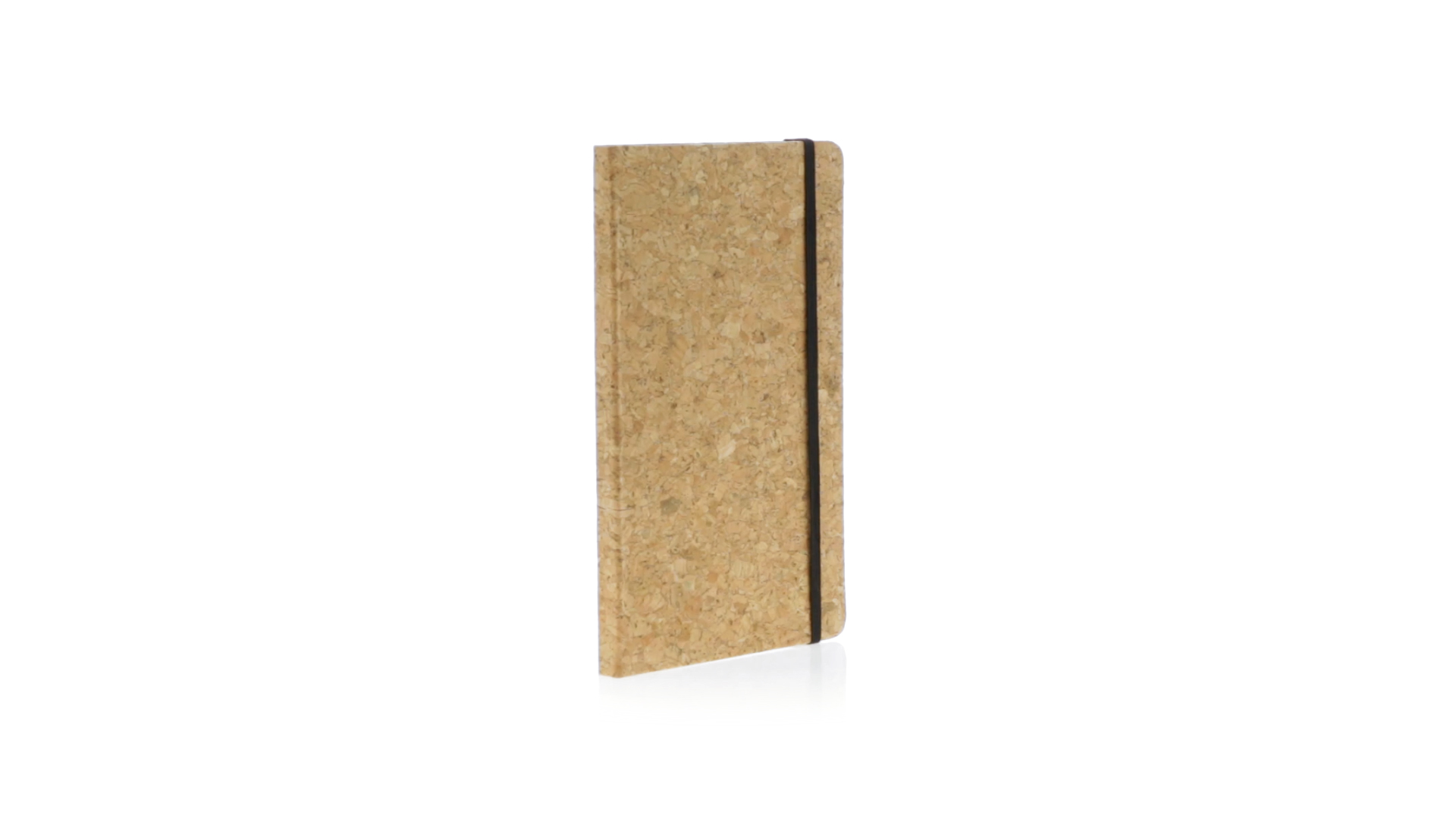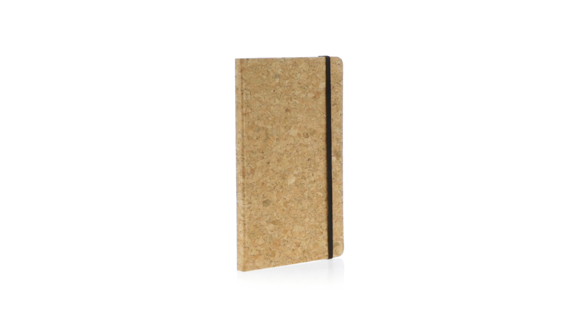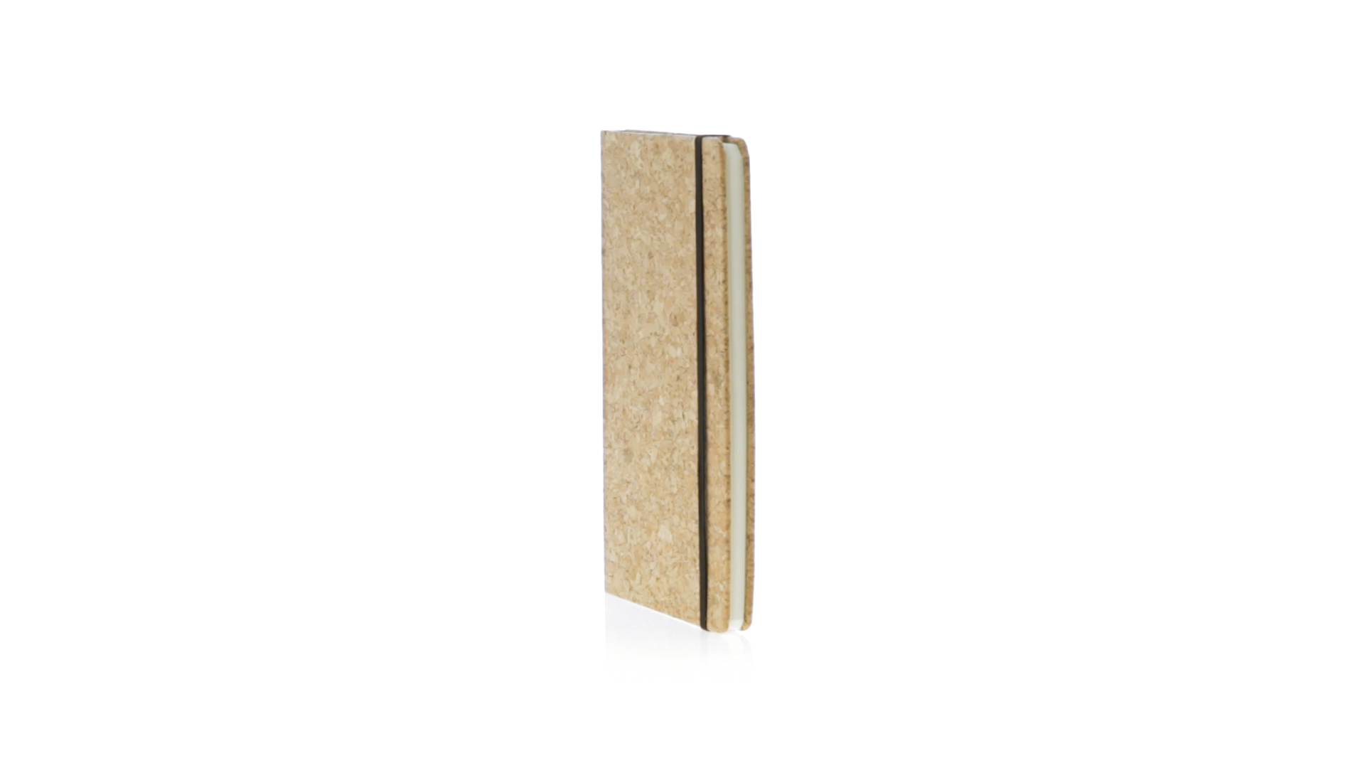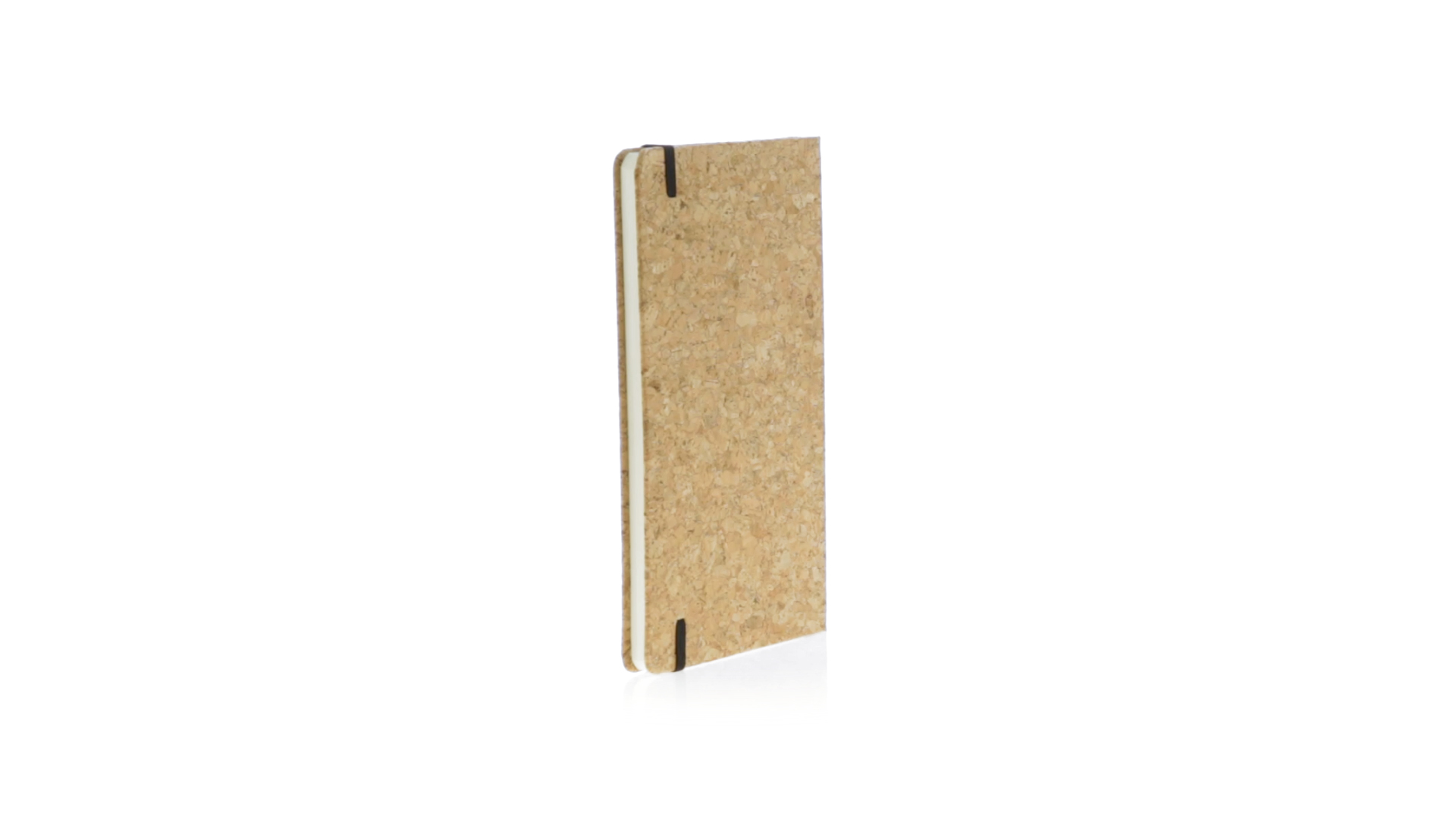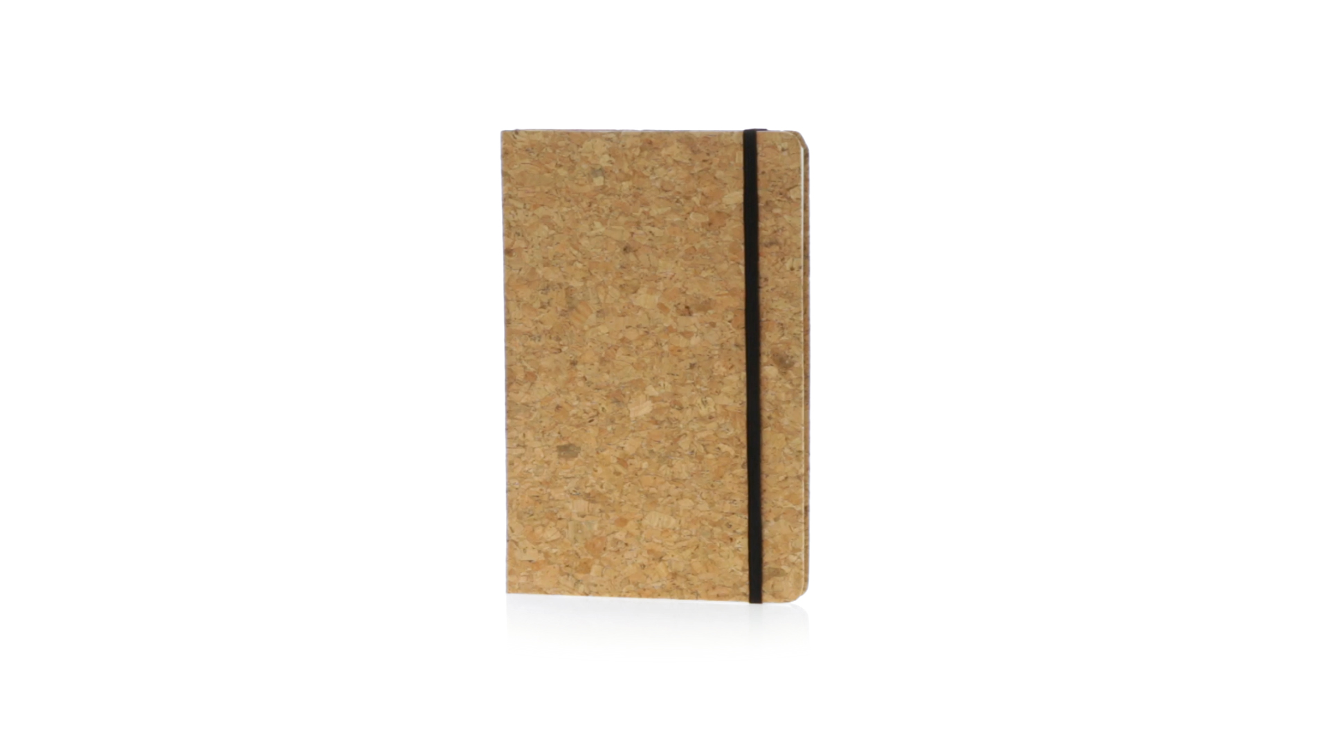 Ökologischer Notizblock aus Naturkork mit festem Cover. Mit 80 Blättern in Naturfarbe, Gummibandverschluss und Lesezeichenband in Schwarz.