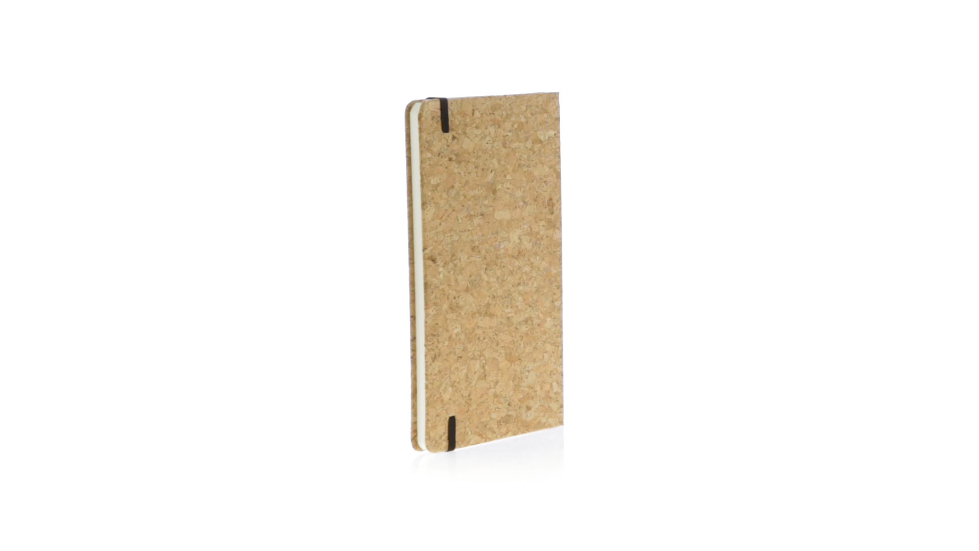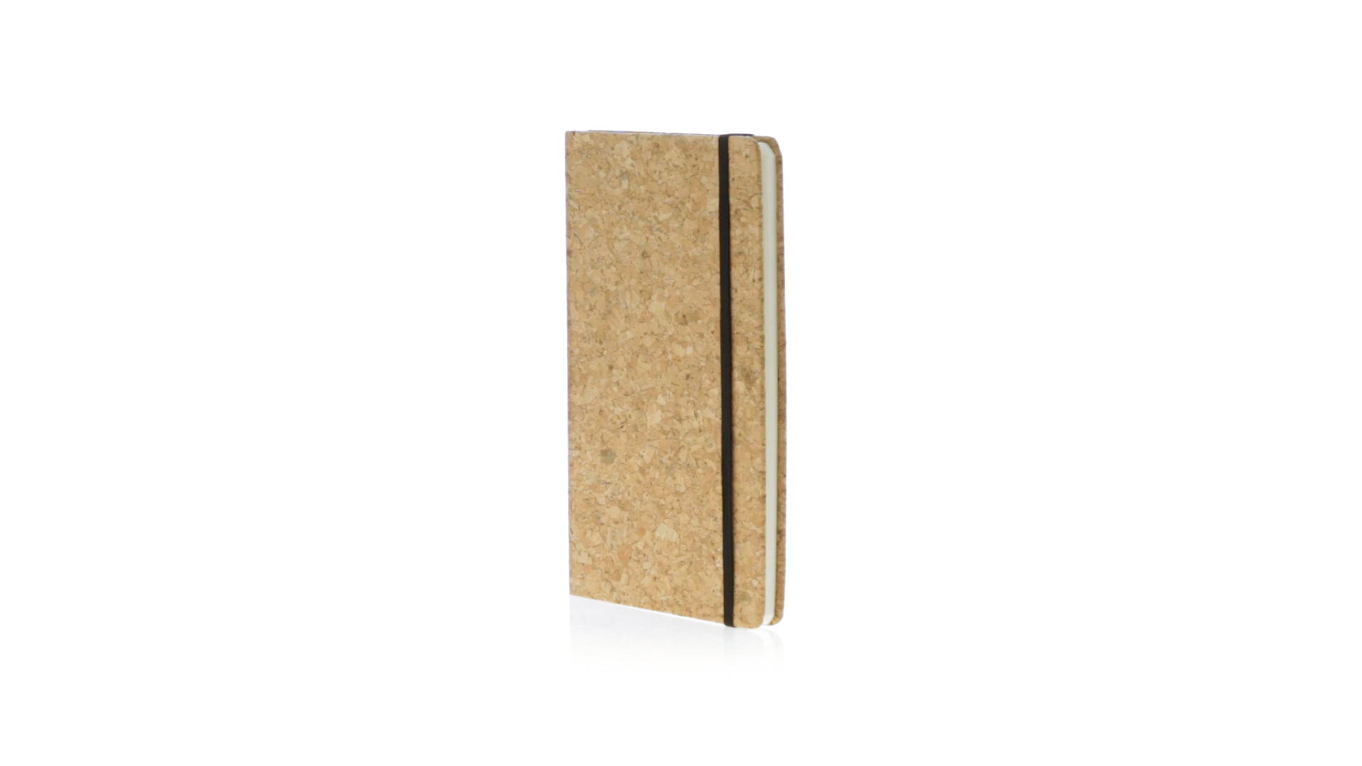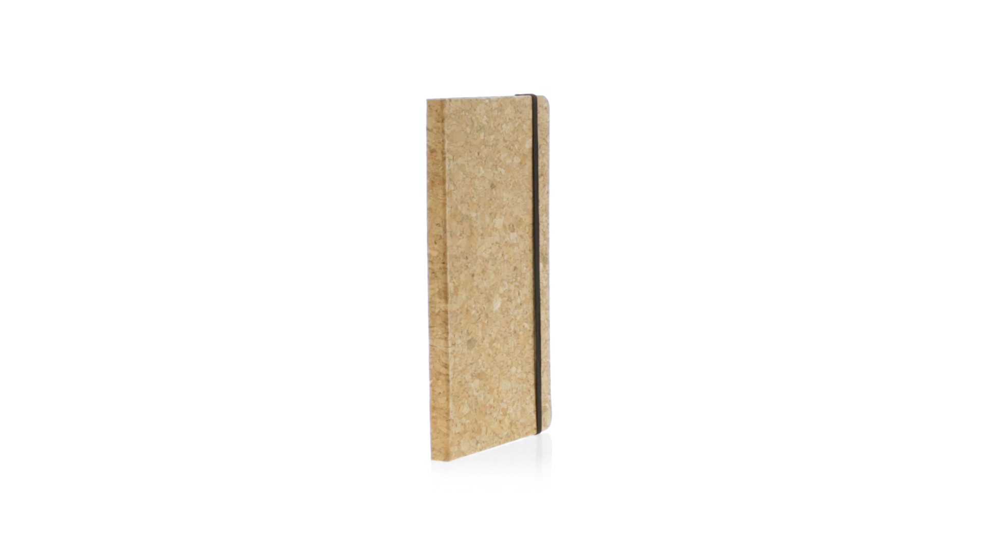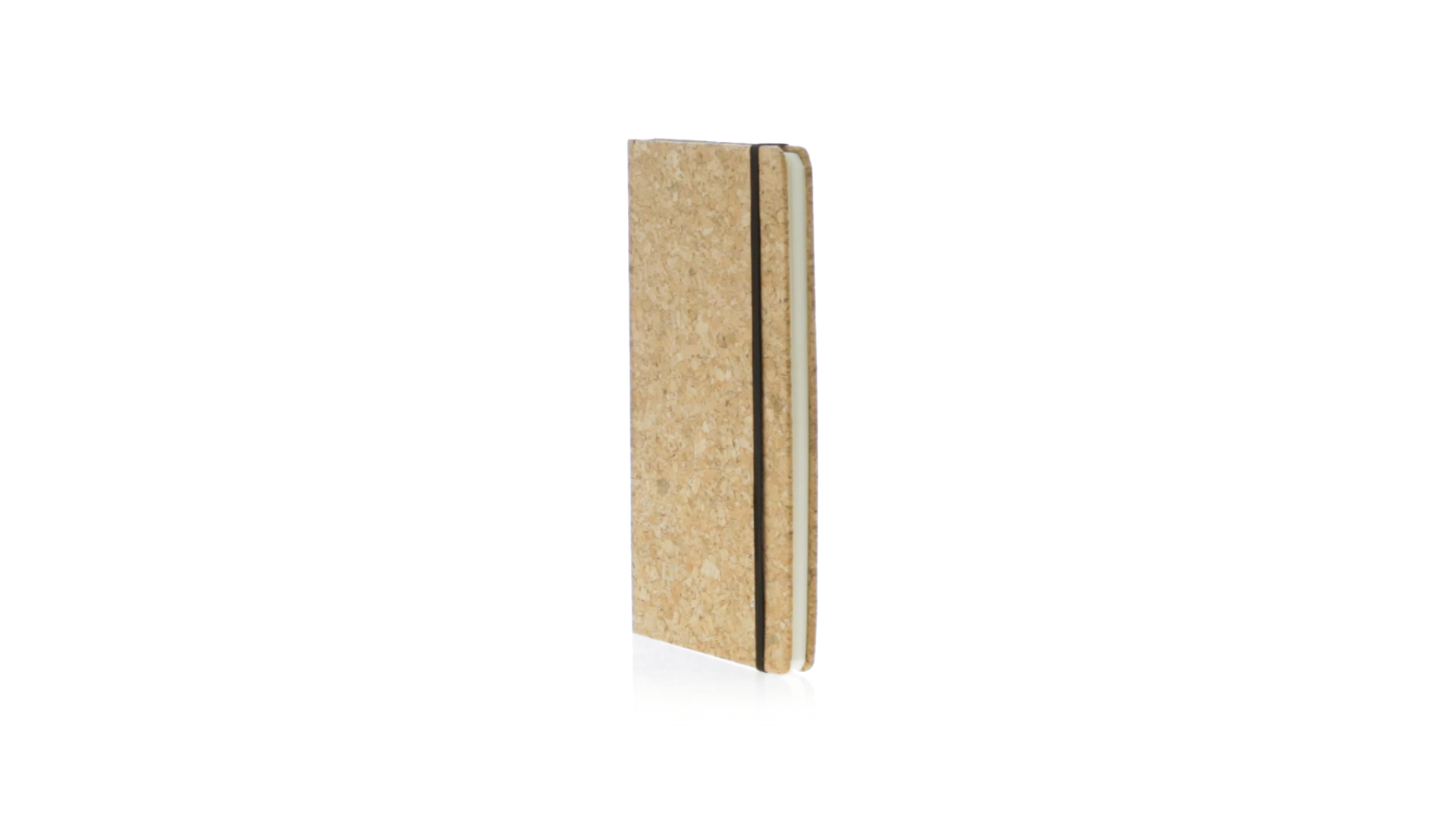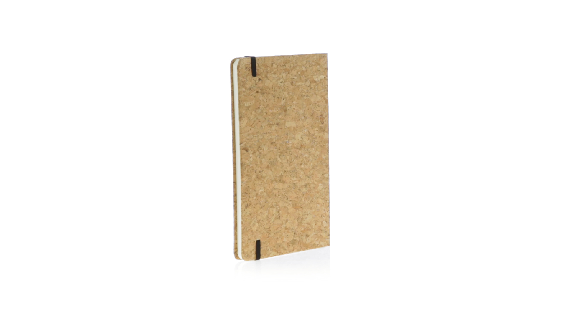 Ökologischer Notizblock aus Naturkork mit festem Cover. Mit 80 Blättern in Naturfarbe, Gummibandverschluss und Lesezeichenband in Schwarz.