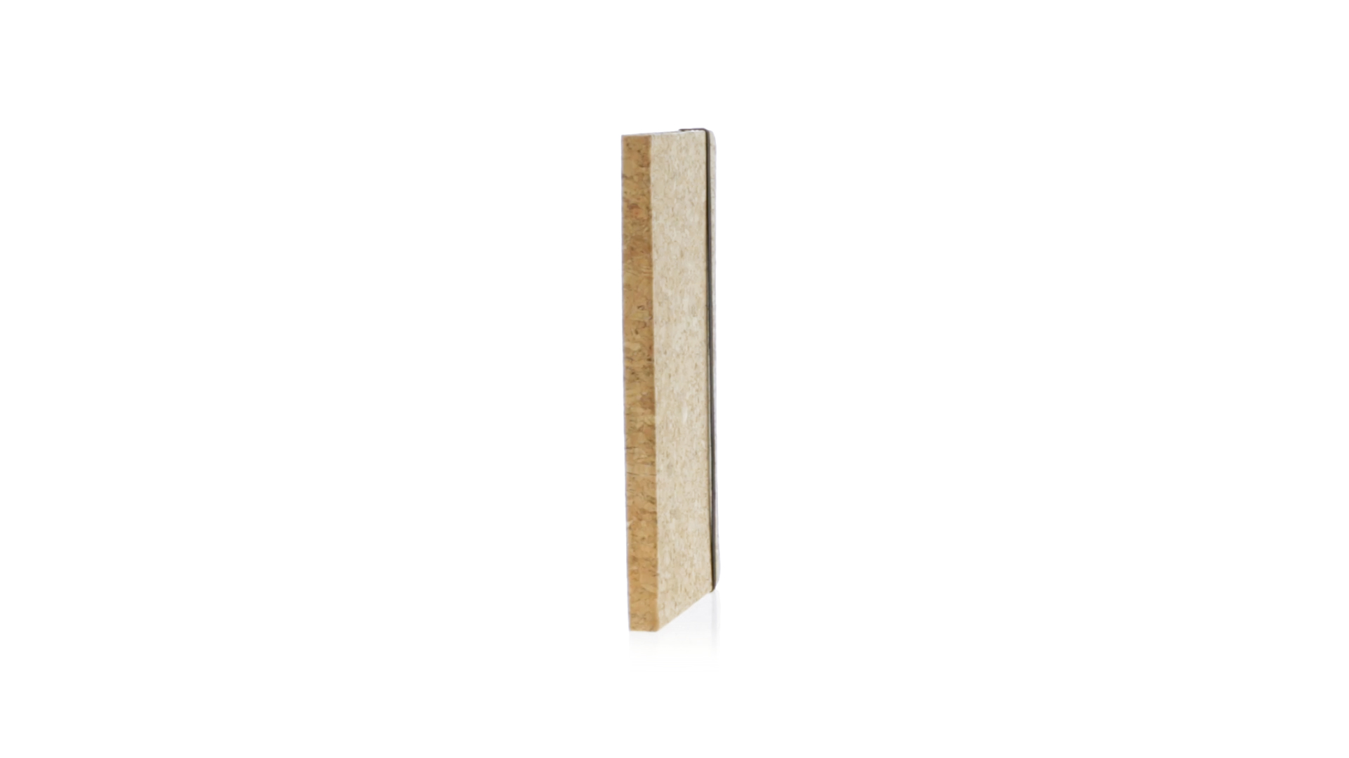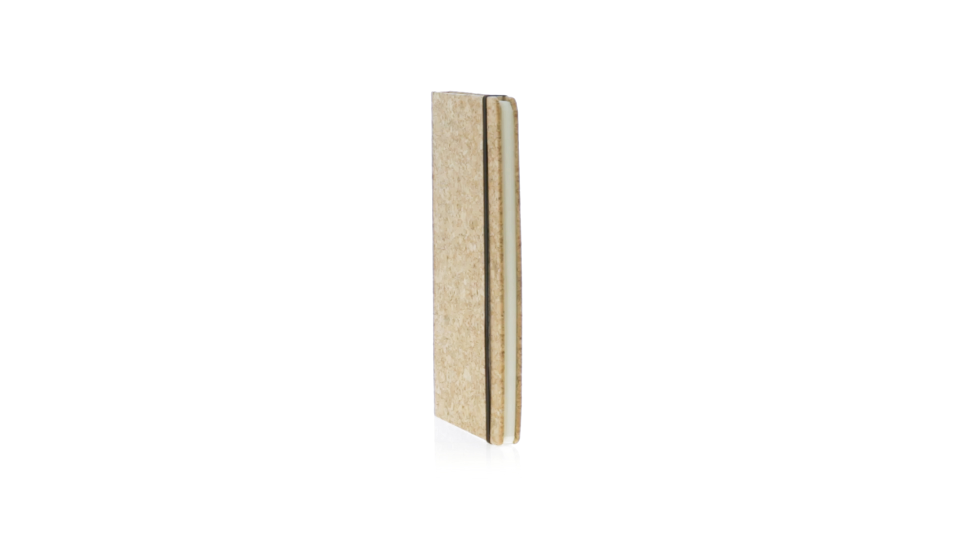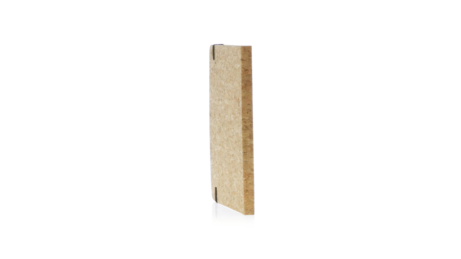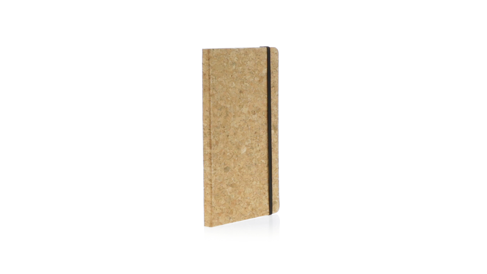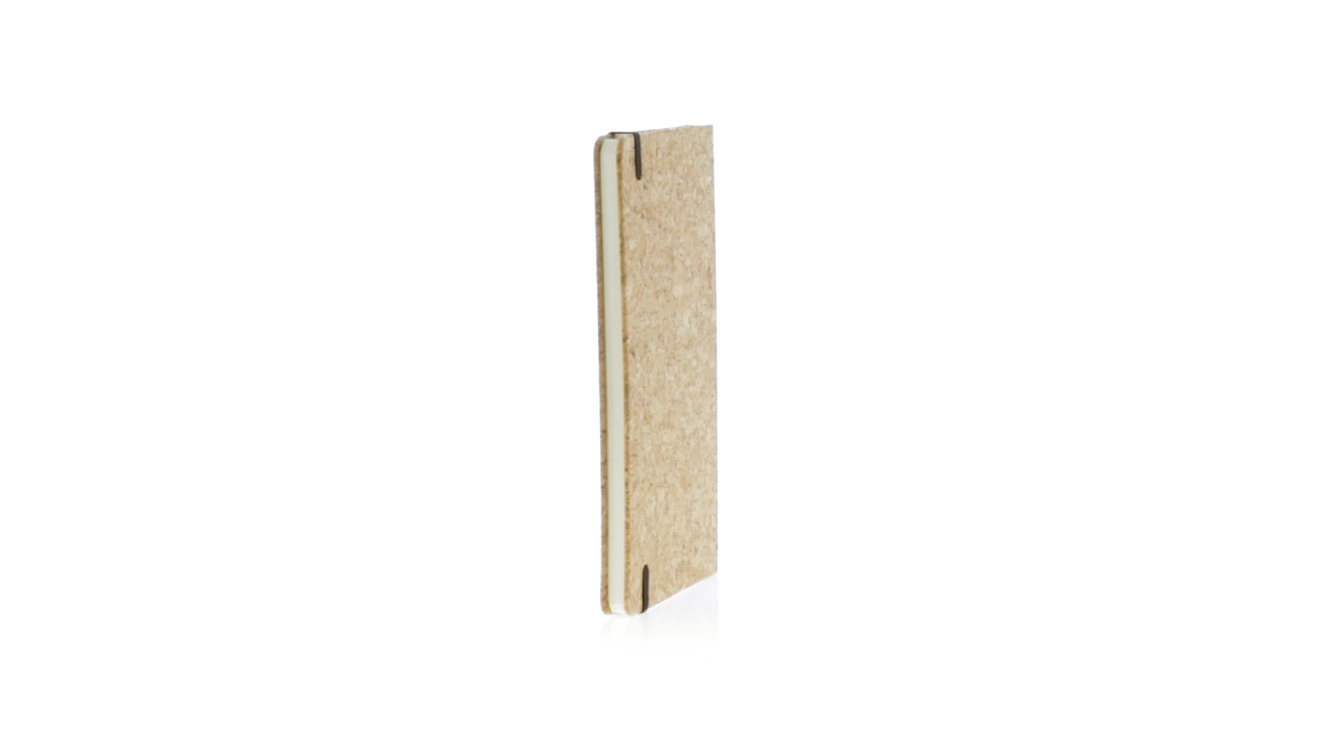 Ökologischer Notizblock aus Naturkork mit festem Cover. Mit 80 Blättern in Naturfarbe, Gummibandverschluss und Lesezeichenband in Schwarz.