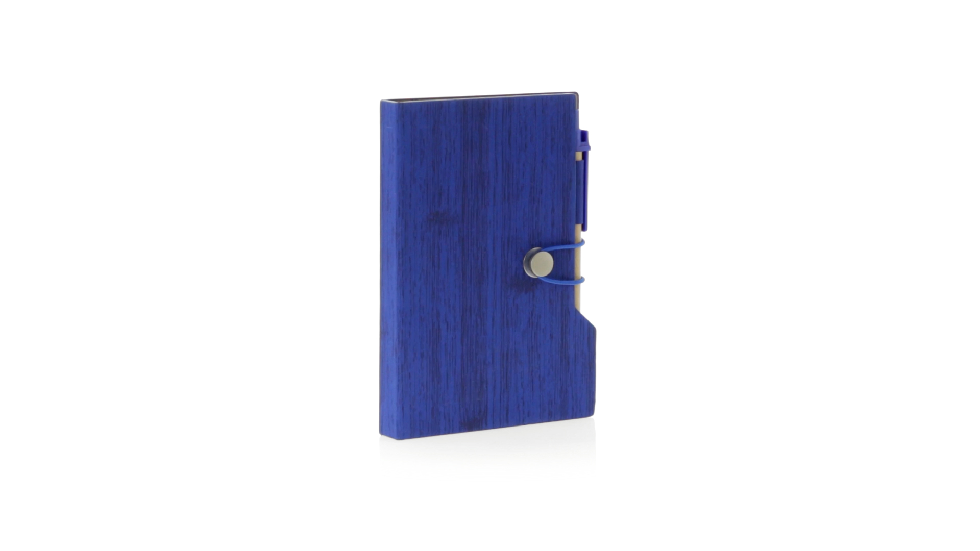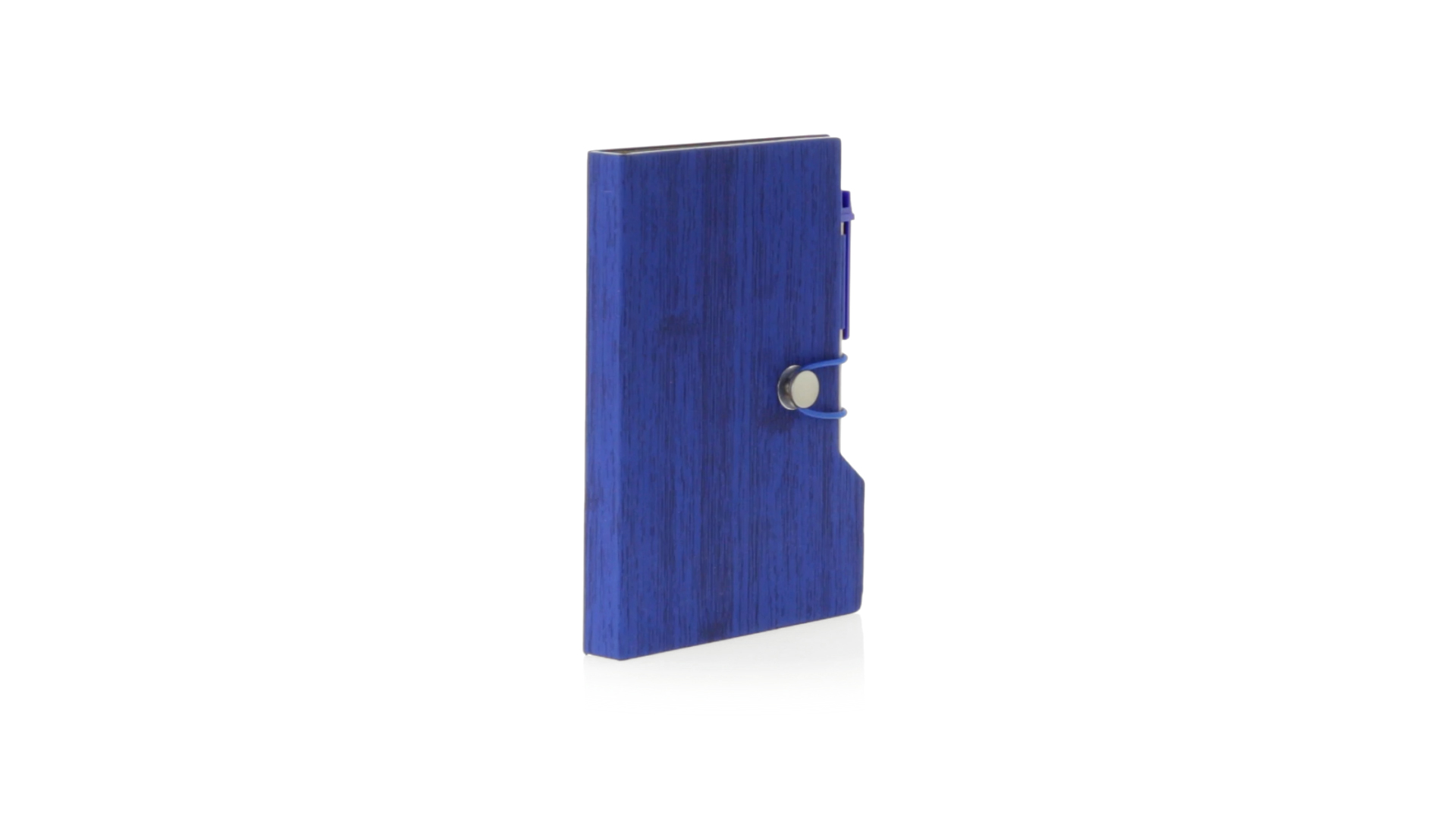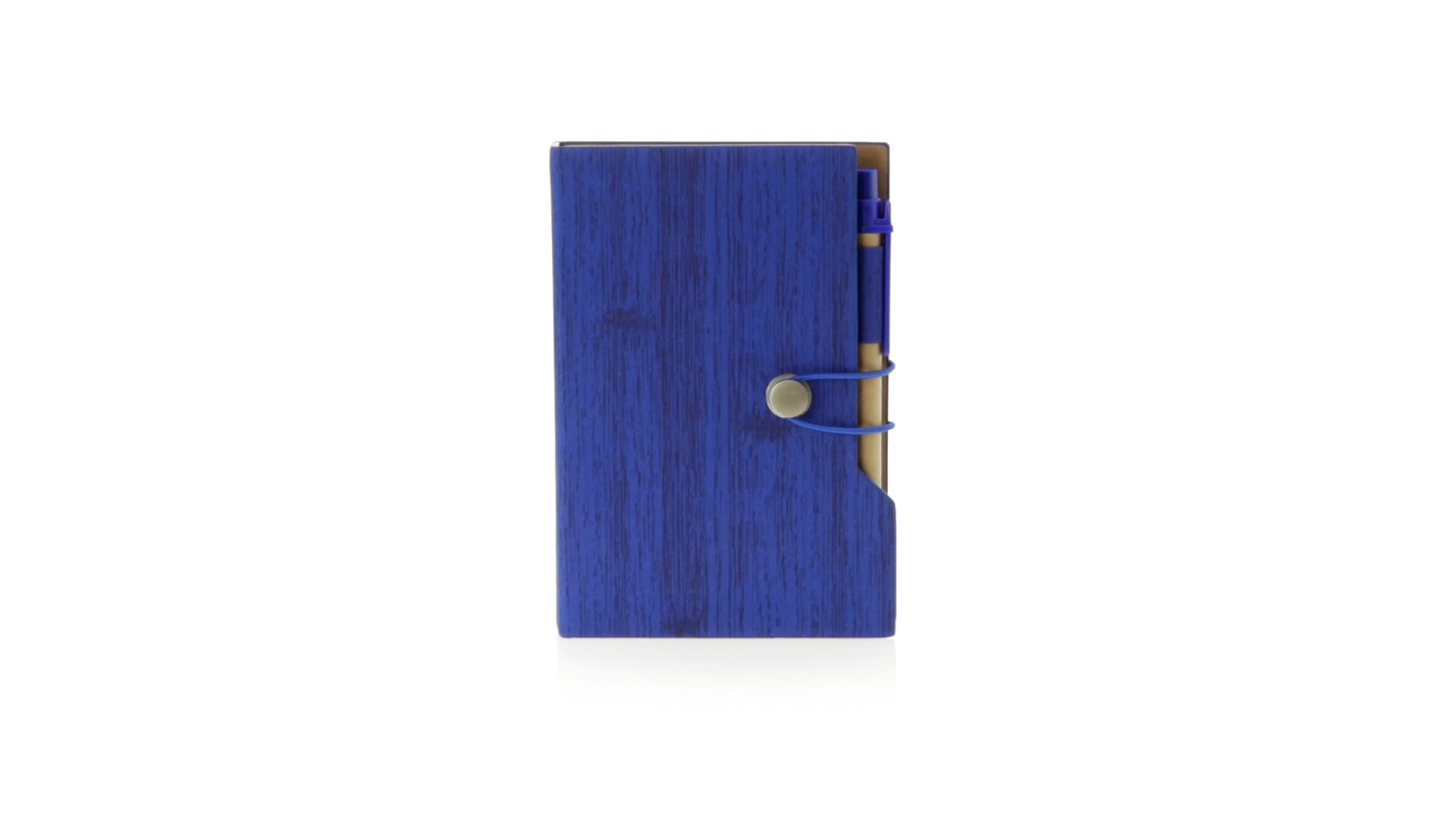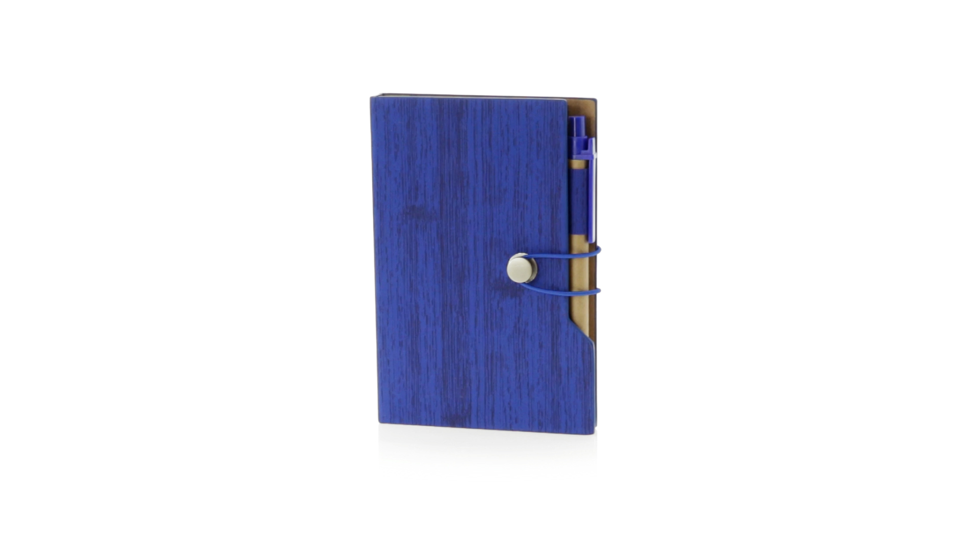 Notizblock mit originellem Kunstleder-Cover mit Holzmaserung in einer Vielzahl von Farben. Kugelschreiber aus recyceltem Karton inklusive. Ökologisches Design mit Soft-Touch-Cover und Gummibandverschluss. Mit integriertem Stifthalter, Block mit 70 linierten Blättern sowie 25 mittelgrossen und 125 Mini-Haftnotizen.
