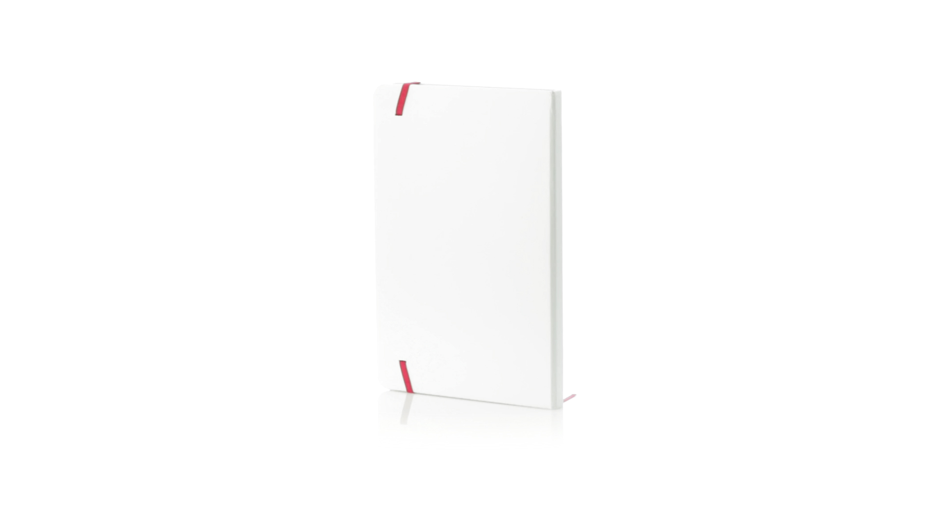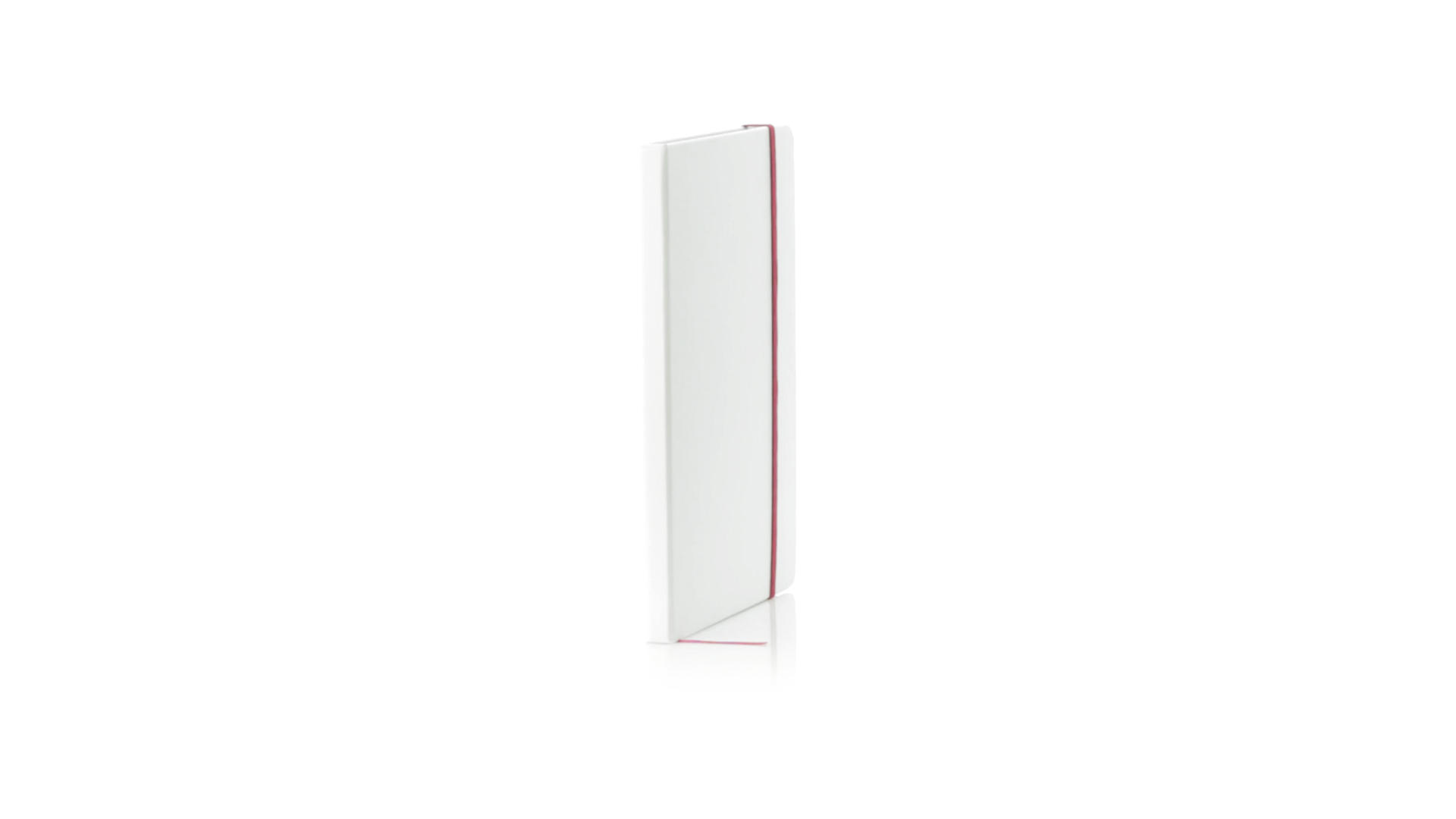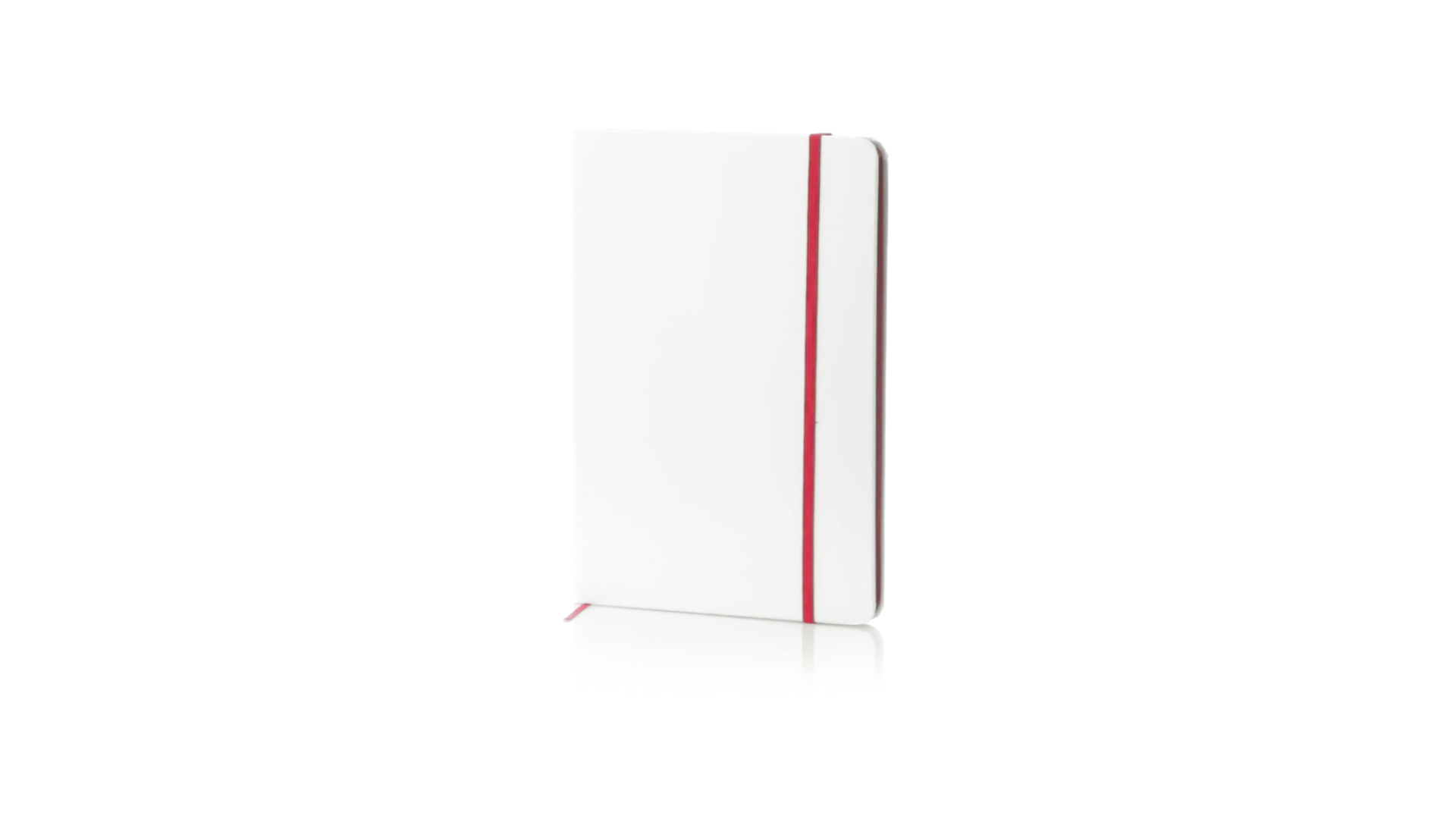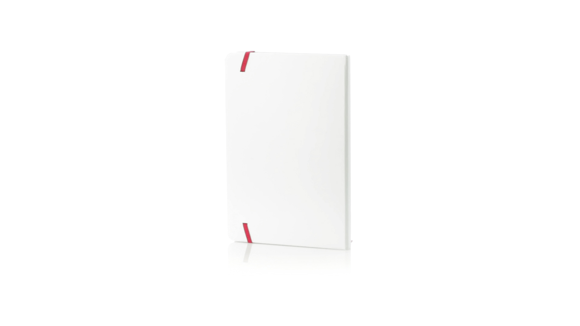 Notizblock mit solidem Soft-Touch-Cover in Weiss. Mit 100 Blättern mit farbigen Kanten, Gummibandverschluss und farblich passendem Lesezeichenband.